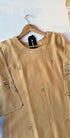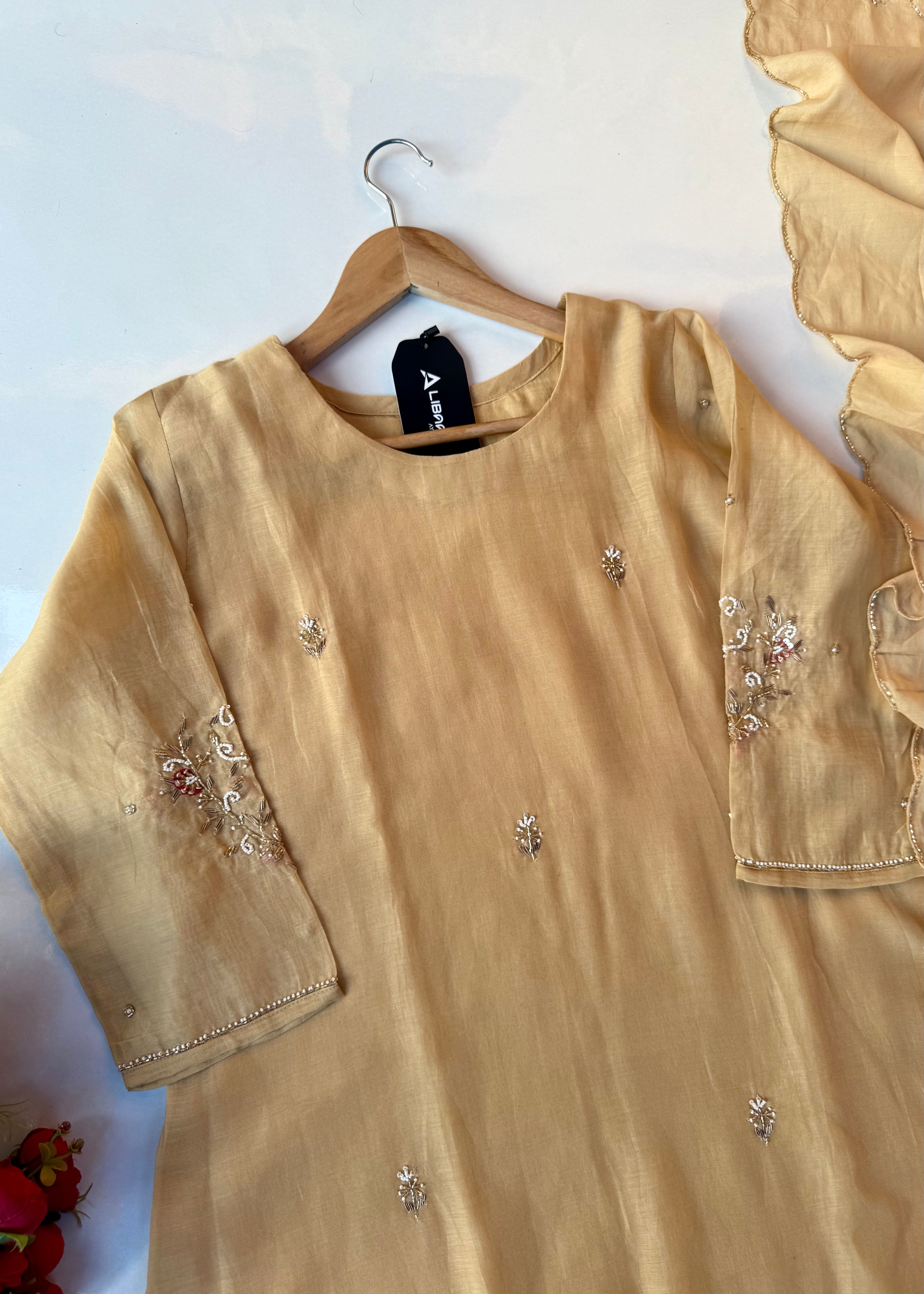 Beautiful premium mul chanderi kurti with Beautiful handwork attached all over the top with mul cotton lining, comfortable mul chanderi pants with cotton lining and full length soft mul chanderi dupatta covered with beautiful hand work.