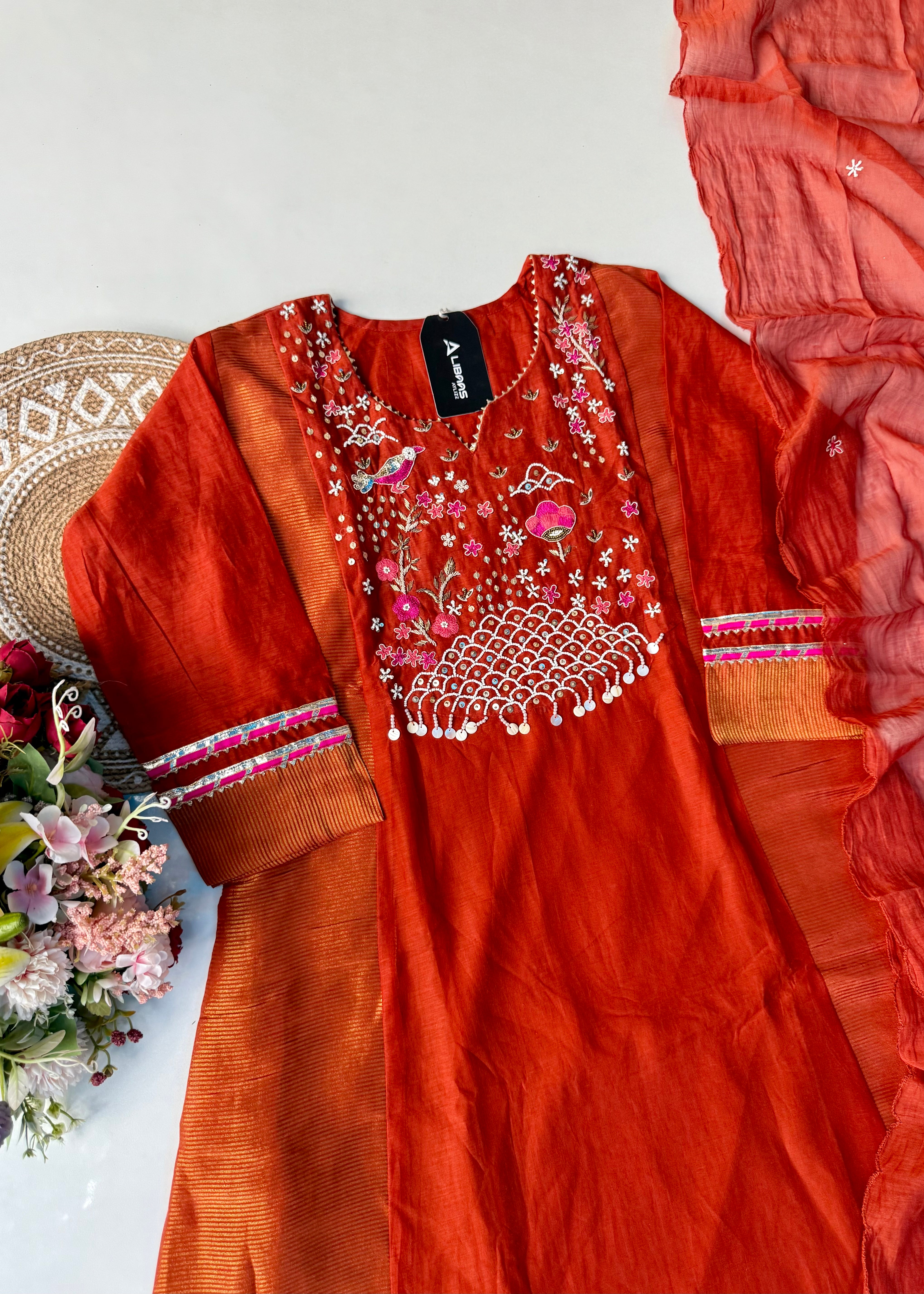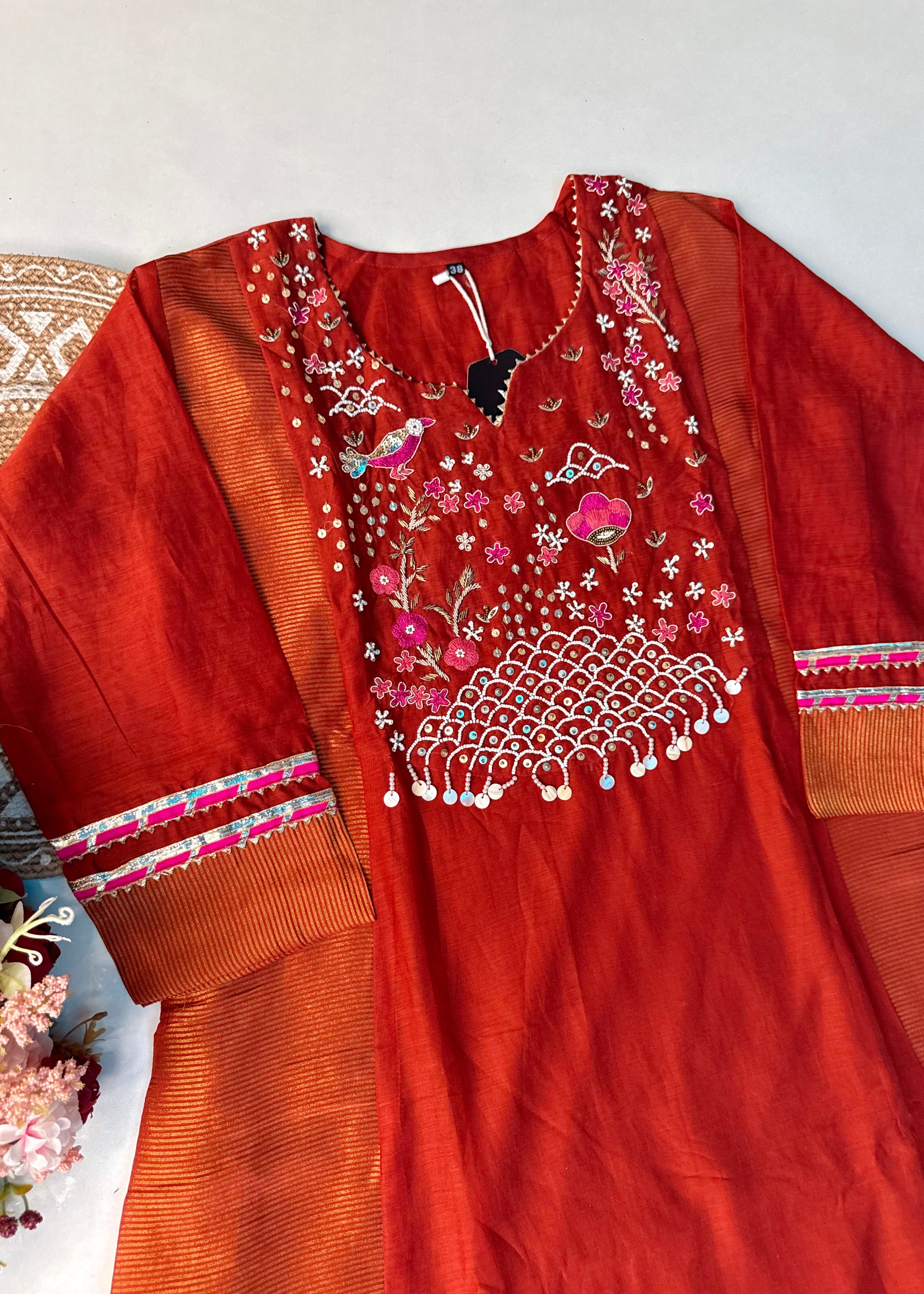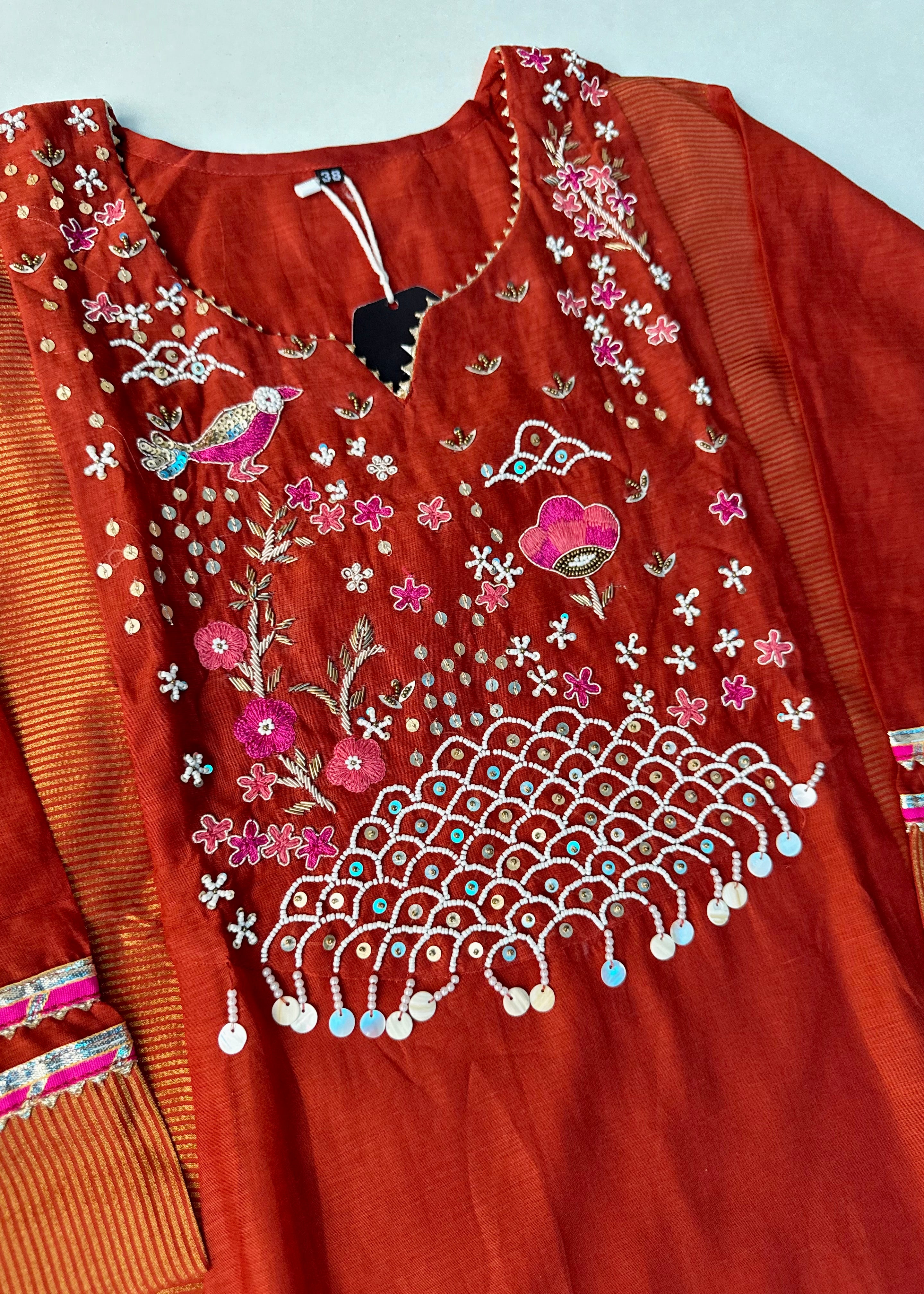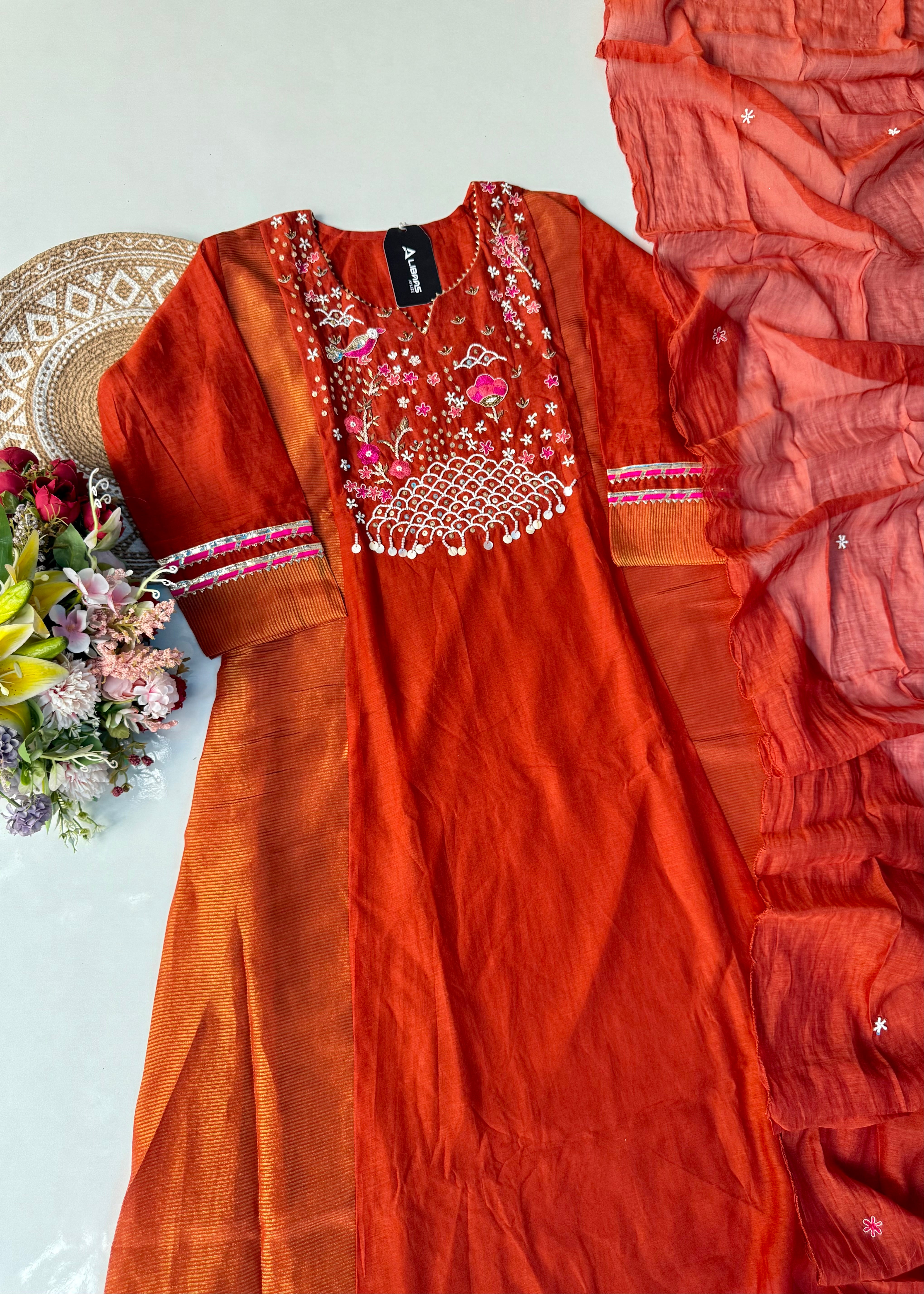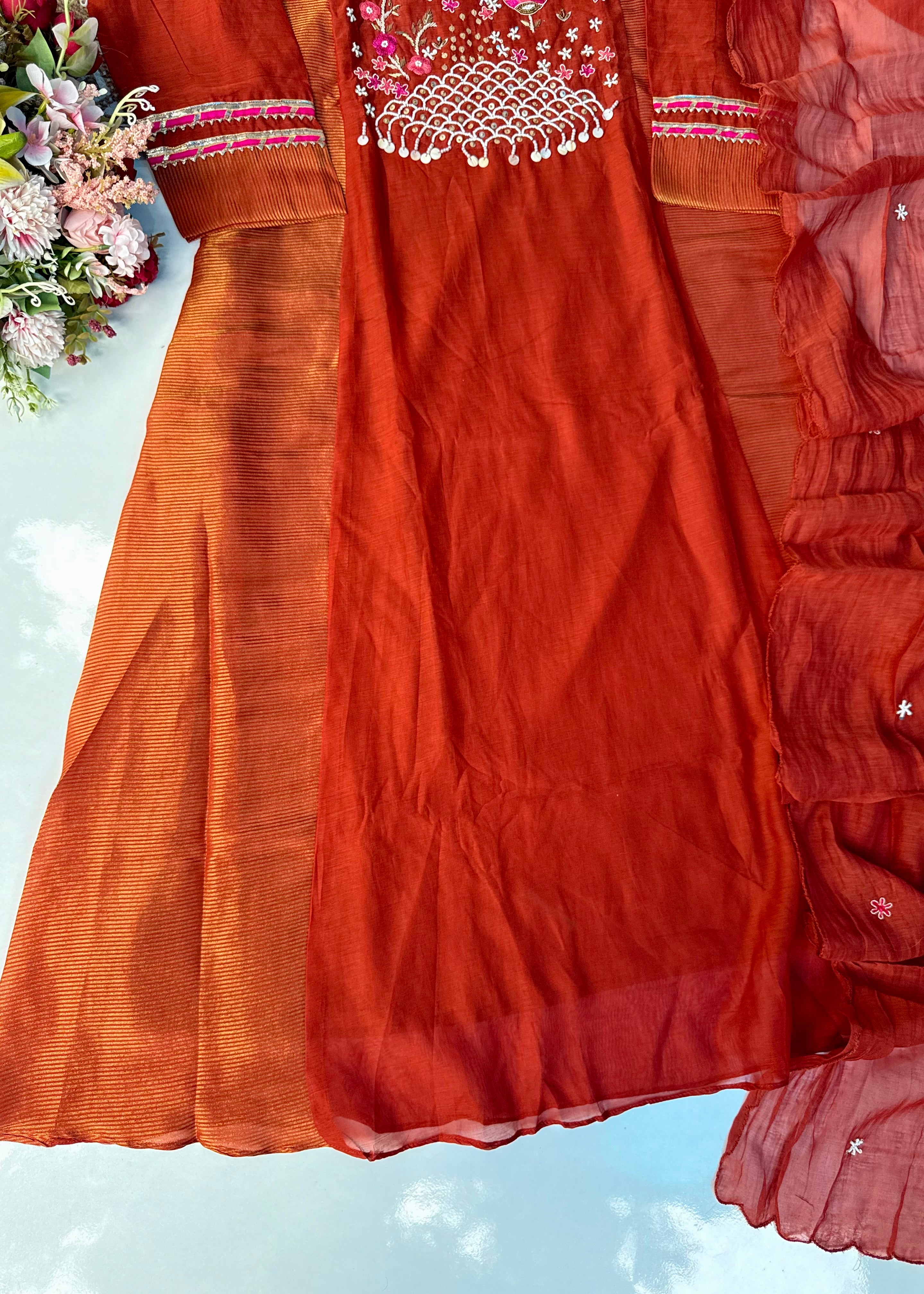 Elevate your ethnic wardrobe with this elegant Mul Chanderi straight kurta set. Designed in a rich deep red color, the kurta features intricate handwork embroidery on the neckline and sleeves, paired with a matching bottom. The set is completed with a contrast organza dupatta adorned with golden woven stripes and a delicate lace border, making it perfect for festive occasions, weddings, and parties