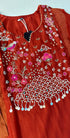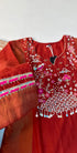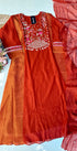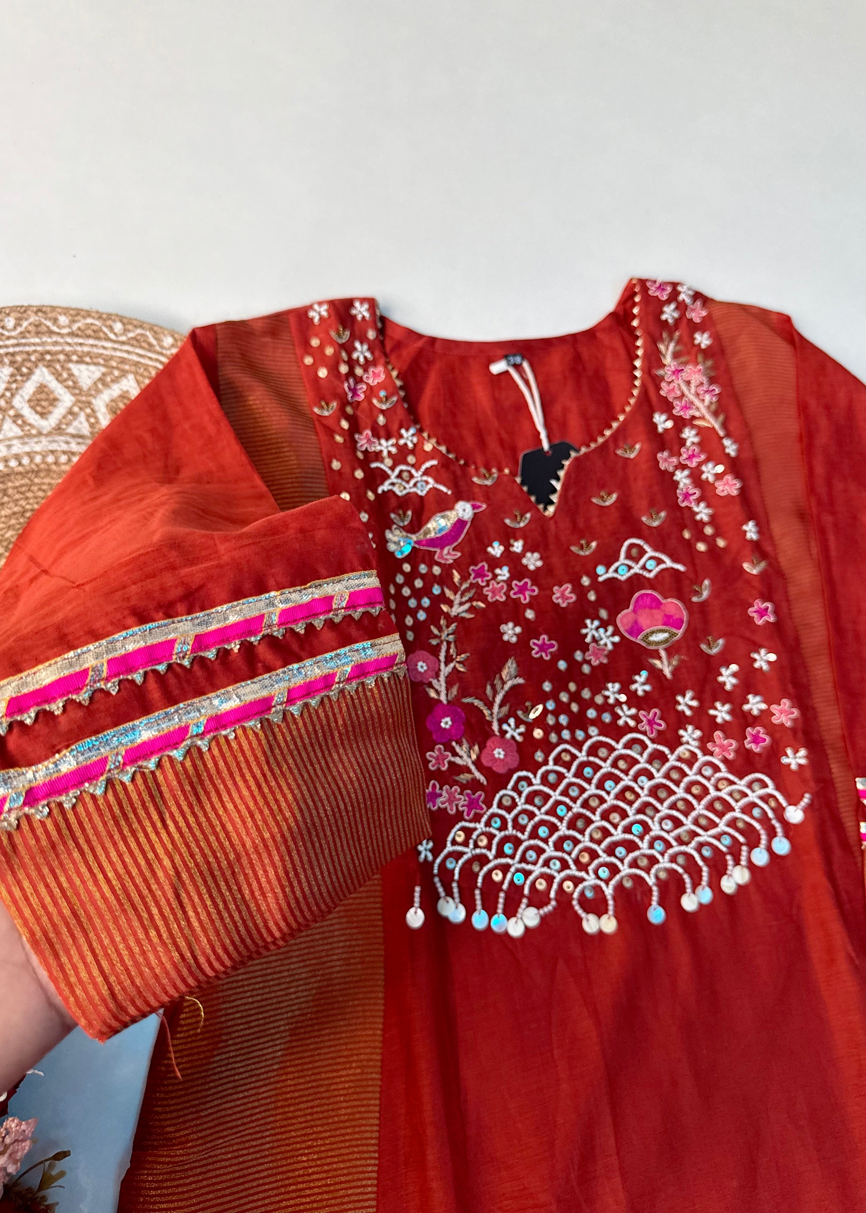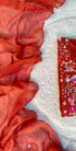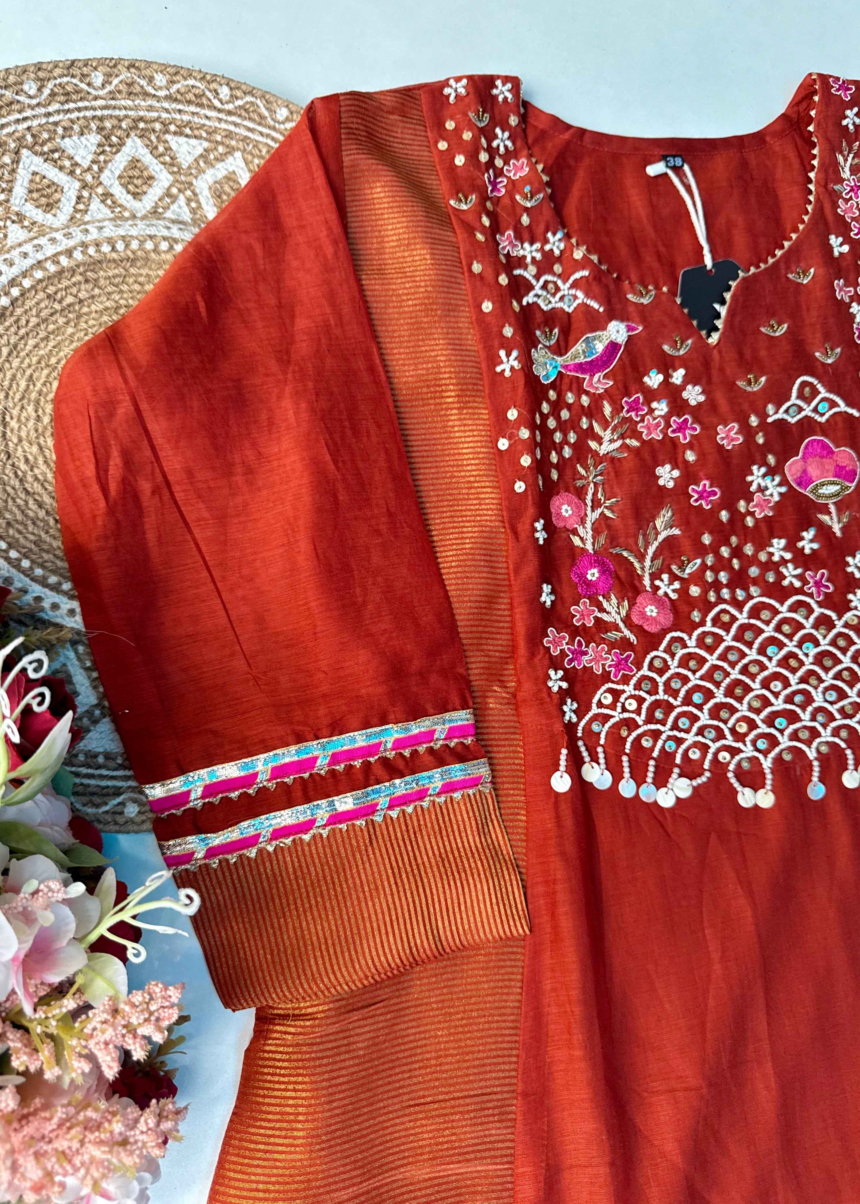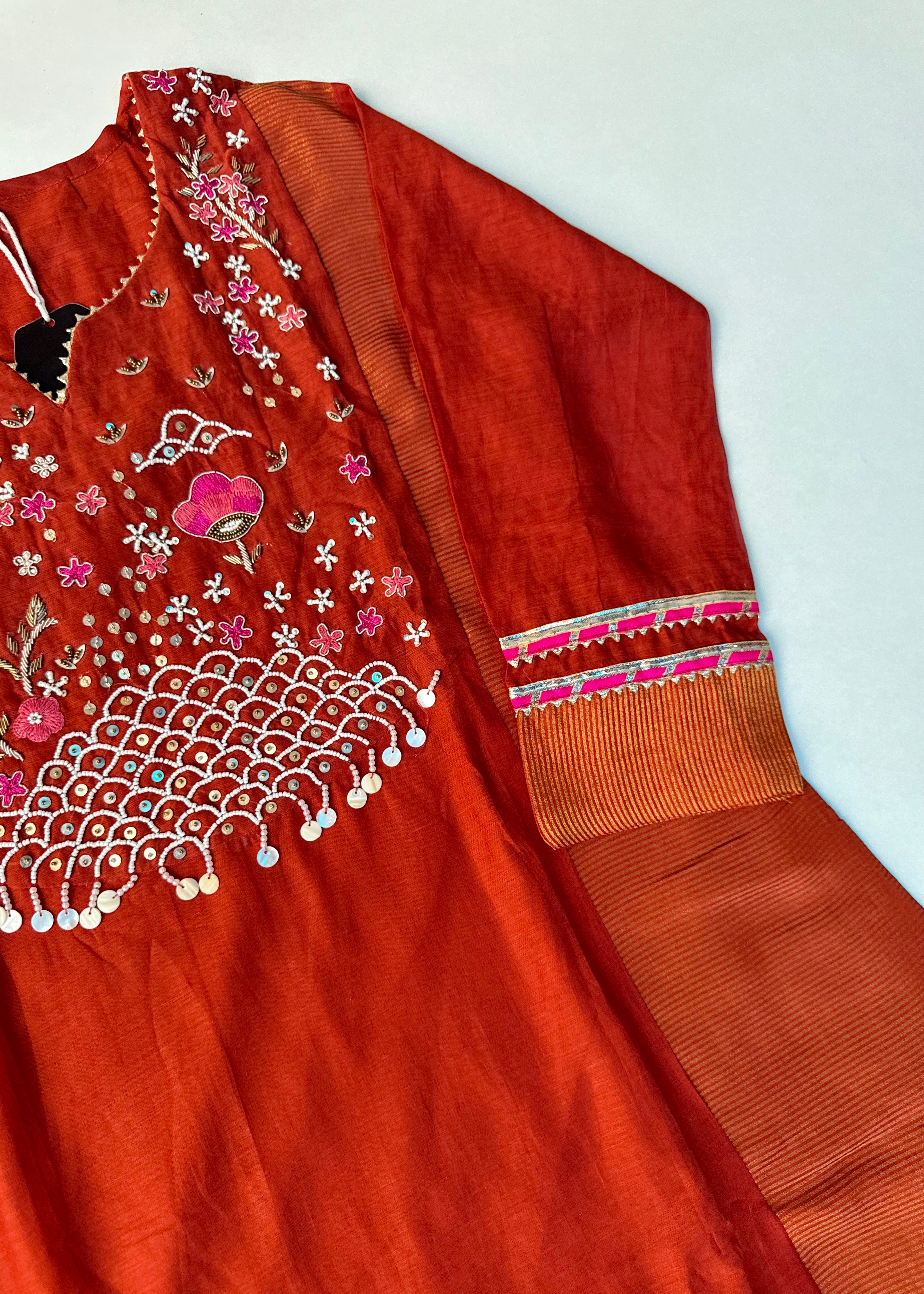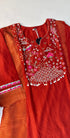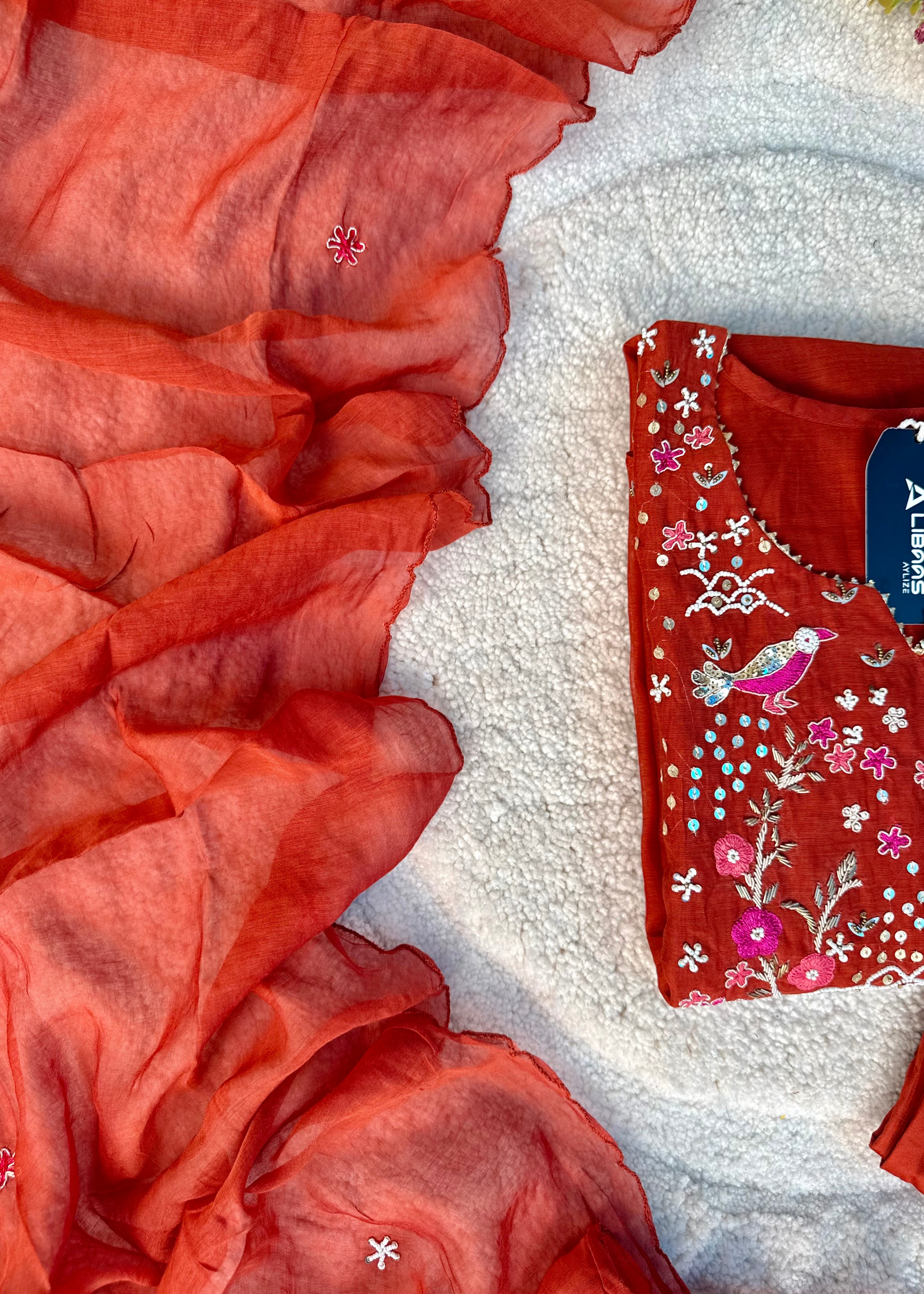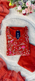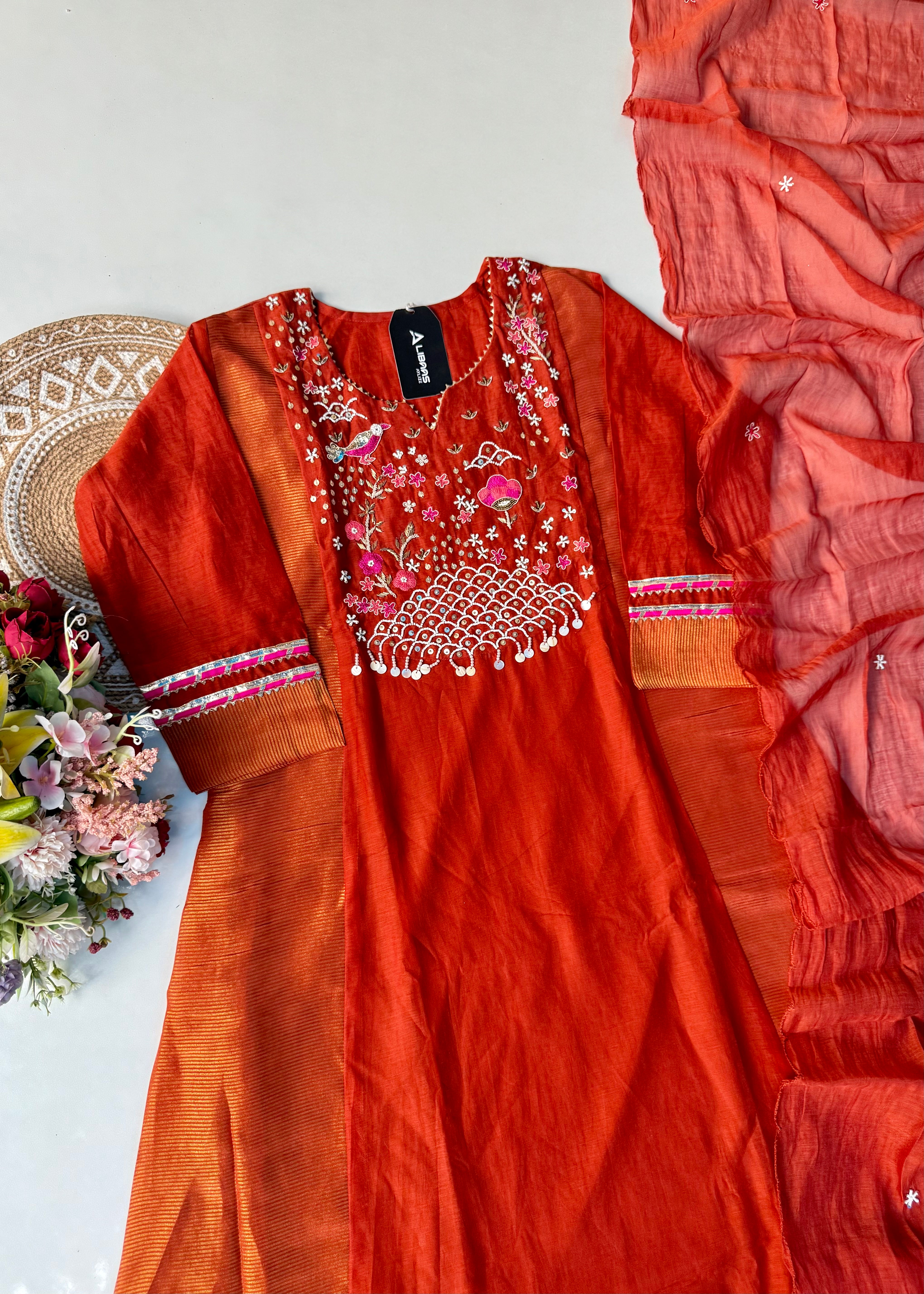 Elevate your ethnic wardrobe with this elegant Mul Chanderi straight kurta set. Designed in a rich deep red color, the kurta features intricate handwork embroidery on the neckline and sleeves, paired with a matching bottom. The set is completed with a contrast organza dupatta adorned with golden woven stripes and a delicate lace border, making it perfect for festive occasions, weddings, and parties