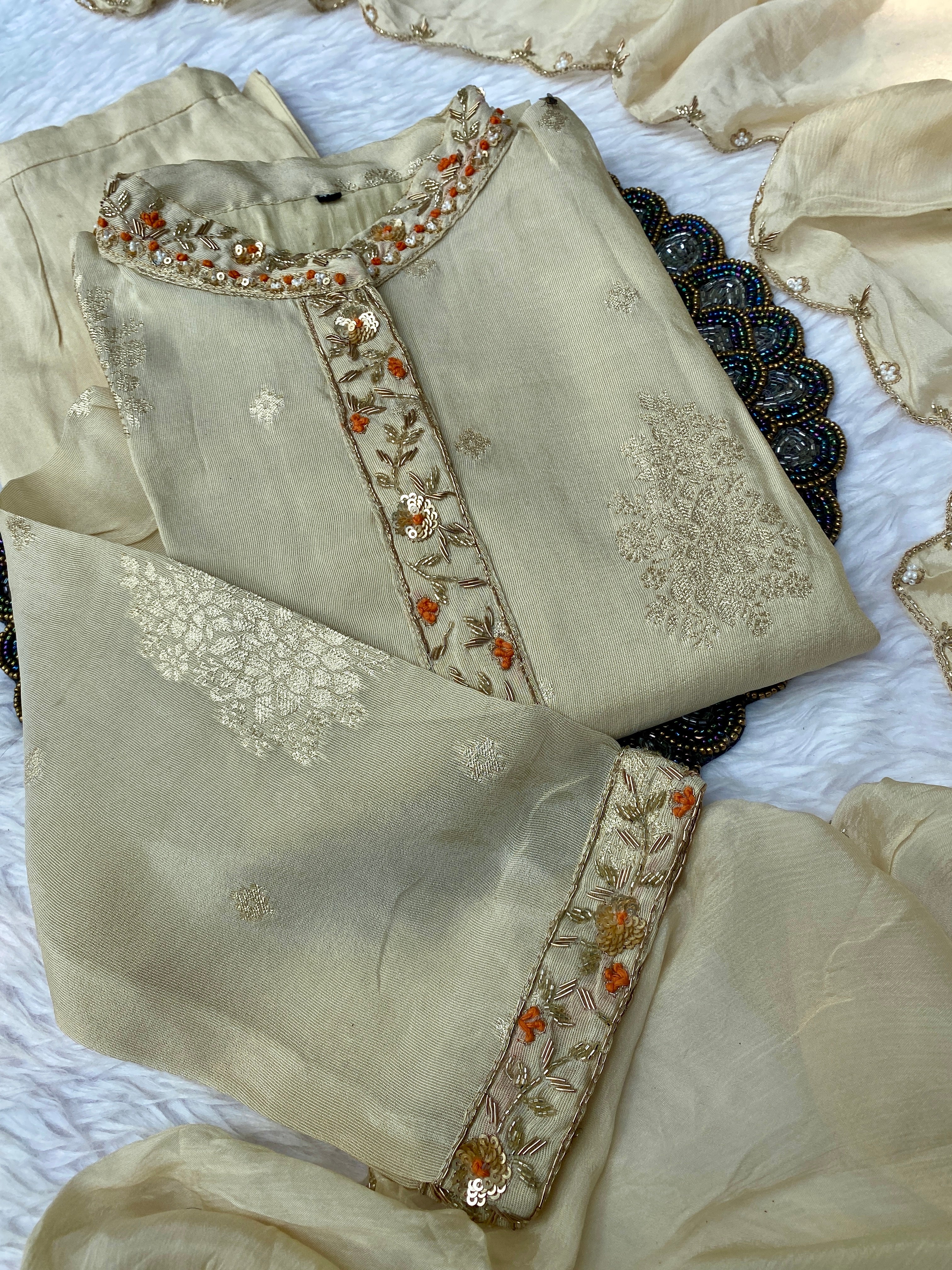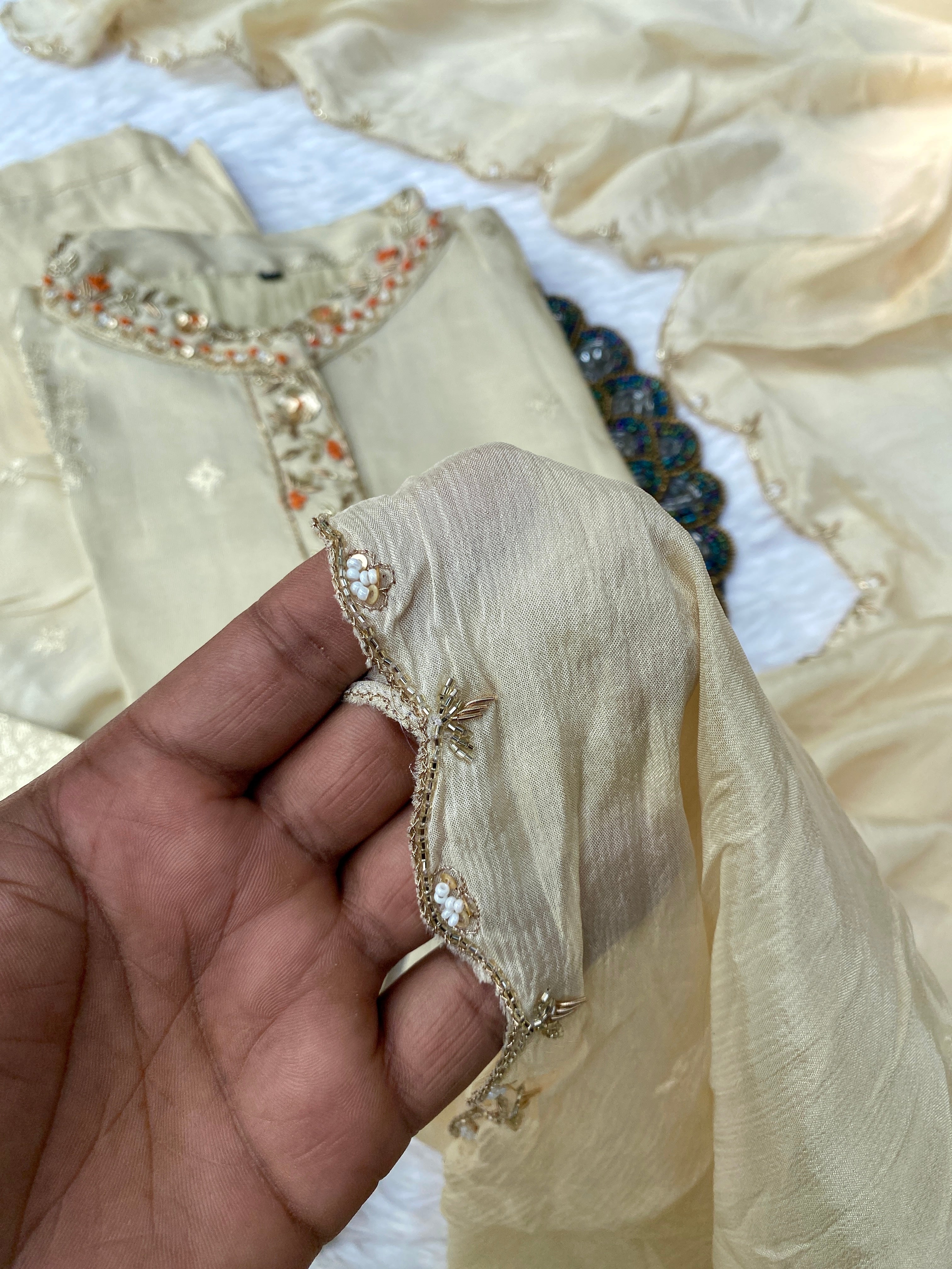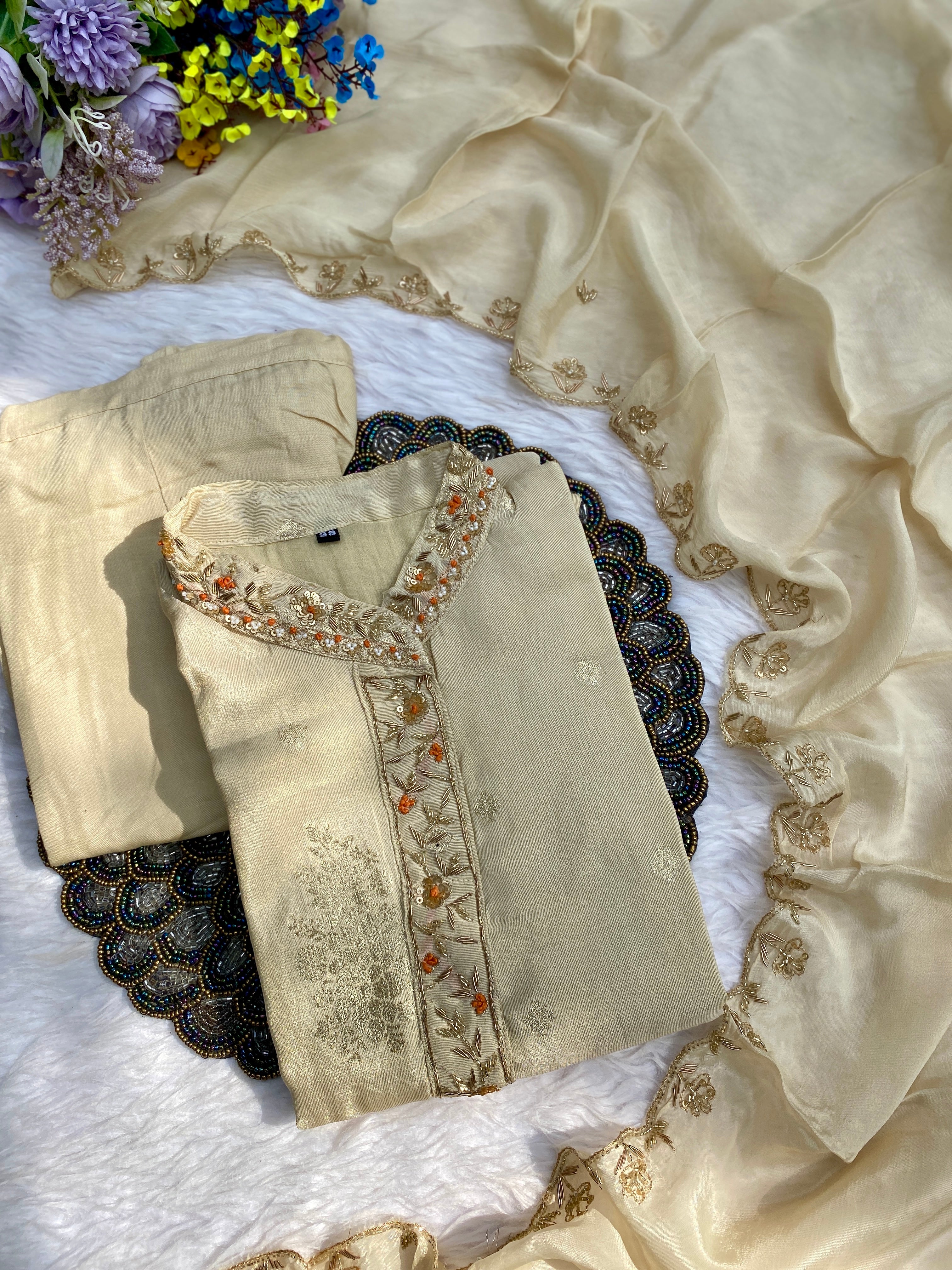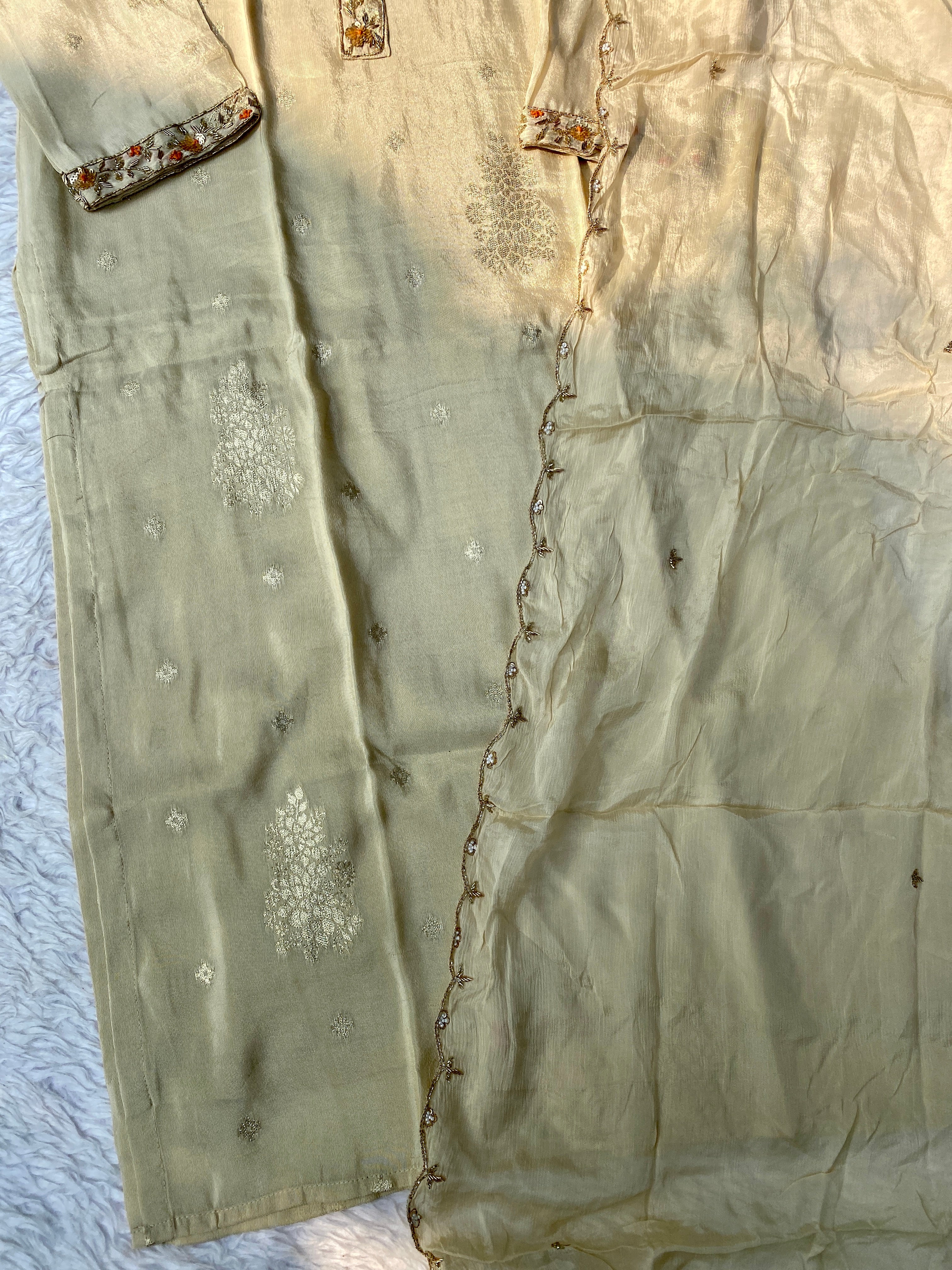 Tissue silk kurta set with handwork with a Chinnon dupatta with all side handwork & lace work & detailing and a plane silk bottom