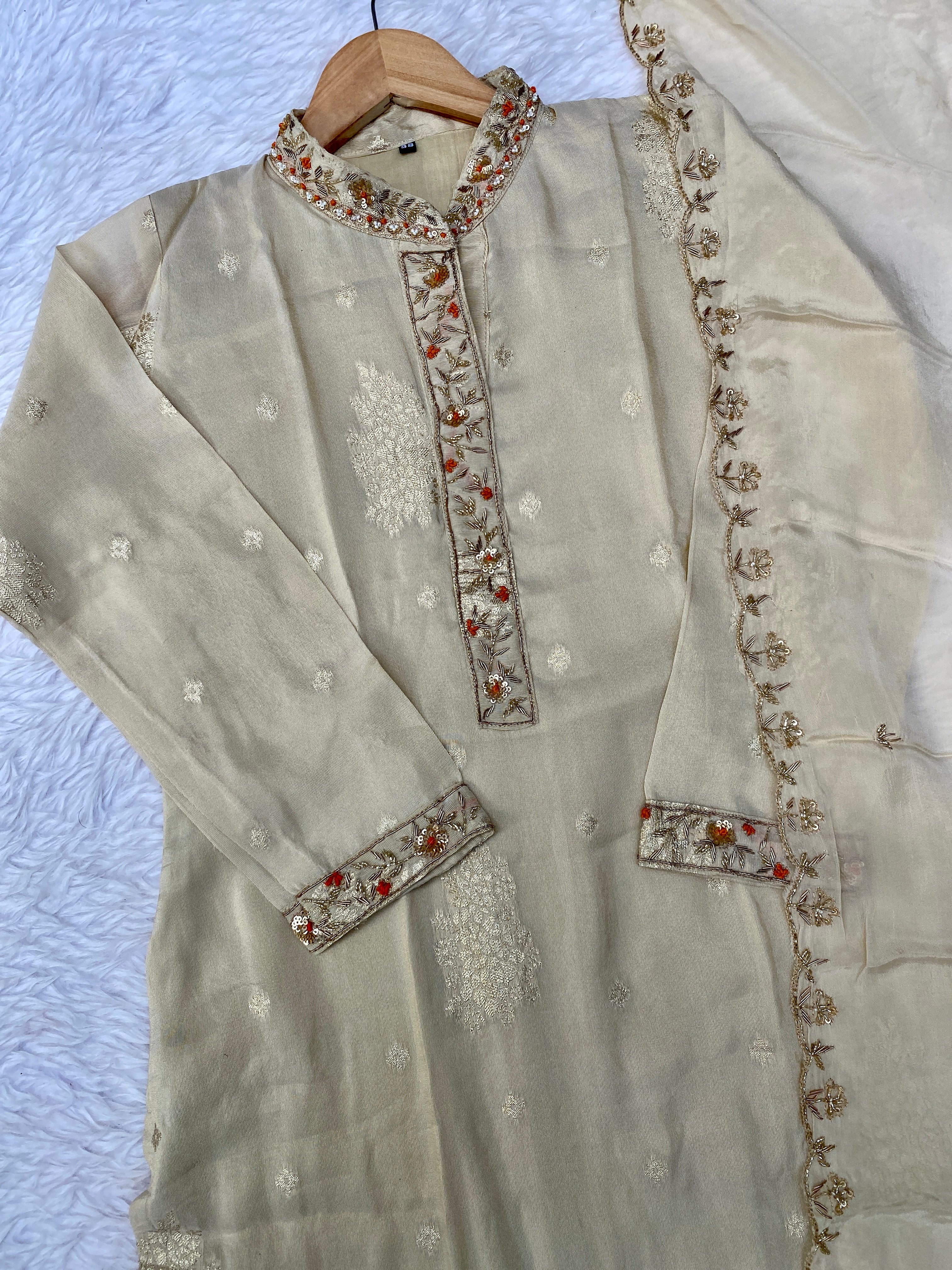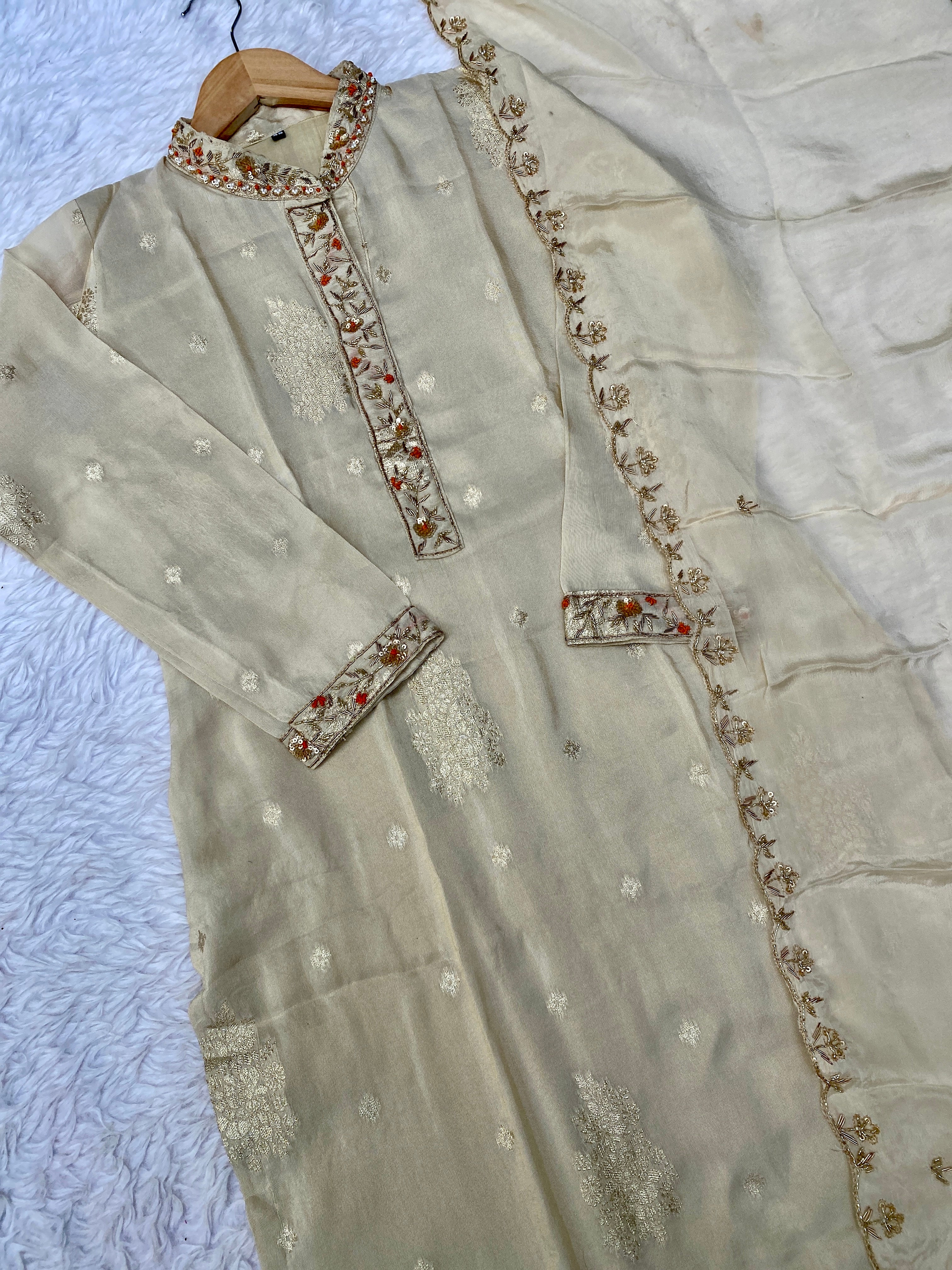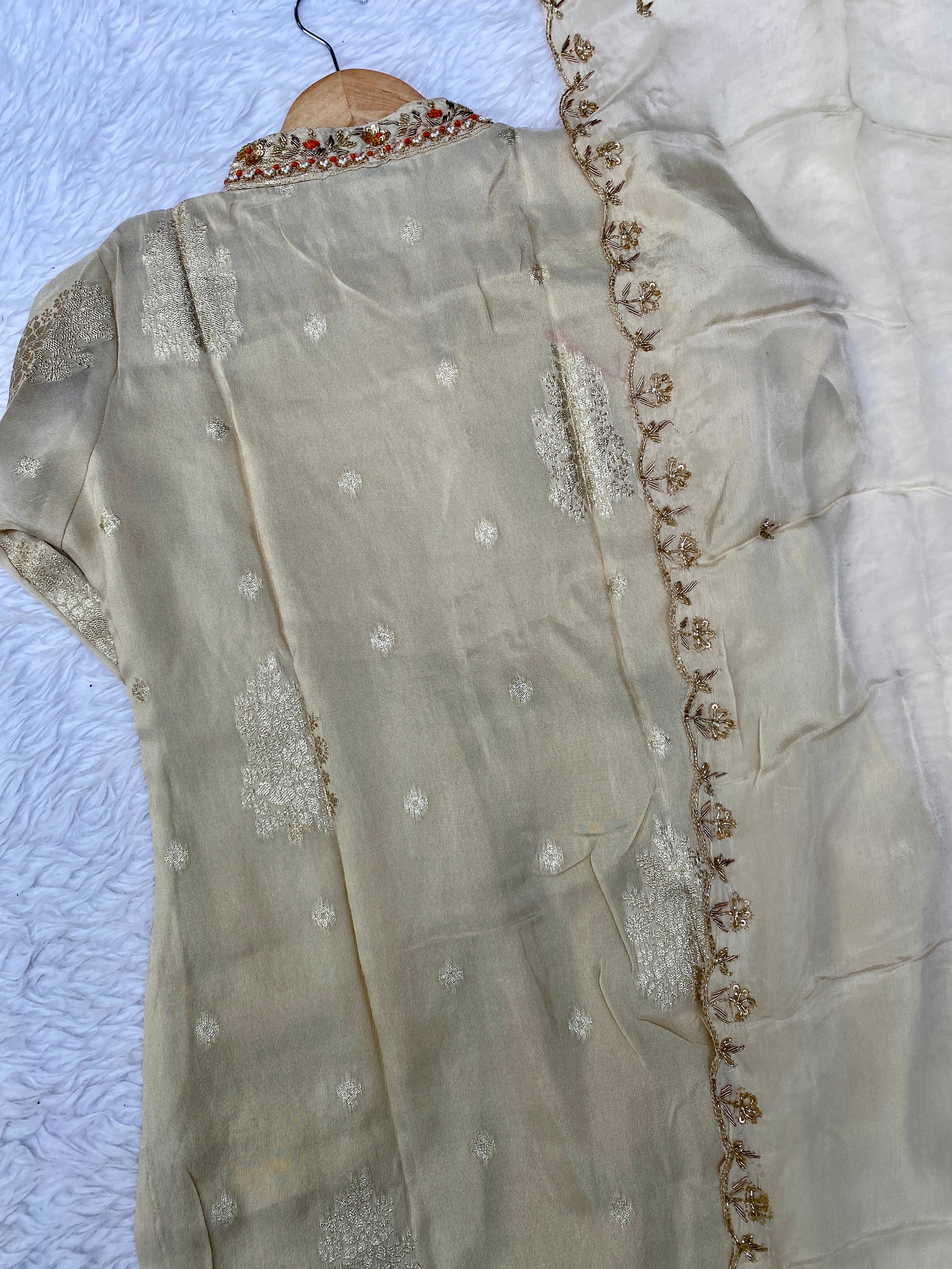 Tissue silk kurta set with handwork with a Chinnon dupatta with all side handwork & lace work & detailing and a plane silk bottom