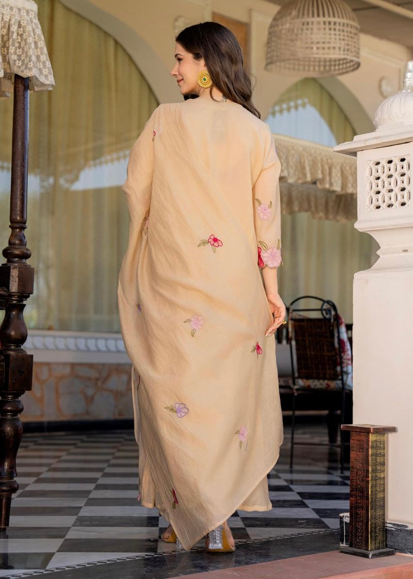 Grace meets craftsmanship in this elegant Mul Chanderi Anarkali Kurta Set, featuring intricate appliqué embroidery work all over the top. Tailored in soft and breathable mul chanderi fabric, the set includes a matching bottom and dupatta, offering a complete and effortlessly graceful look. Perfect for festive occasions, intimate gatherings, or day-to-evening style. Lightweight, luxurious, and designed for comfort with charm.