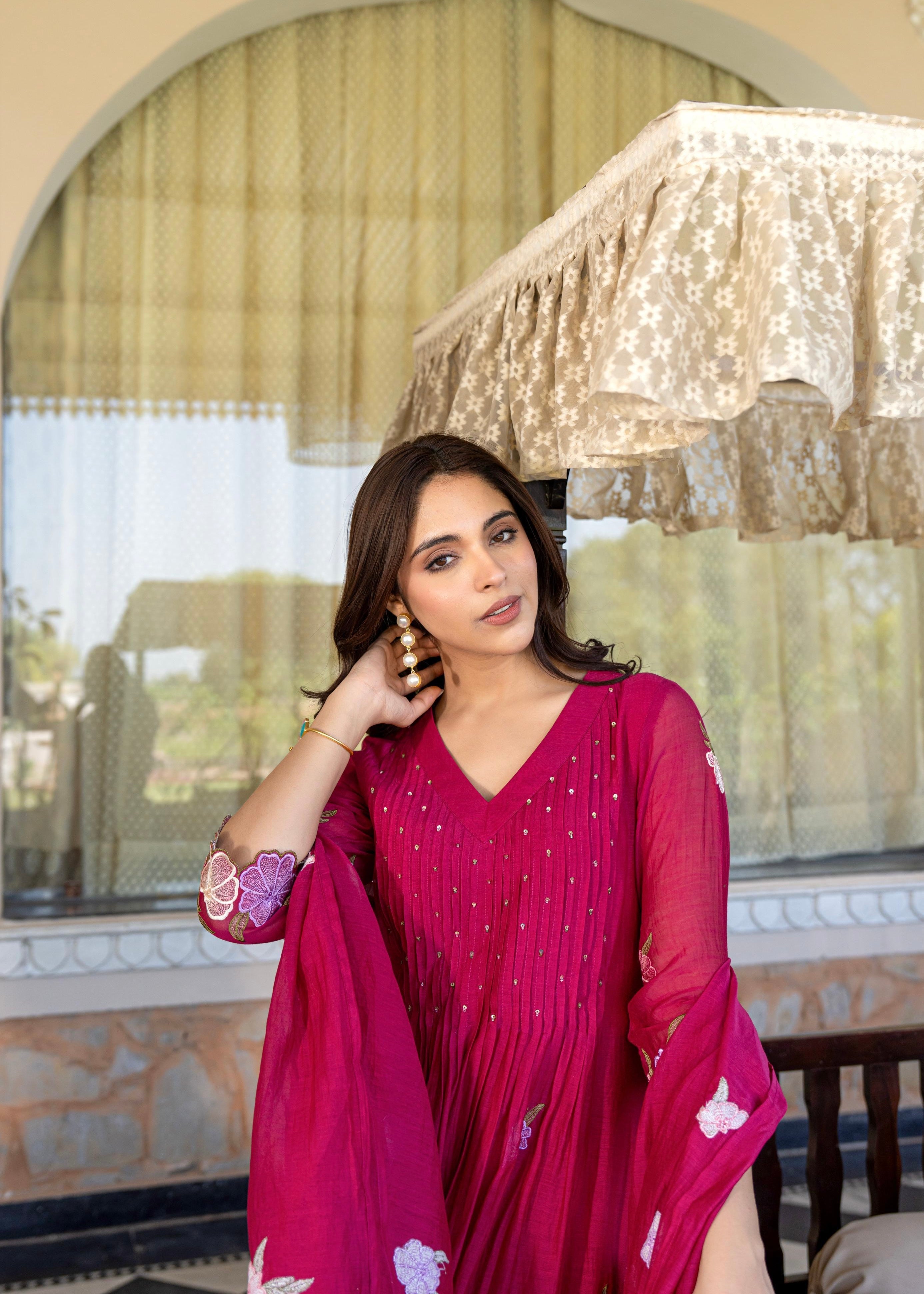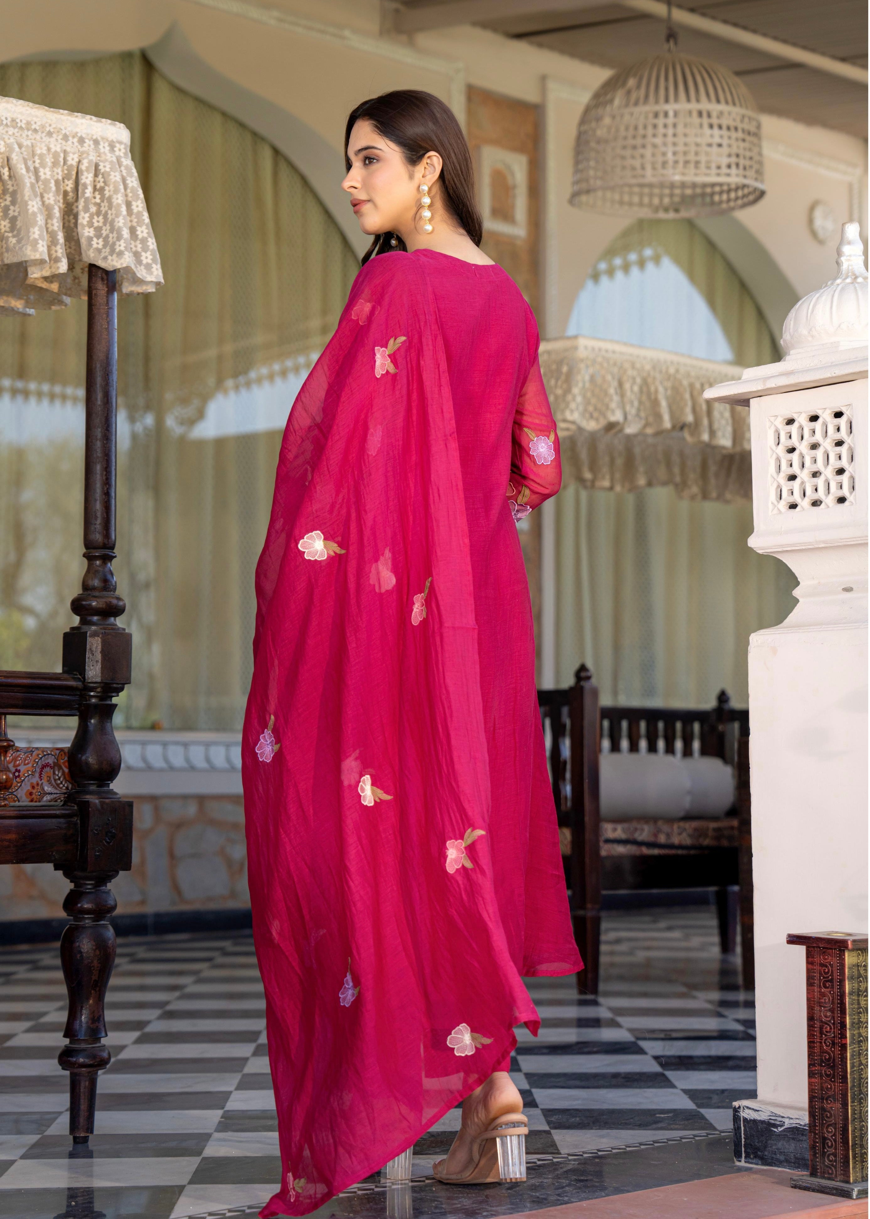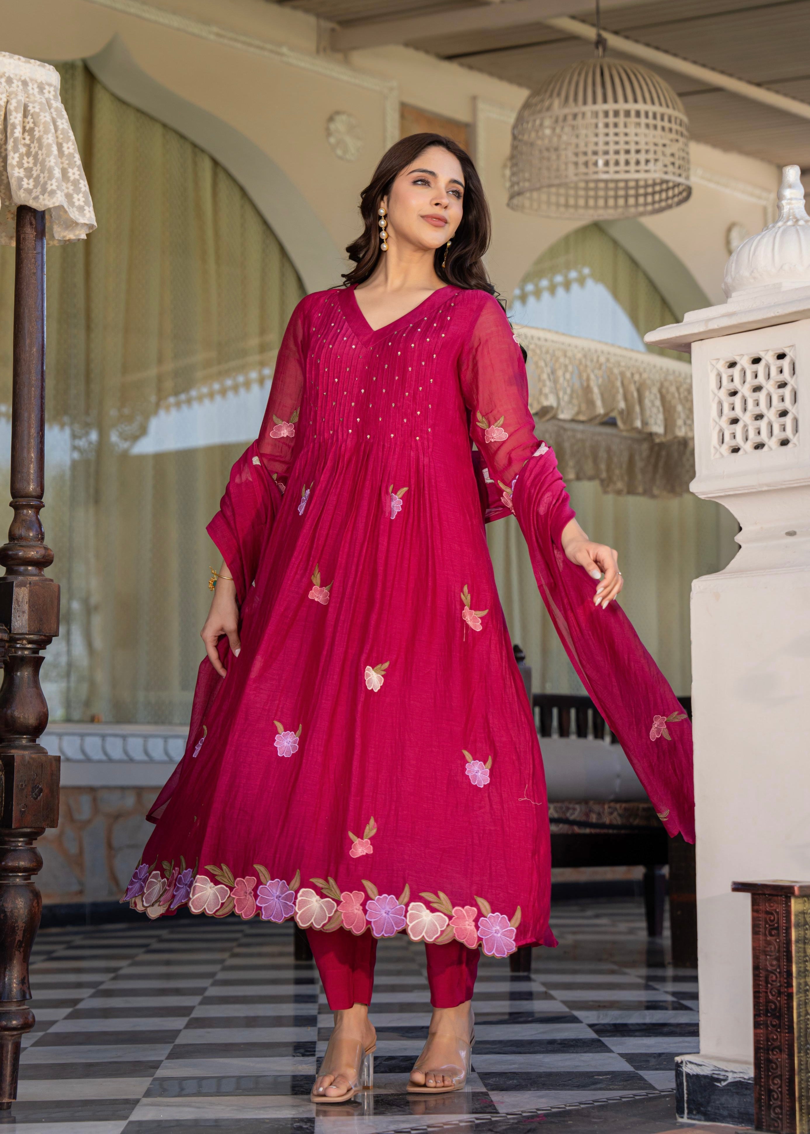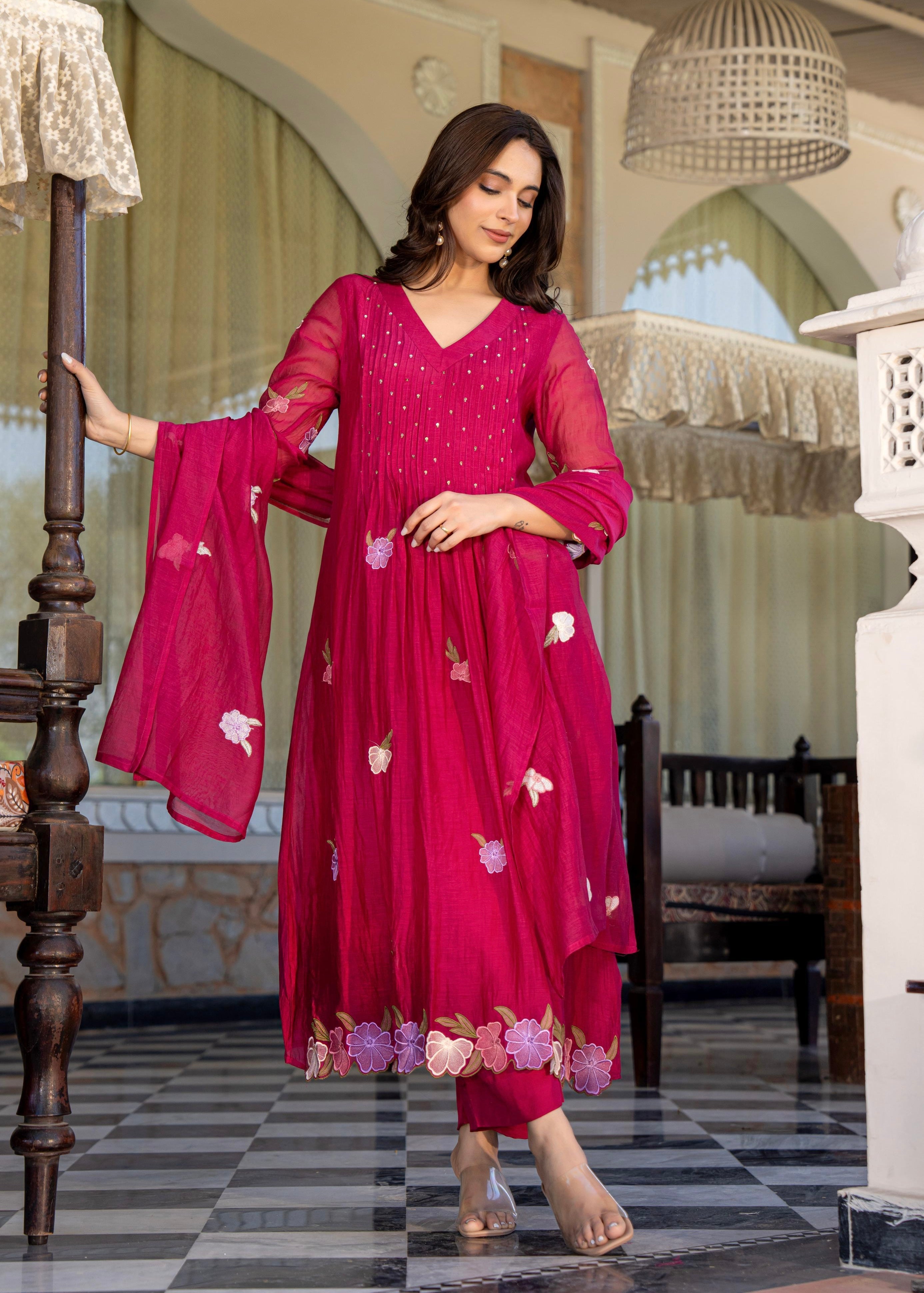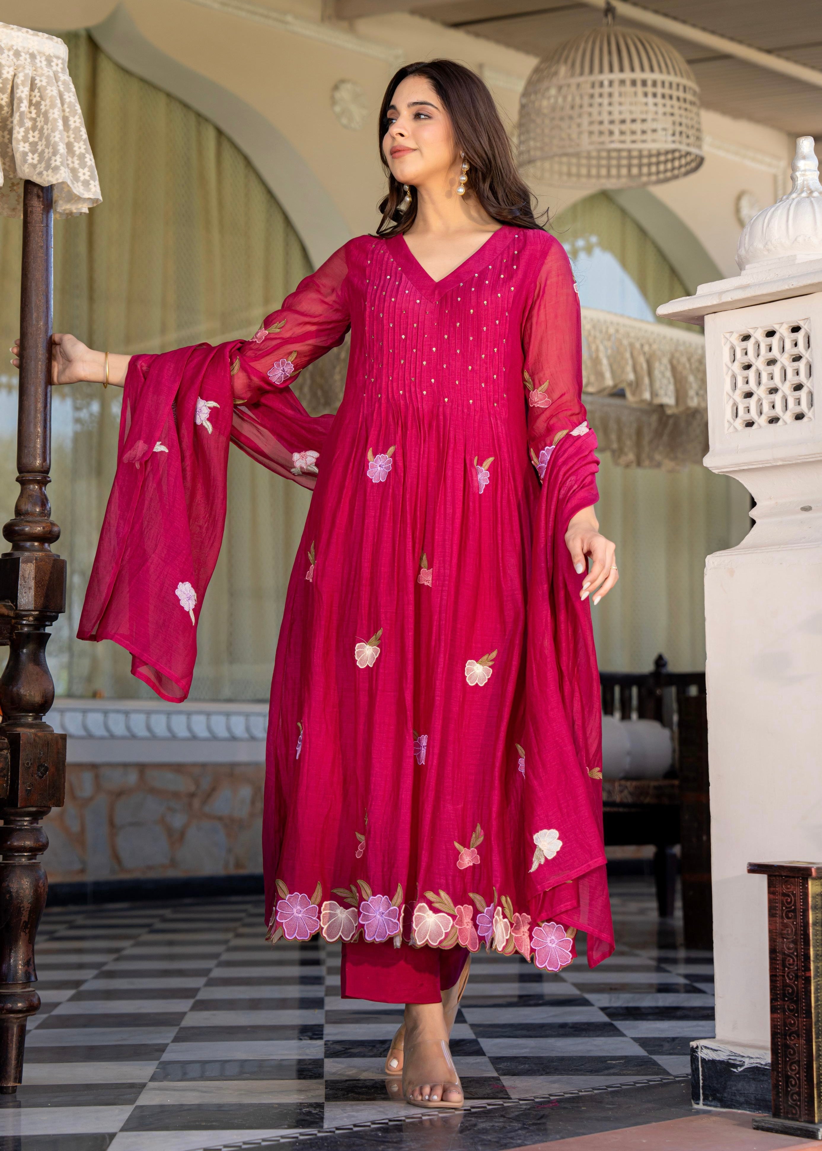 “Jhanvi” Luxury Mul Chanderi Anarkali Set | Appliqué Embroidery | Dupatta & Bottom