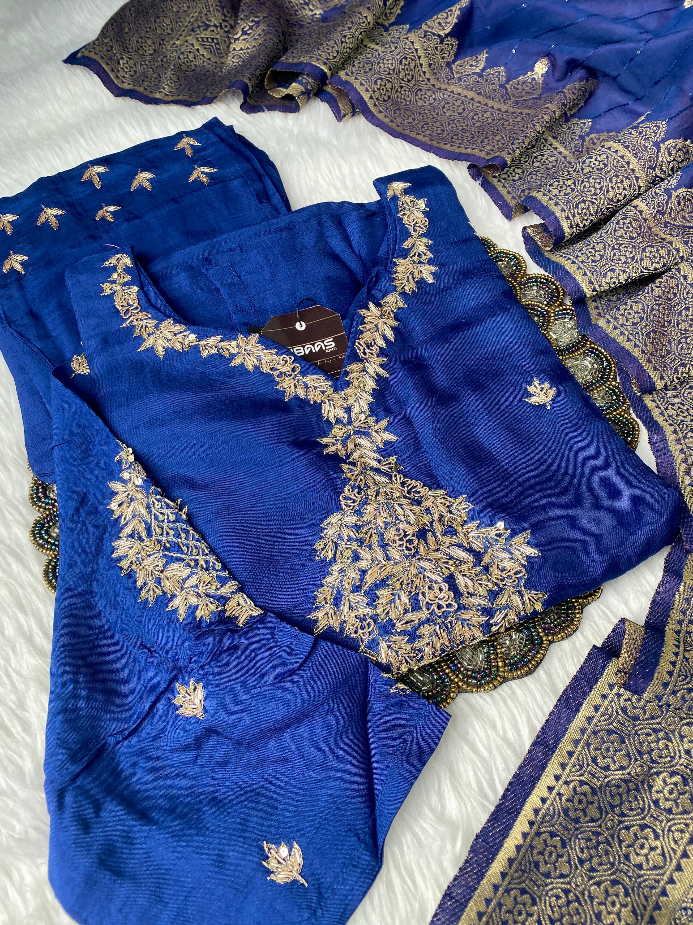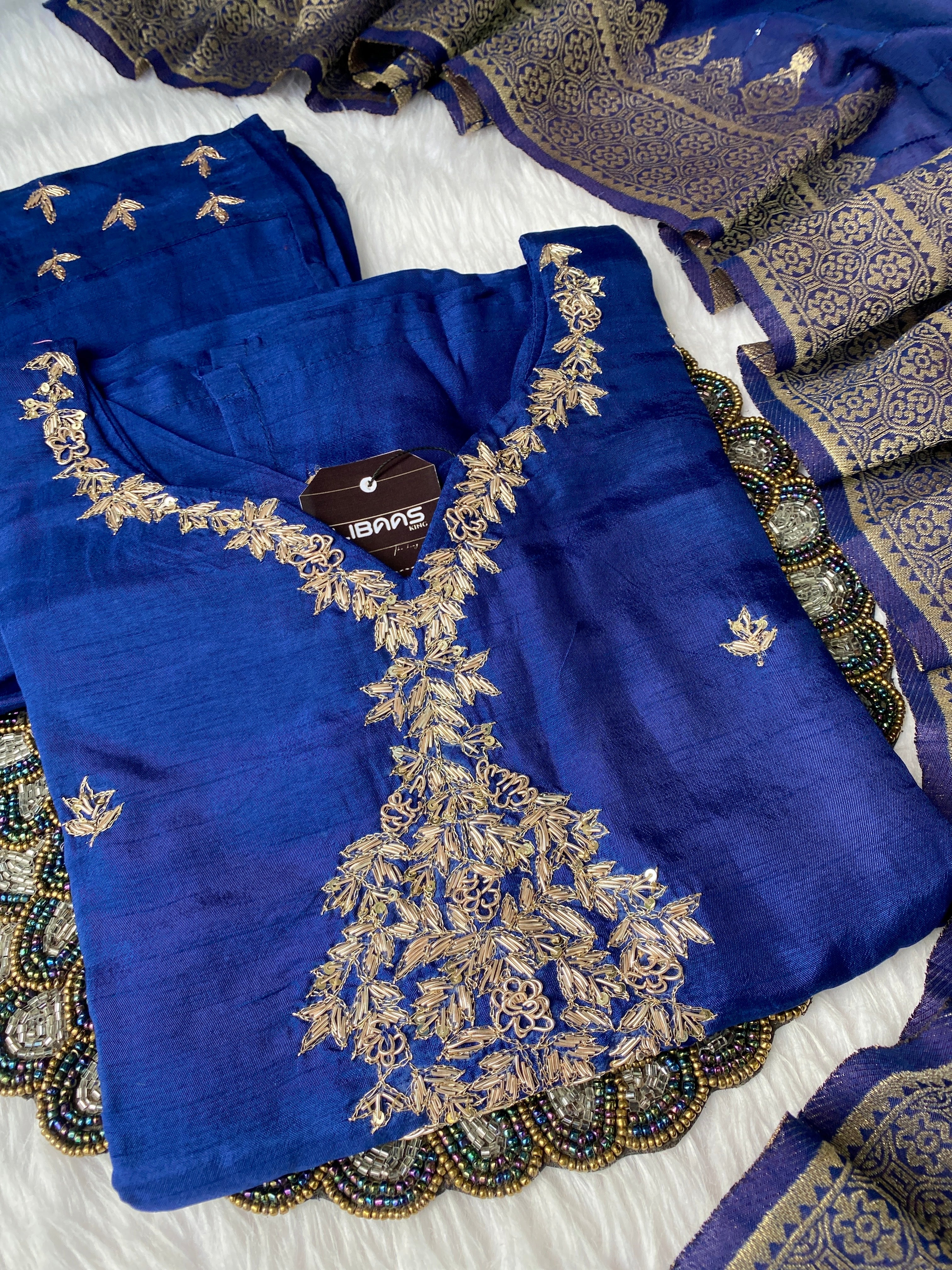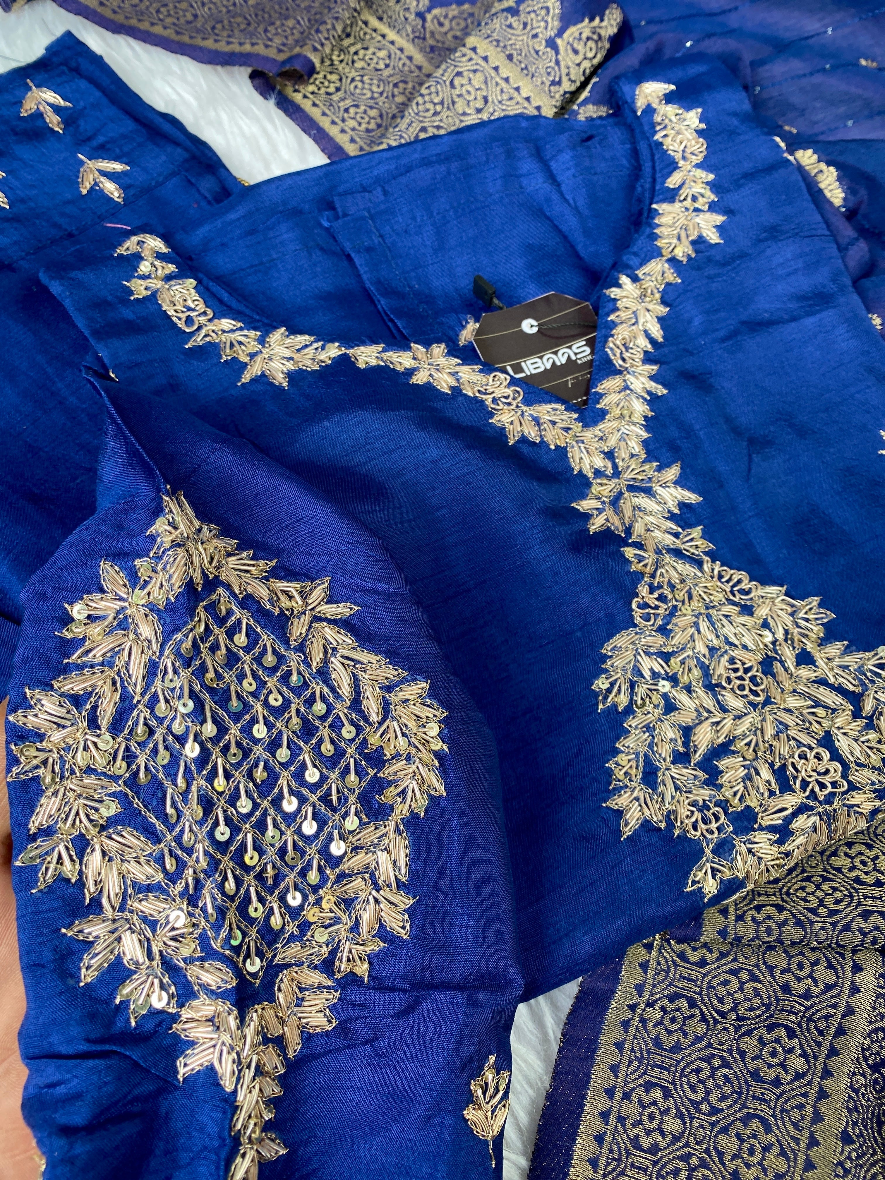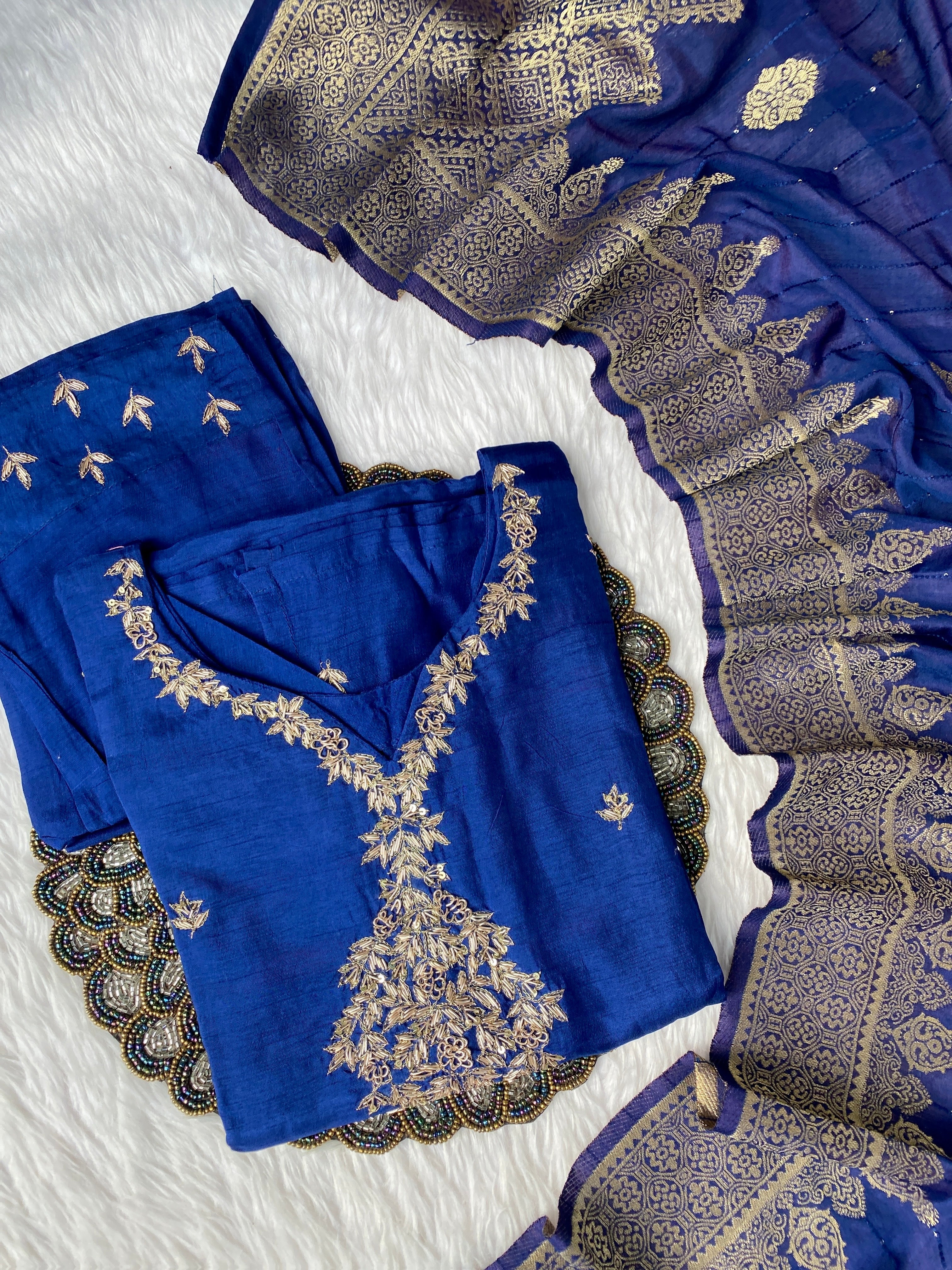 Handcrafted dola silk set with silver zardozi work on the yoke & sleeve of the kurta with a long woven banarsi dupatta paired with a handwork dola silk bottom