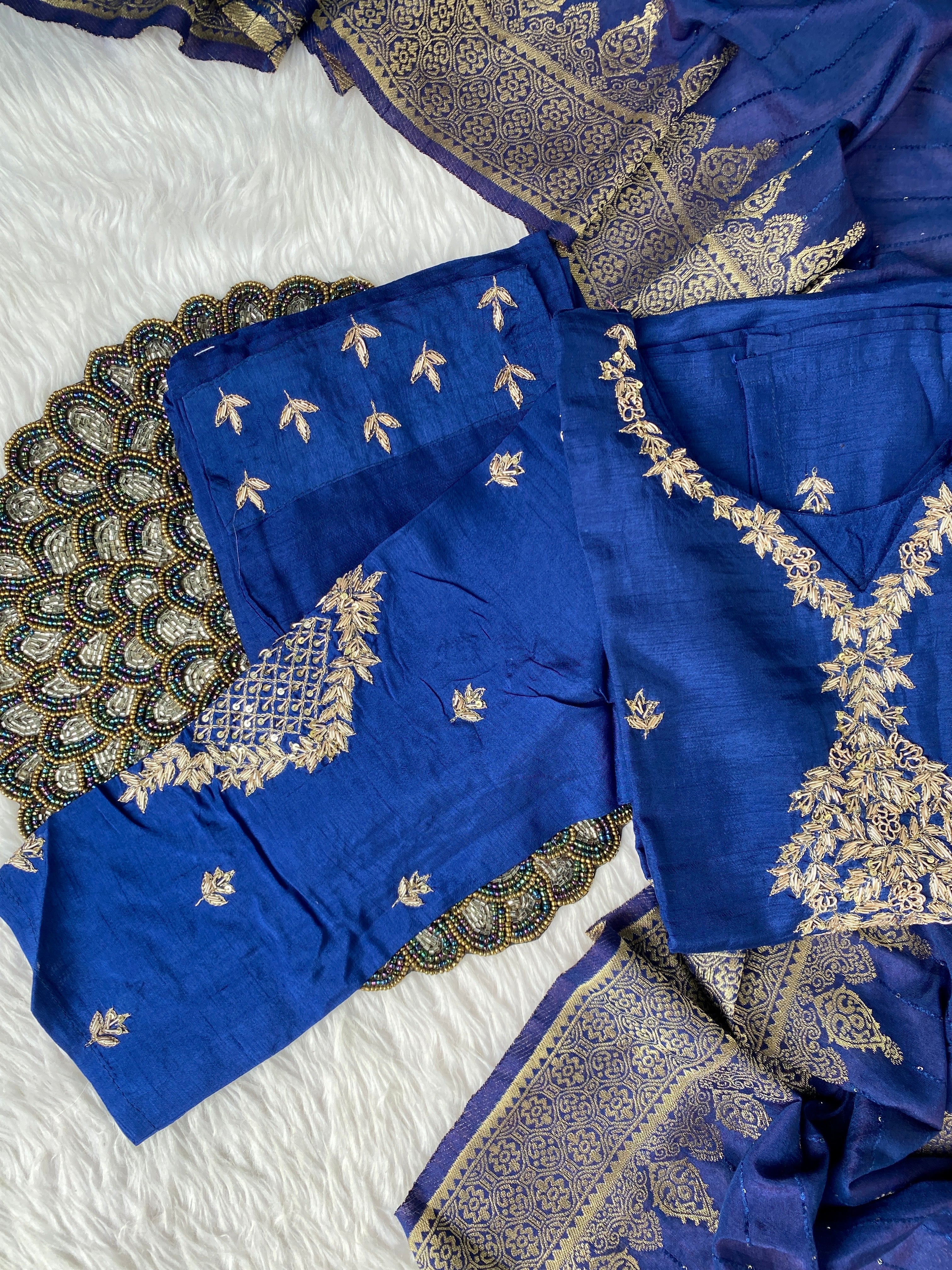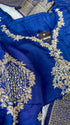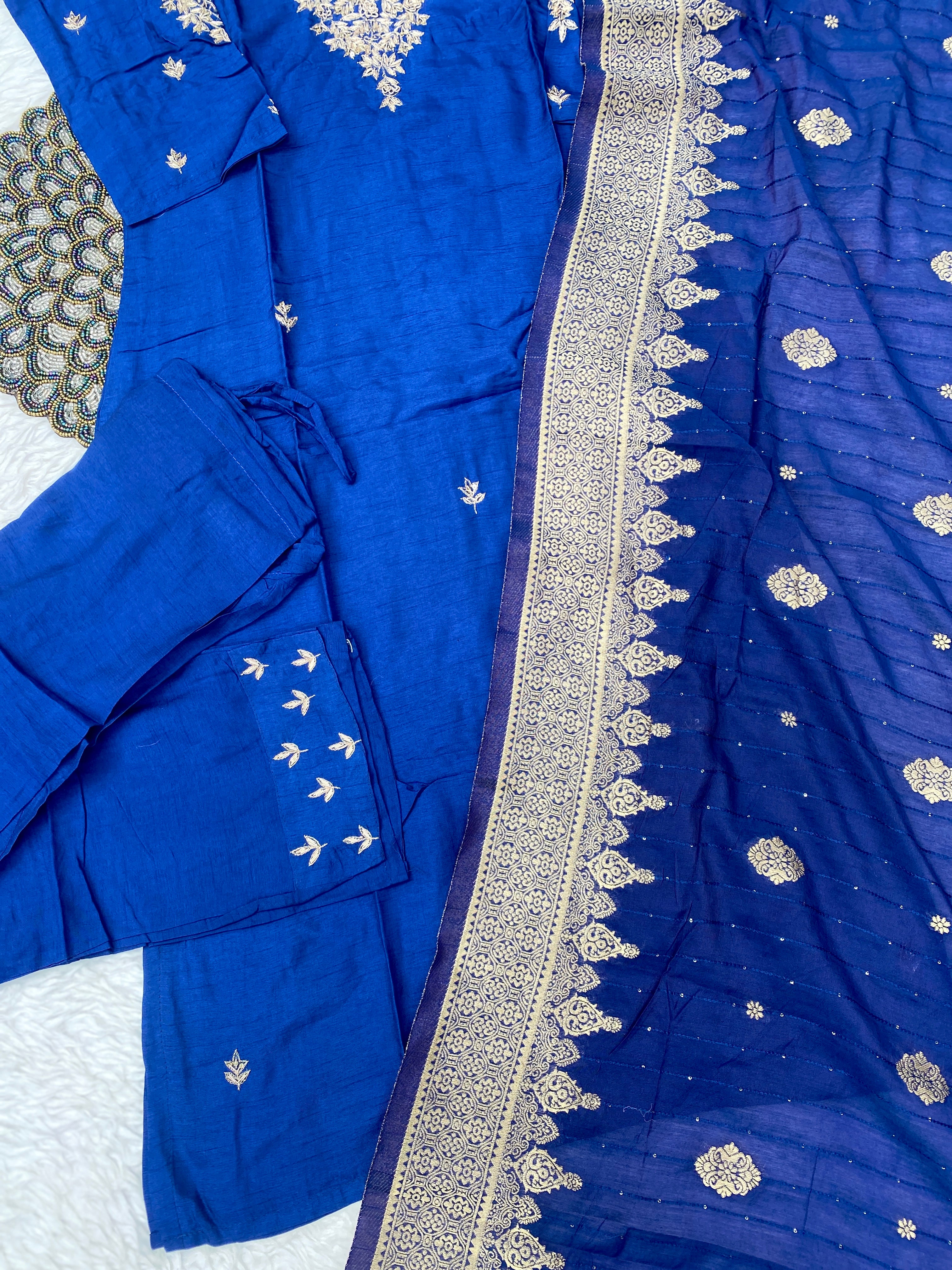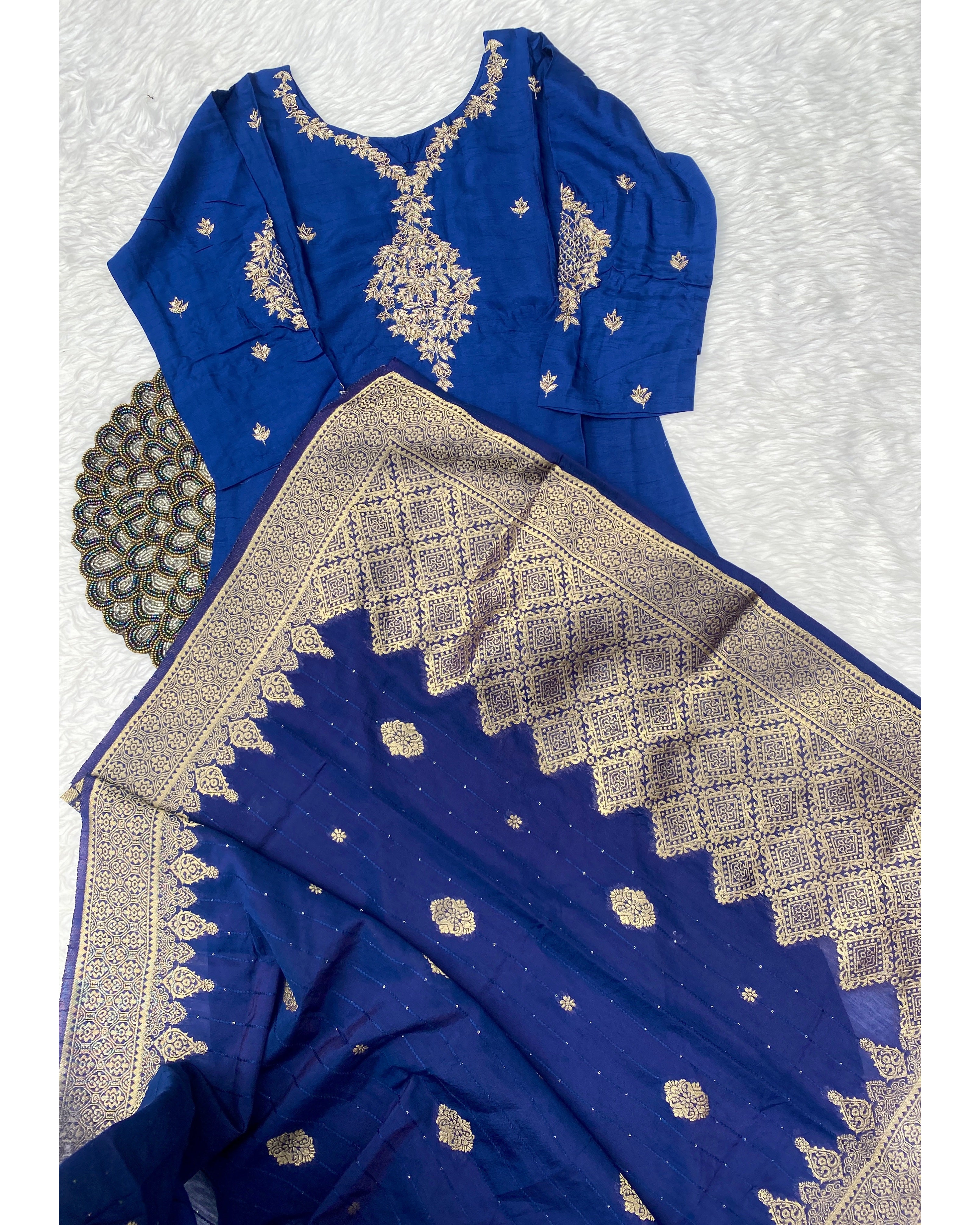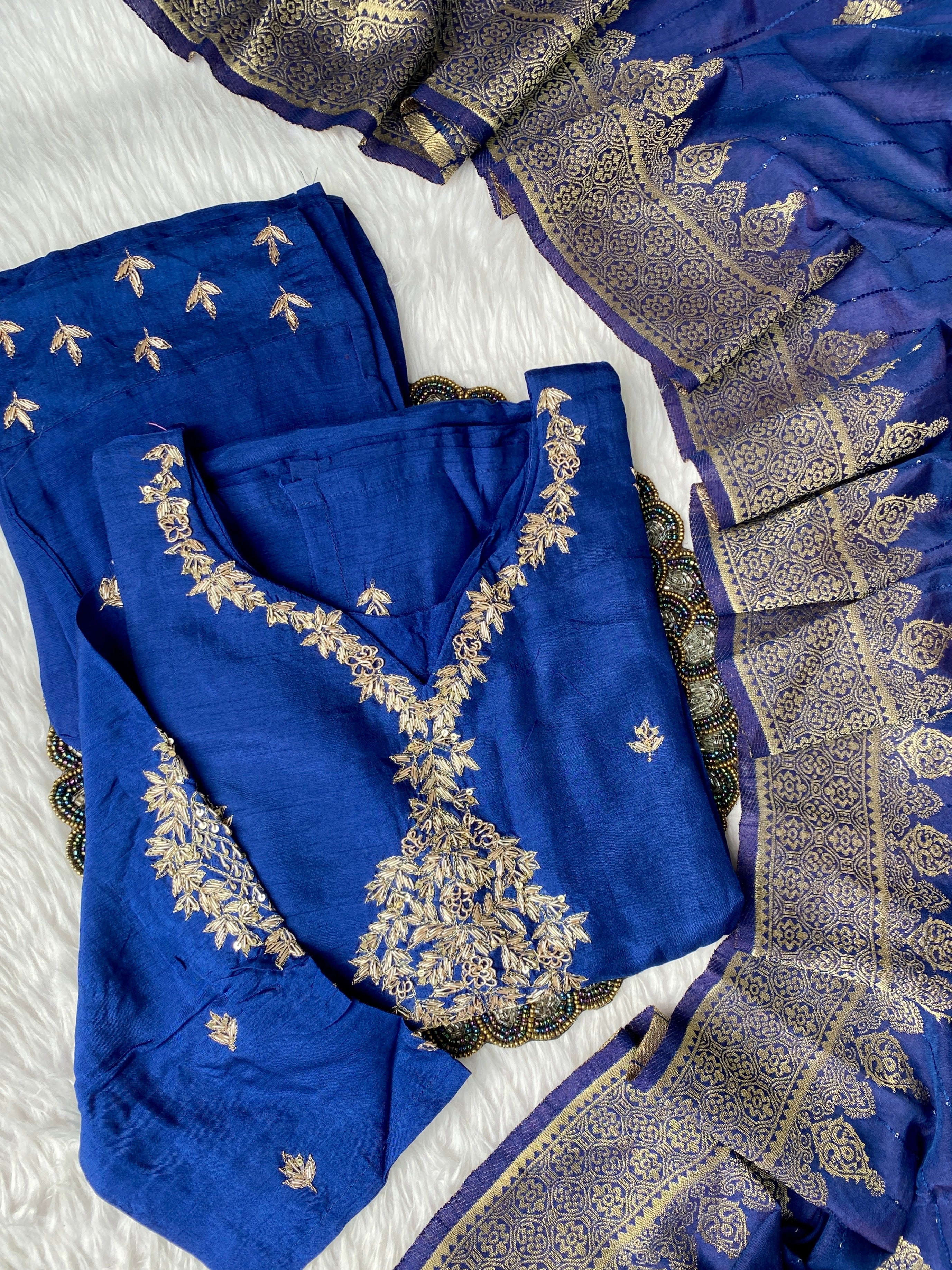 Handcrafted dola silk set with silver zardozi work on the yoke & sleeve of the kurta with a long woven banarsi dupatta paired with a handwork dola silk bottom