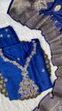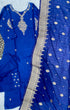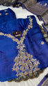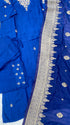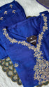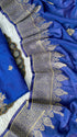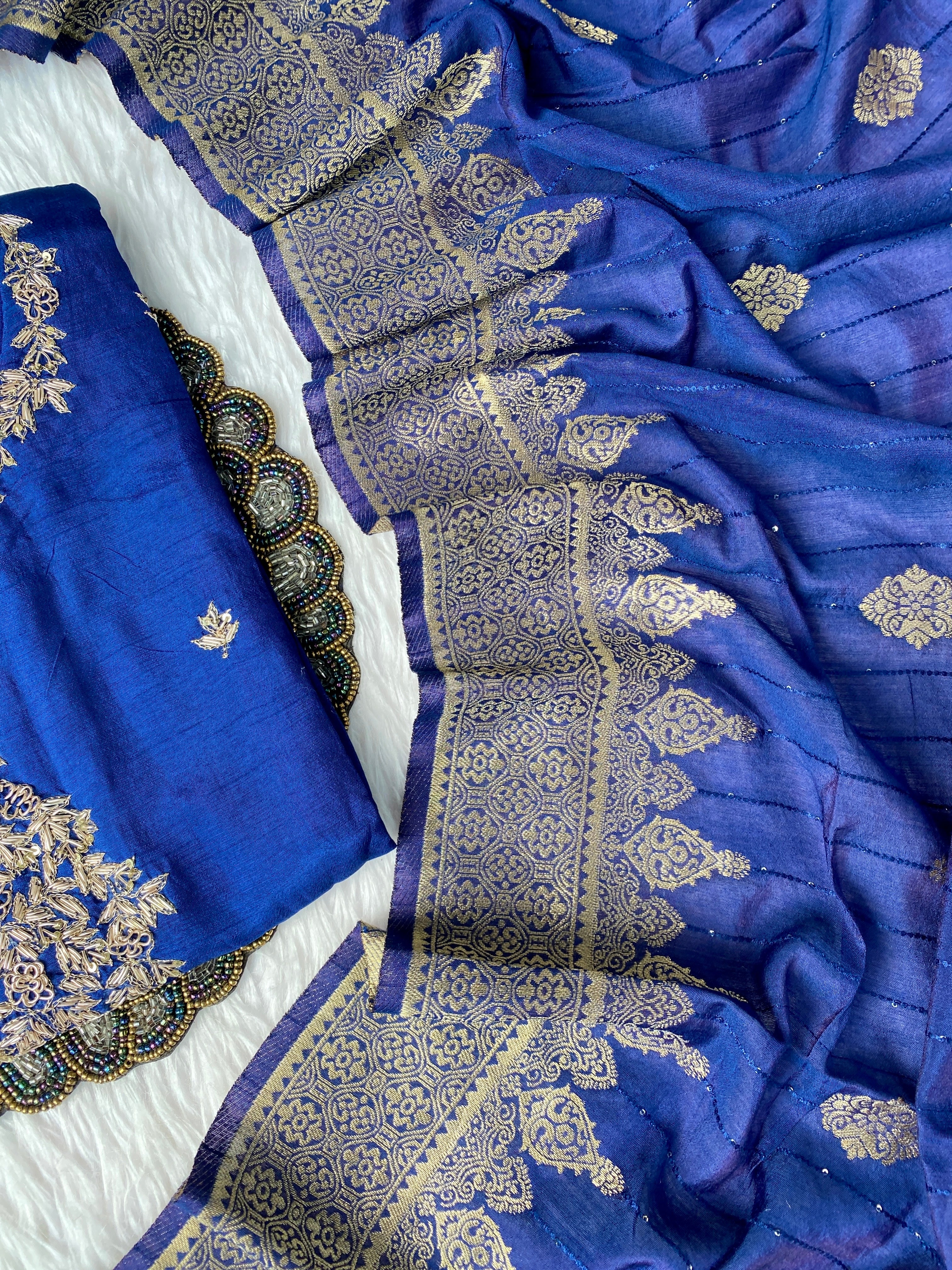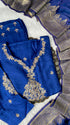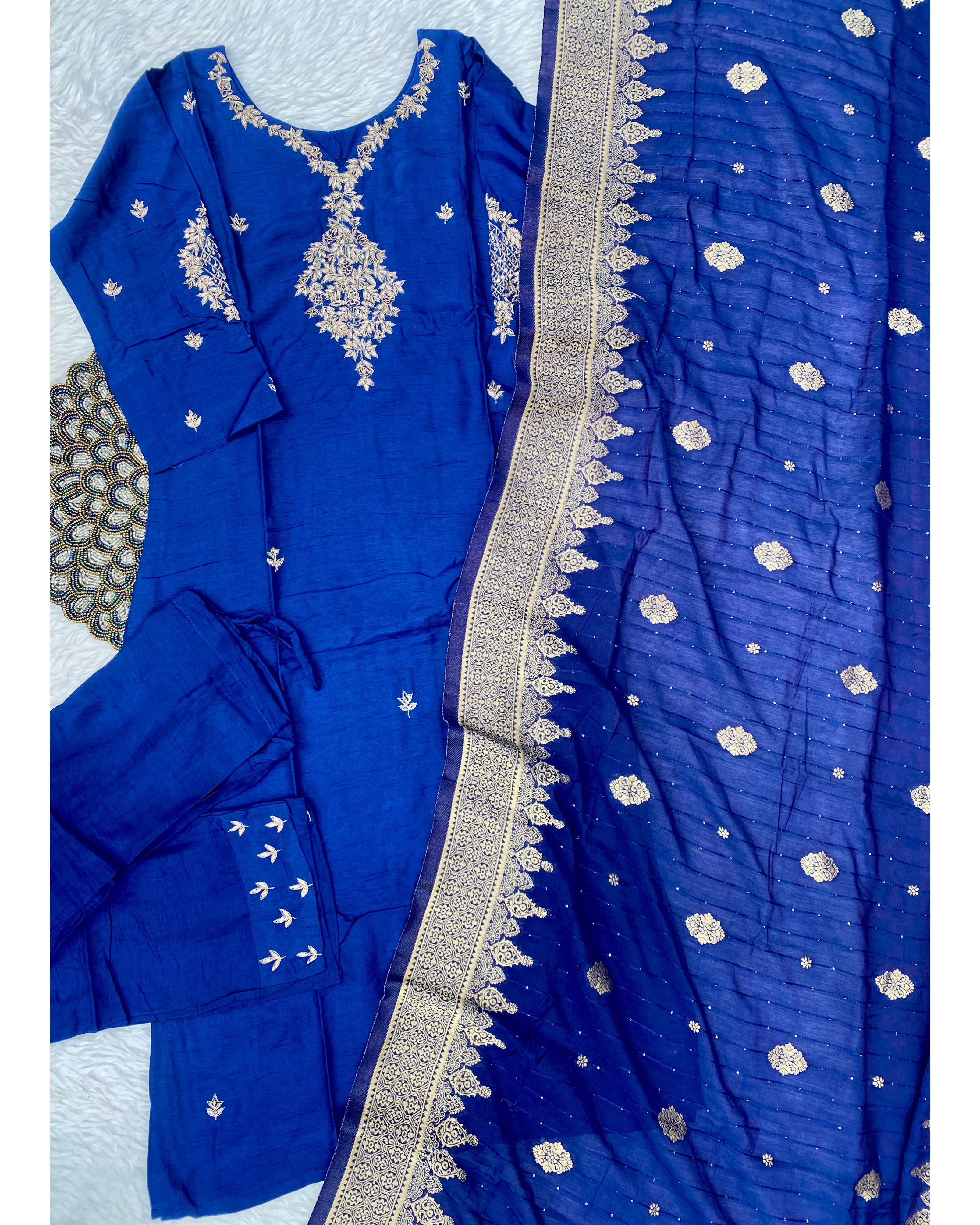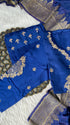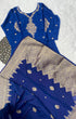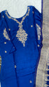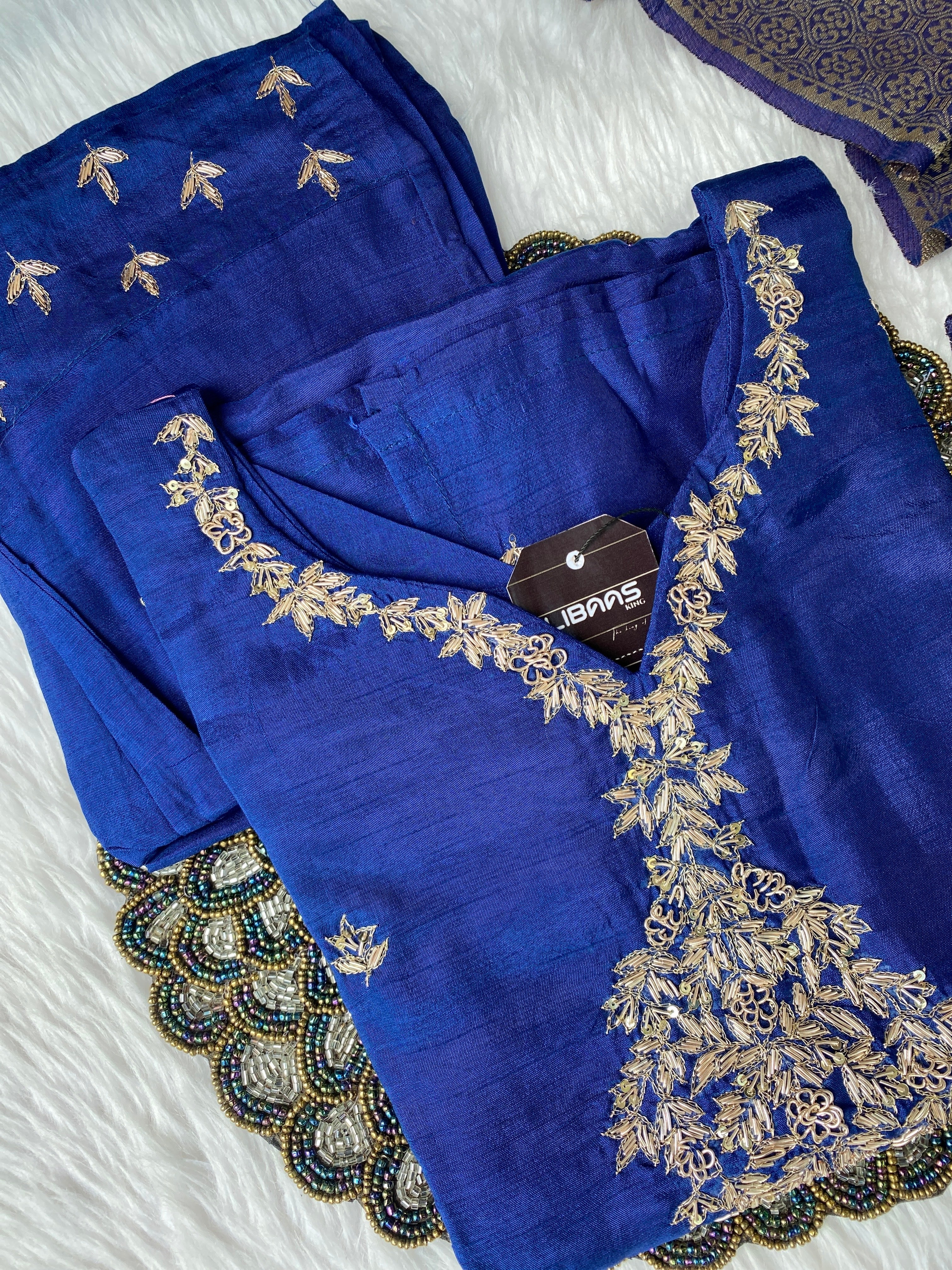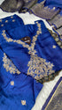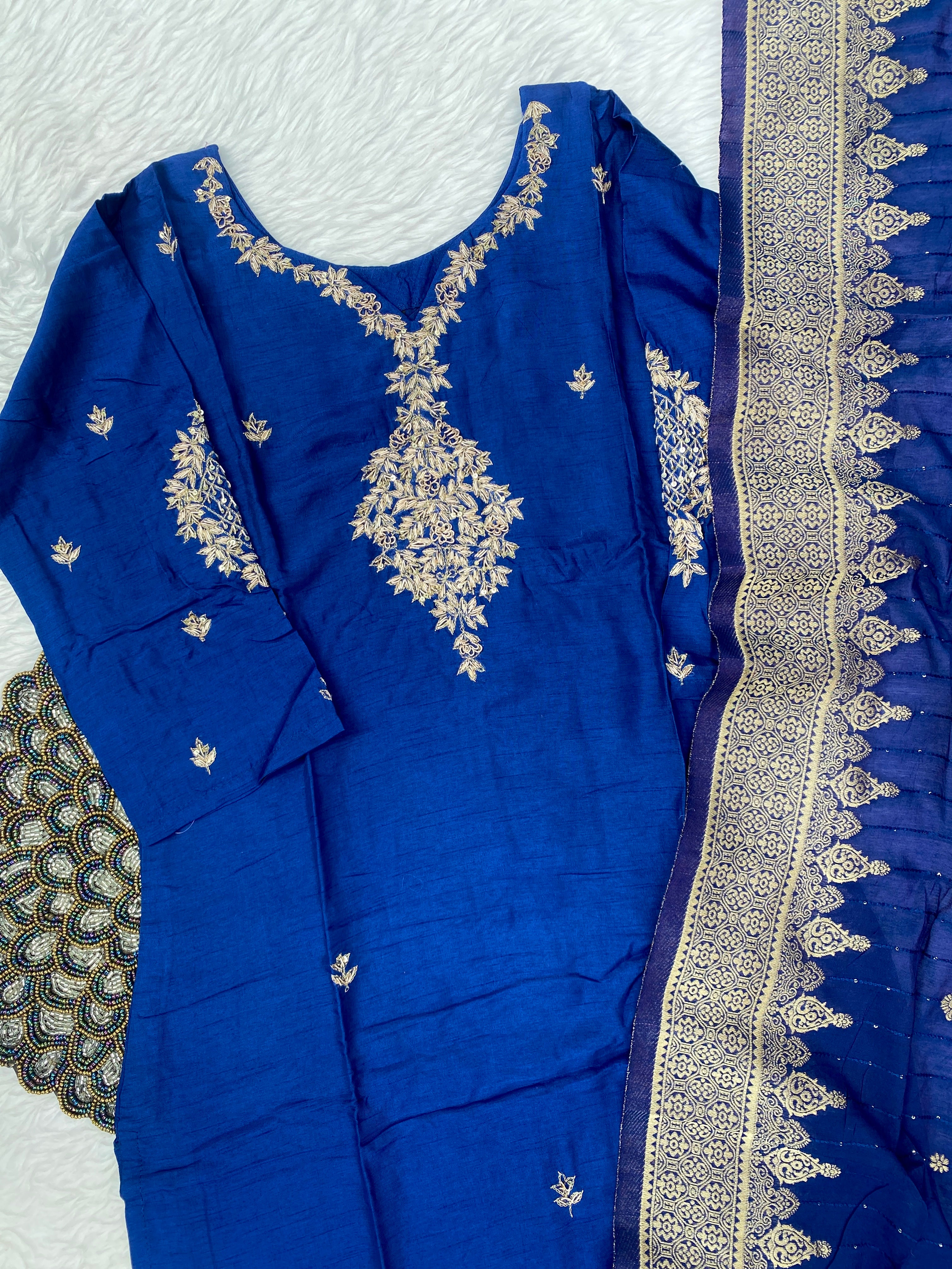 Handcrafted dola silk set with silver zardozi work on the yoke & sleeve of the kurta with a long woven banarsi dupatta paired with a handwork dola silk bottom