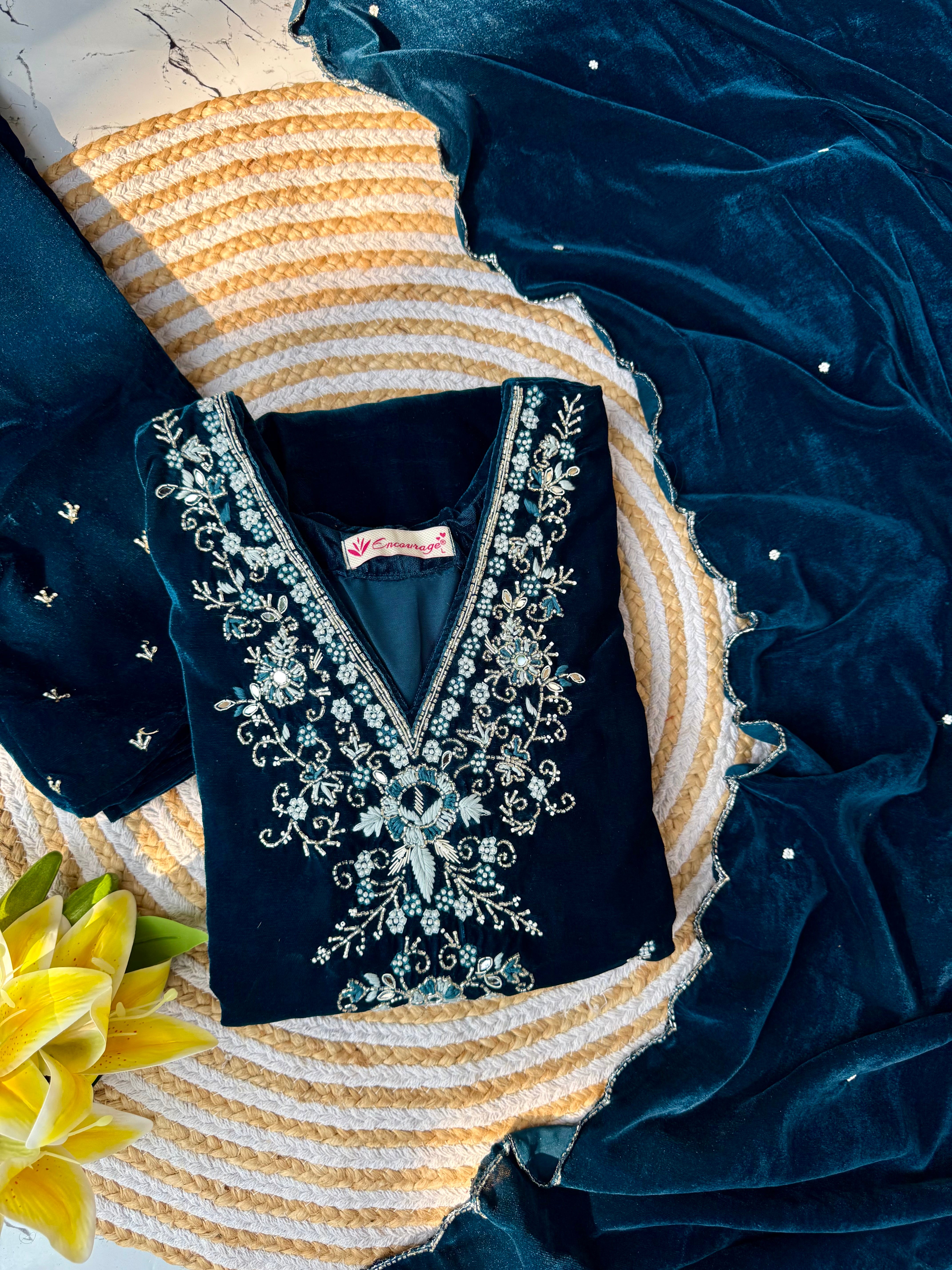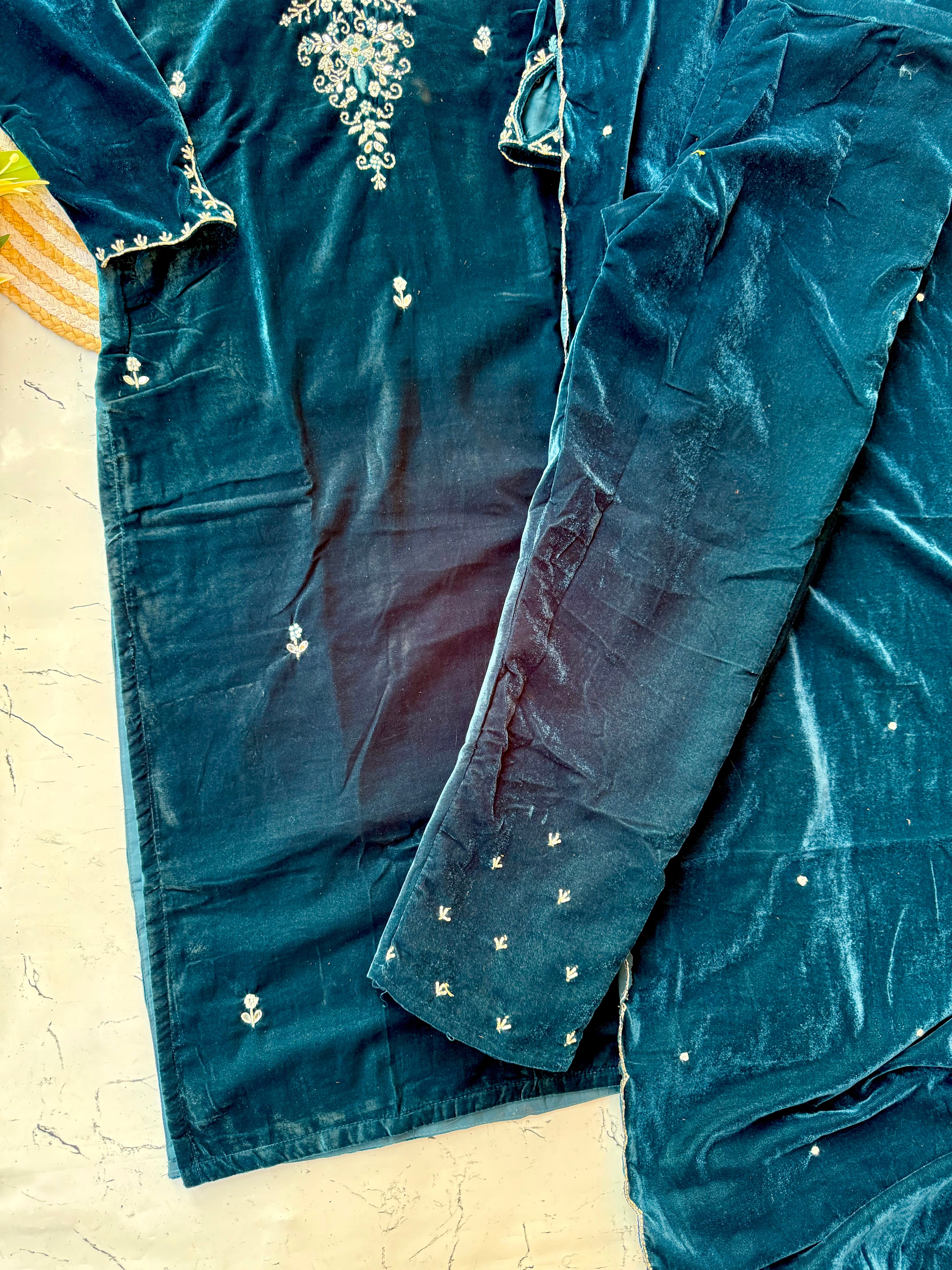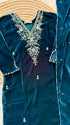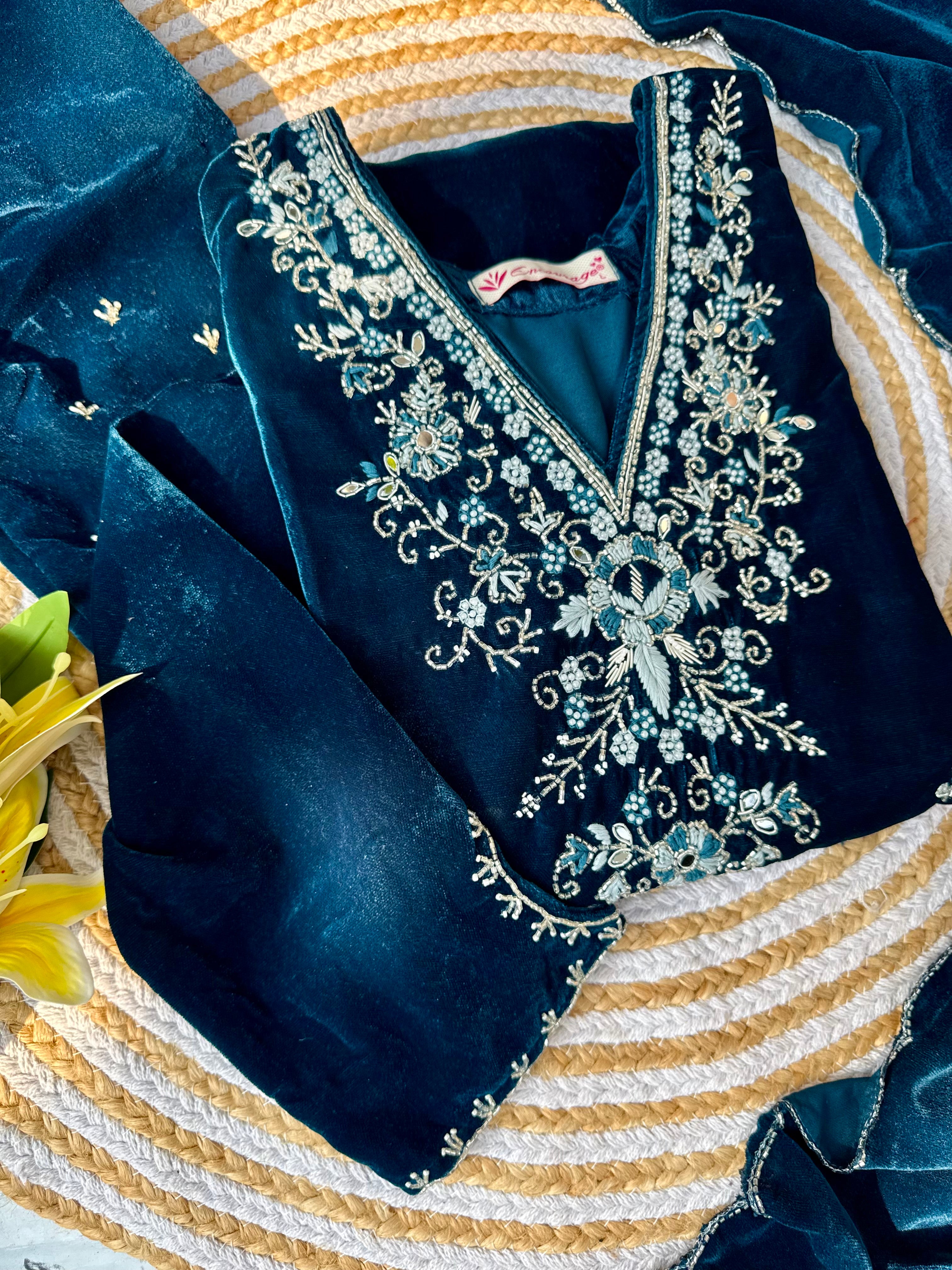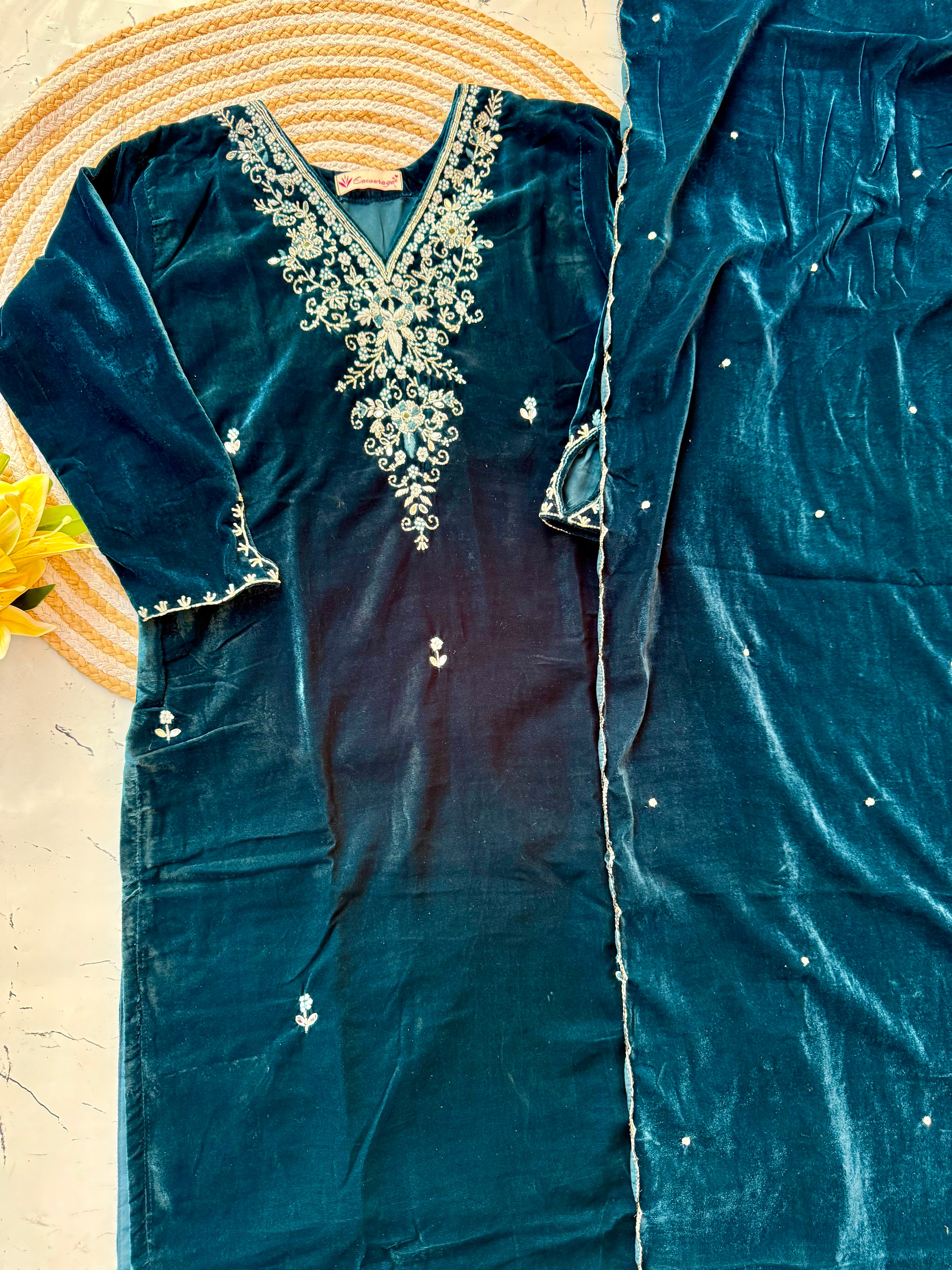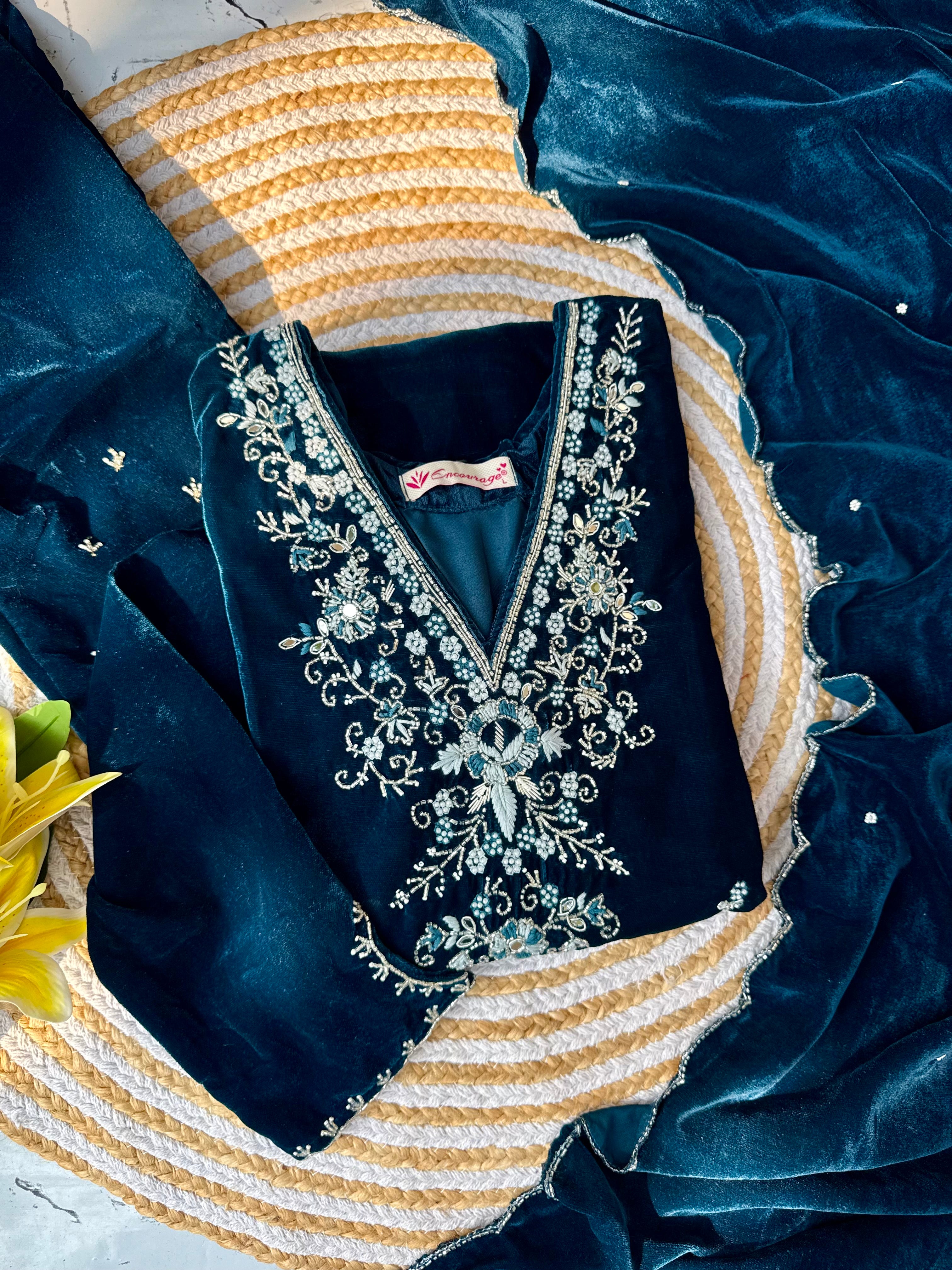 Heavy velvet kurti pant dupatta set with handwork on the yoke and sleeve of the kurta with a beautiful sided scallop Velvet dupatta and a velvet bottom with work