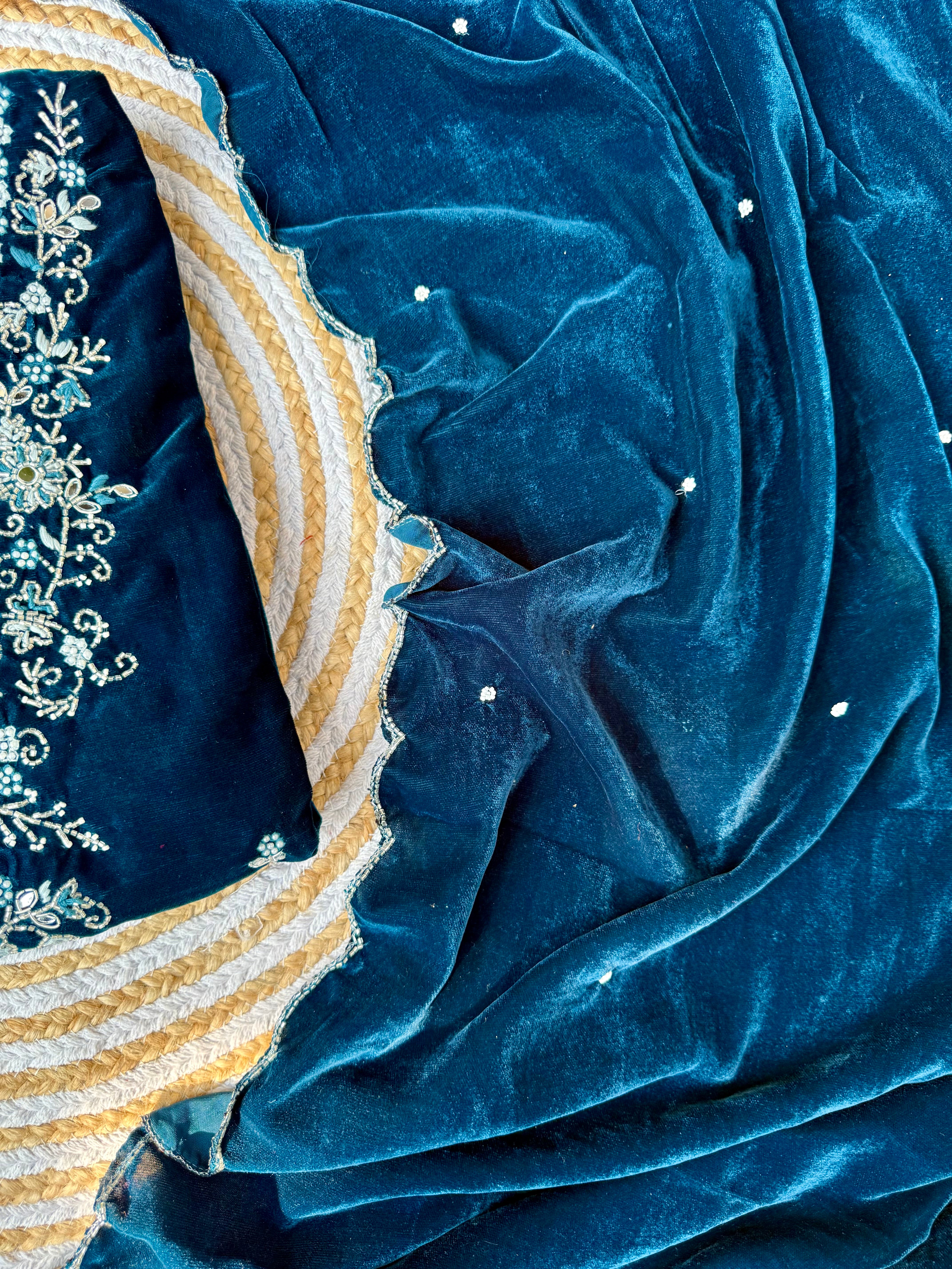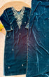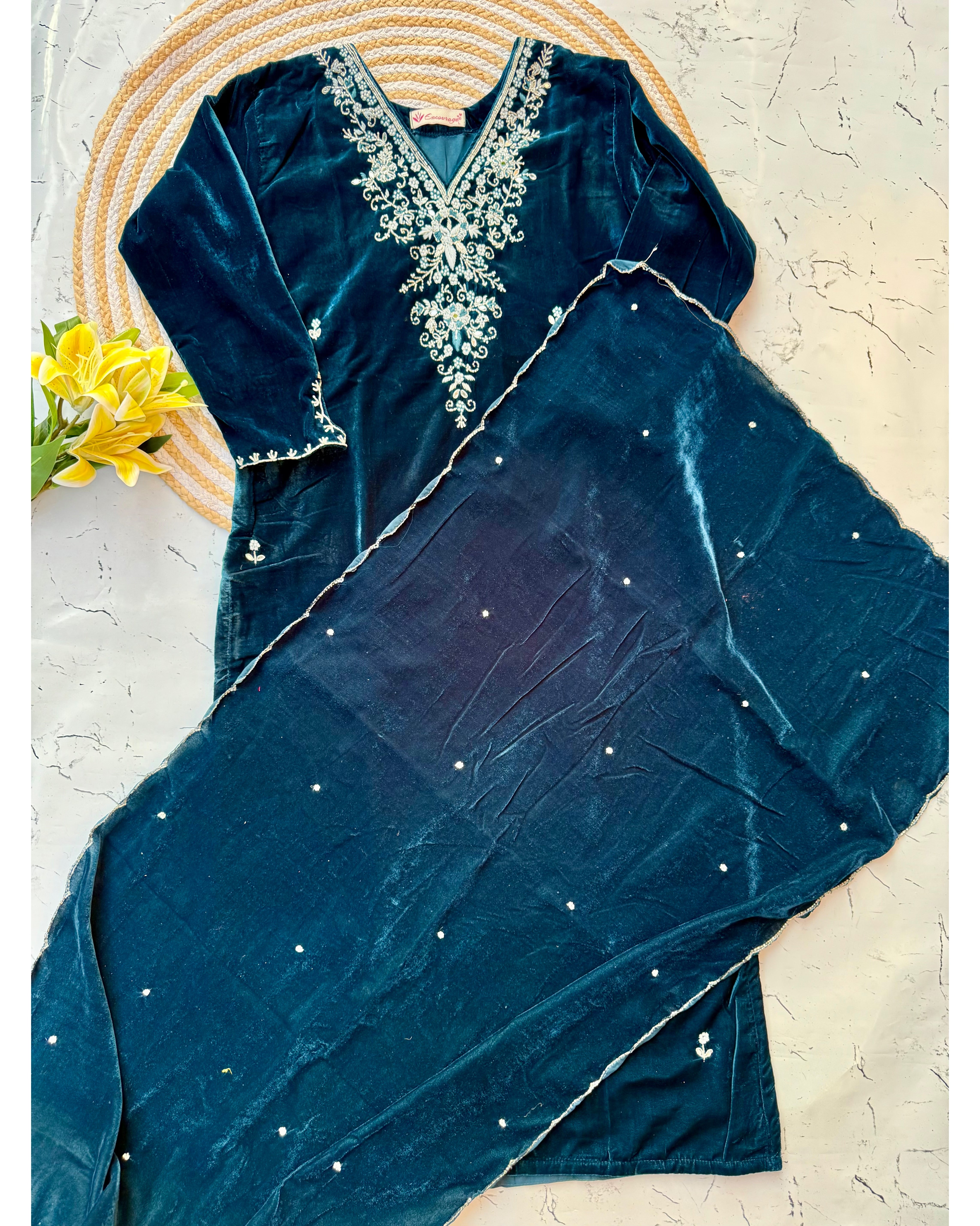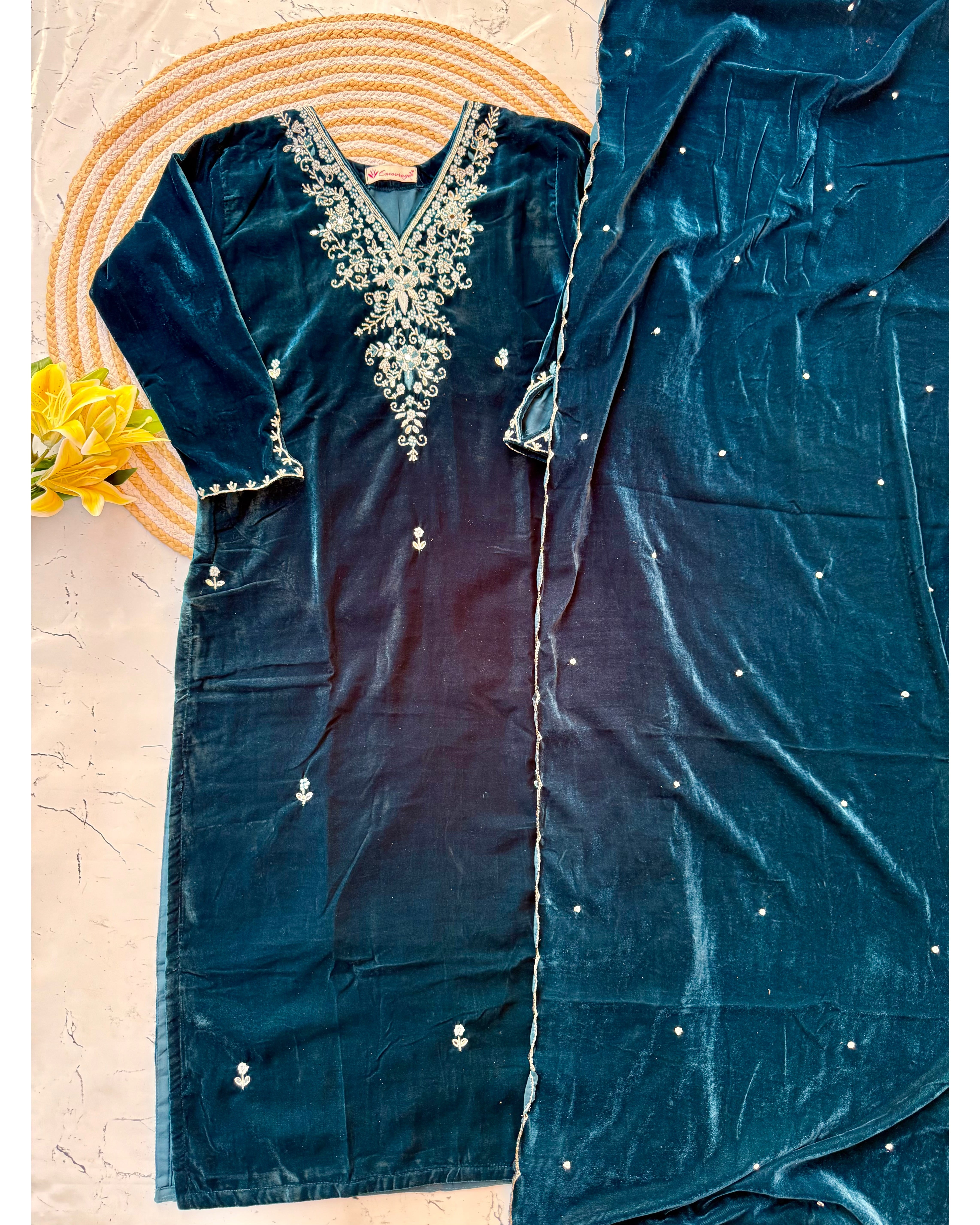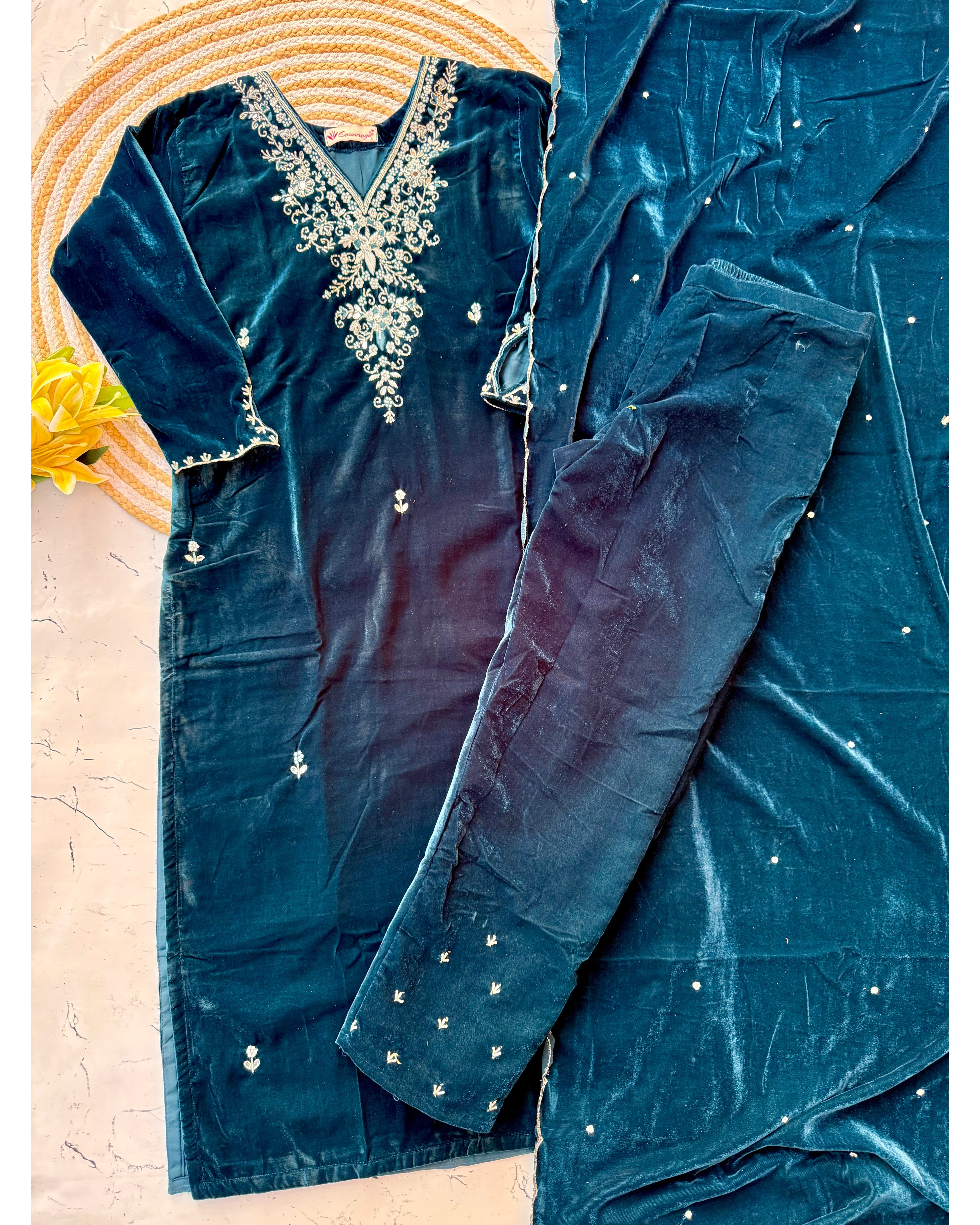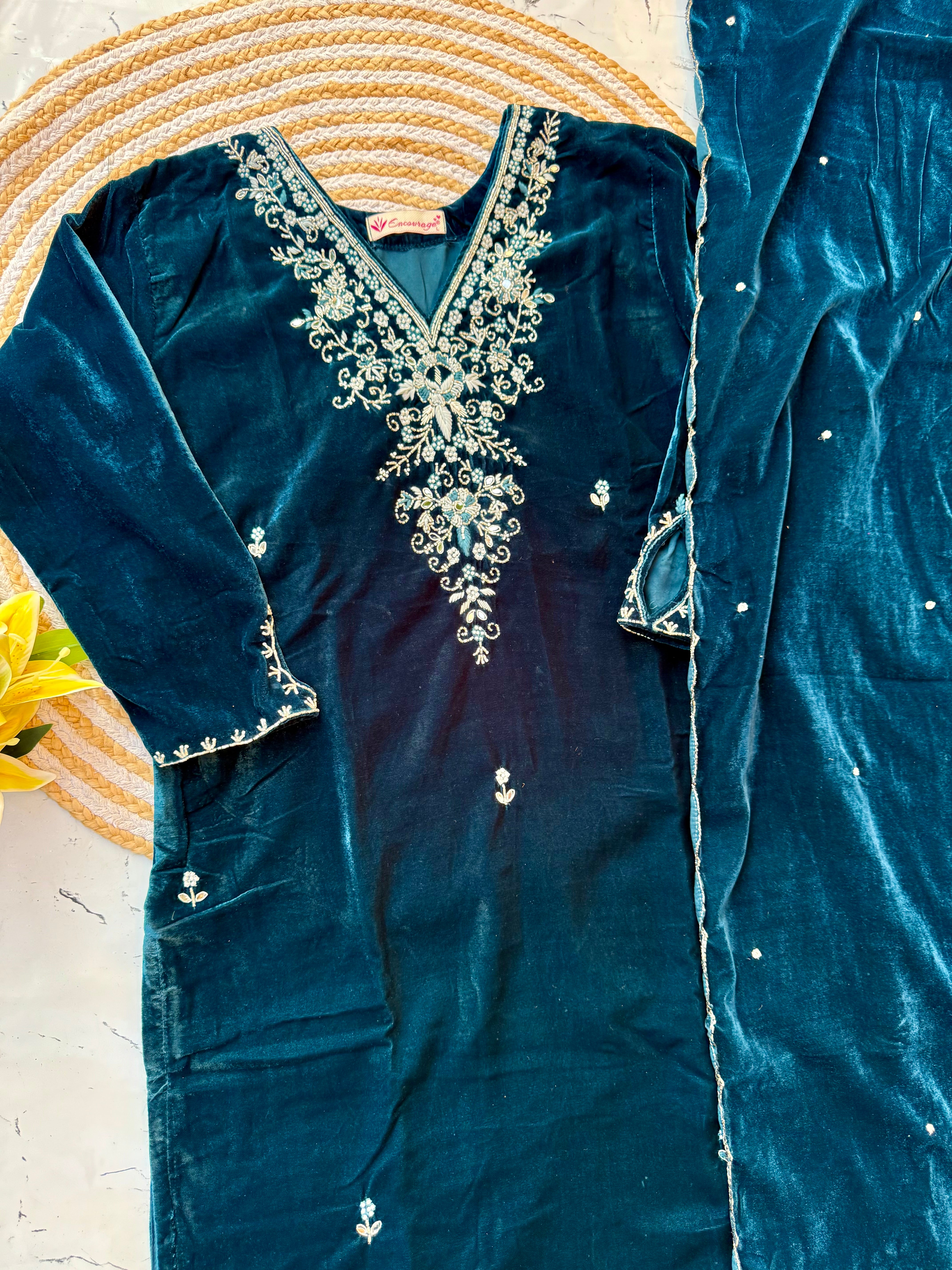 Heavy velvet kurti pant dupatta set with handwork on the yoke and sleeve of the kurta with a beautiful sided scallop Velvet dupatta and a velvet bottom with work