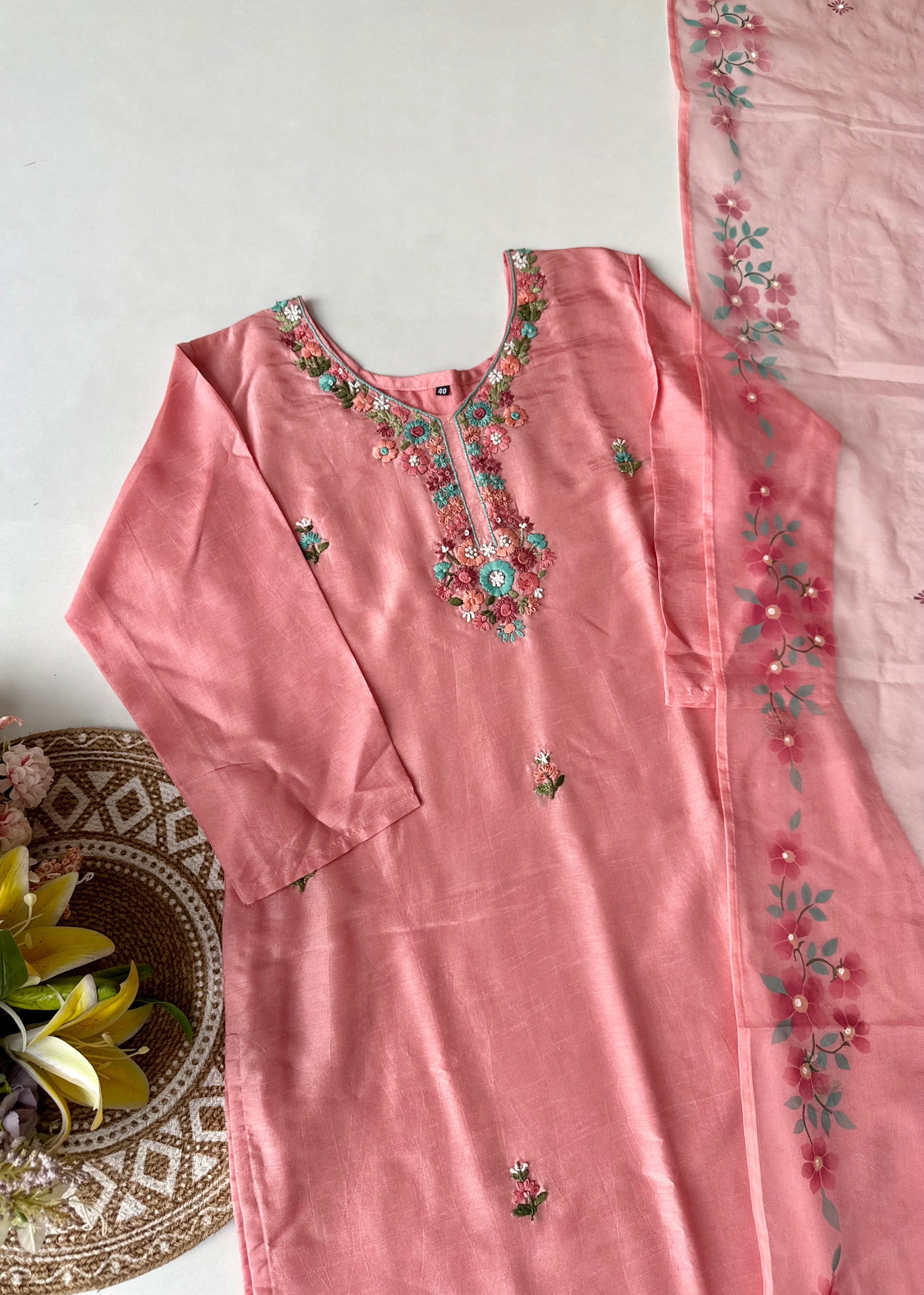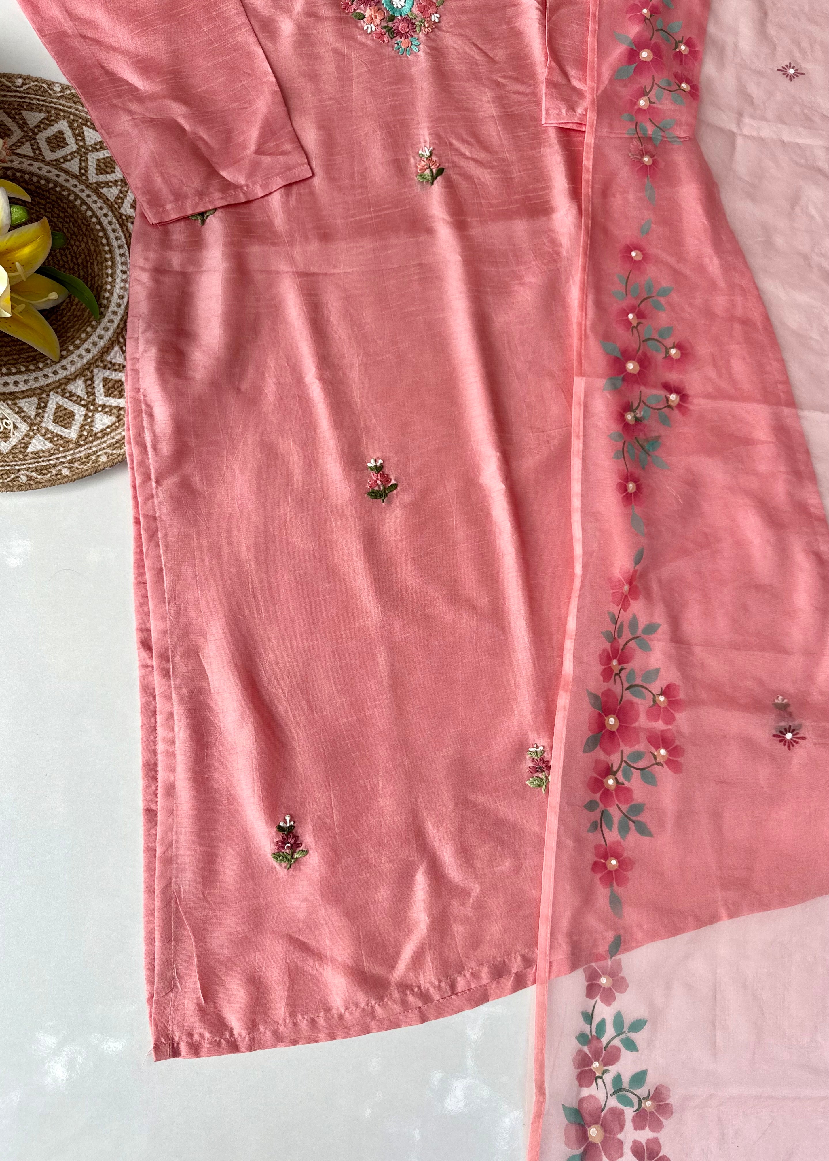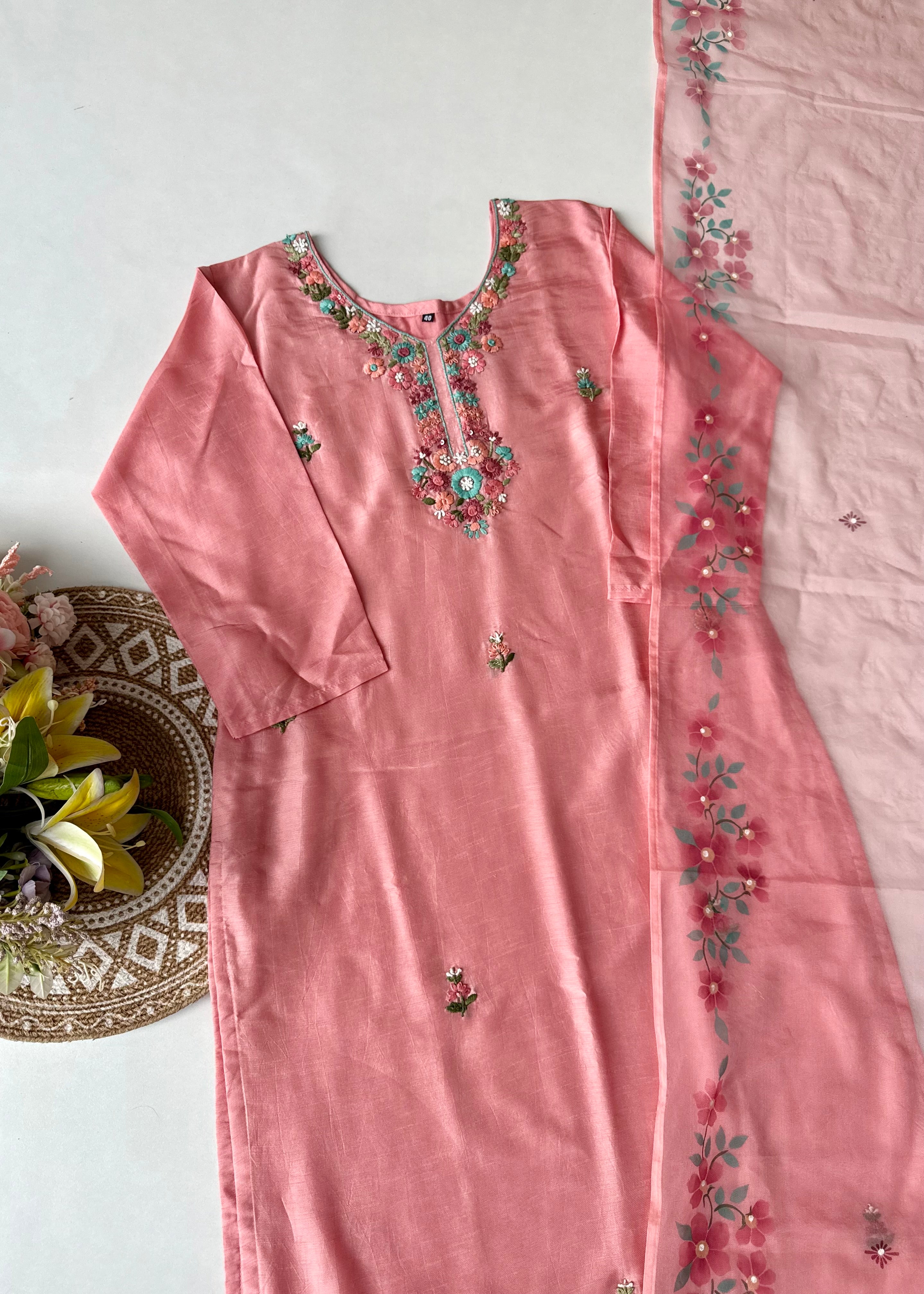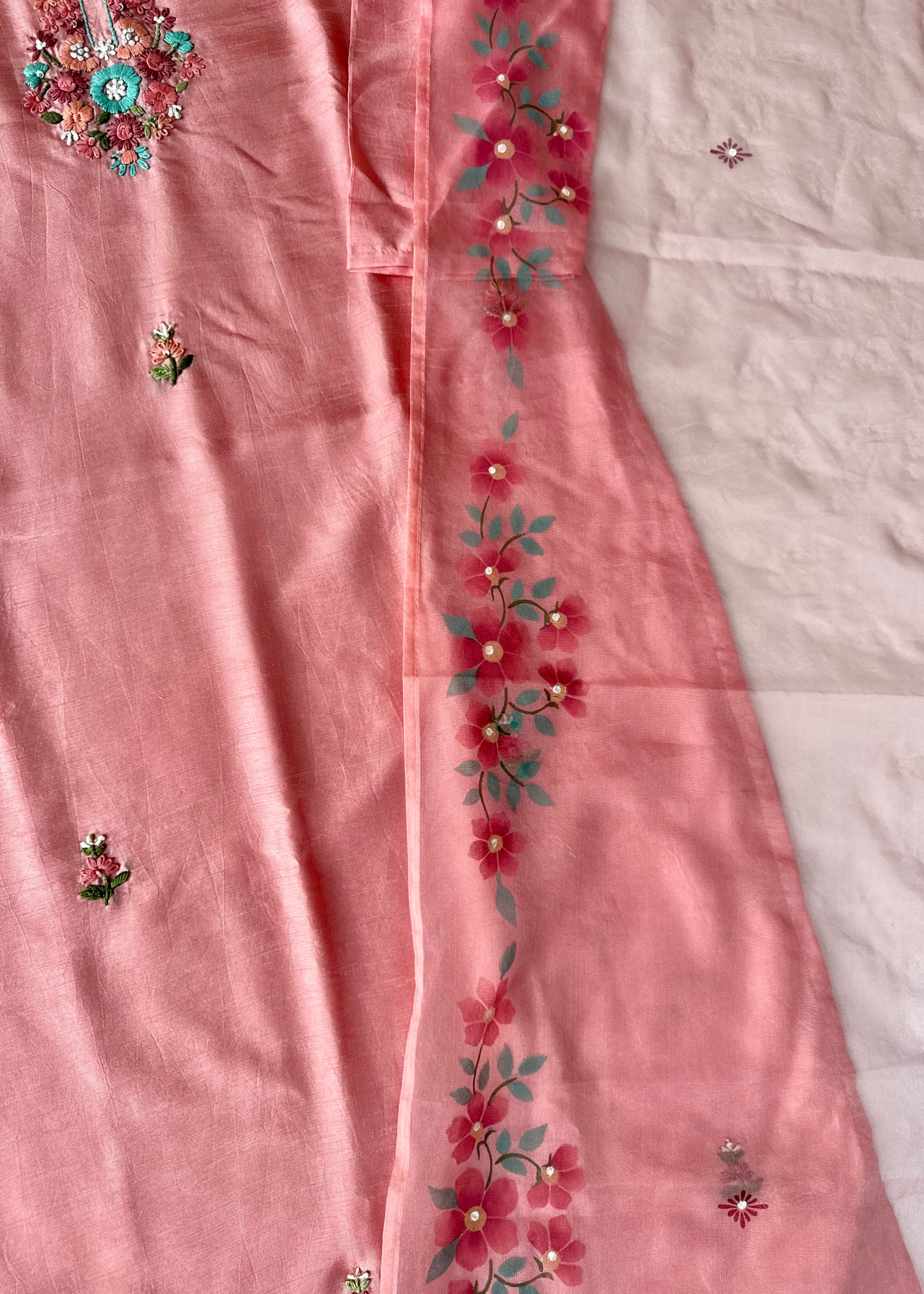 - Dupatta: Lightweight organza with elegant hand-printed floral design and tassel edges