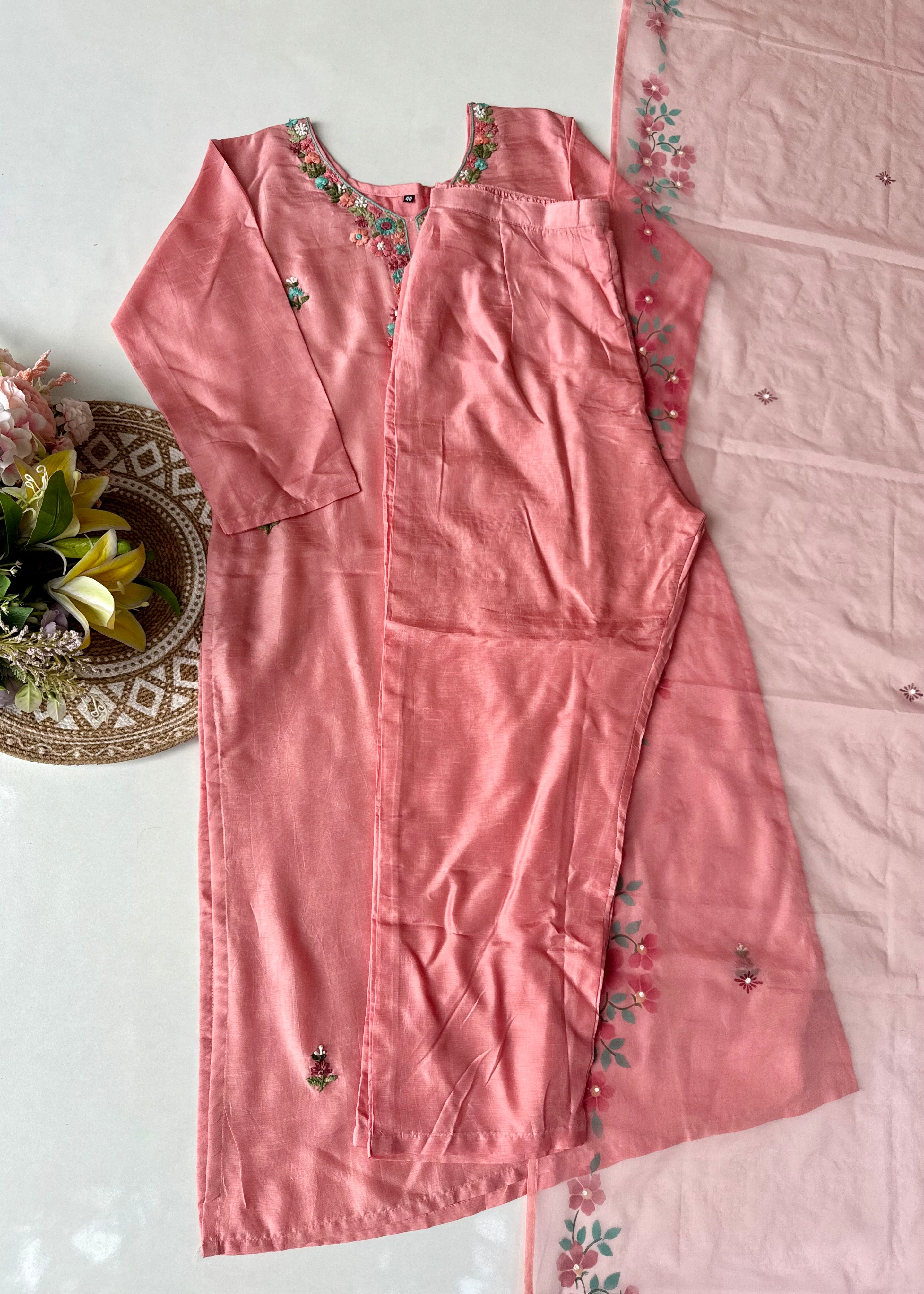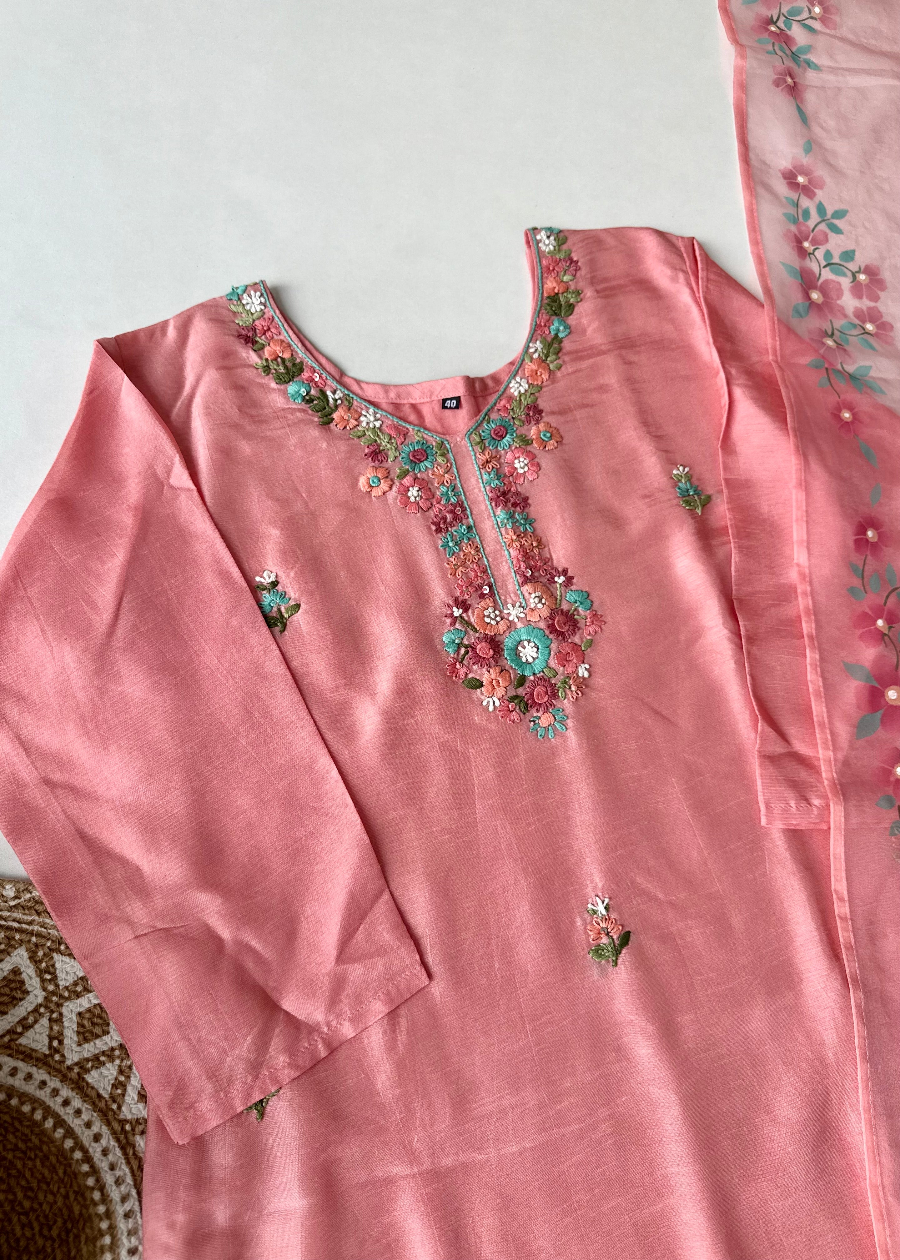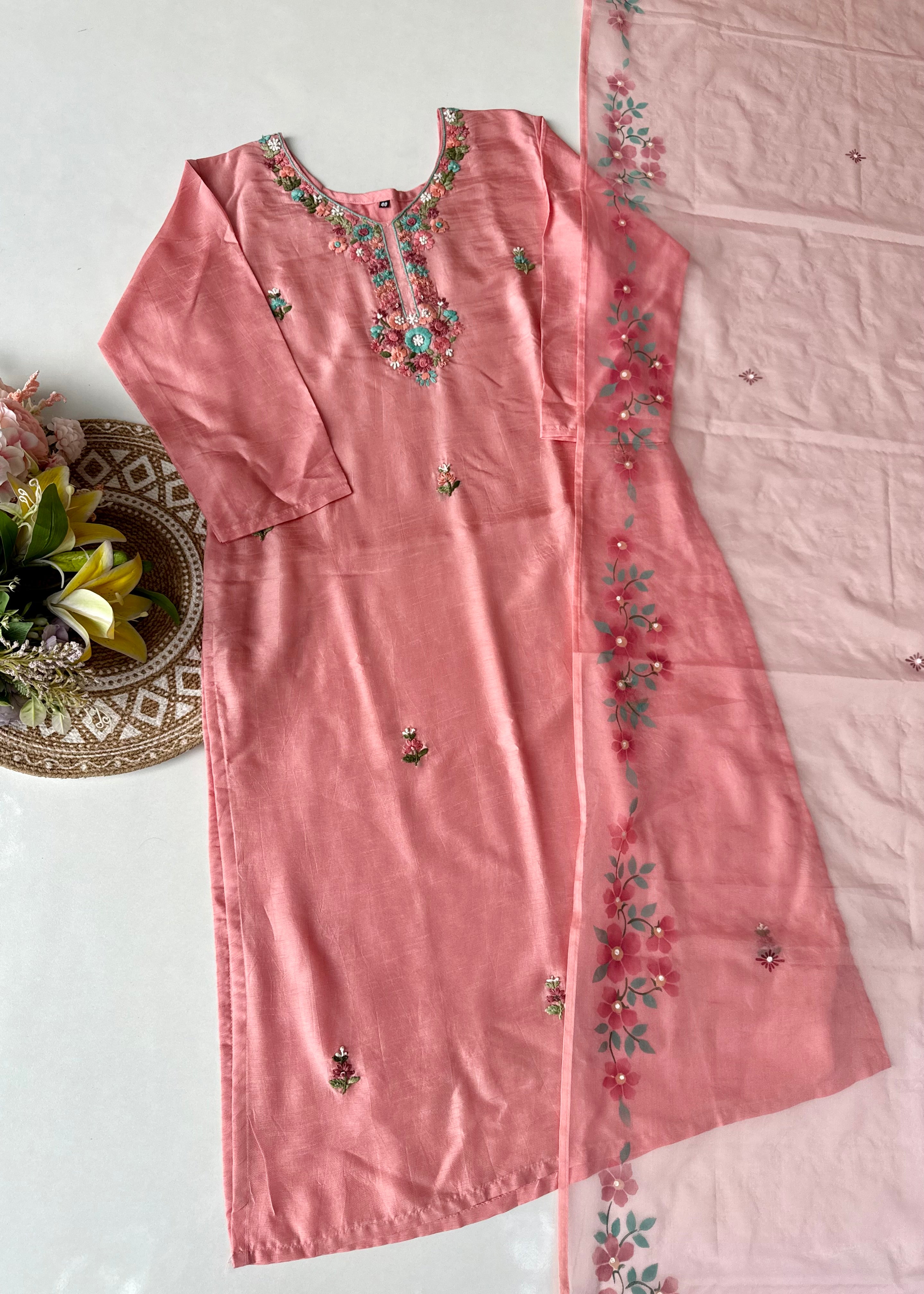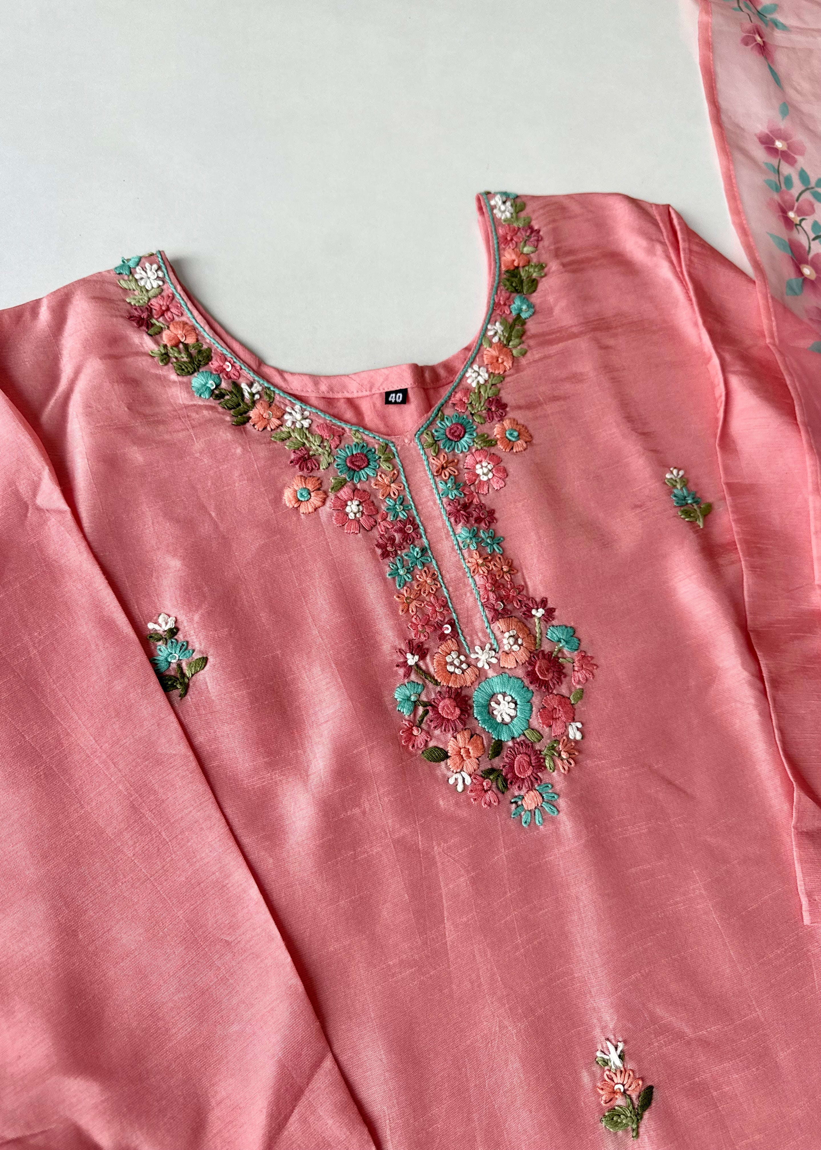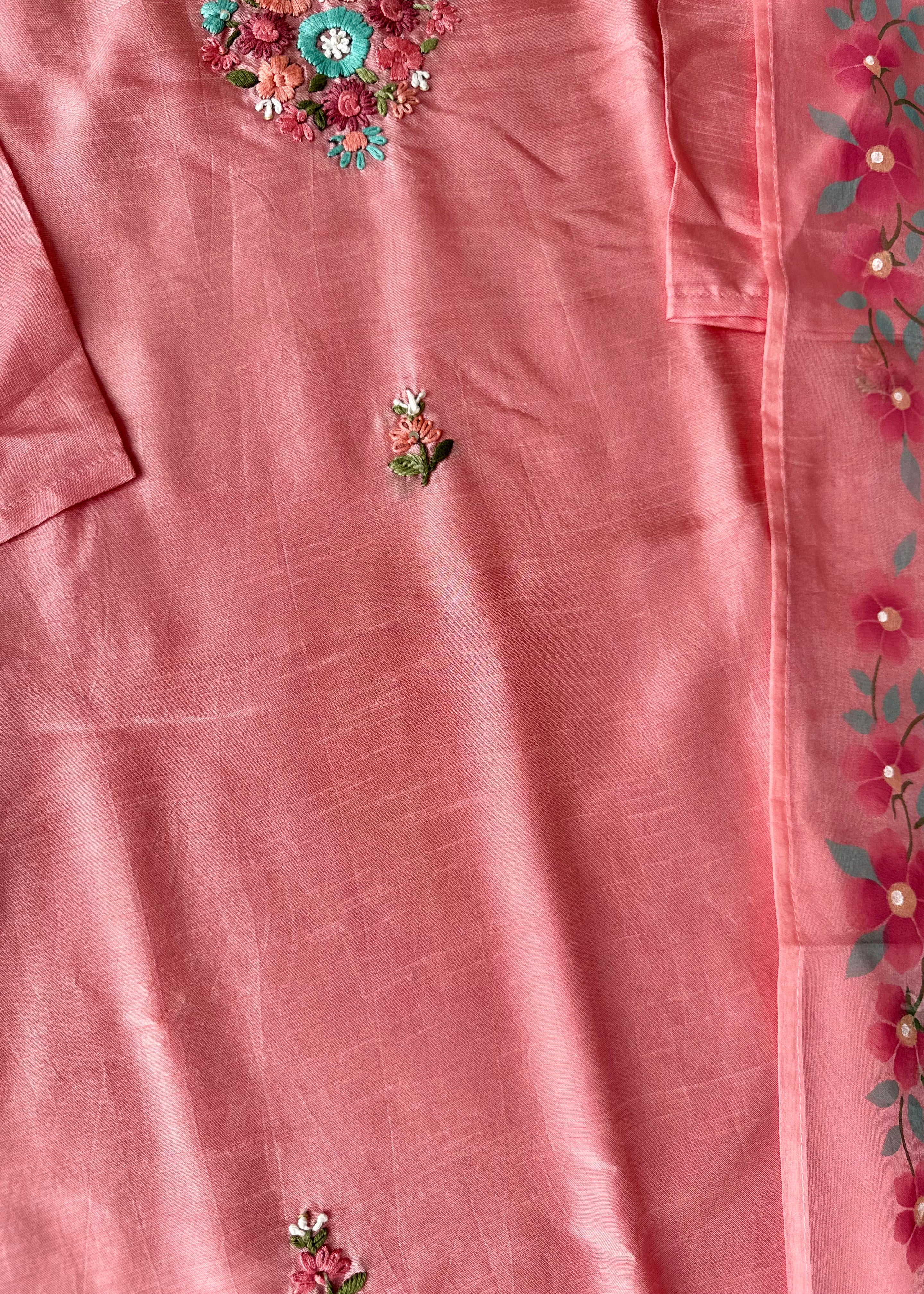 - Dupatta: Lightweight organza with elegant hand-printed floral design and tassel edges
