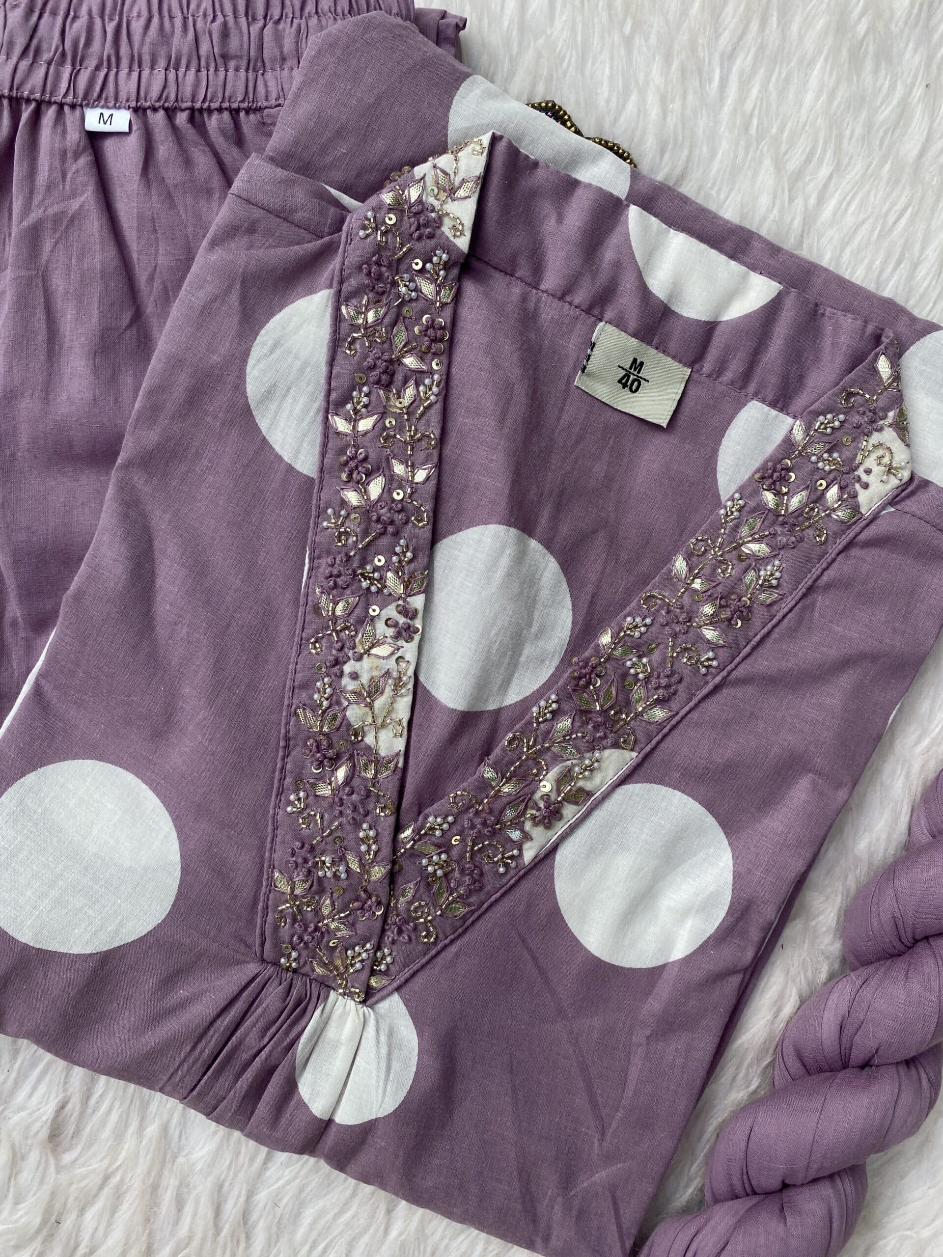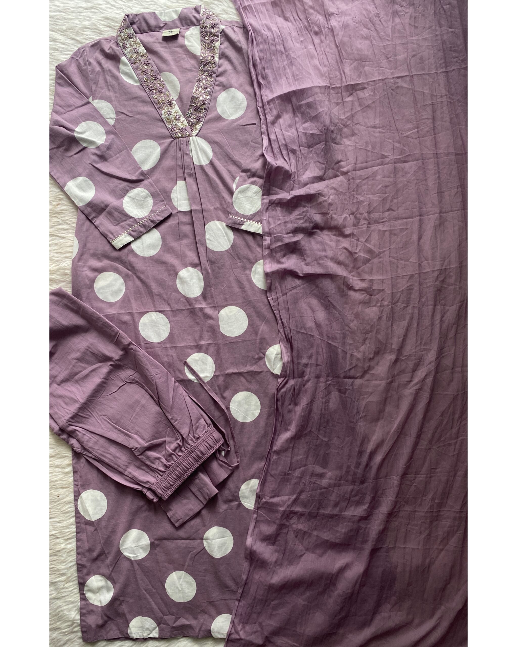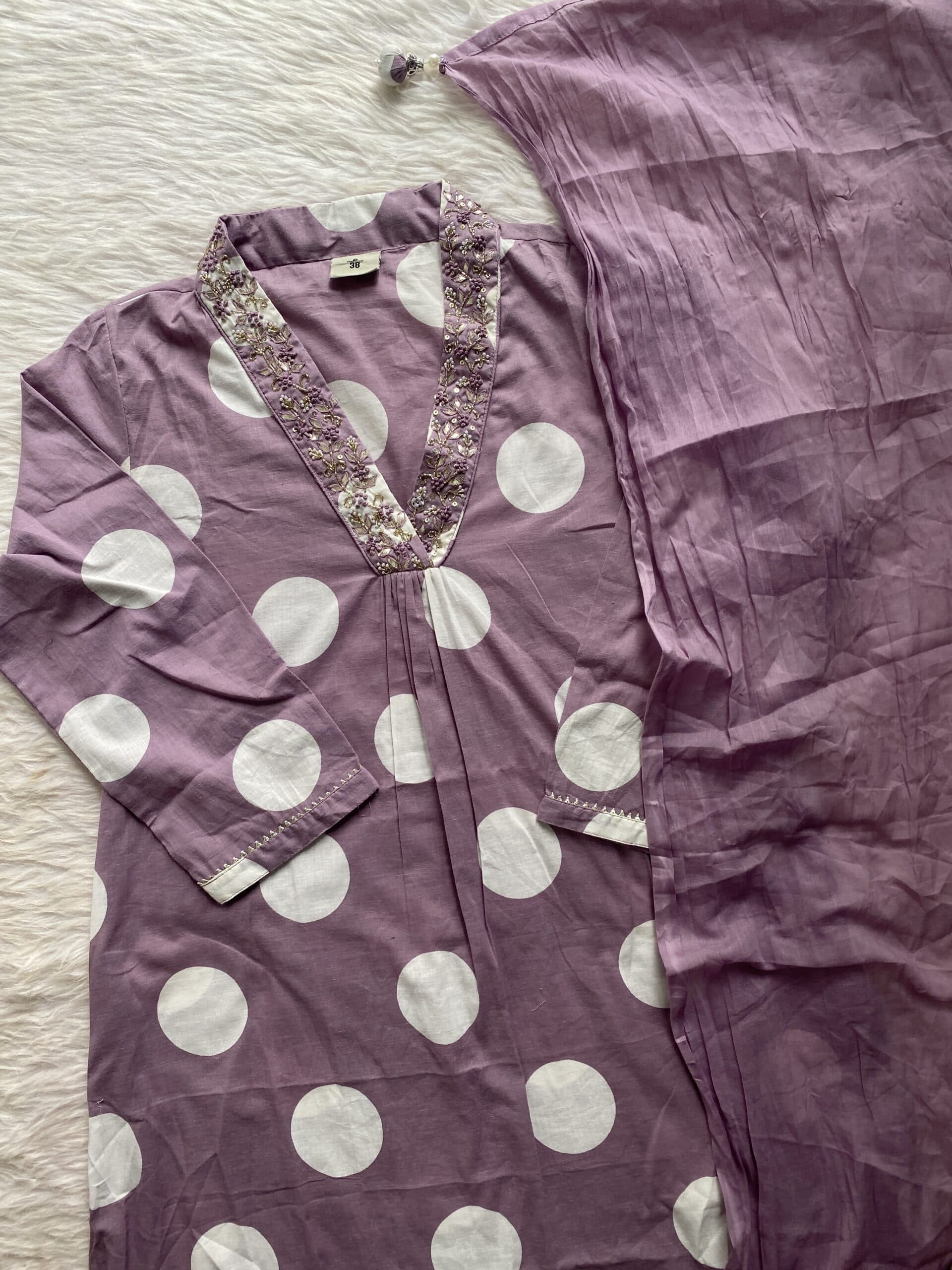 “Yarana” V neck cotton Polka Dots kurti dupatta bottom set