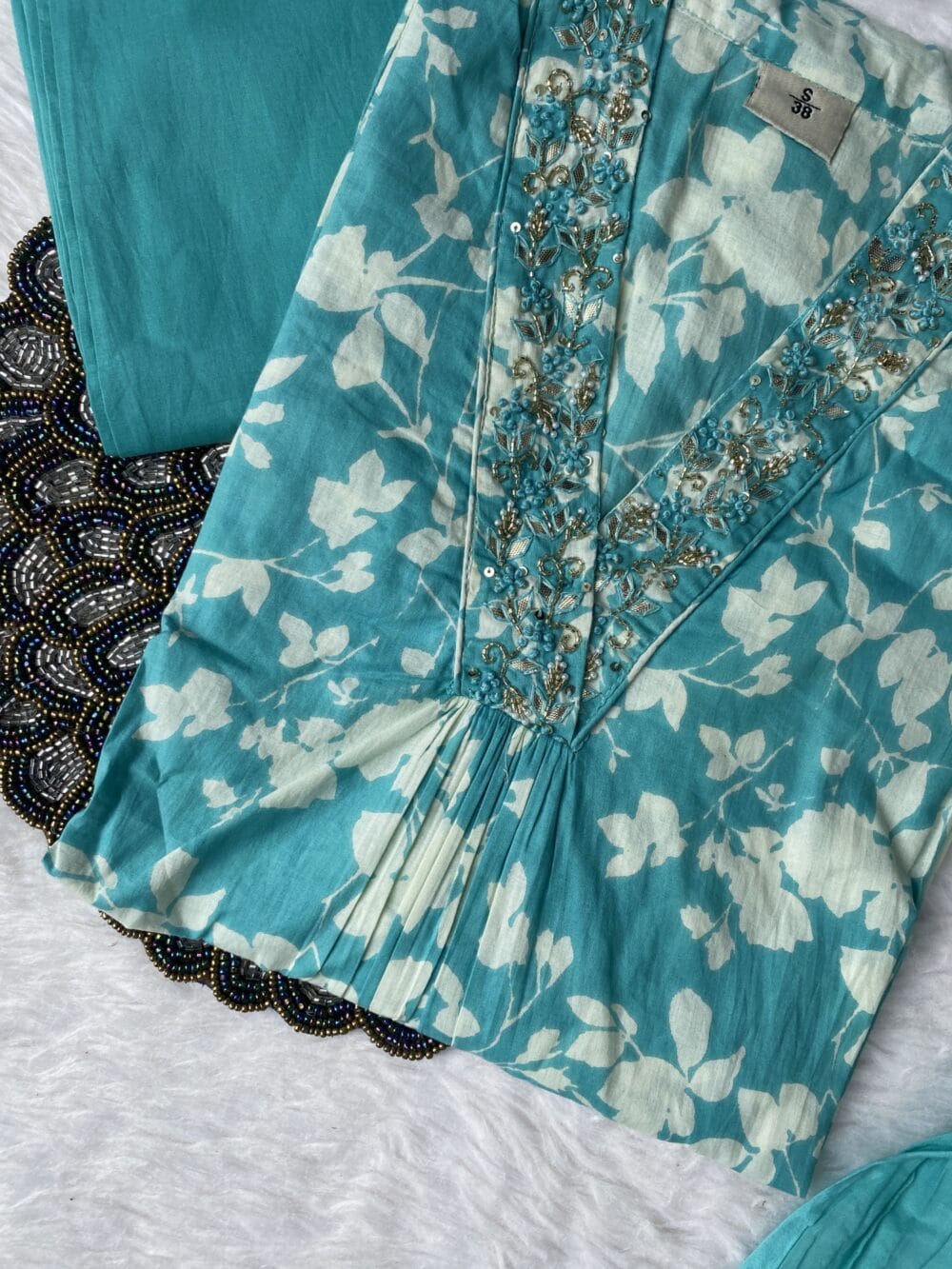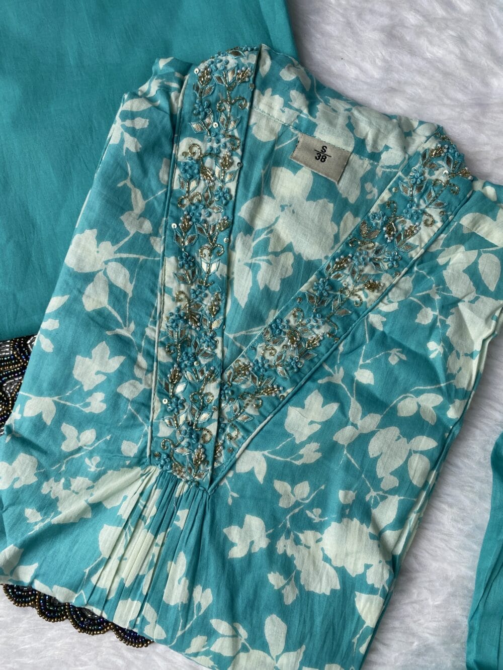 Handcrafted printed cotton kurti with handwork on the yoke of the kurta with a long kota doriya dupatta and a plane cotton bottom