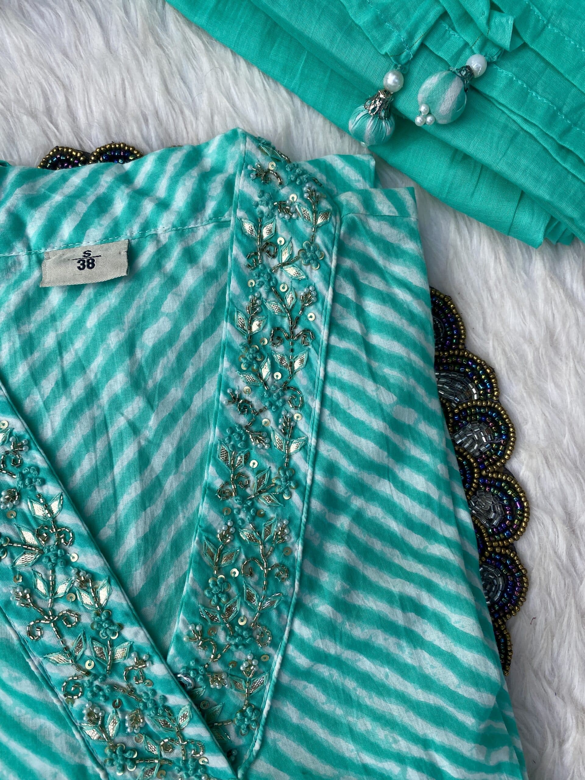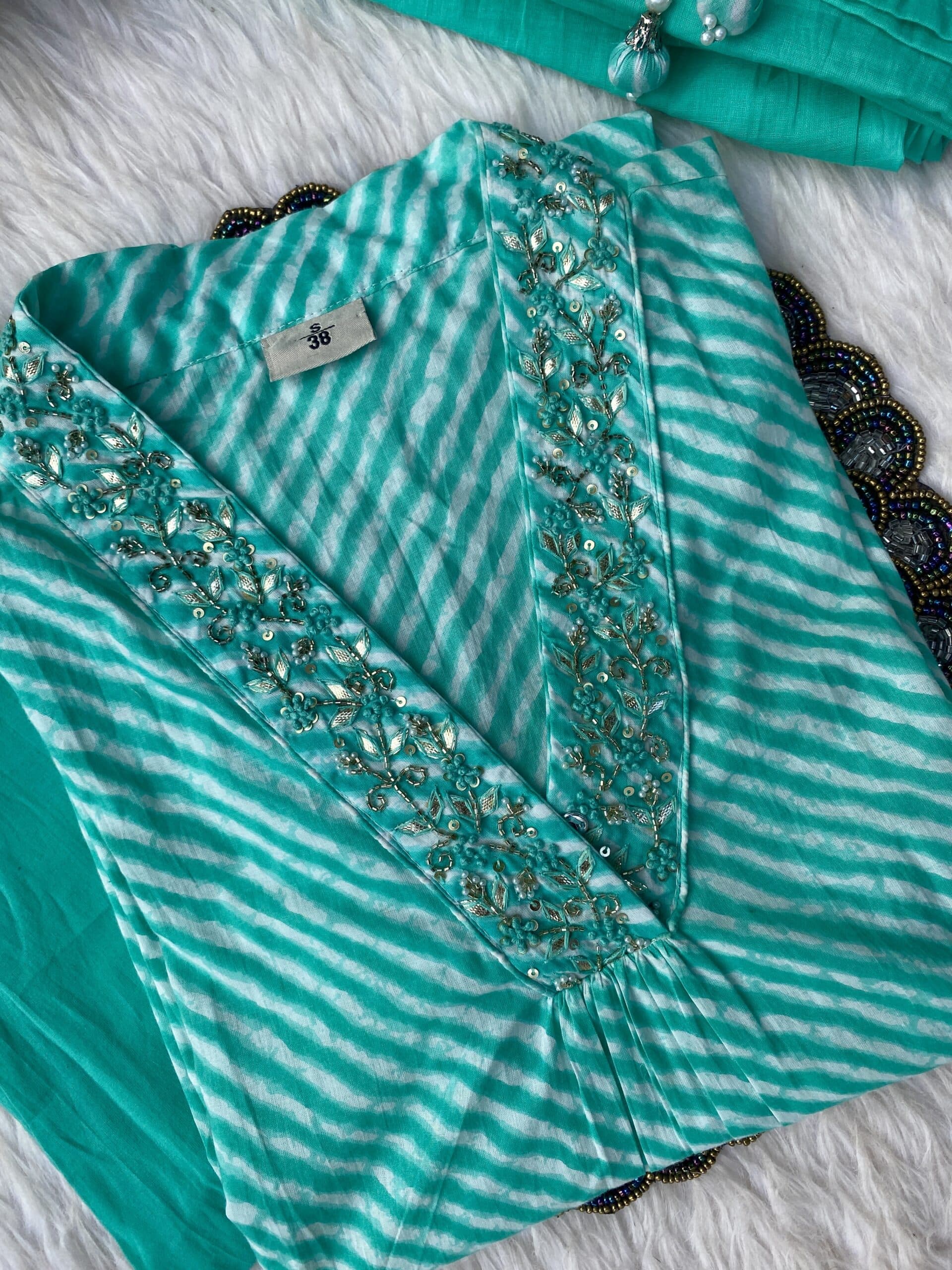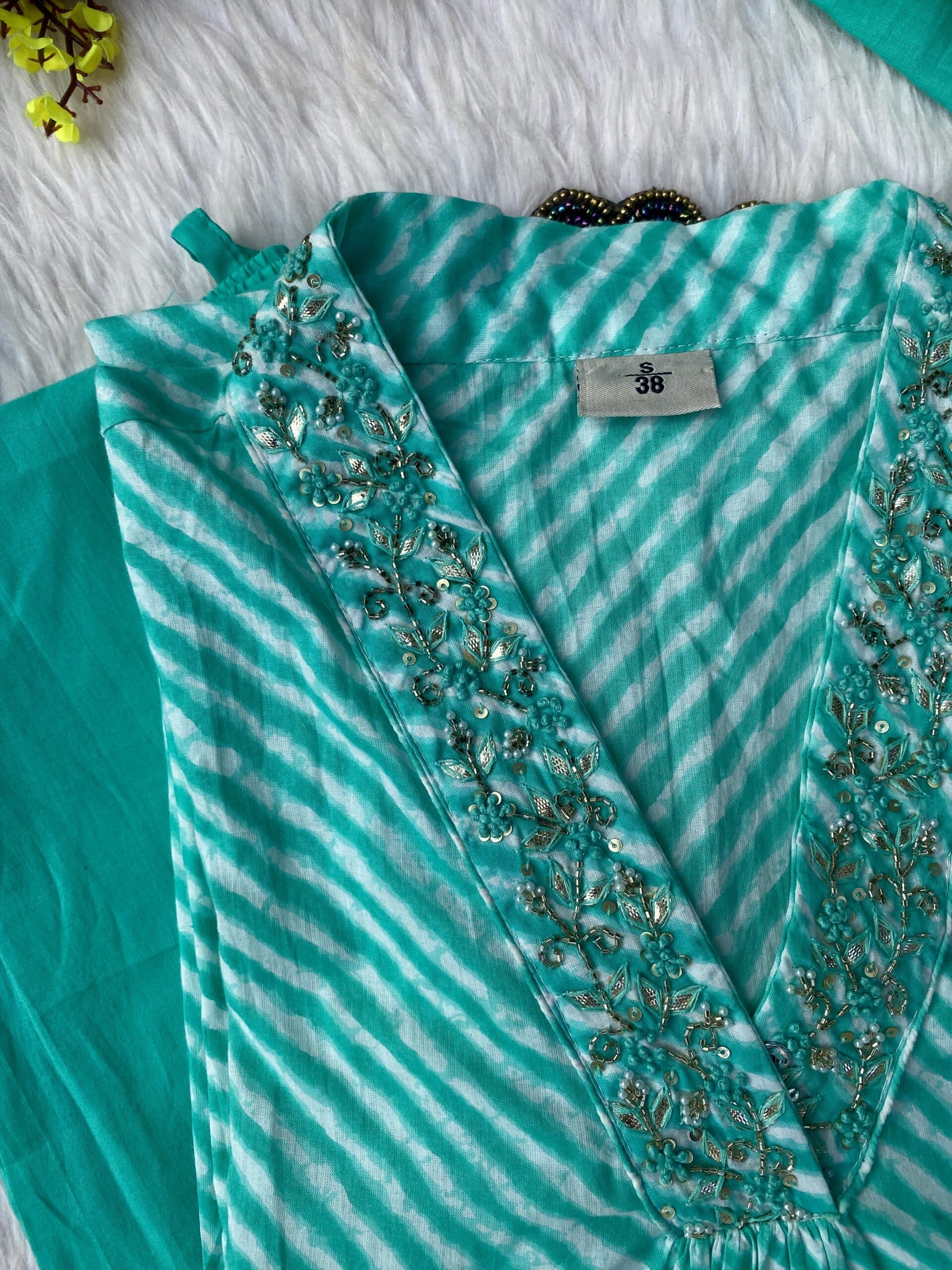 Handcrafted bandani printed cotton kurti dupatta bottom with handwork on the yoke of the kurta with a long kota doriya dupatta and a plane cotton bottom