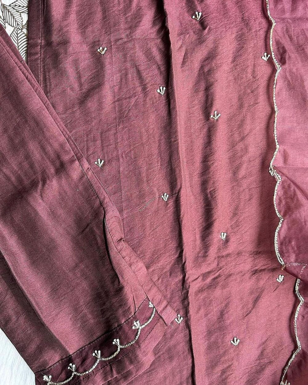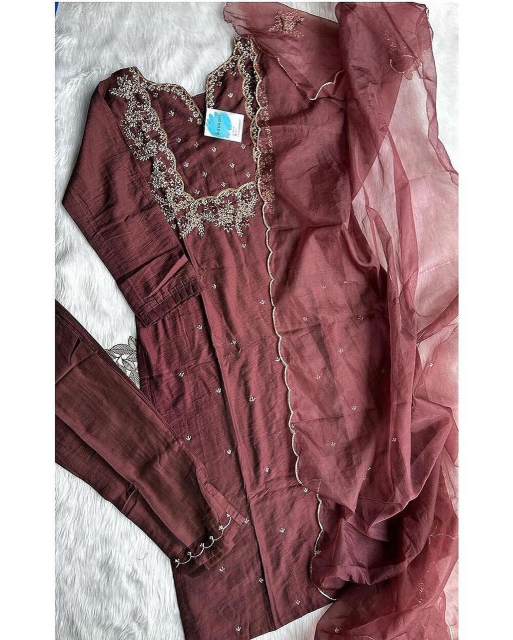 Our Premium Beautiful Cutdana Work Kurta Set In A Very Beautiful Brown Shade With Long Organza Dupatta And A Work Dola Silk Bottom