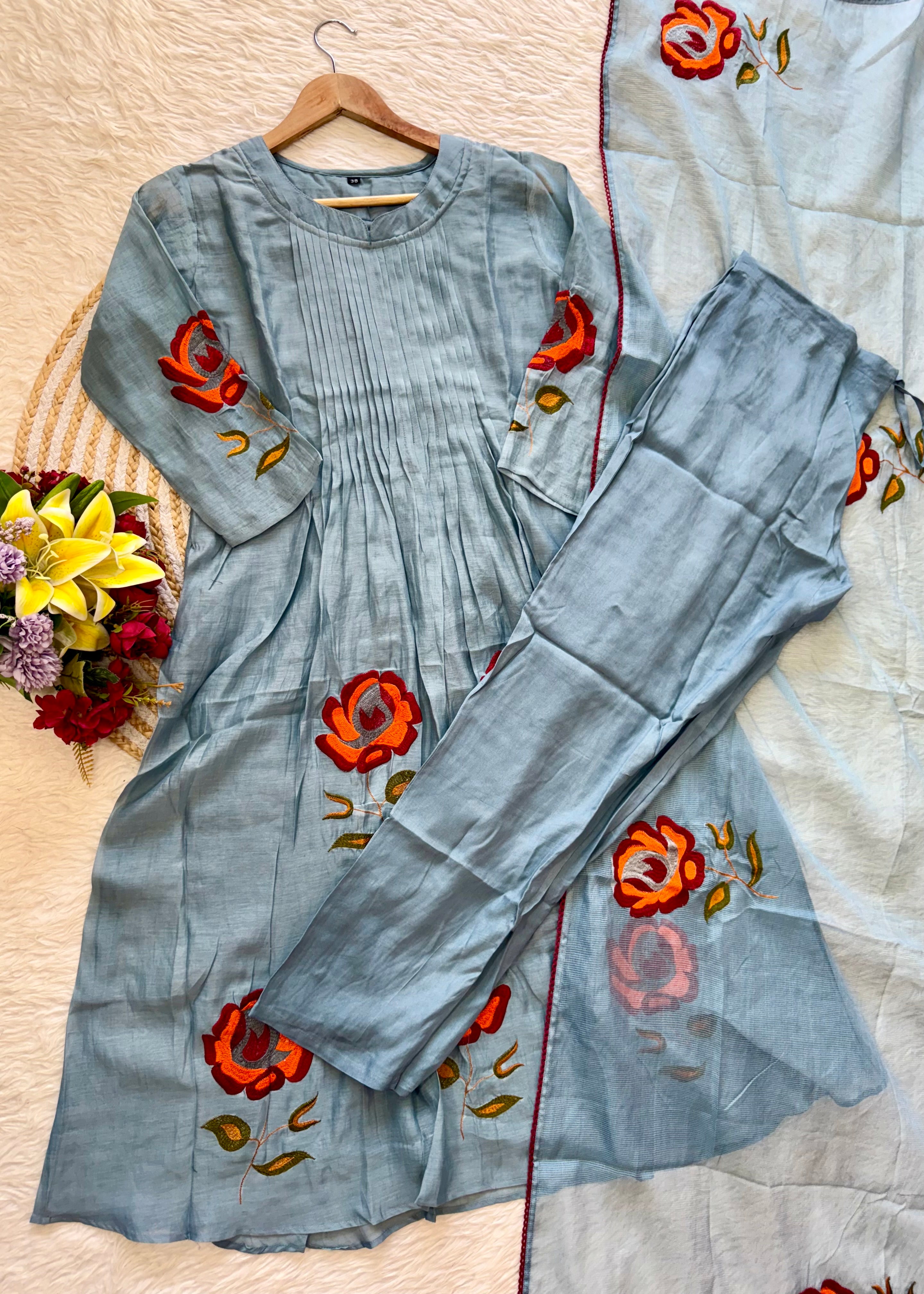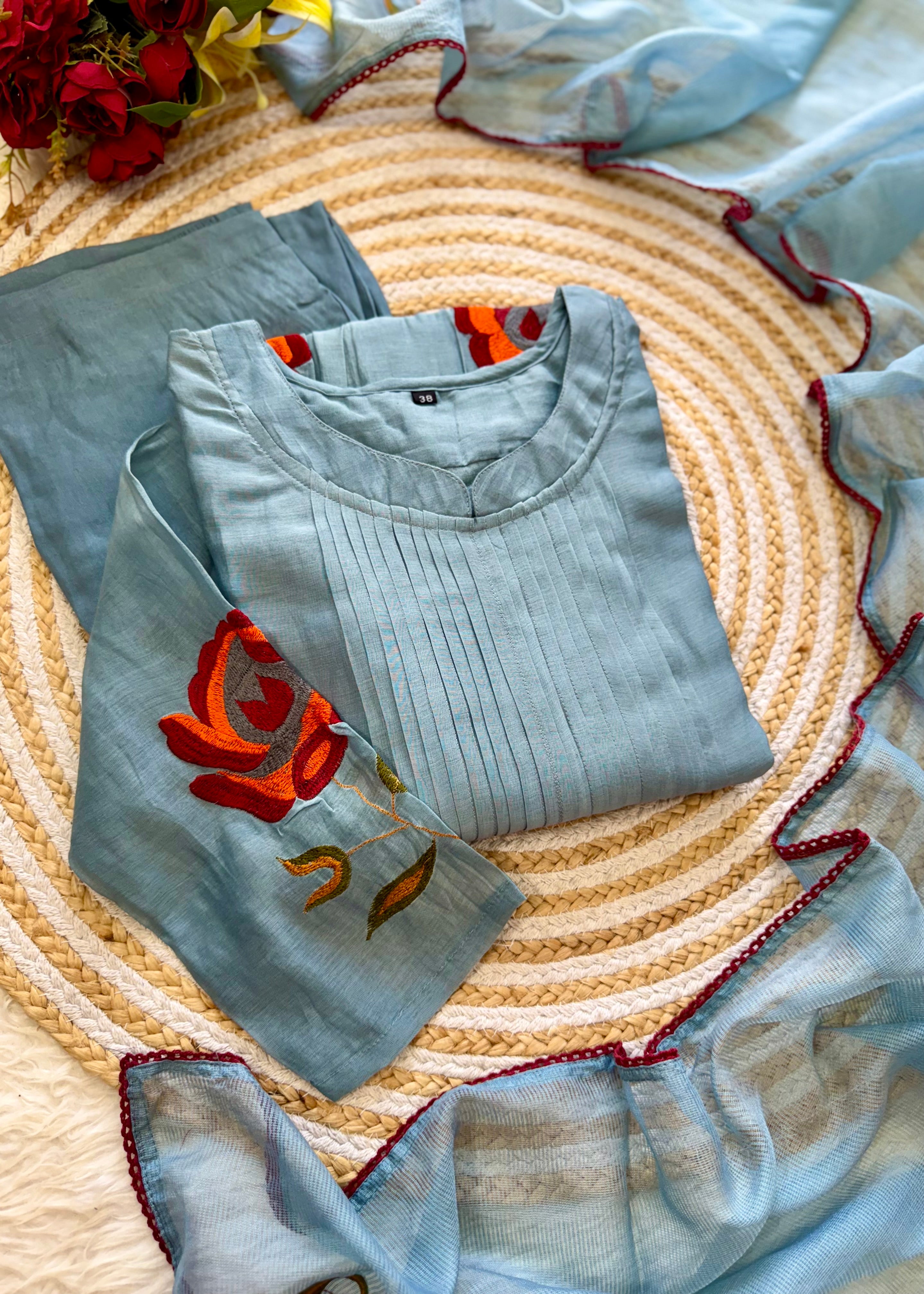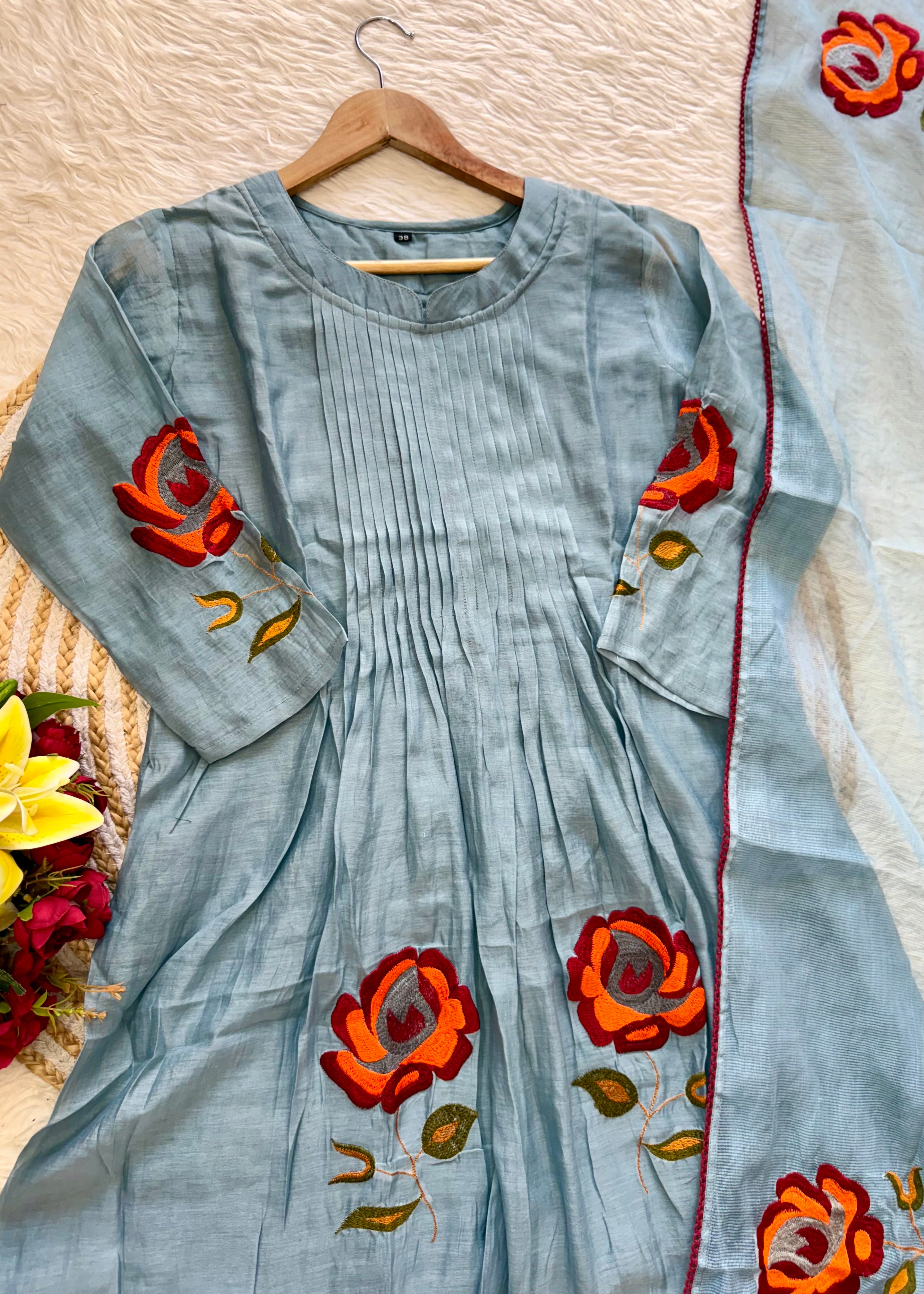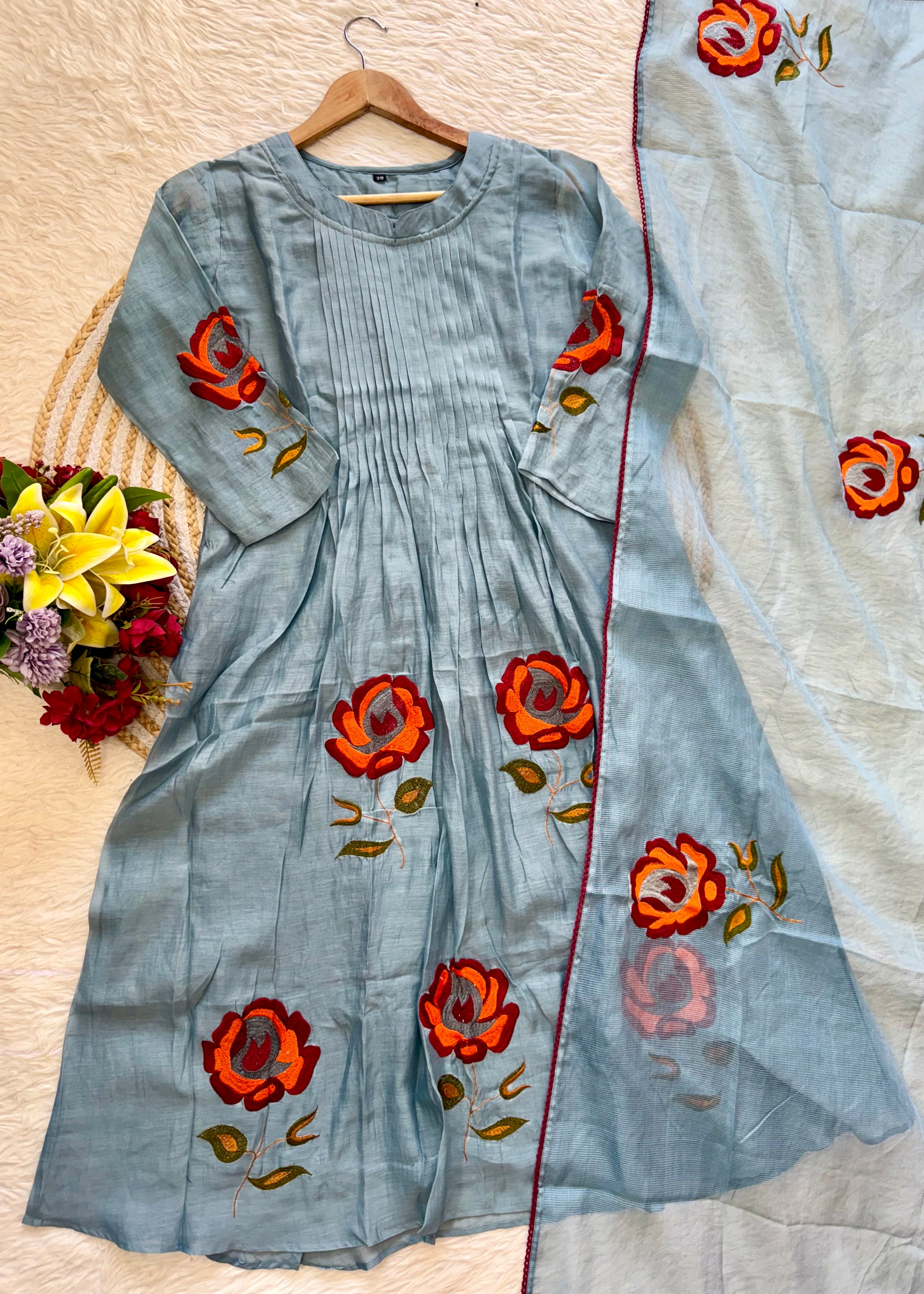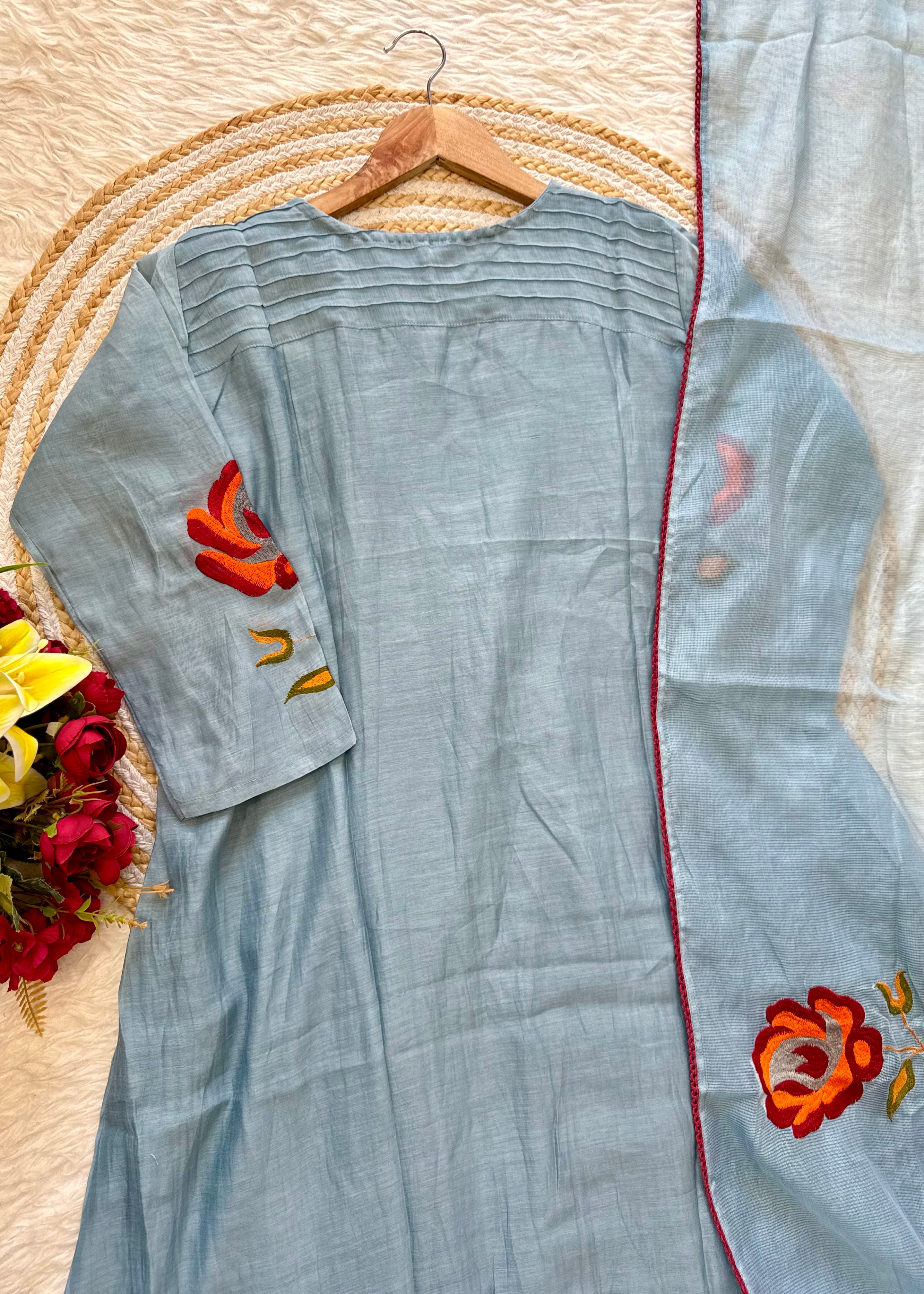 Premium mul Chanderi anarkali kurti with handwork on the yoke sleeves & Daman of the kurta with a handwork detailed mul Chanderi dupatta and a silk bottom