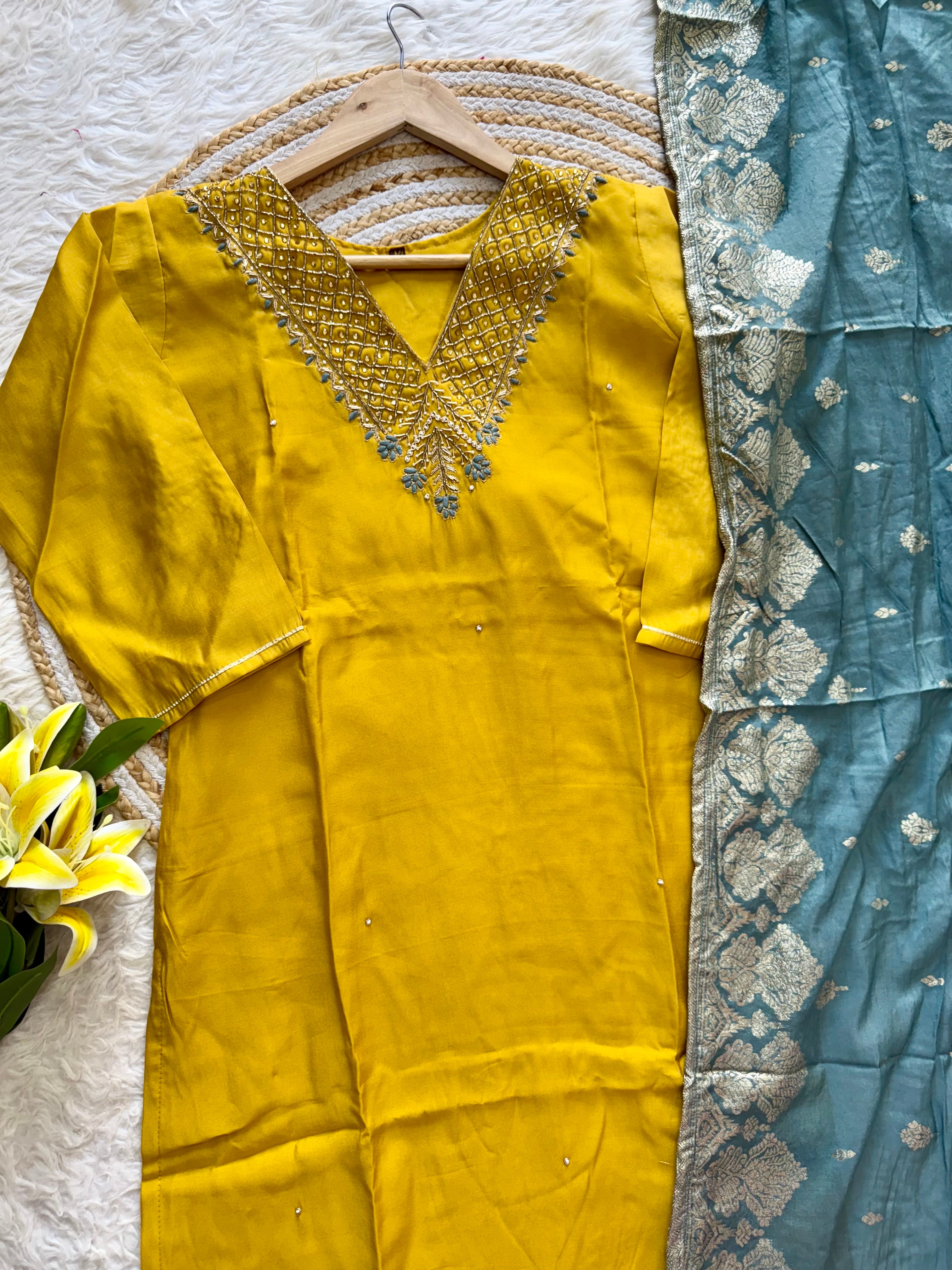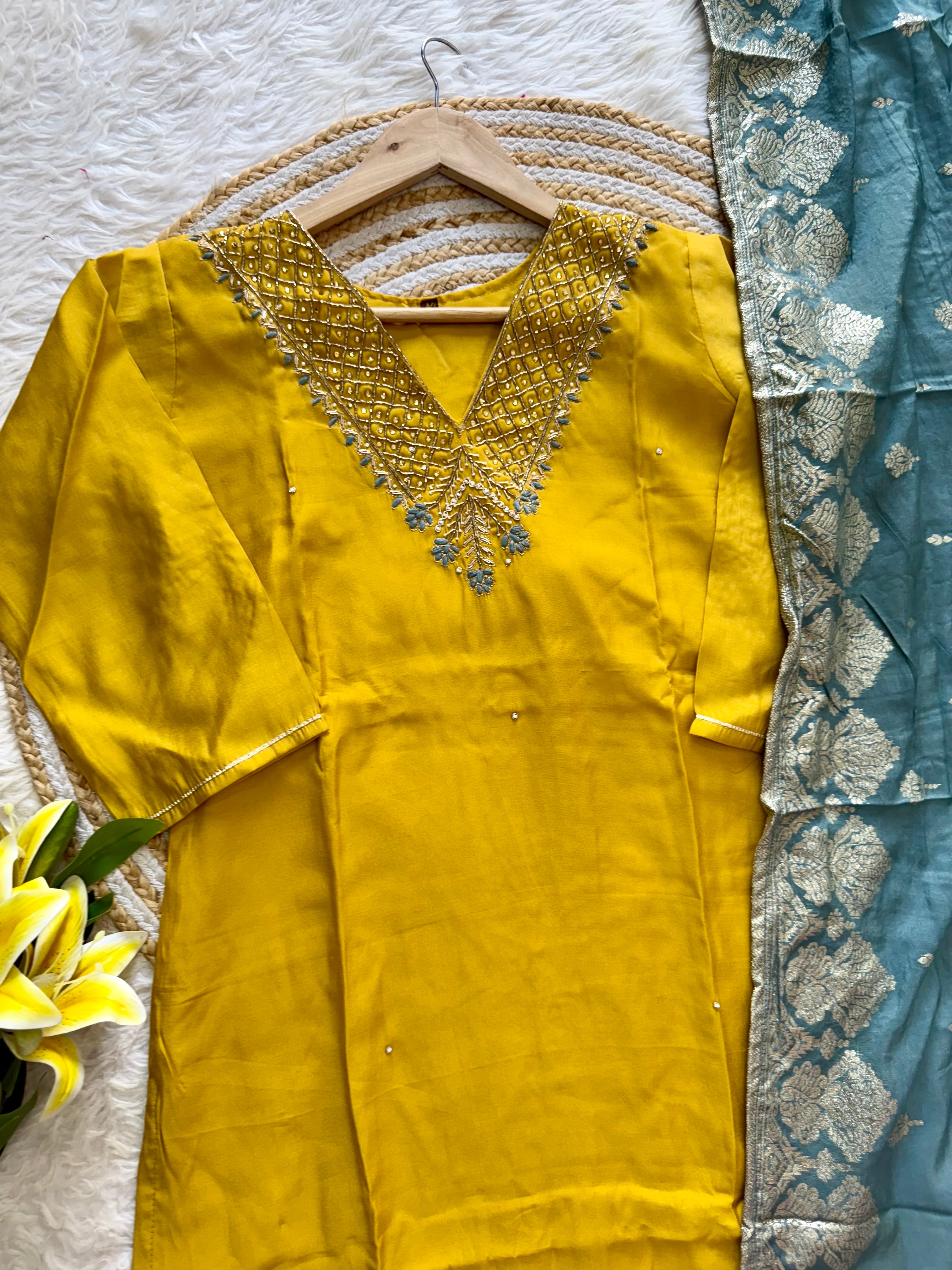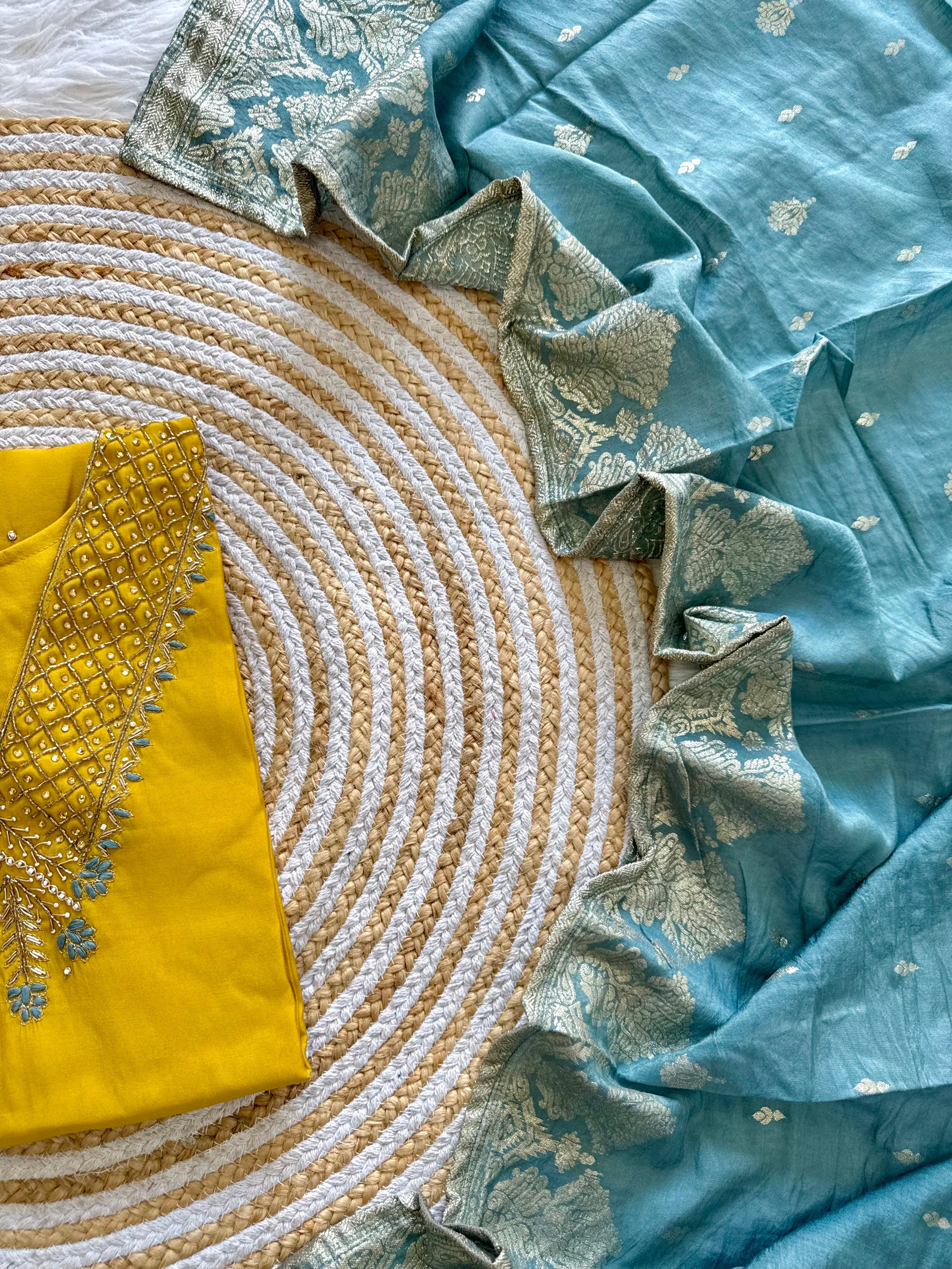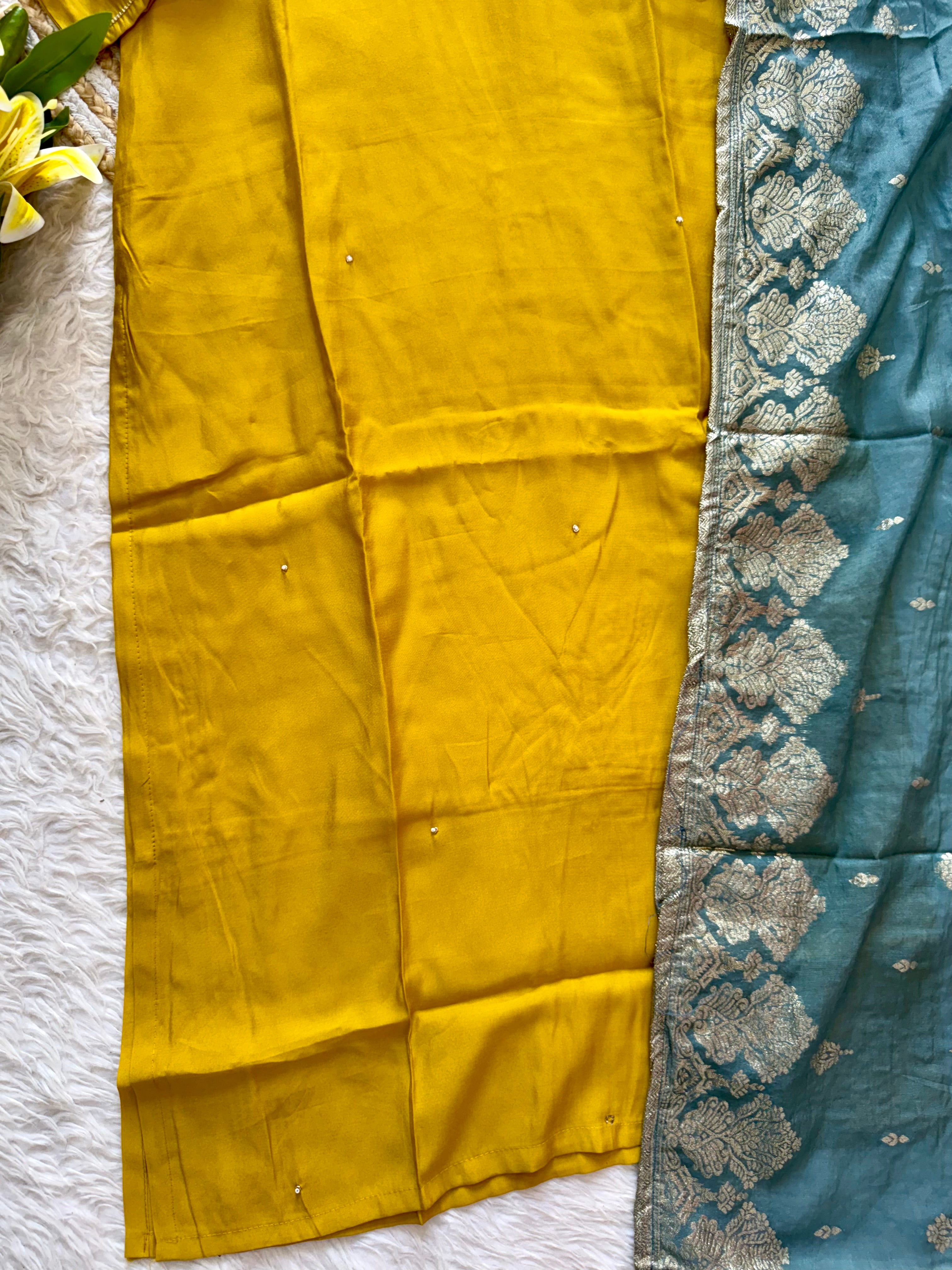 Colour: yellow with powder blue duppata