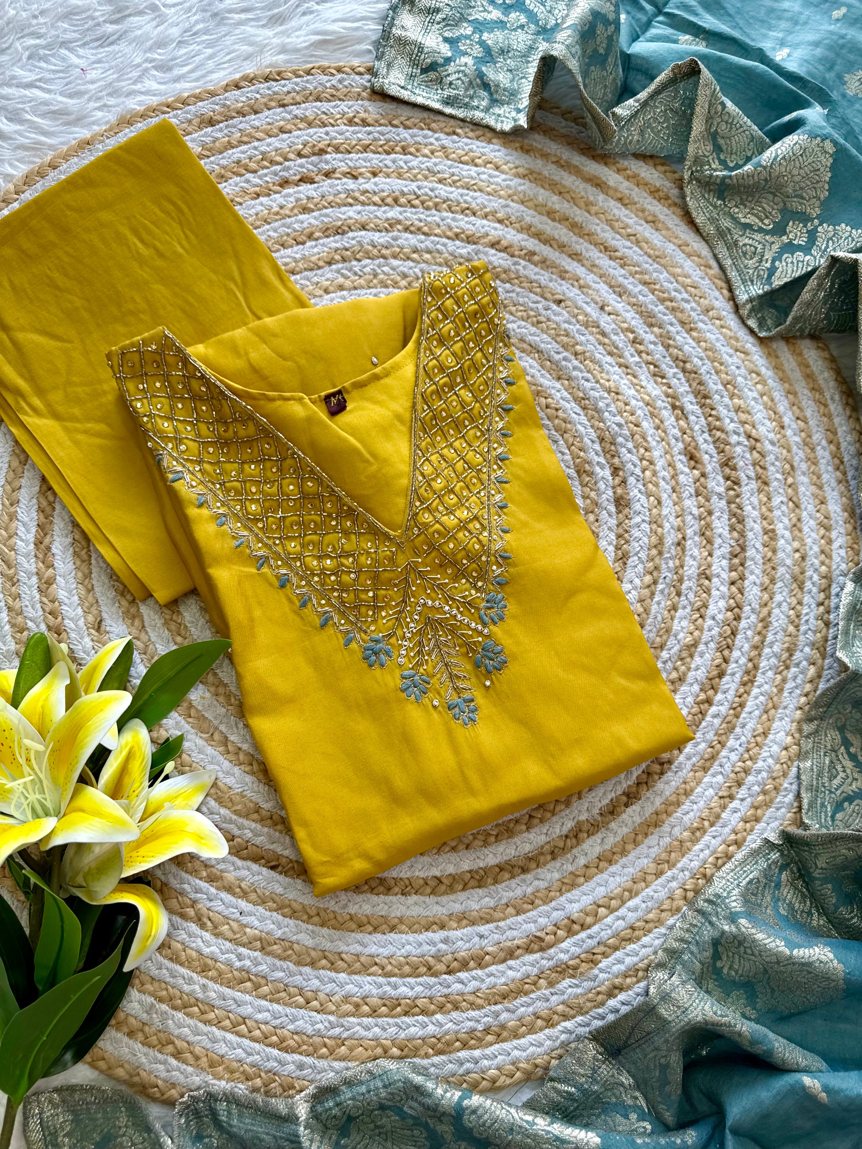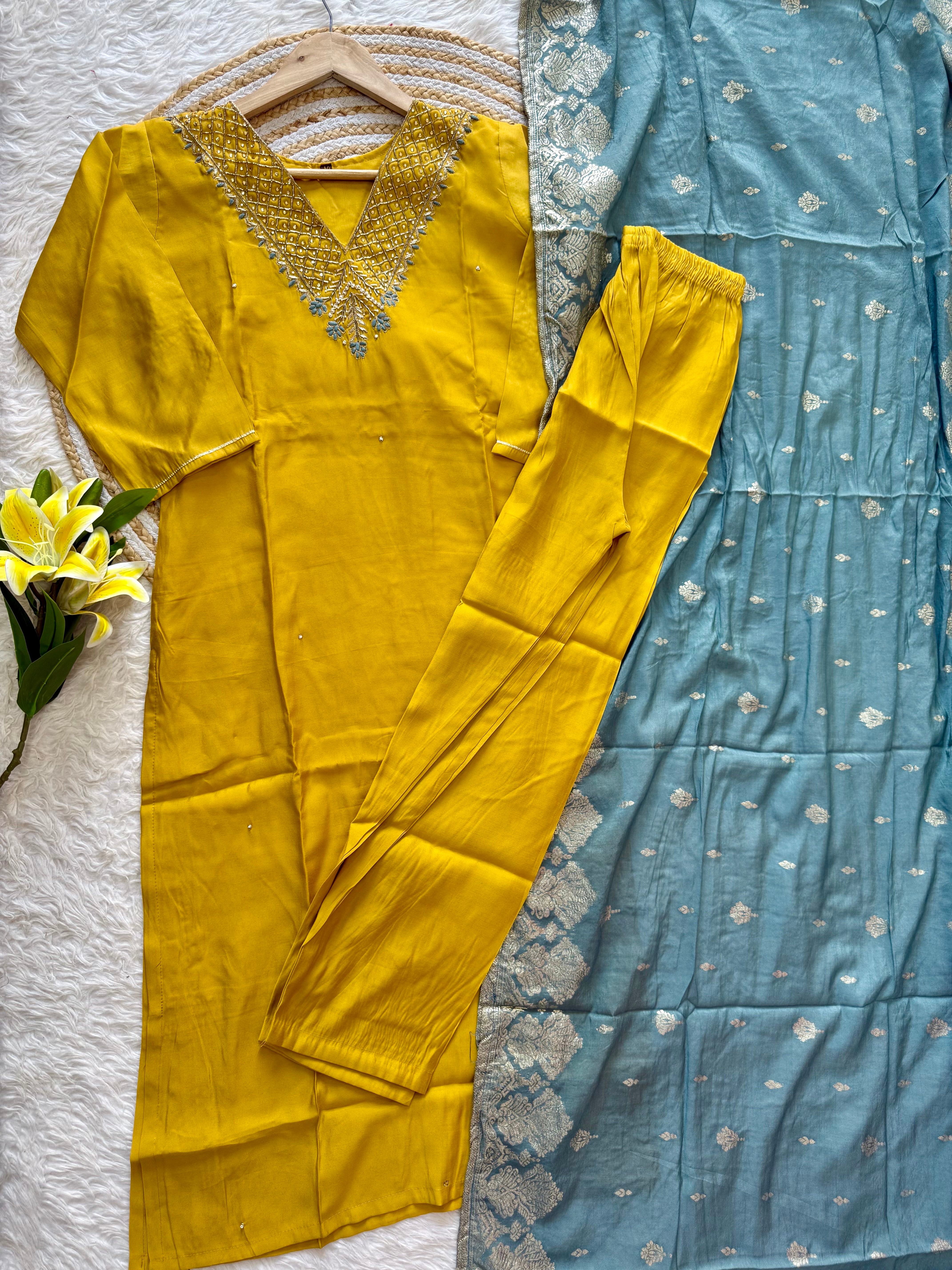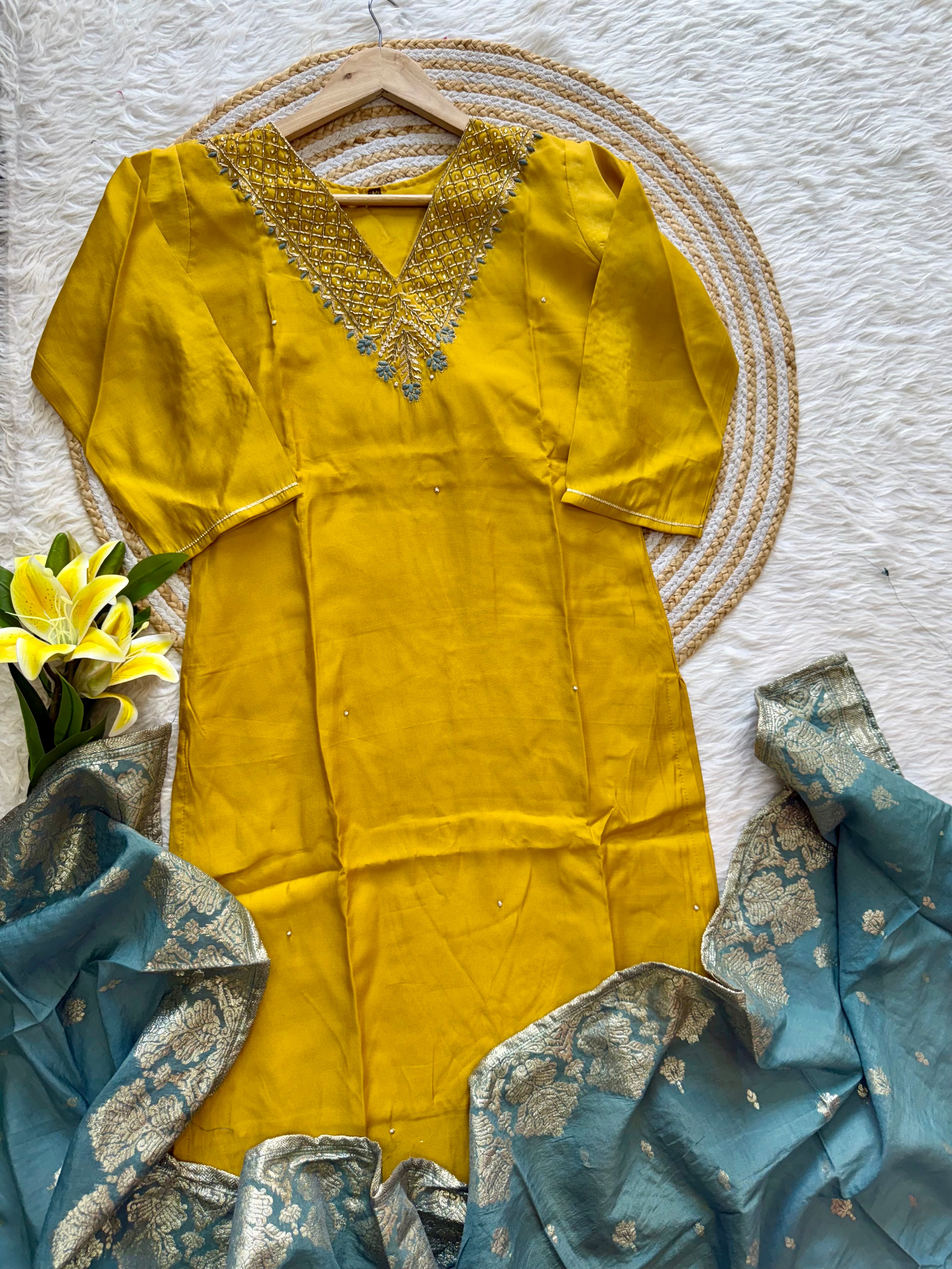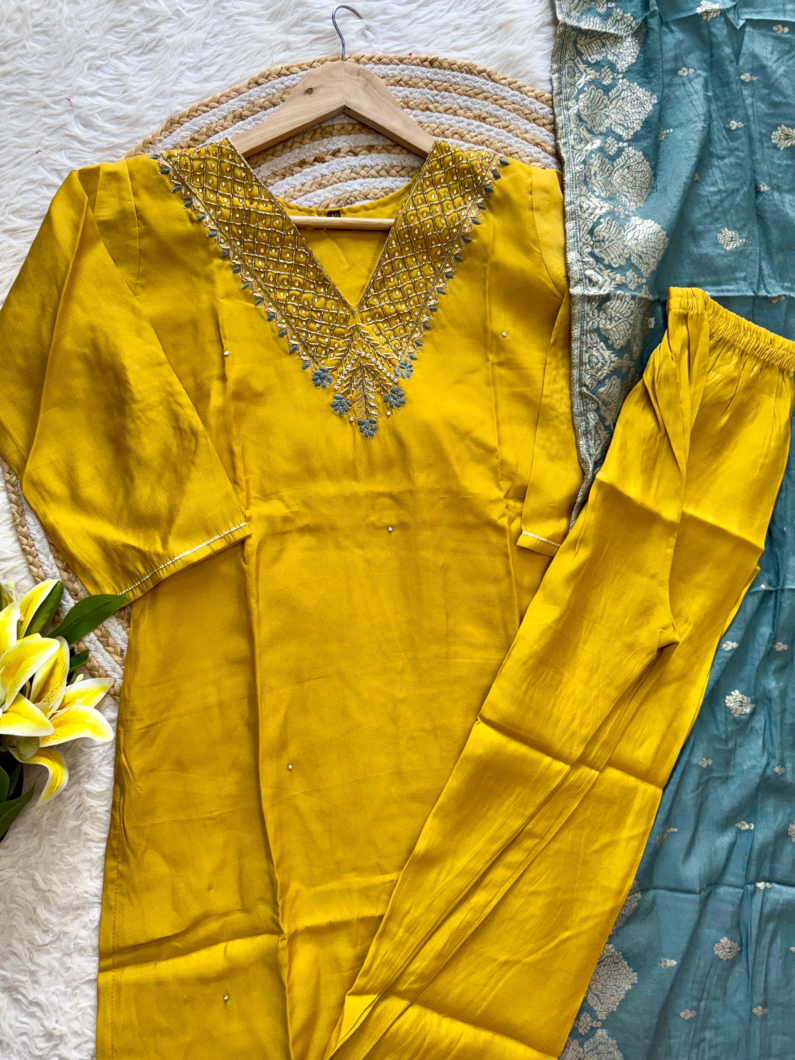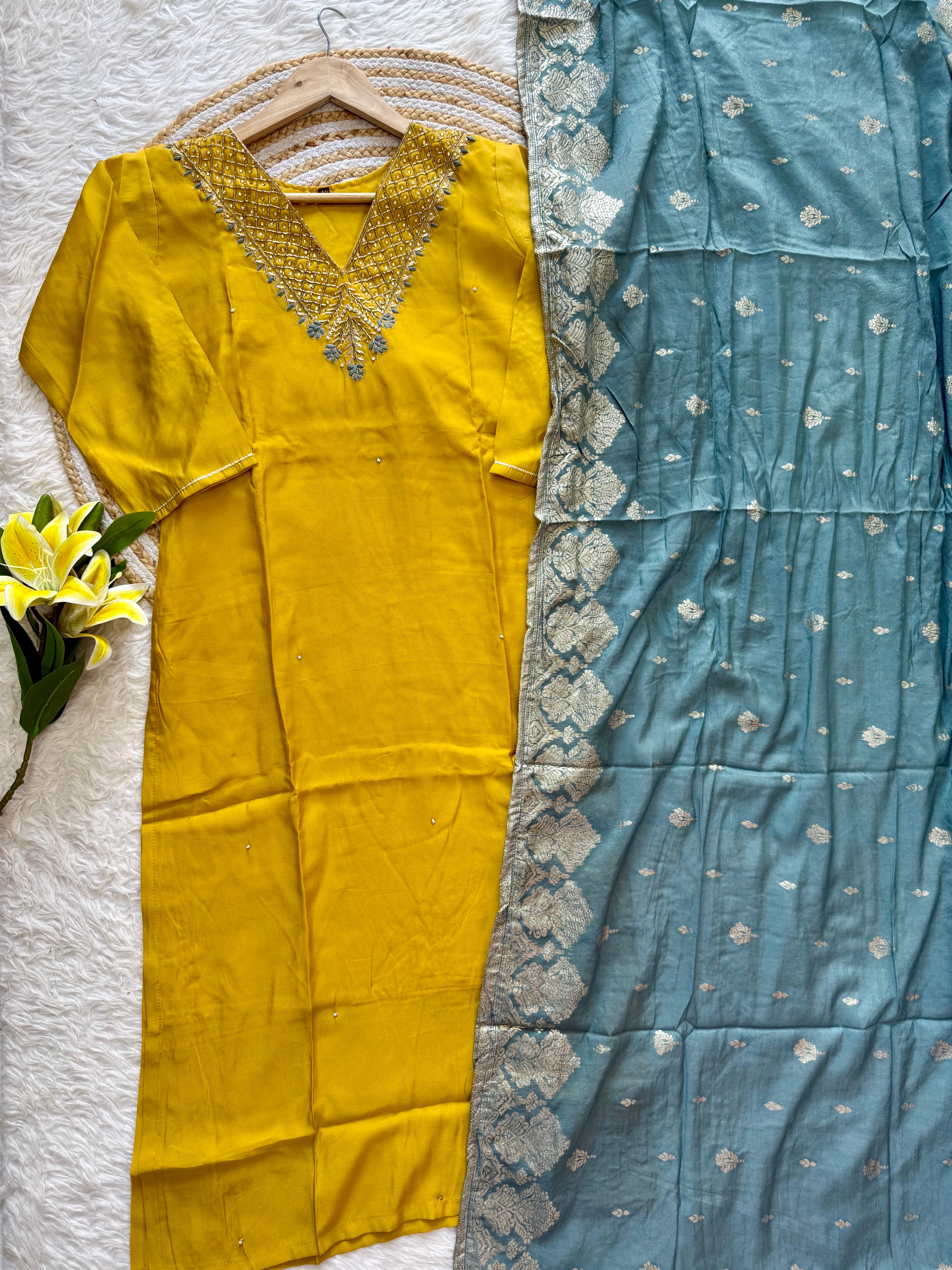 Colour: yellow with powder blue duppata