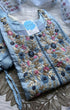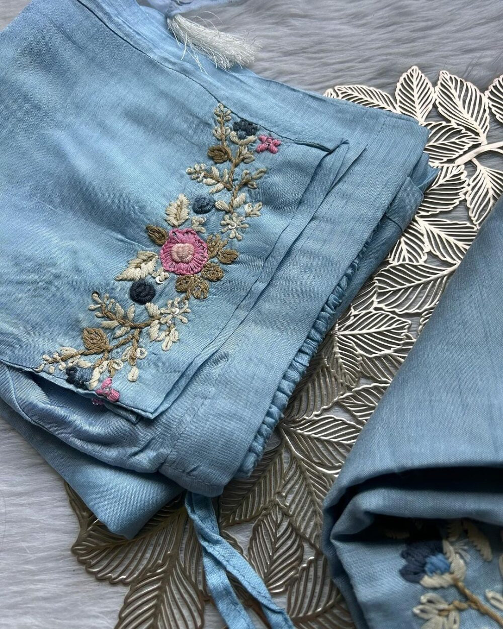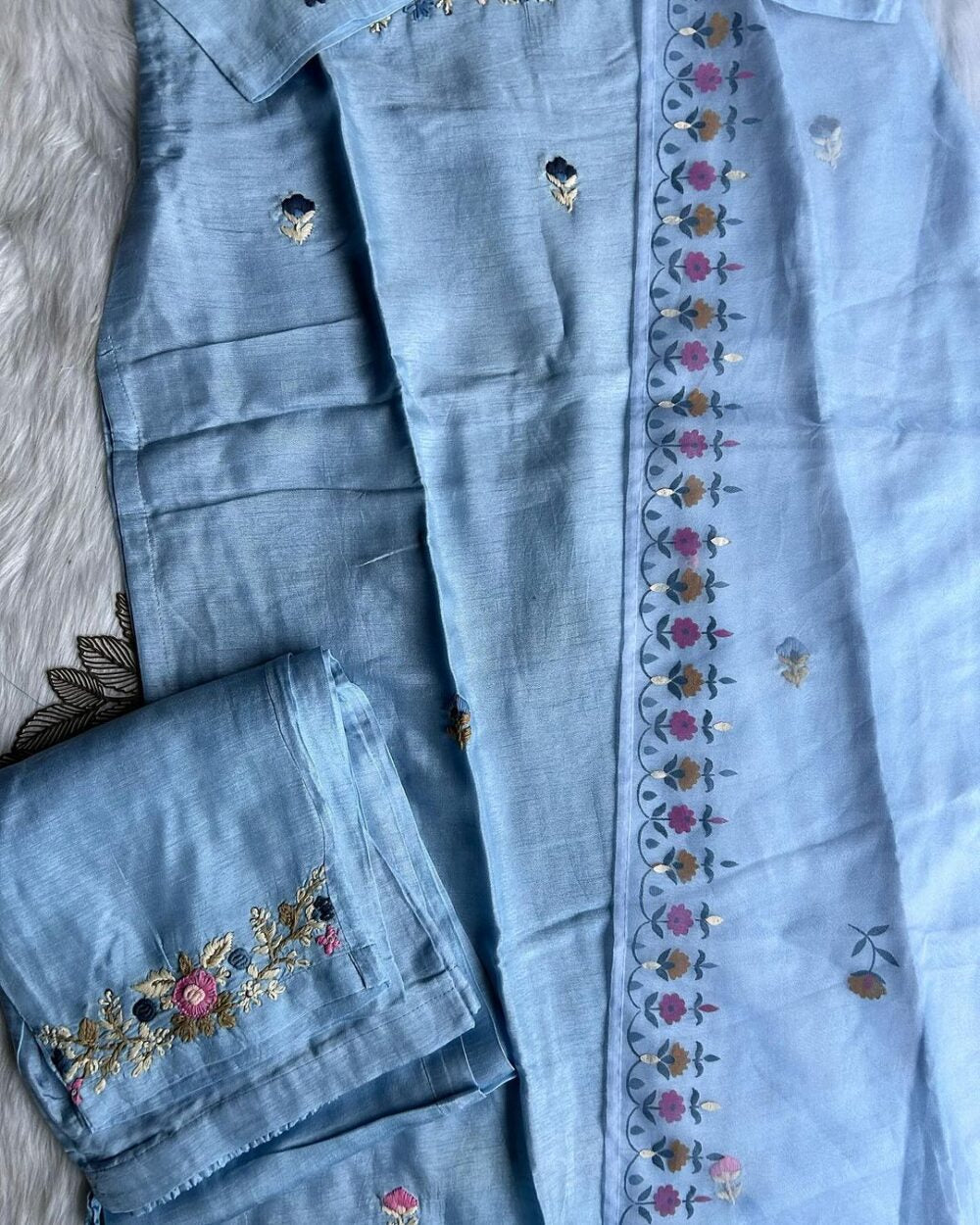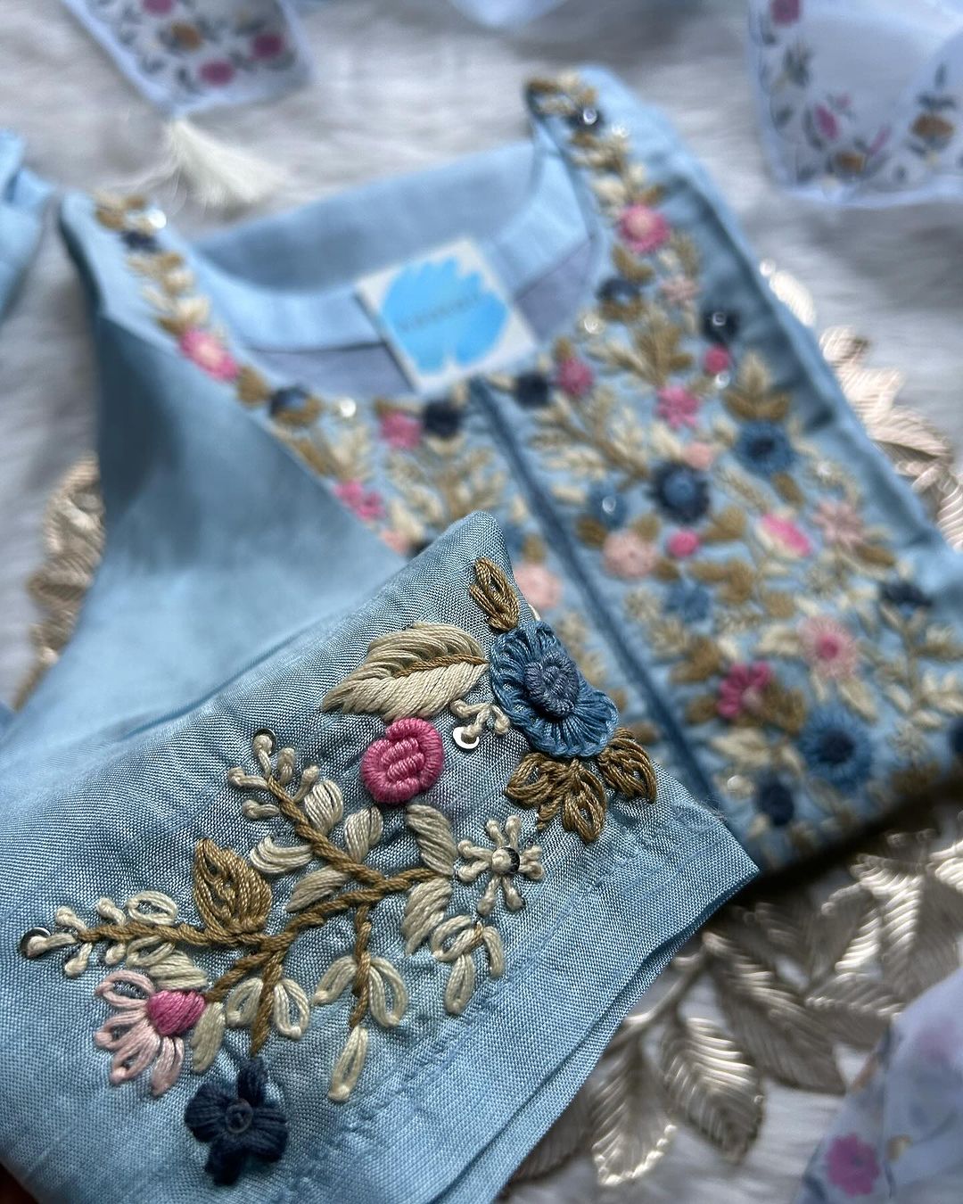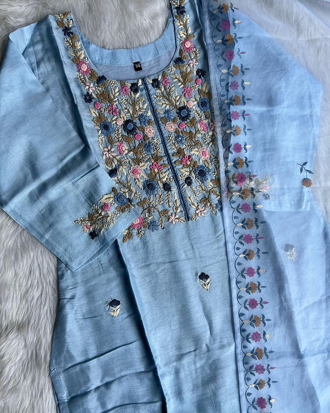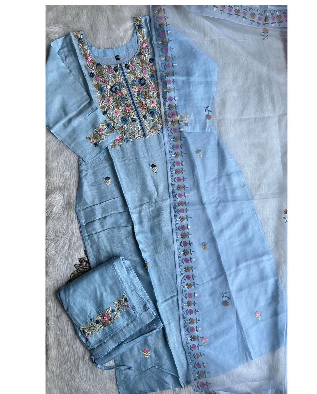 Simple & elegant handwork with floral printed organza dupatta, handwork on the yoke & sleeve of the kurta and a work bottom