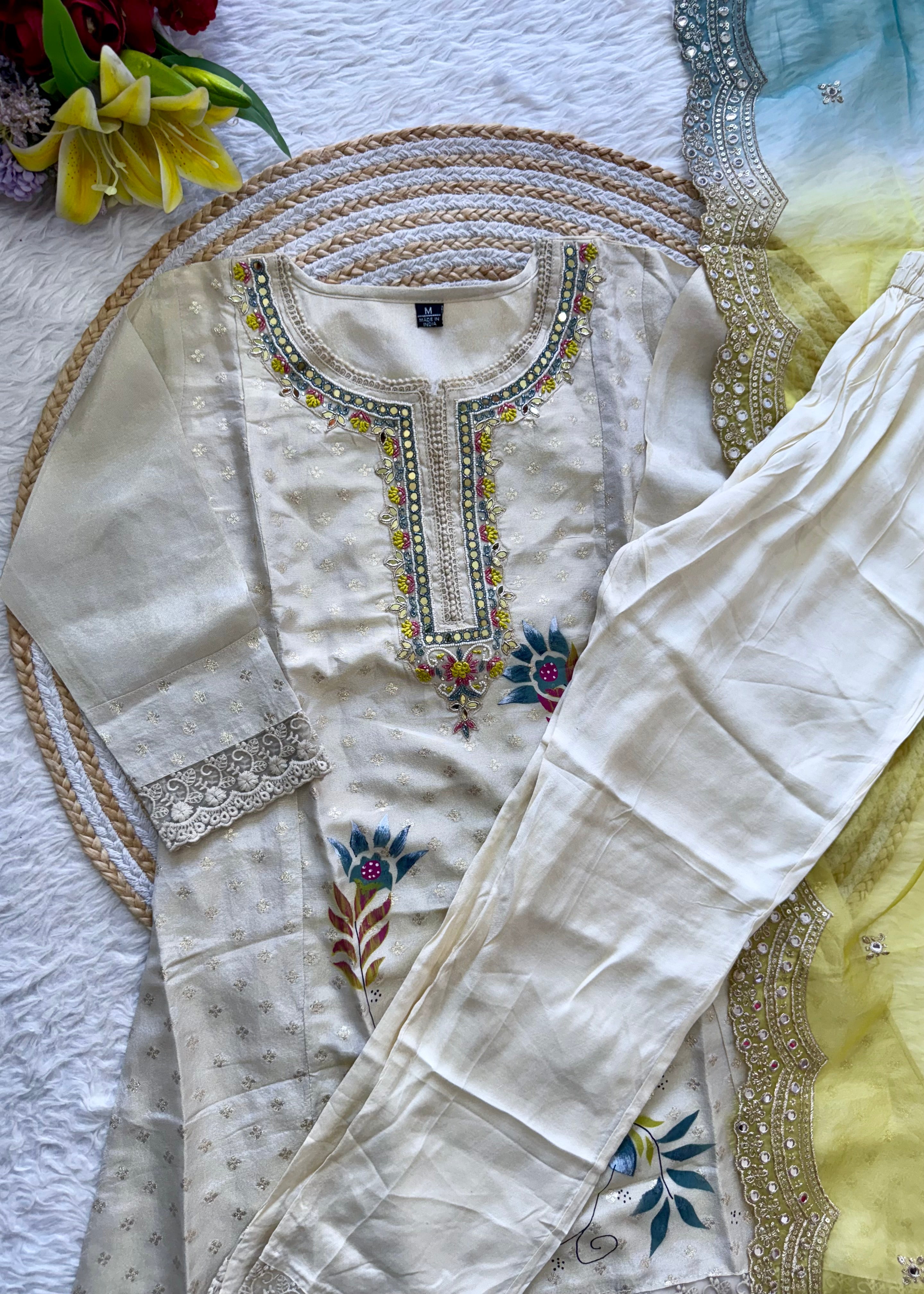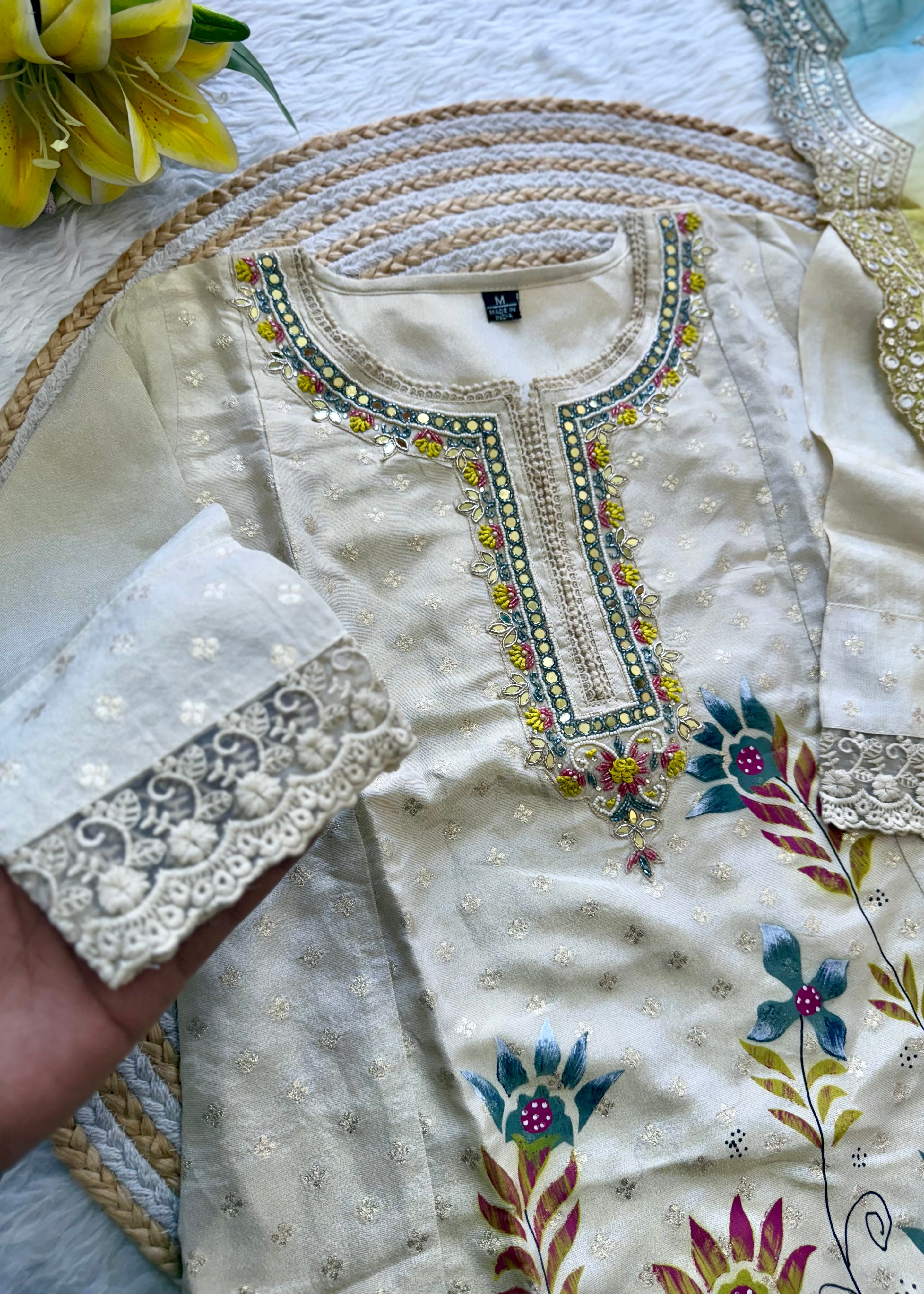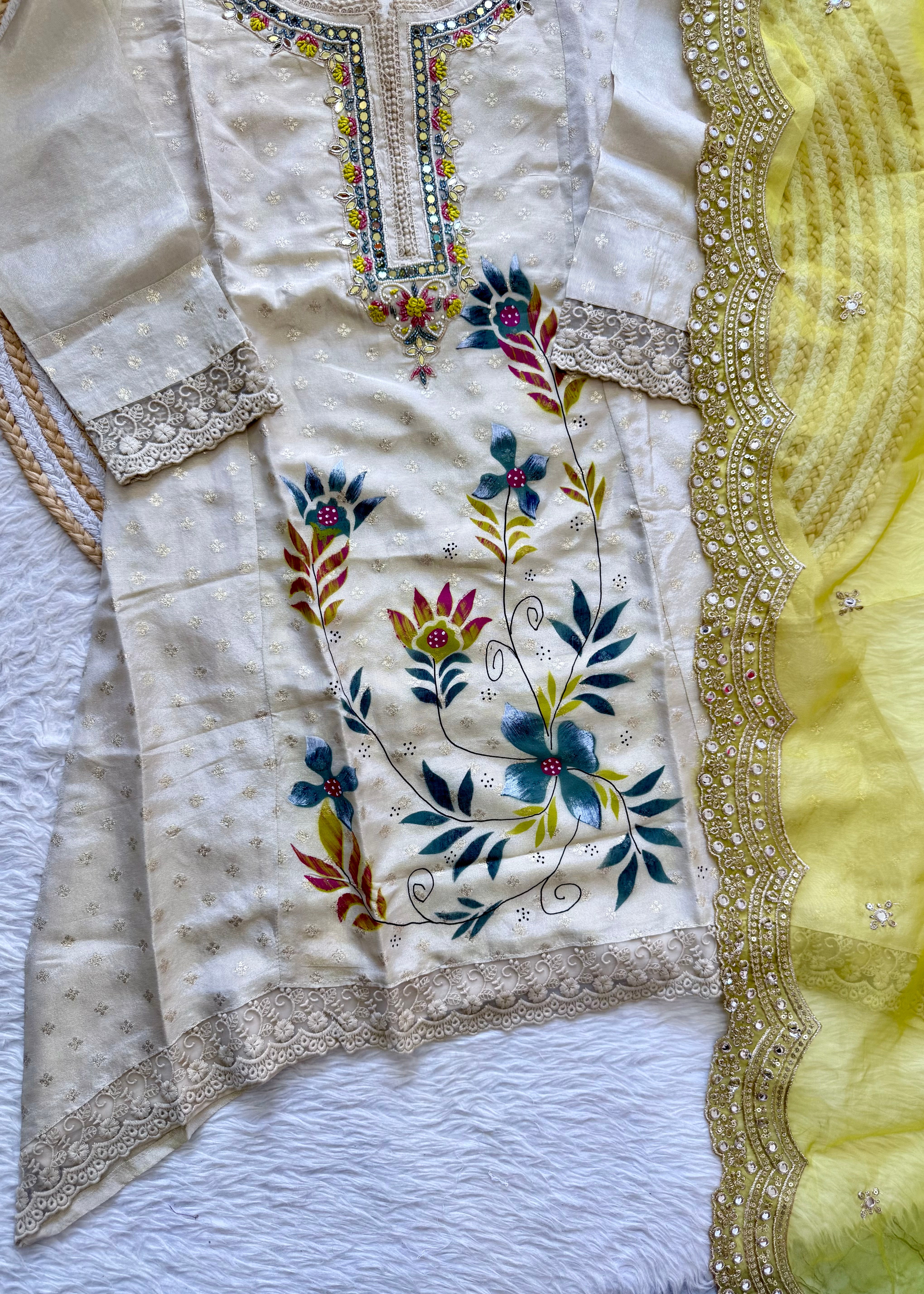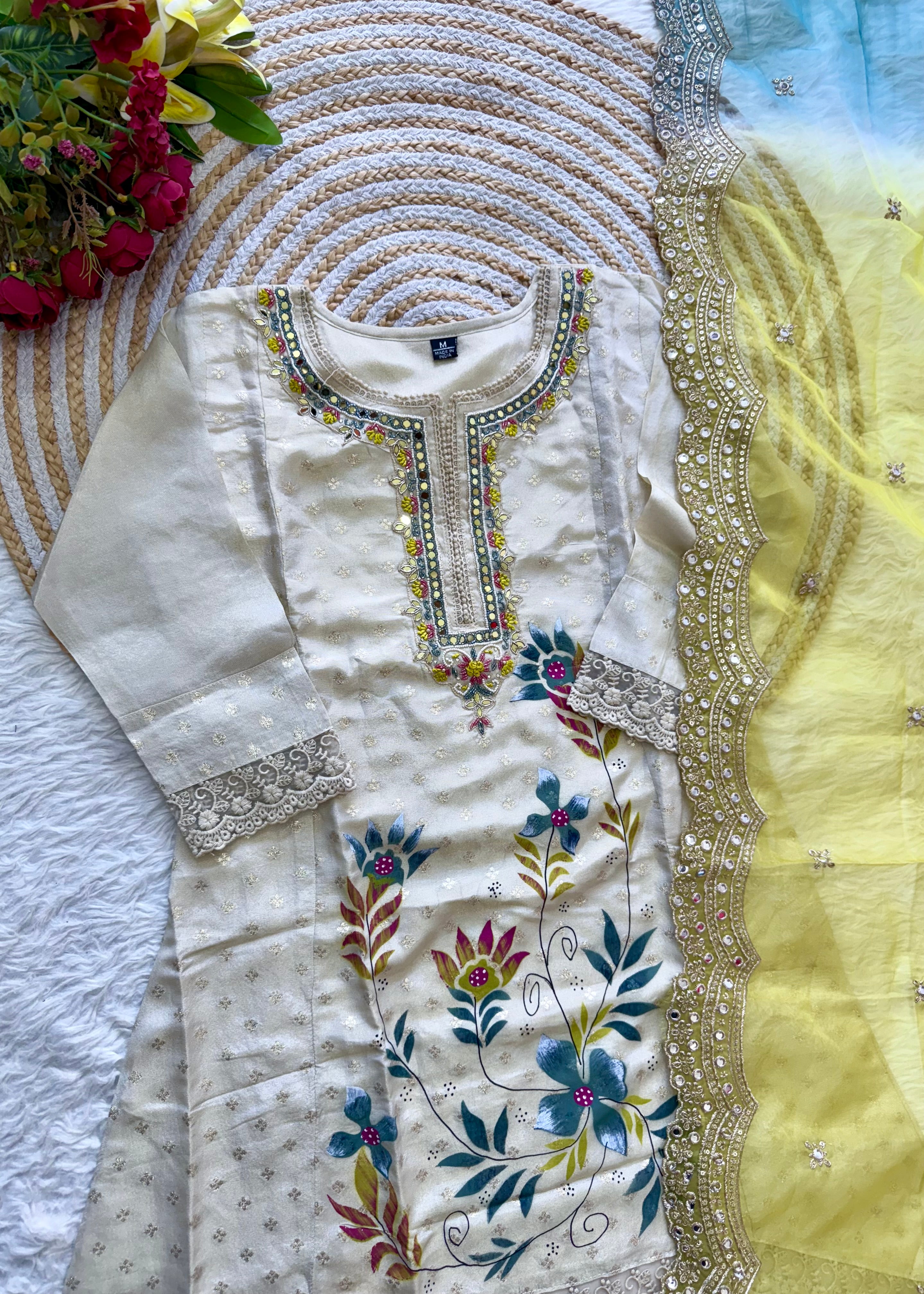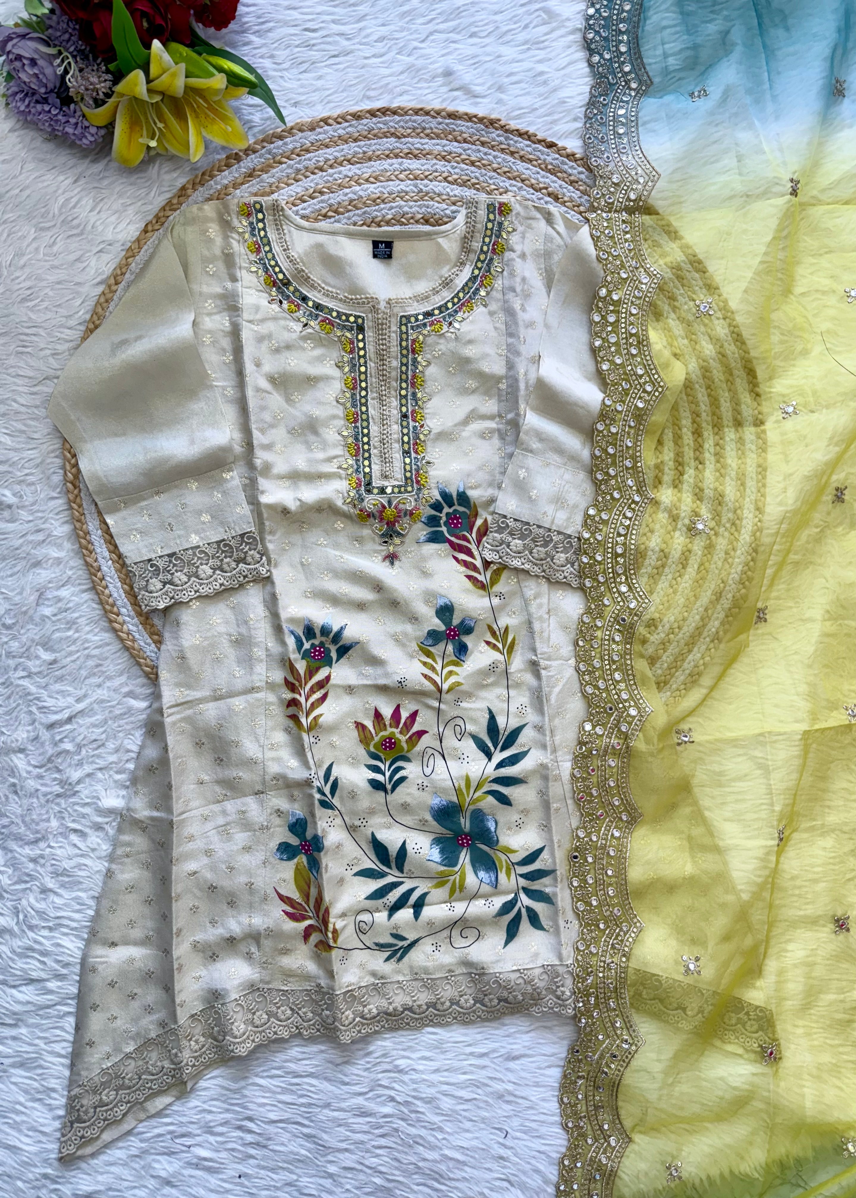 A very beautiful jacquard weaving piece with , lacework, weaving , handwork & appliquework all over the kurta with a beautiful handwork detailing double tone organza dupatta and a silk bottom