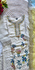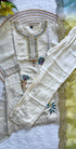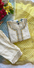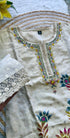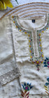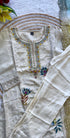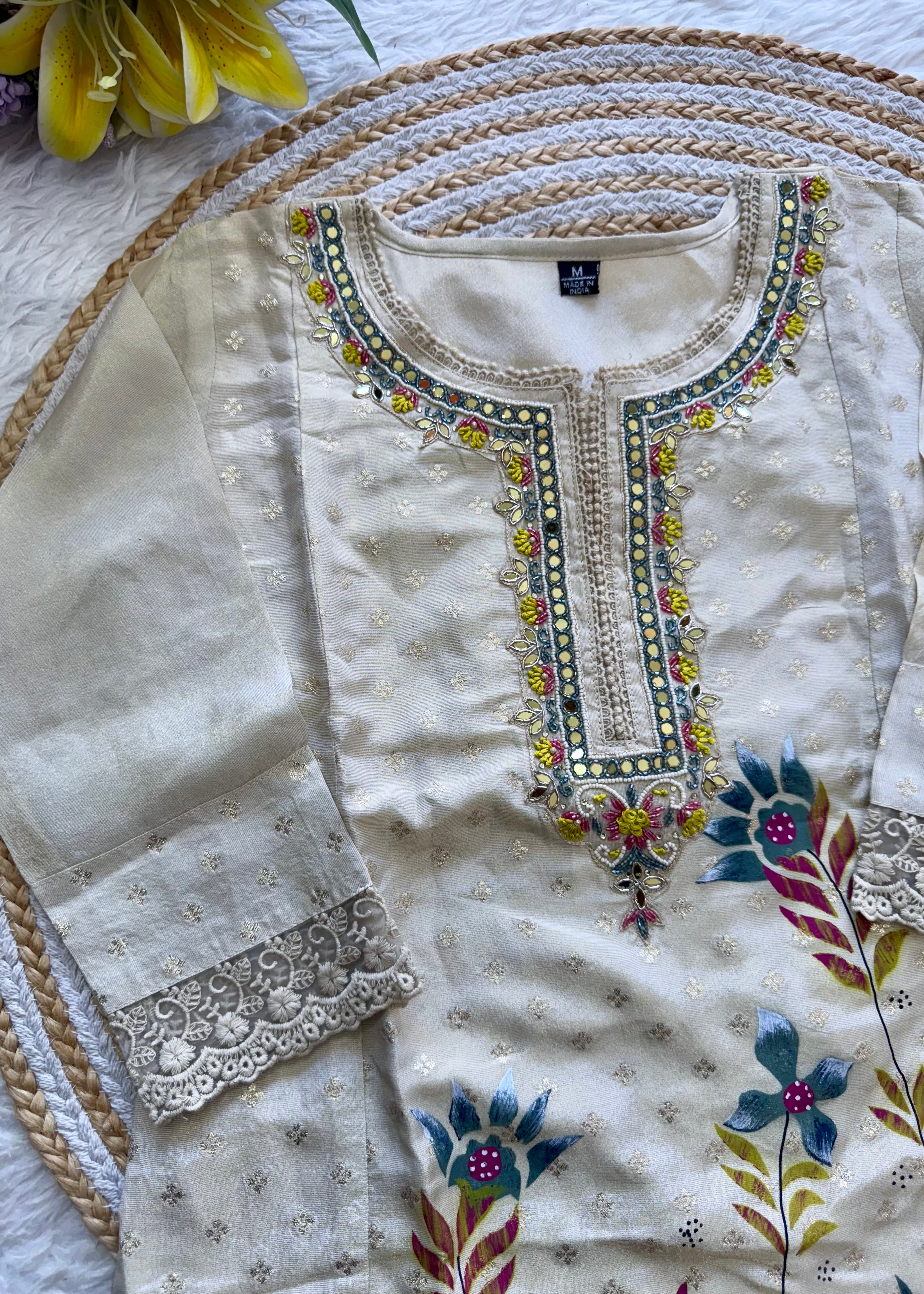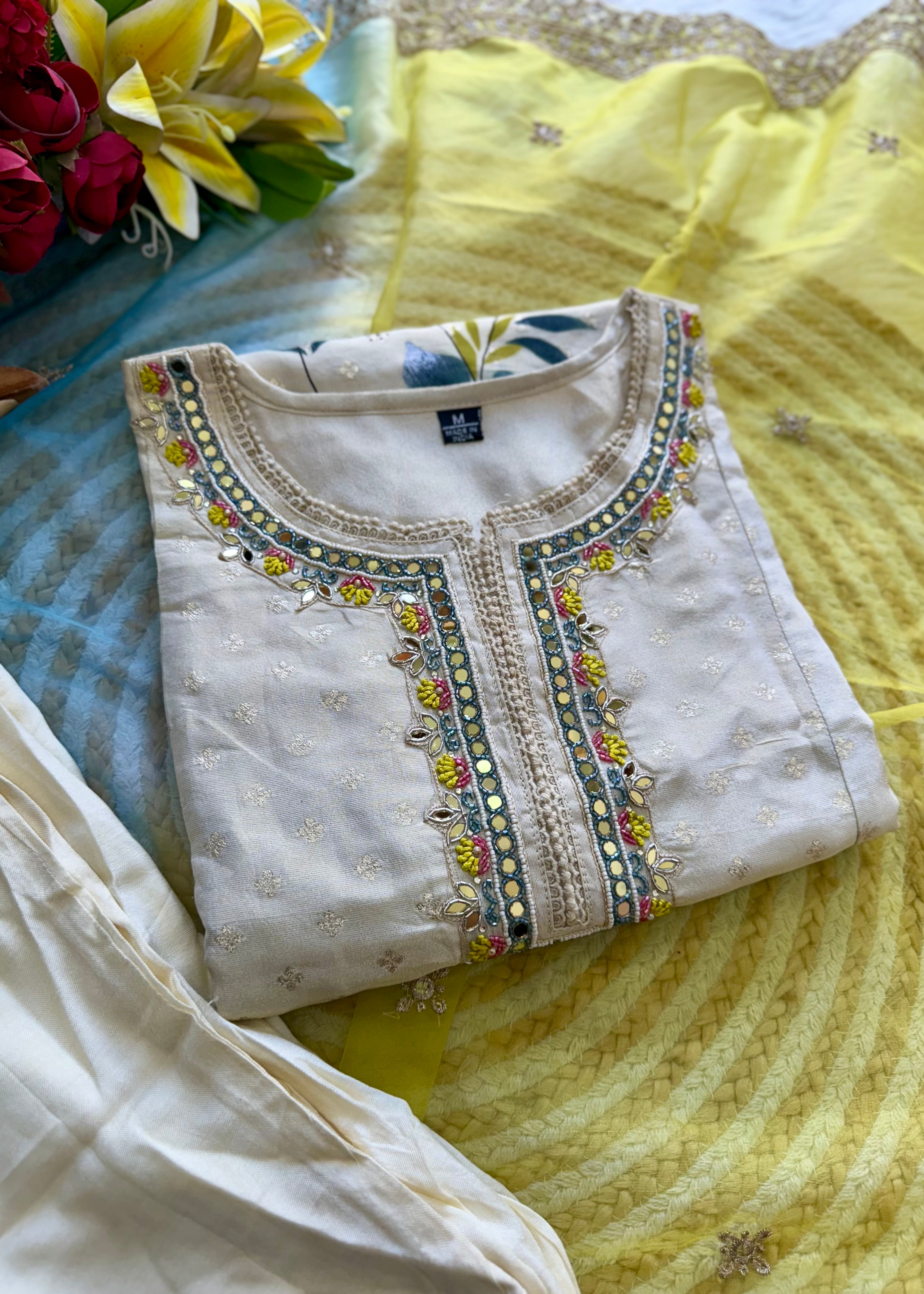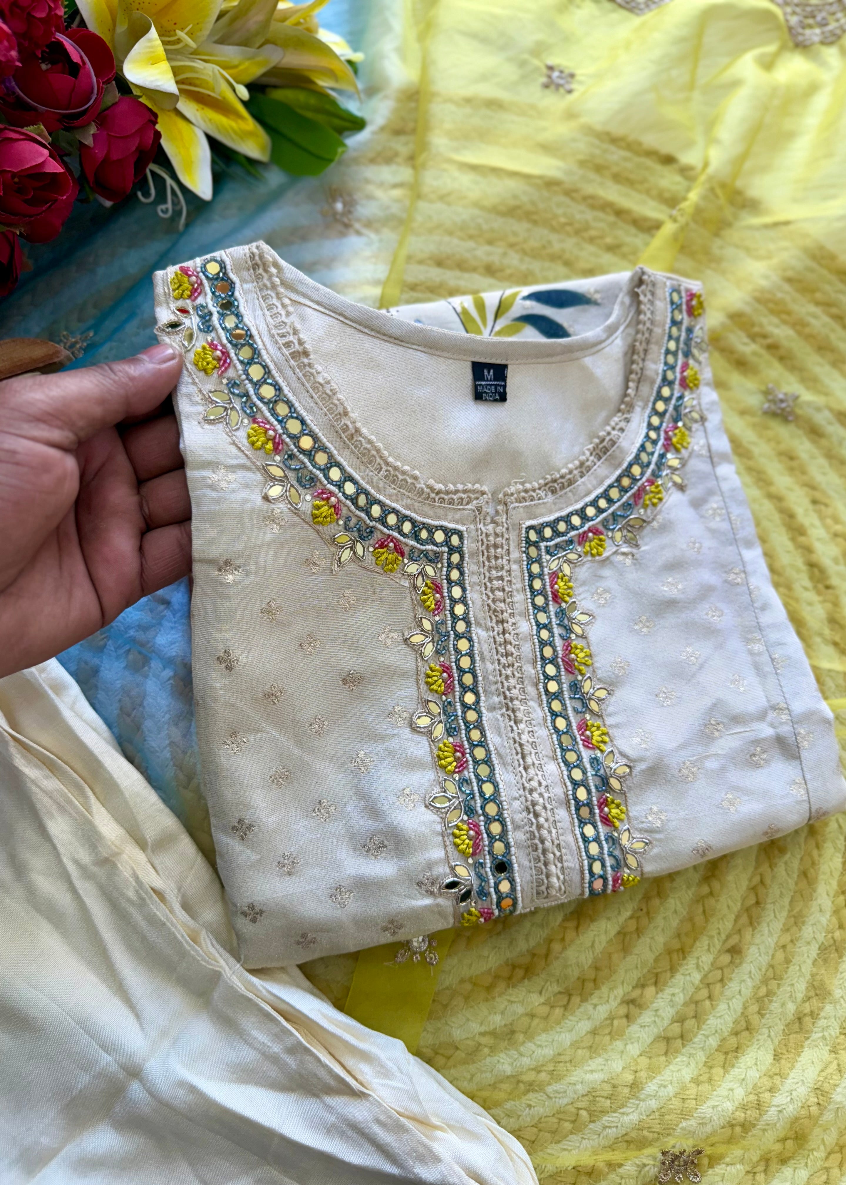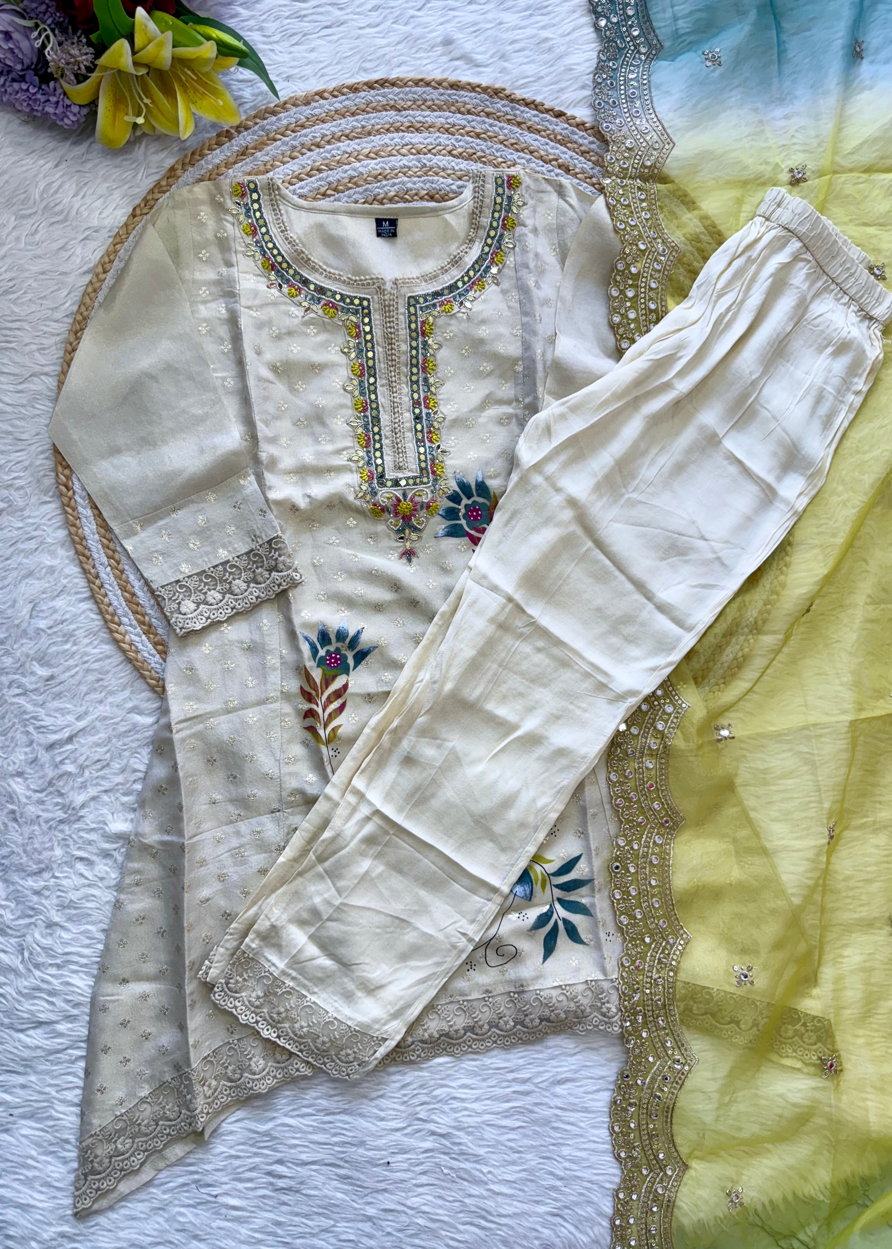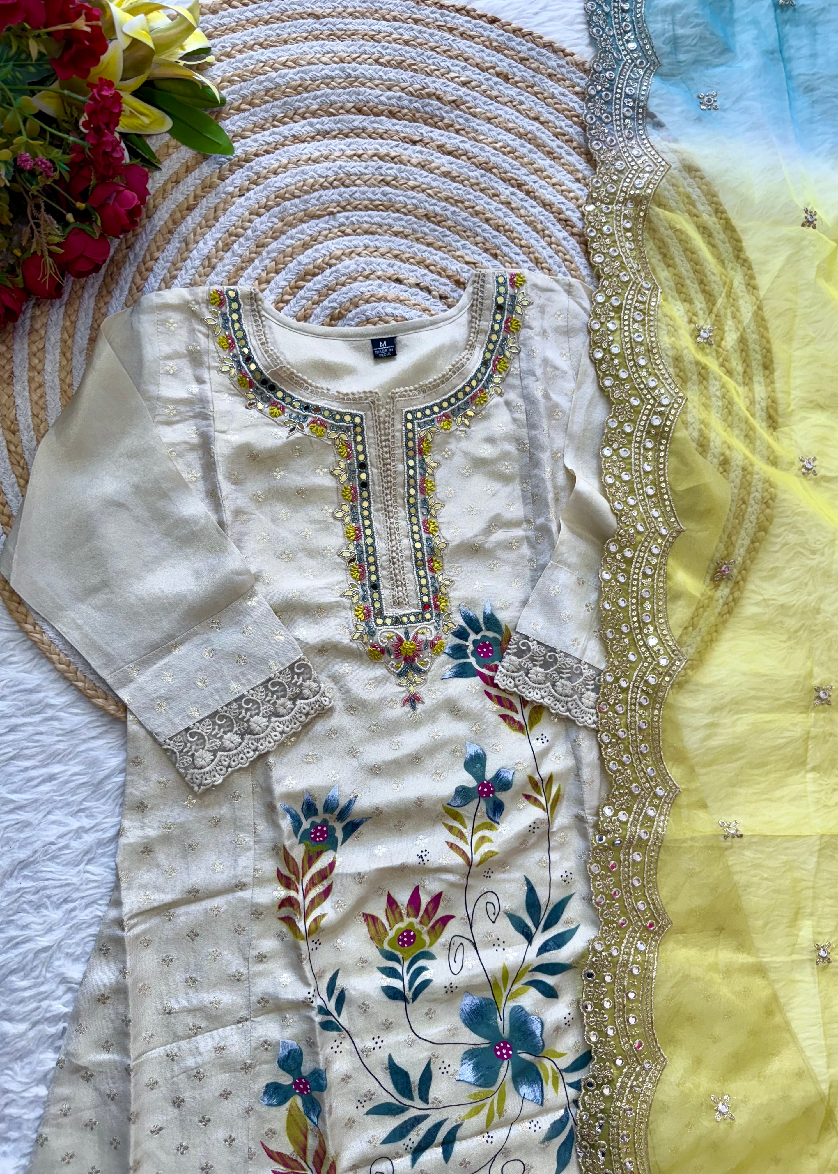 A very beautiful jacquard weaving piece with , lacework, weaving , handwork & appliquework all over the kurta with a beautiful handwork detailing double tone organza dupatta and a silk bottom