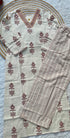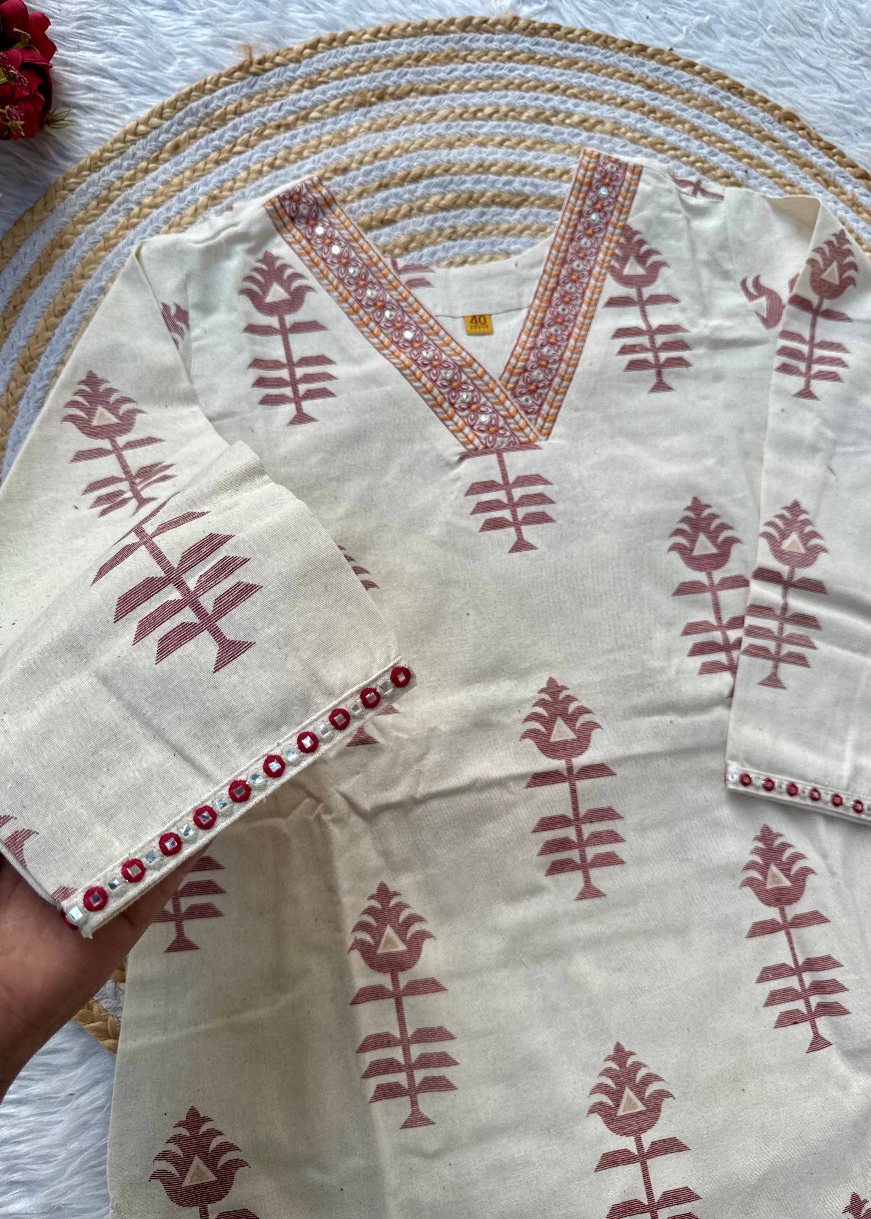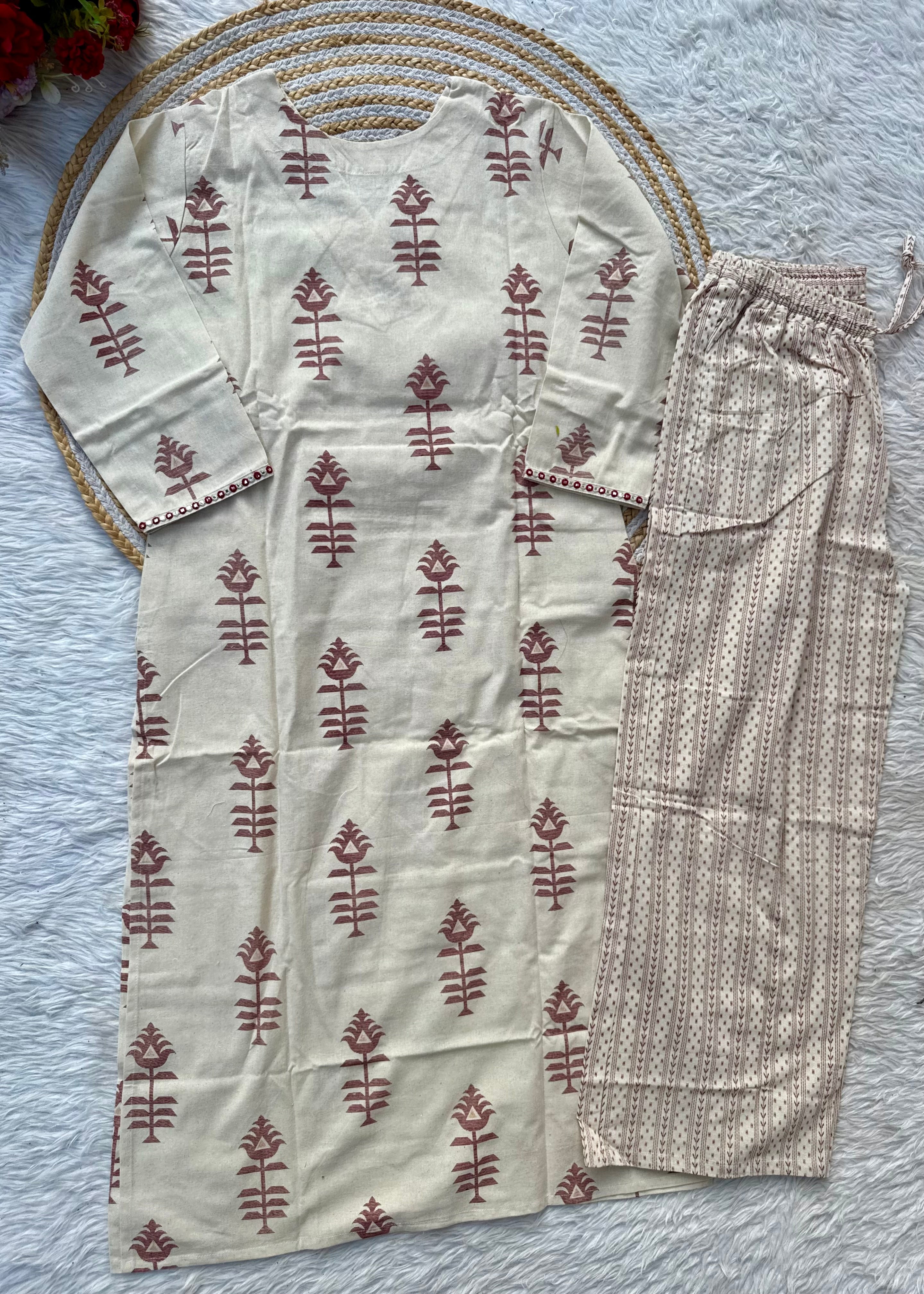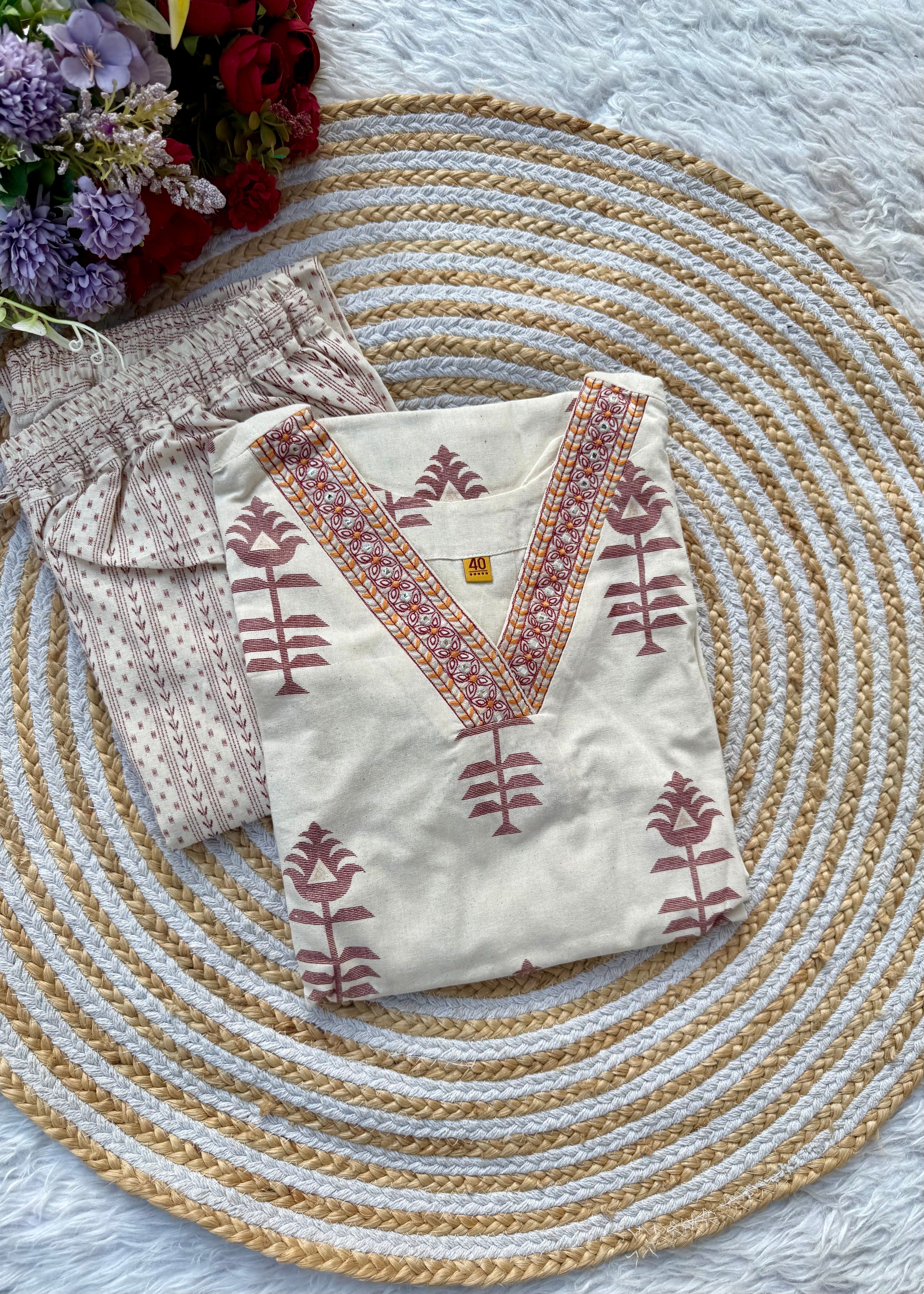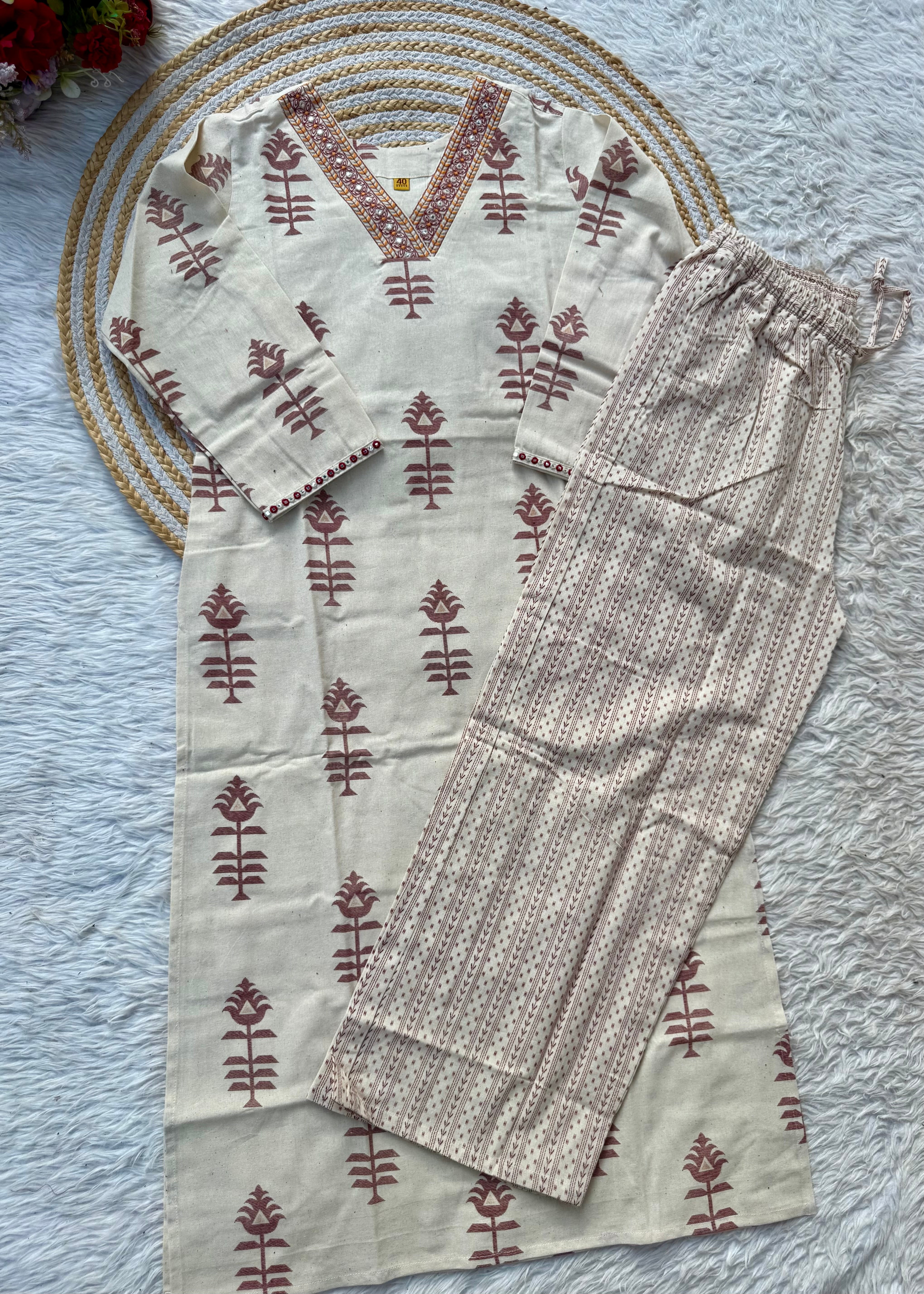 cotton kurti pant set with handwork on the yoke & sleeve with printed work all over the kurta with a cotton bottom
