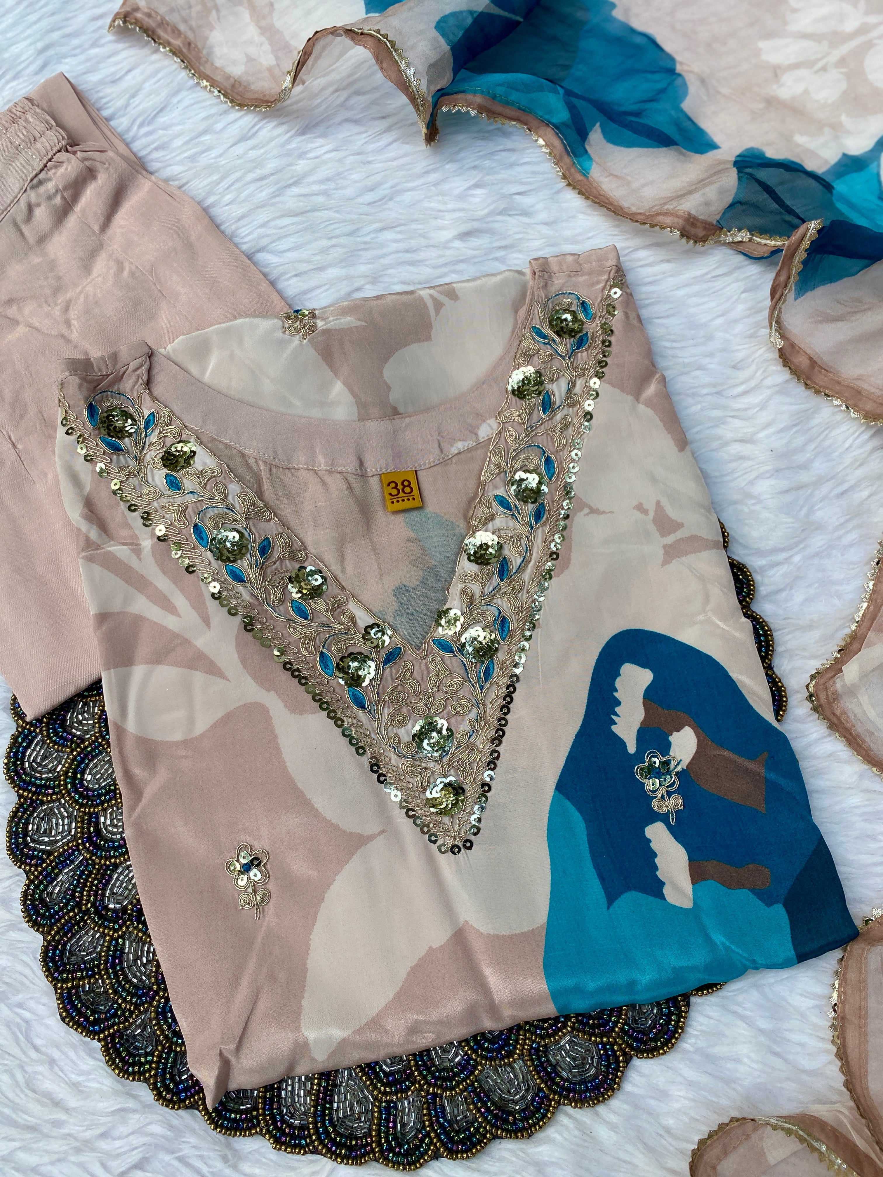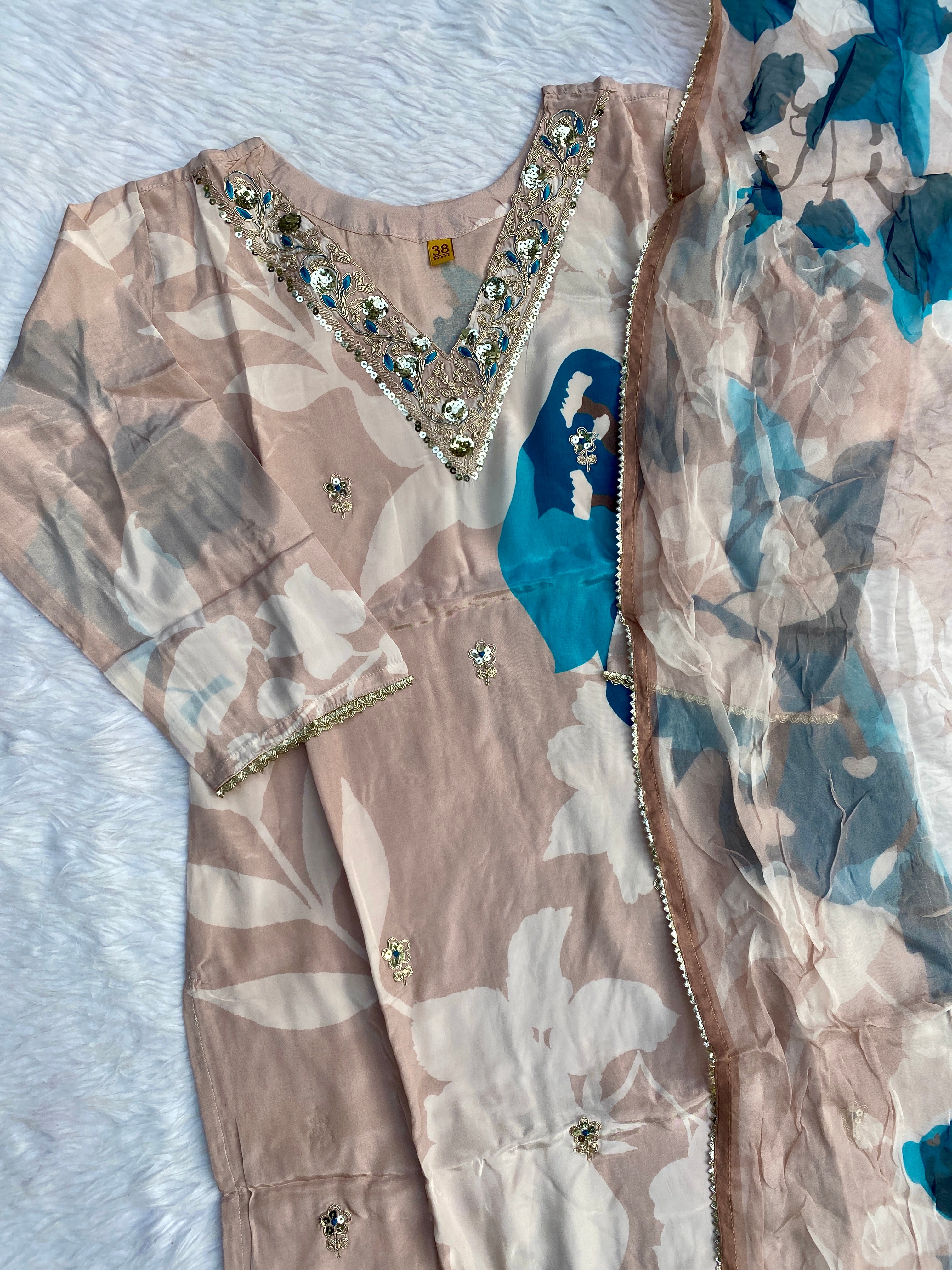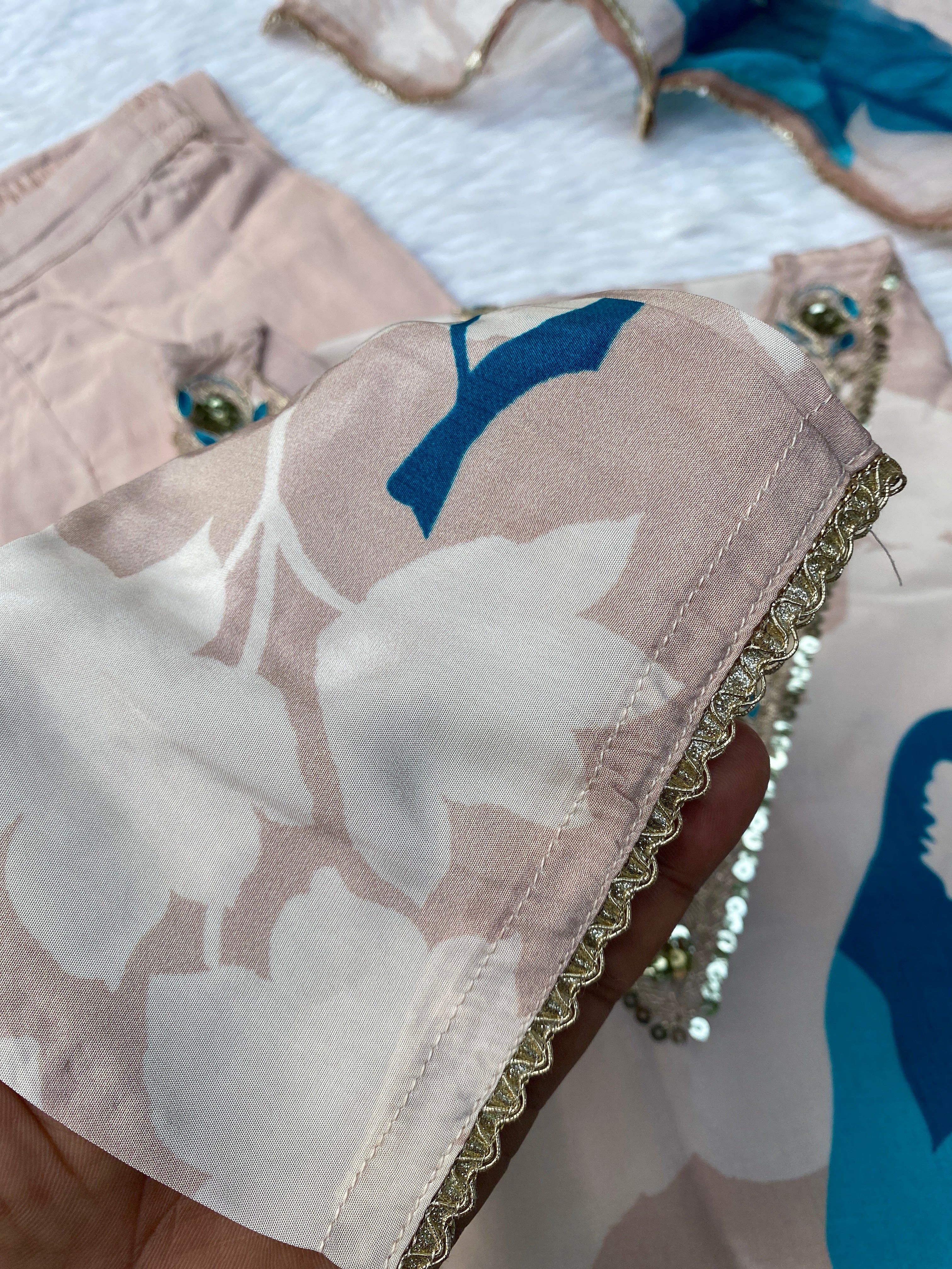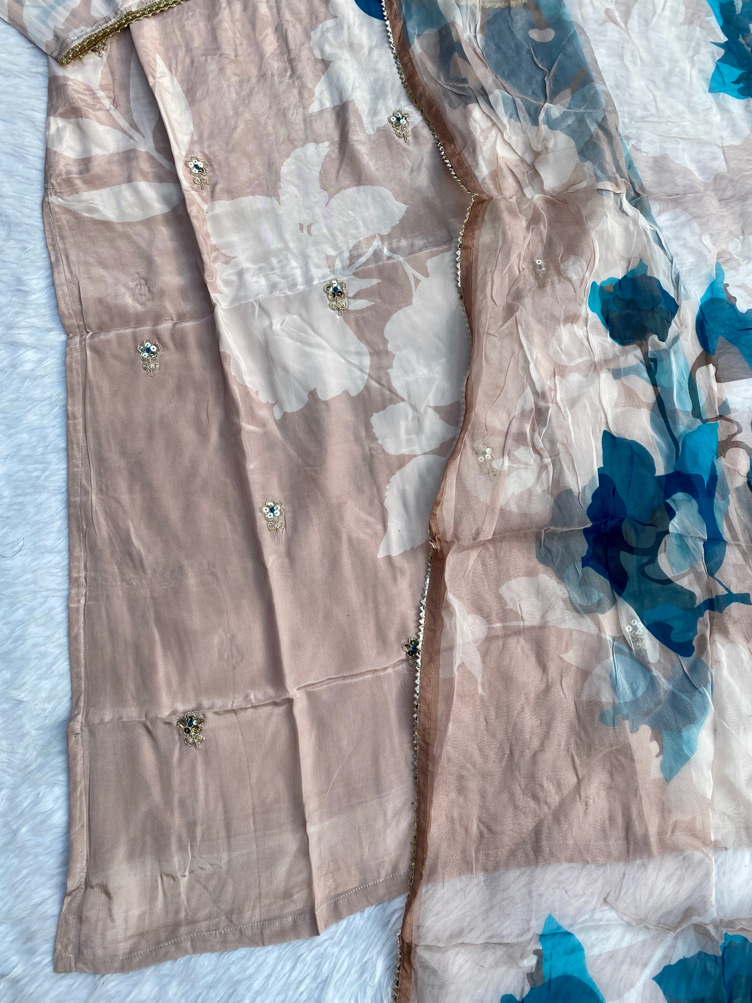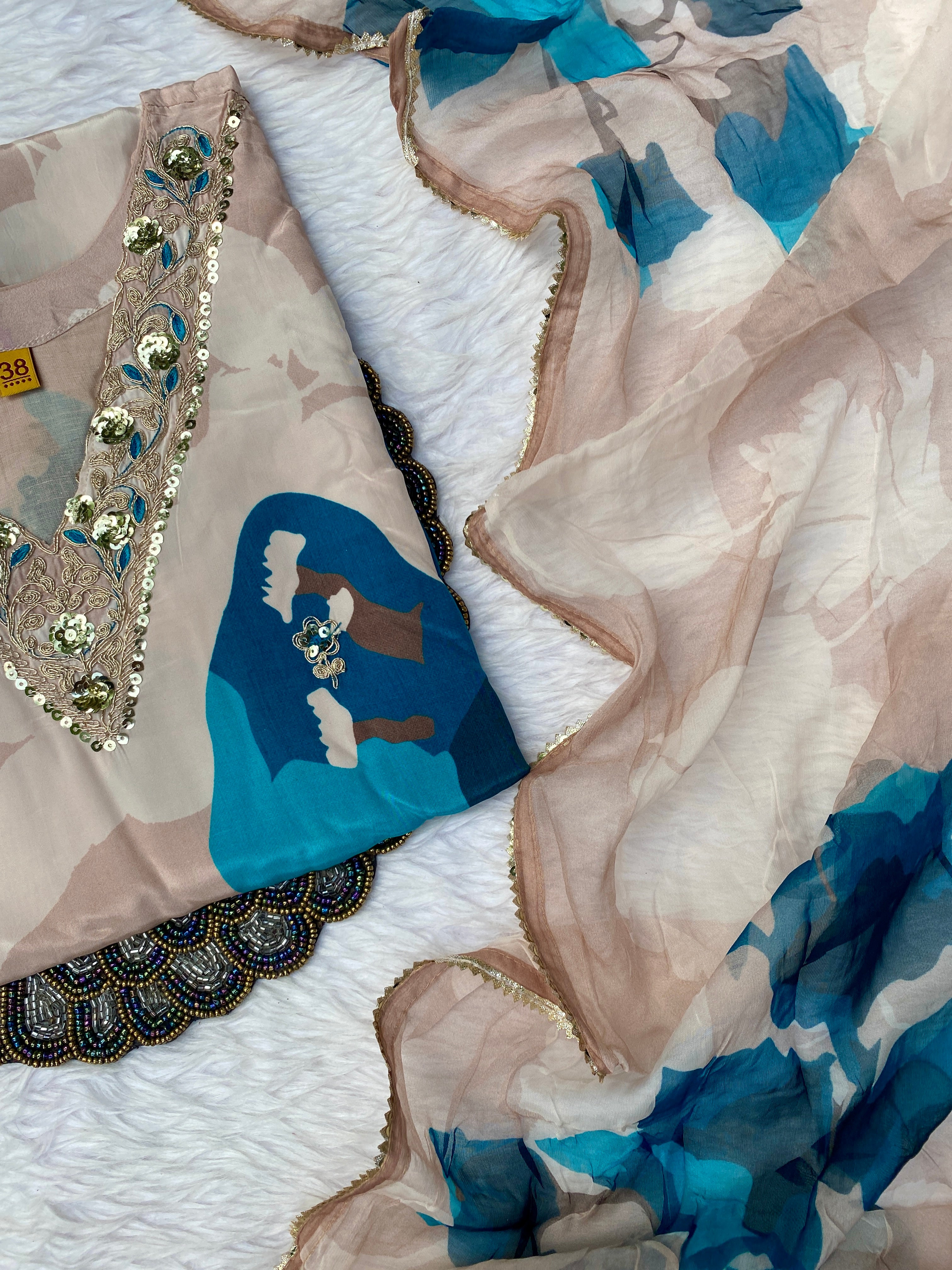 Beautiful Crepe Silk kurti with  Embroidered, Printed & Sequence work all over the top with a long printed organza dupatta and a slik bottom