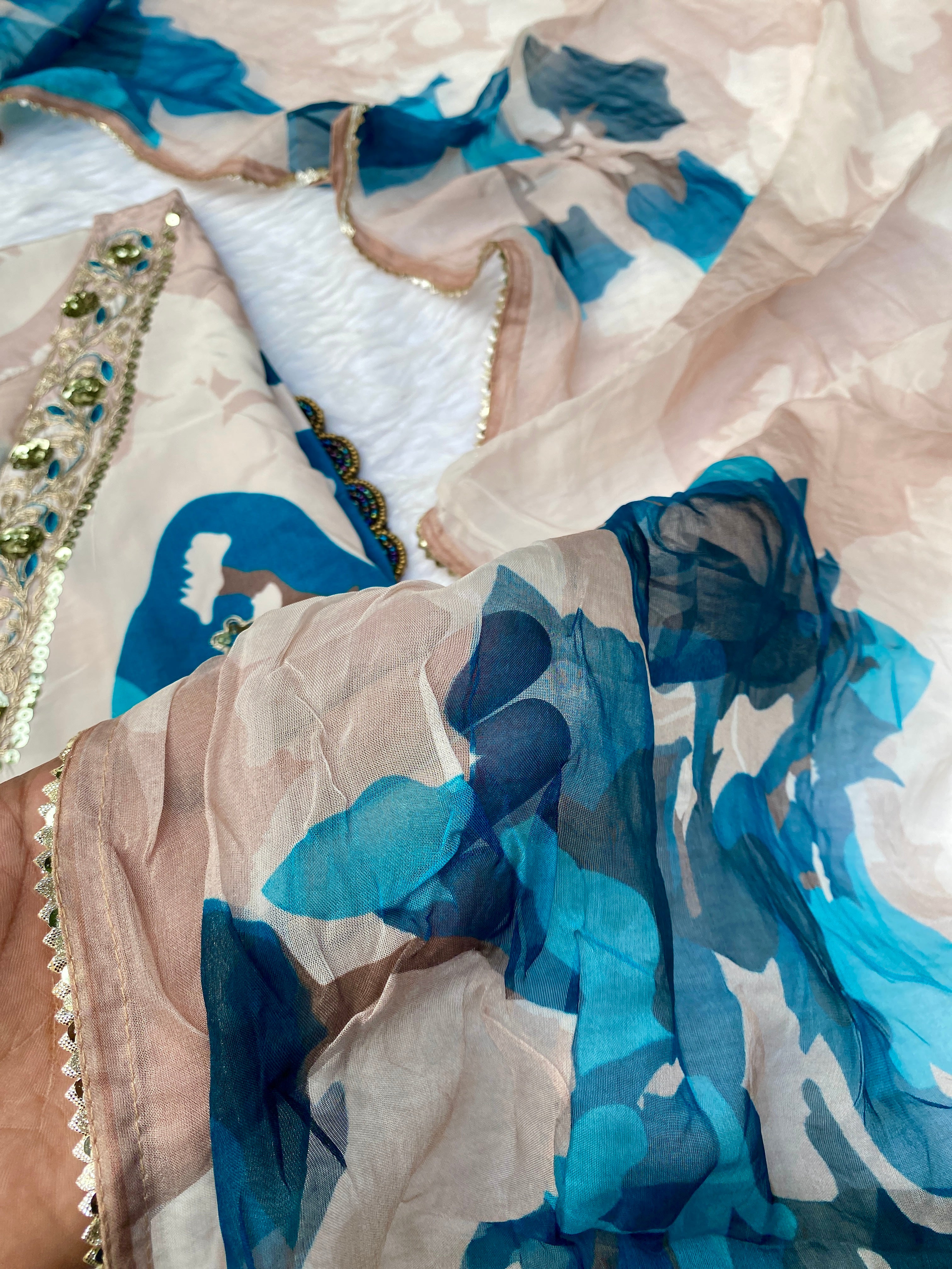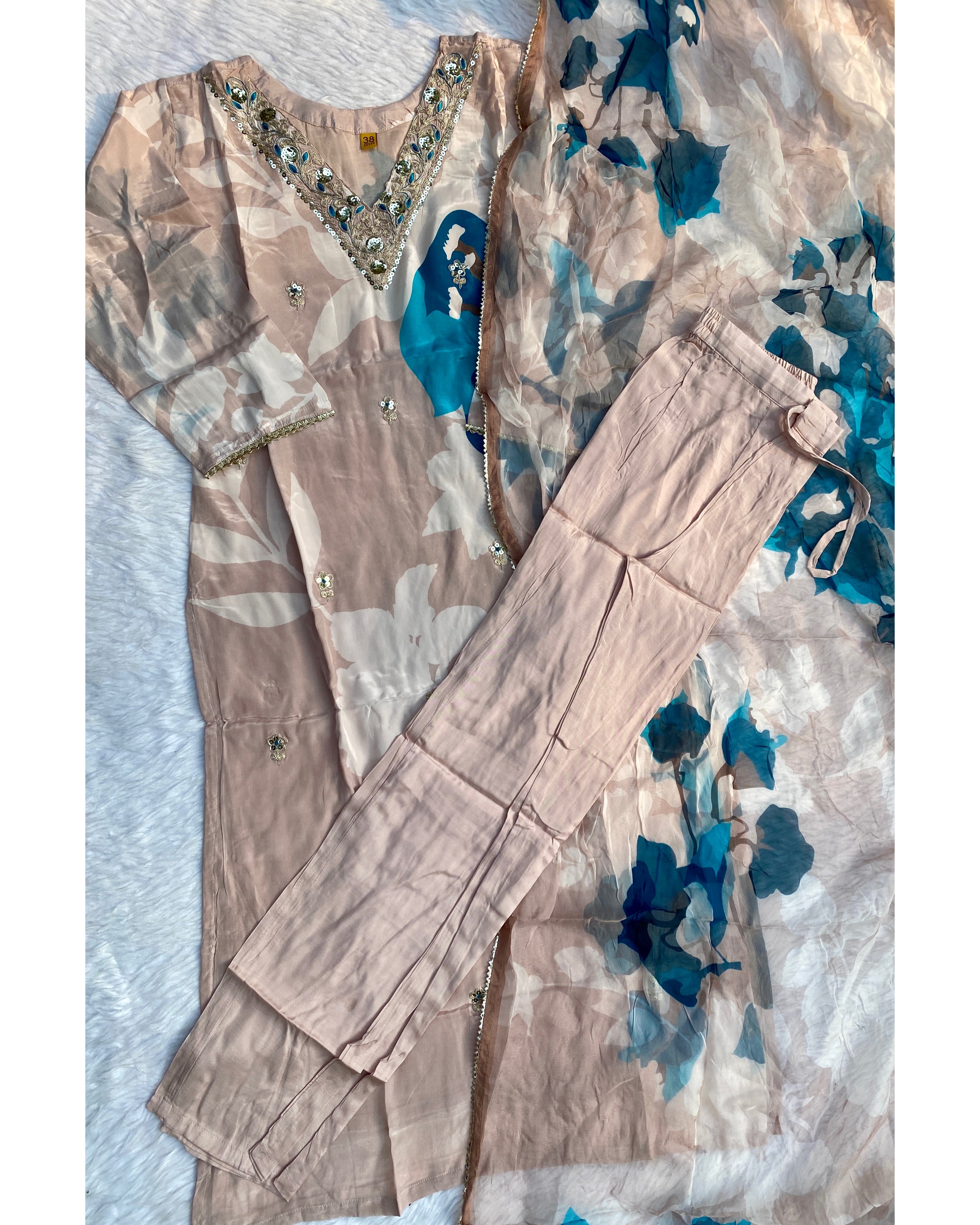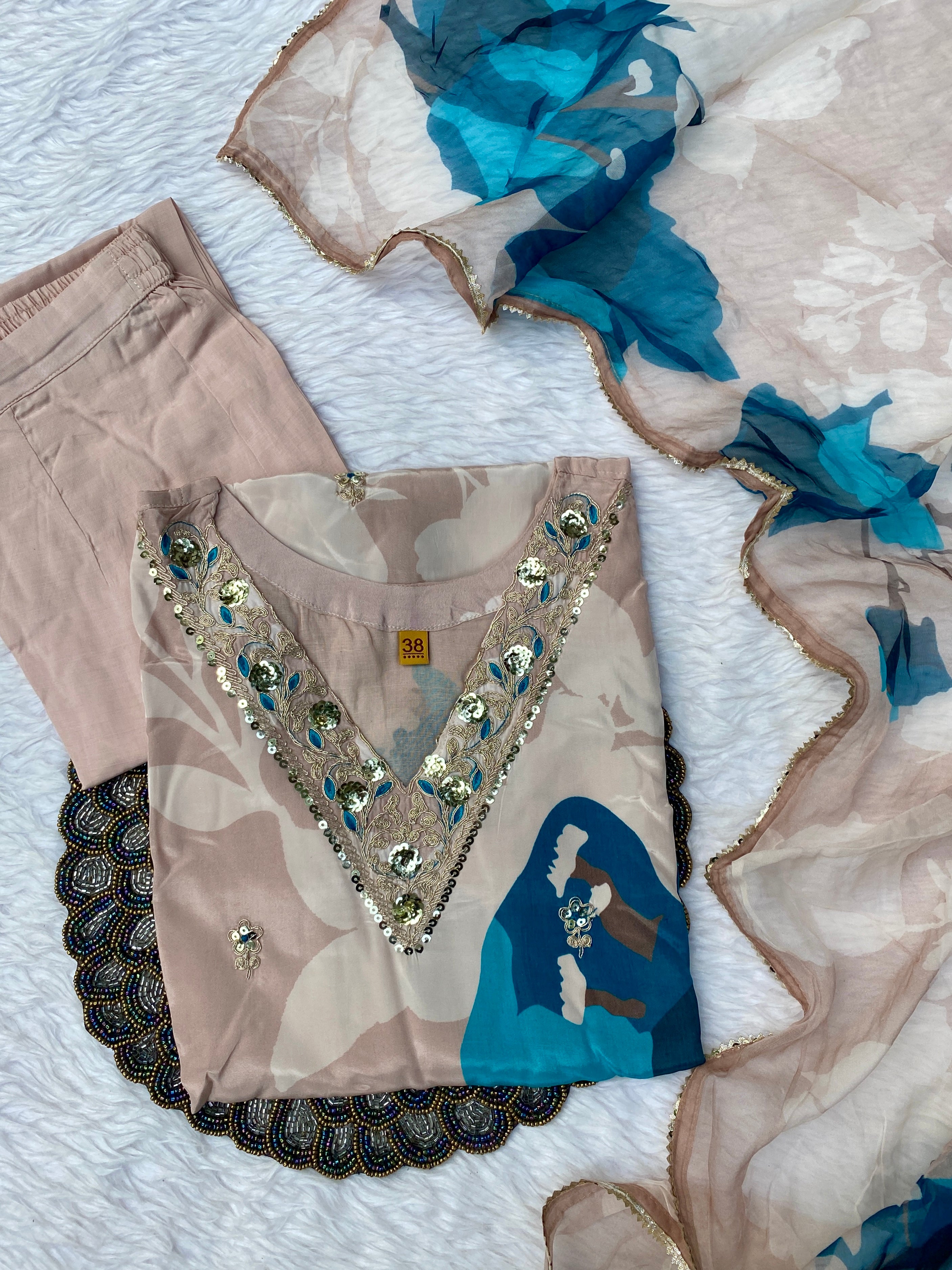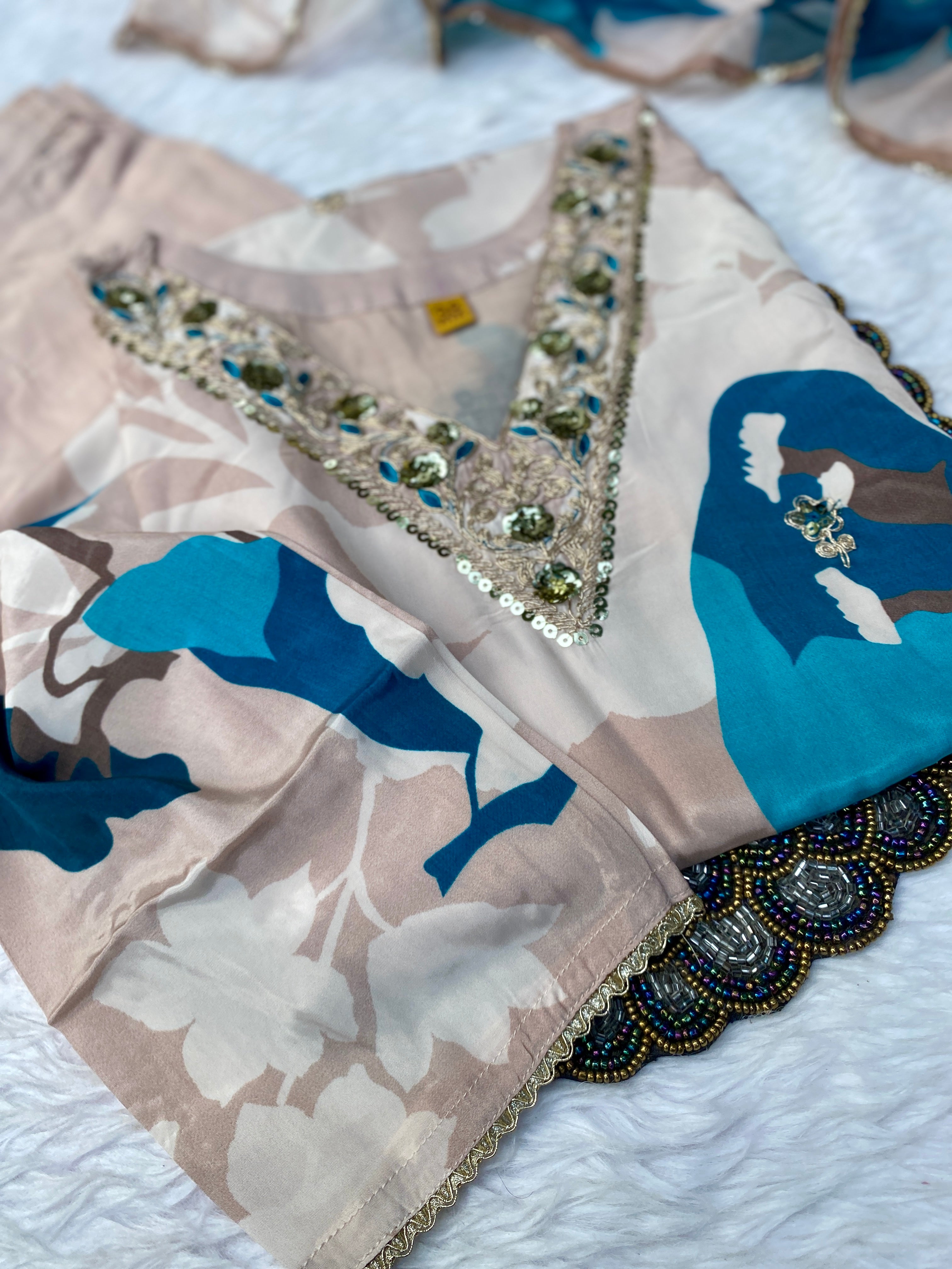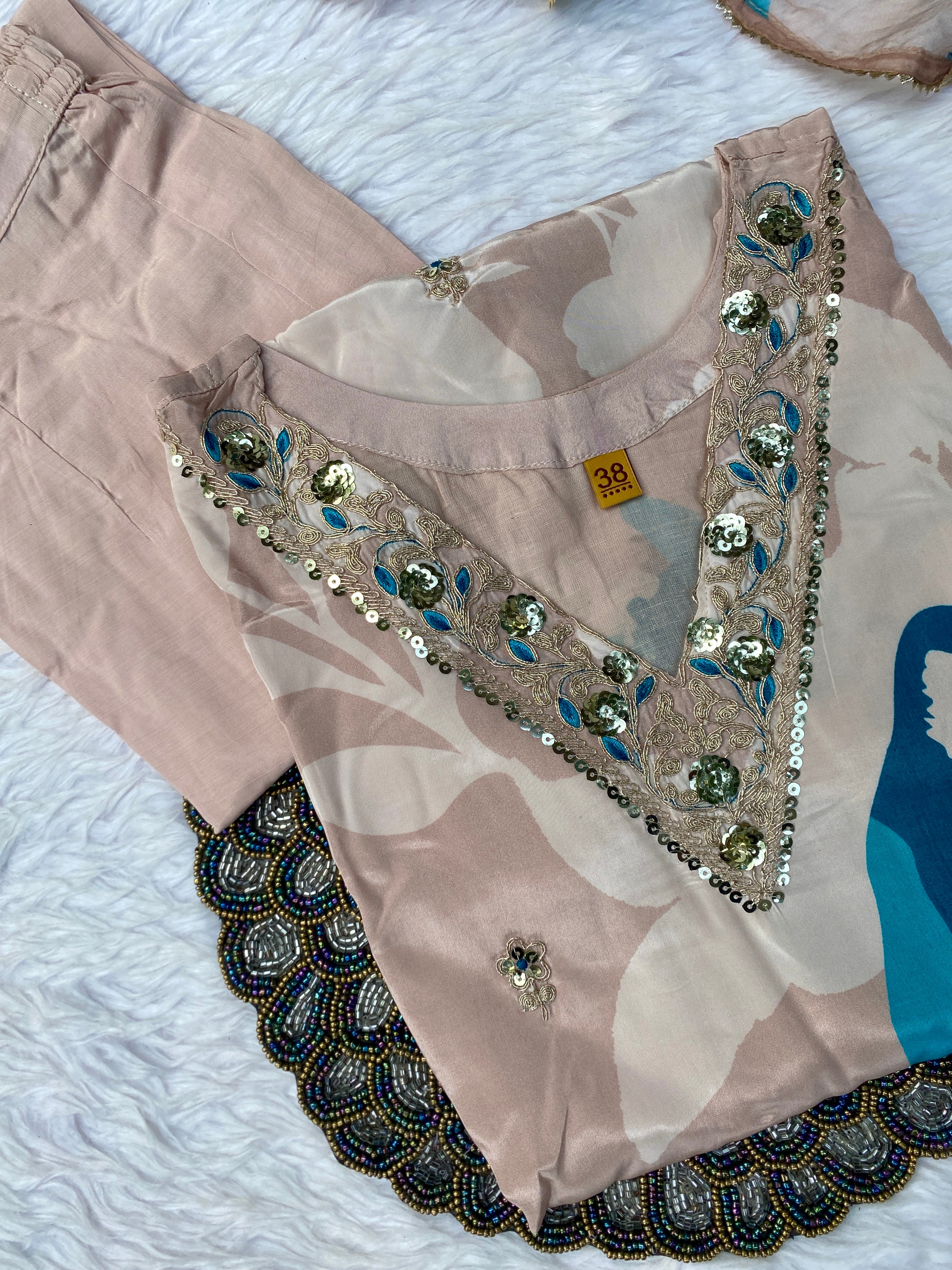 Beautiful Crepe Silk kurti with  Embroidered, Printed & Sequence work all over the top with a long printed organza dupatta and a slik bottom