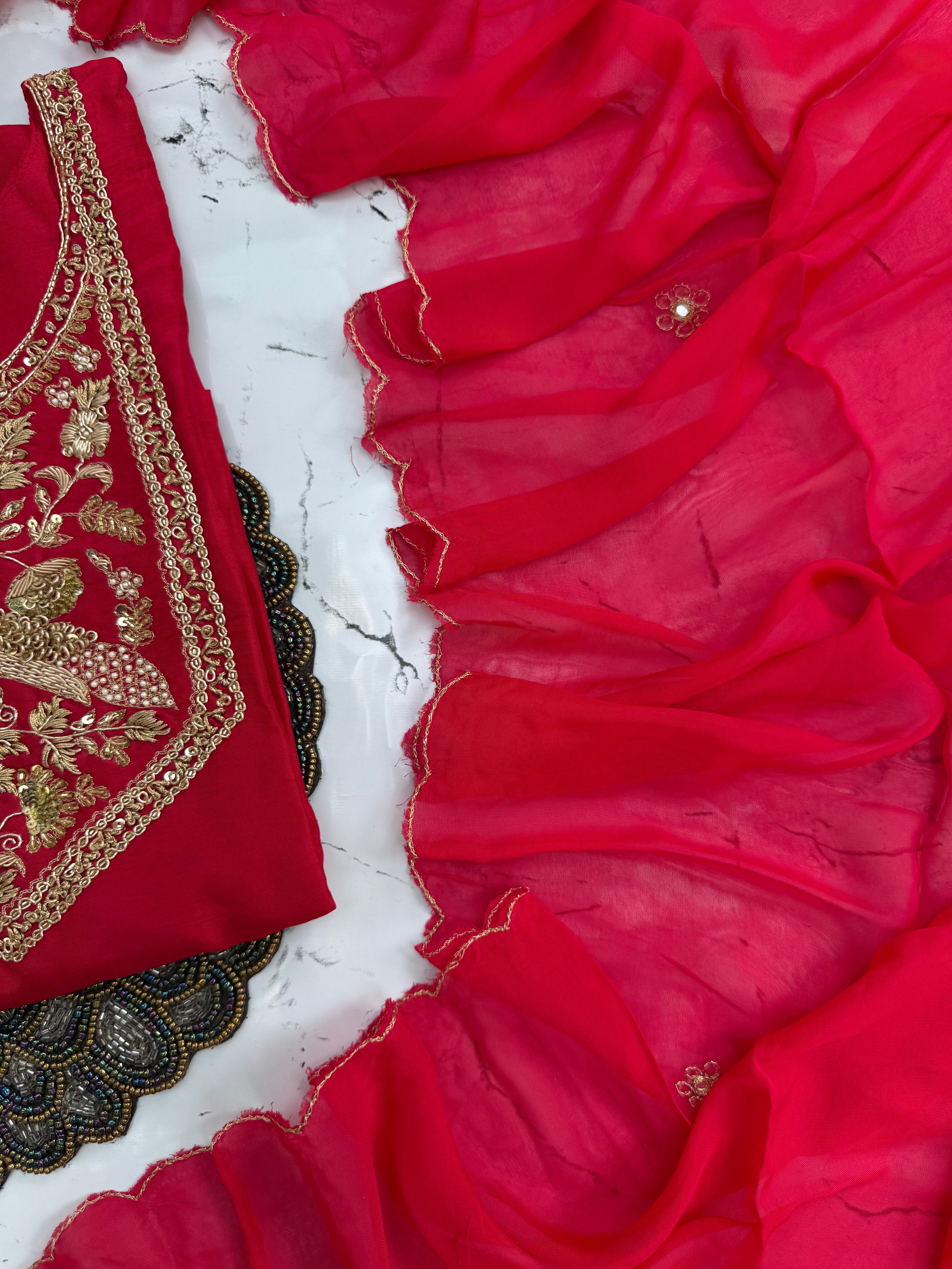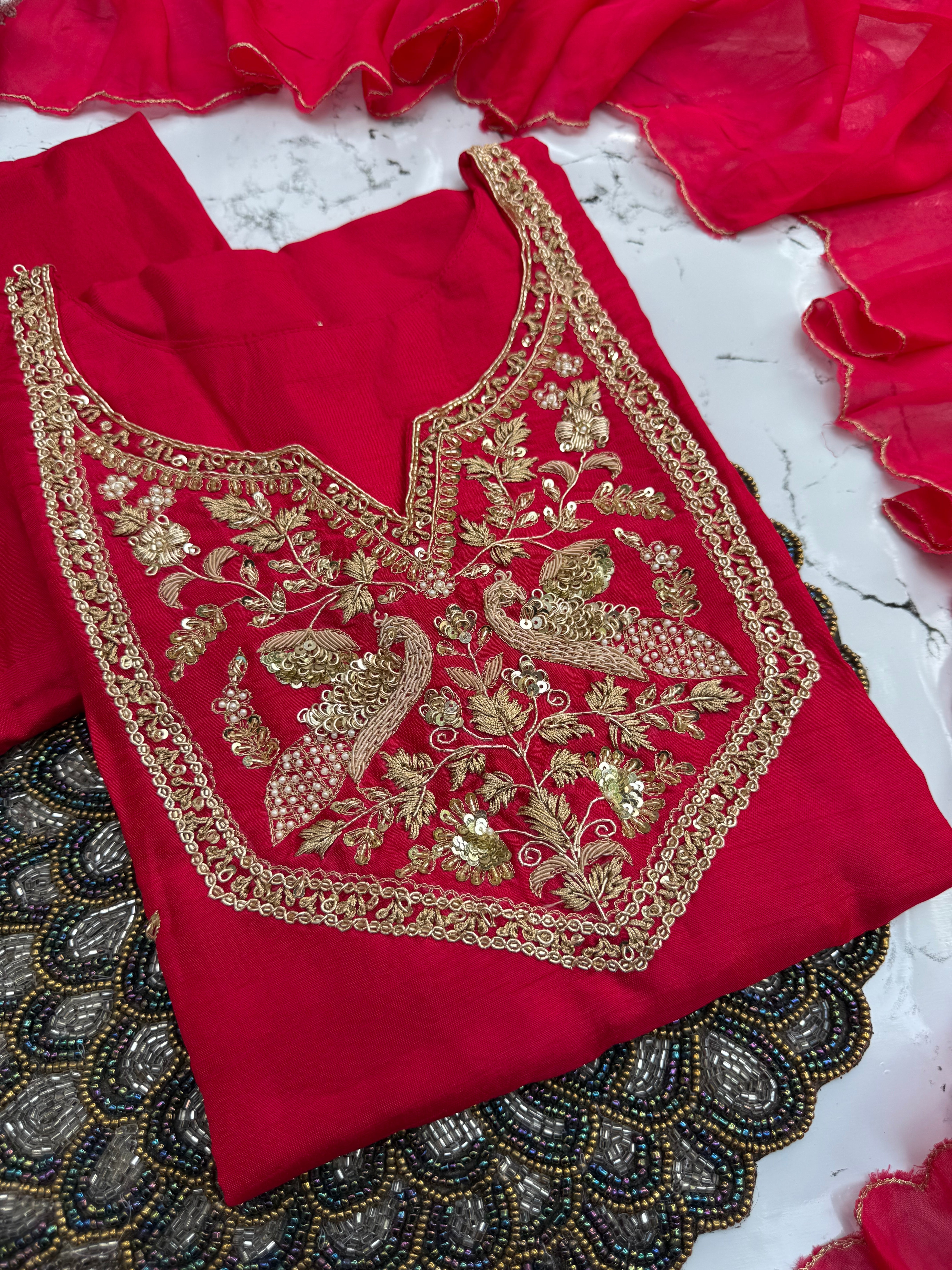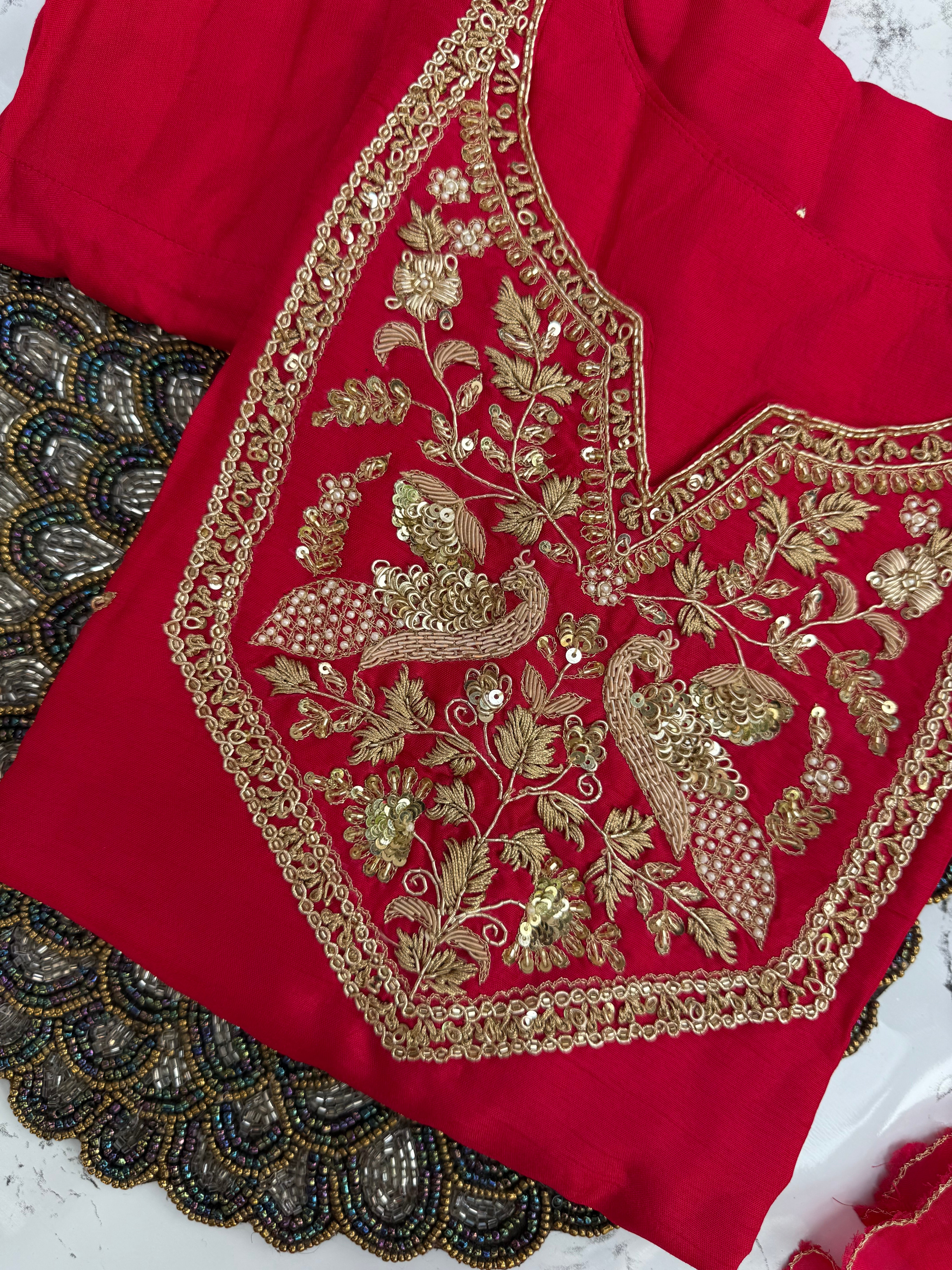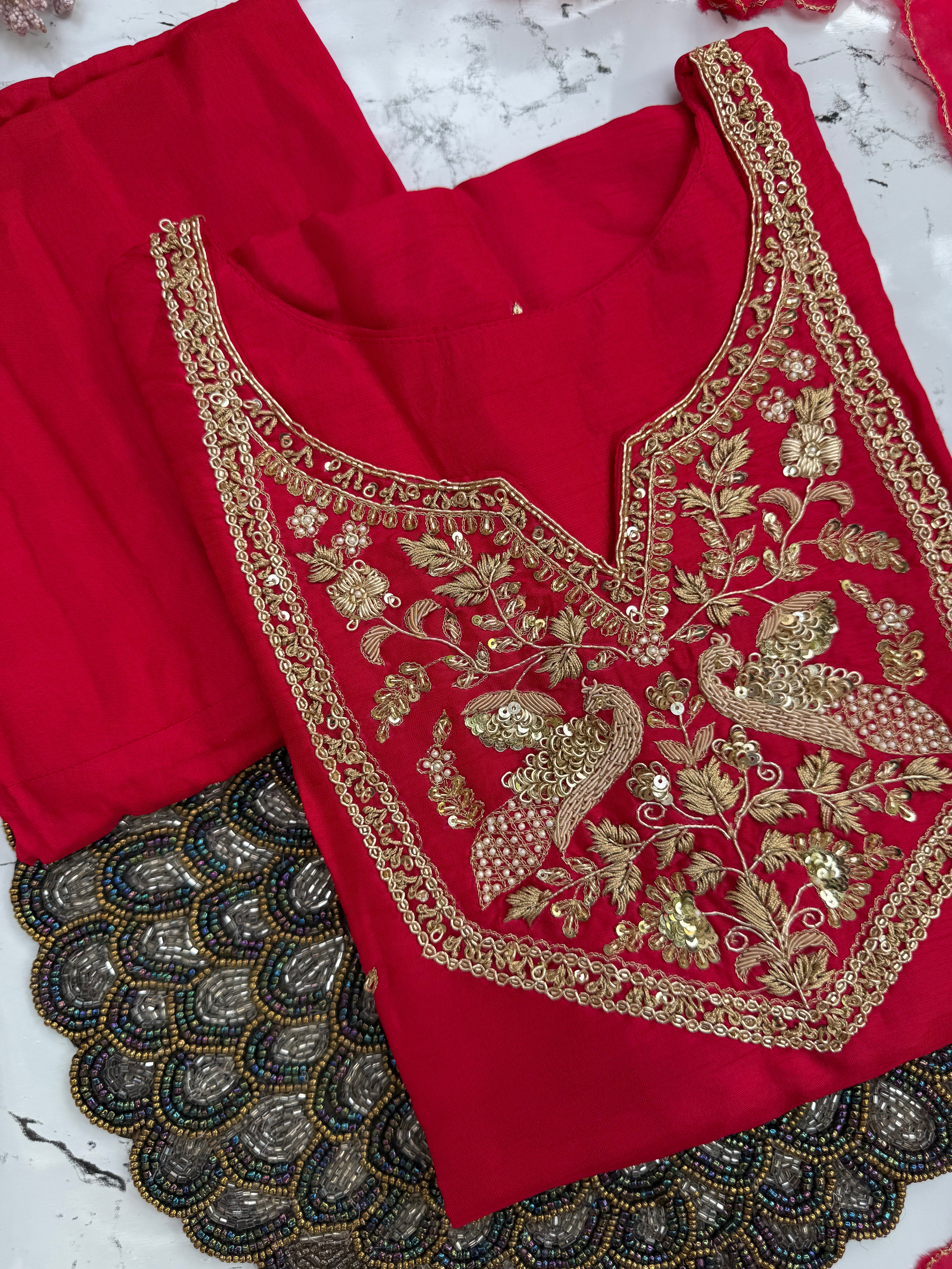 Beautifully handcrafted Tissue silk set with heavy work on the yoke using peacock details with zari, sequence & threadwork and a heavy worked scalloped organza dupatta with a plane silk bottom