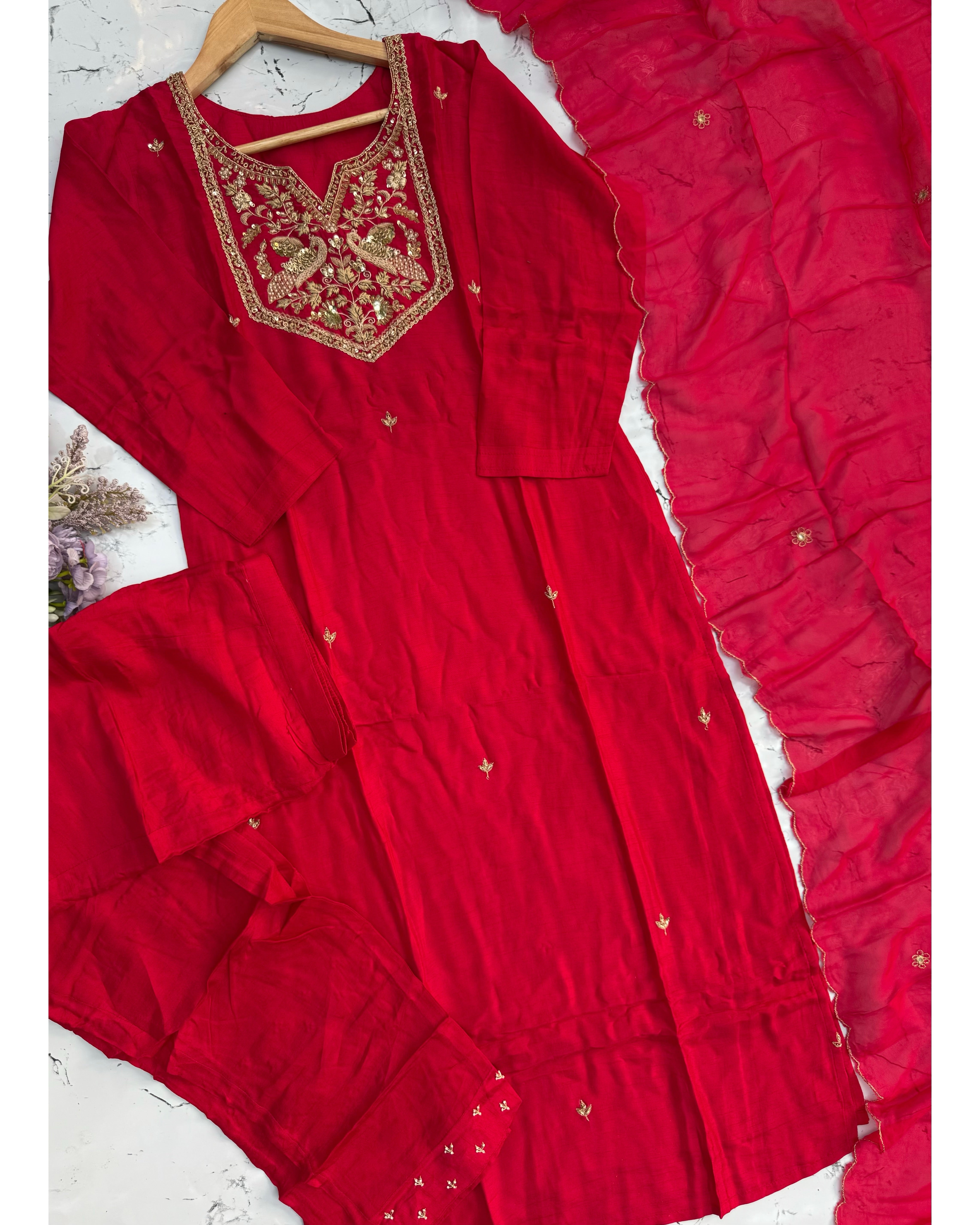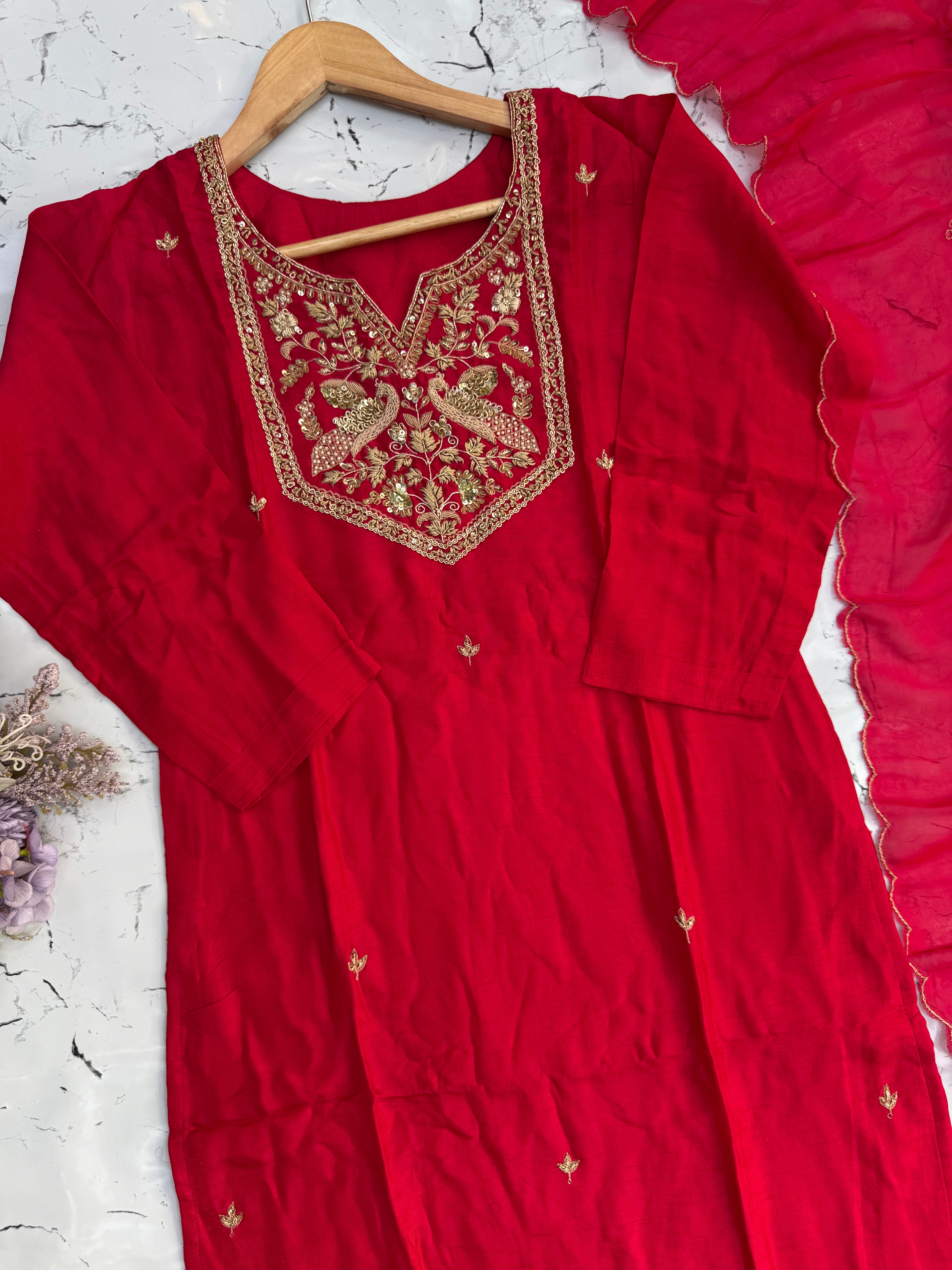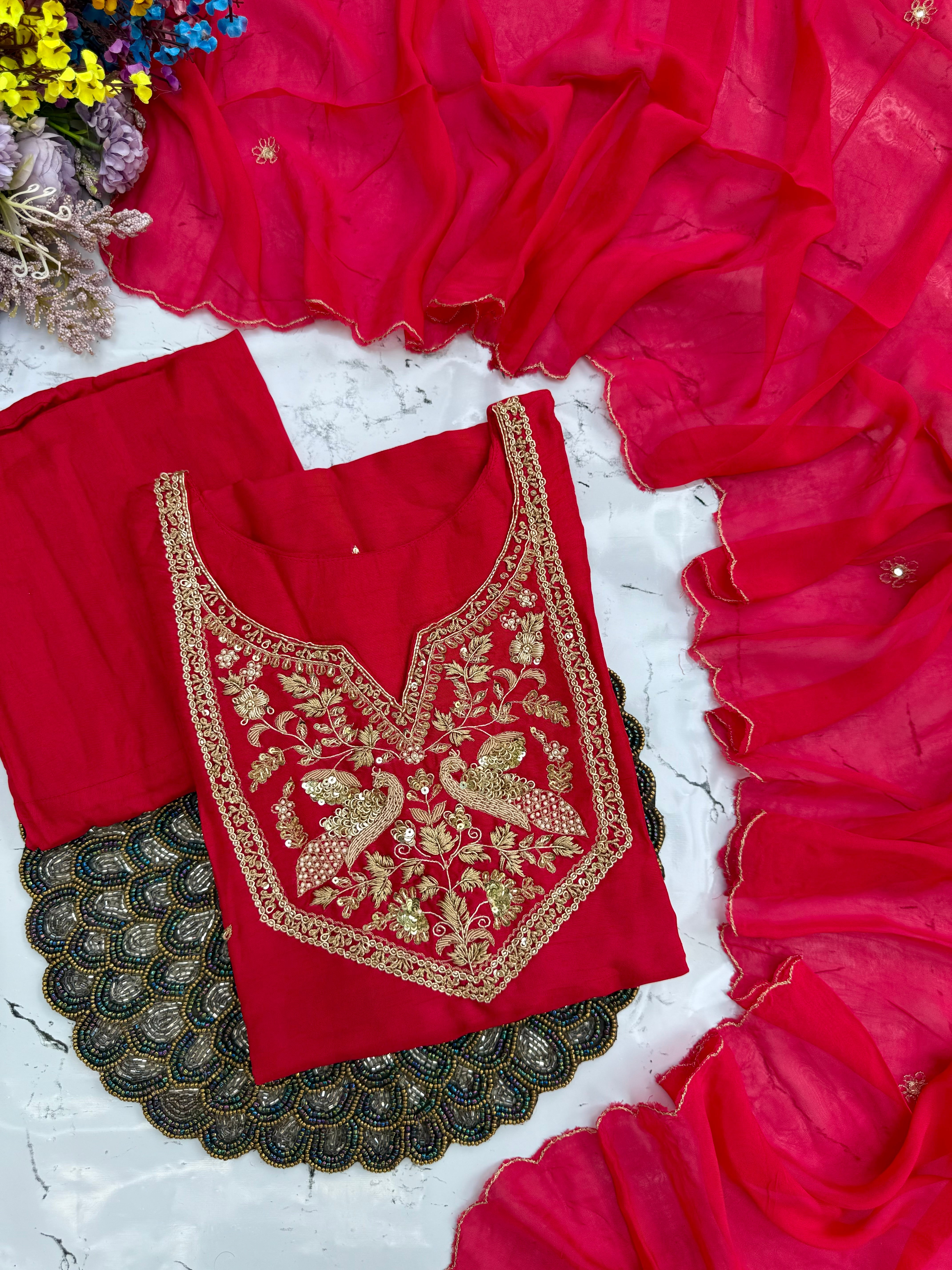 Beautifully handcrafted Tissue silk set with heavy work on the yoke using peacock details with zari, sequence & threadwork and a heavy worked scalloped organza dupatta with a plane silk bottom