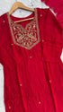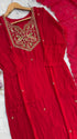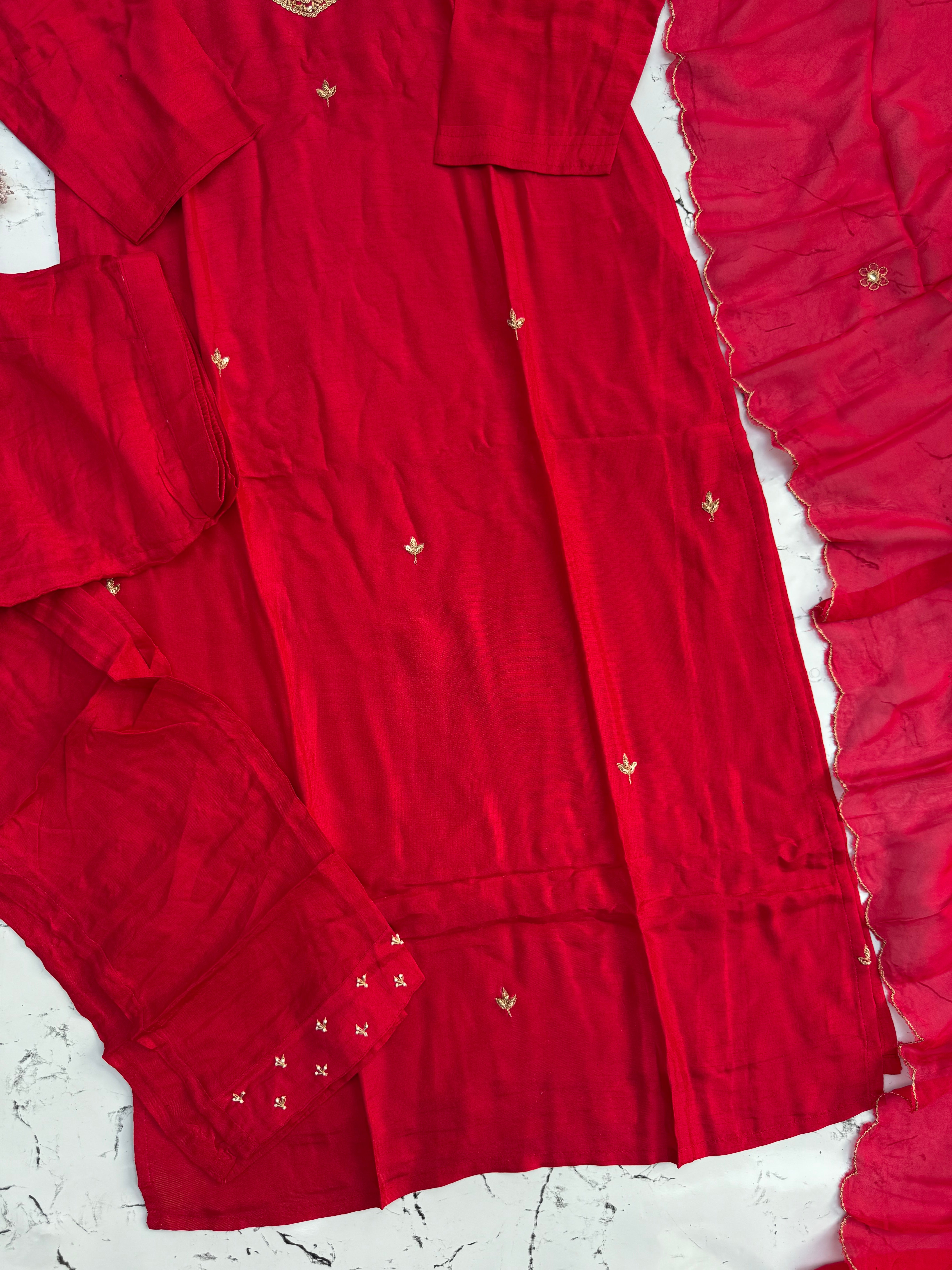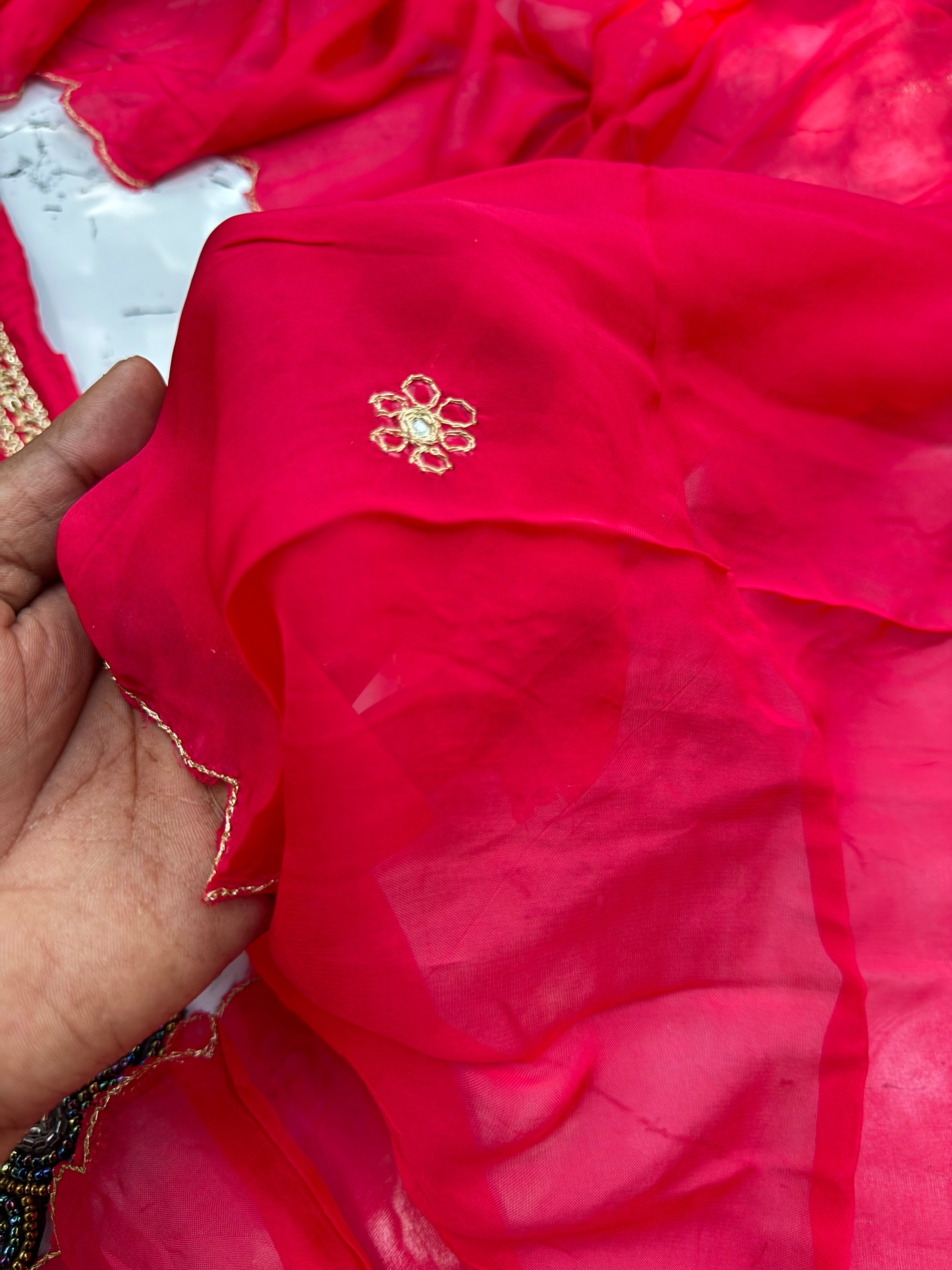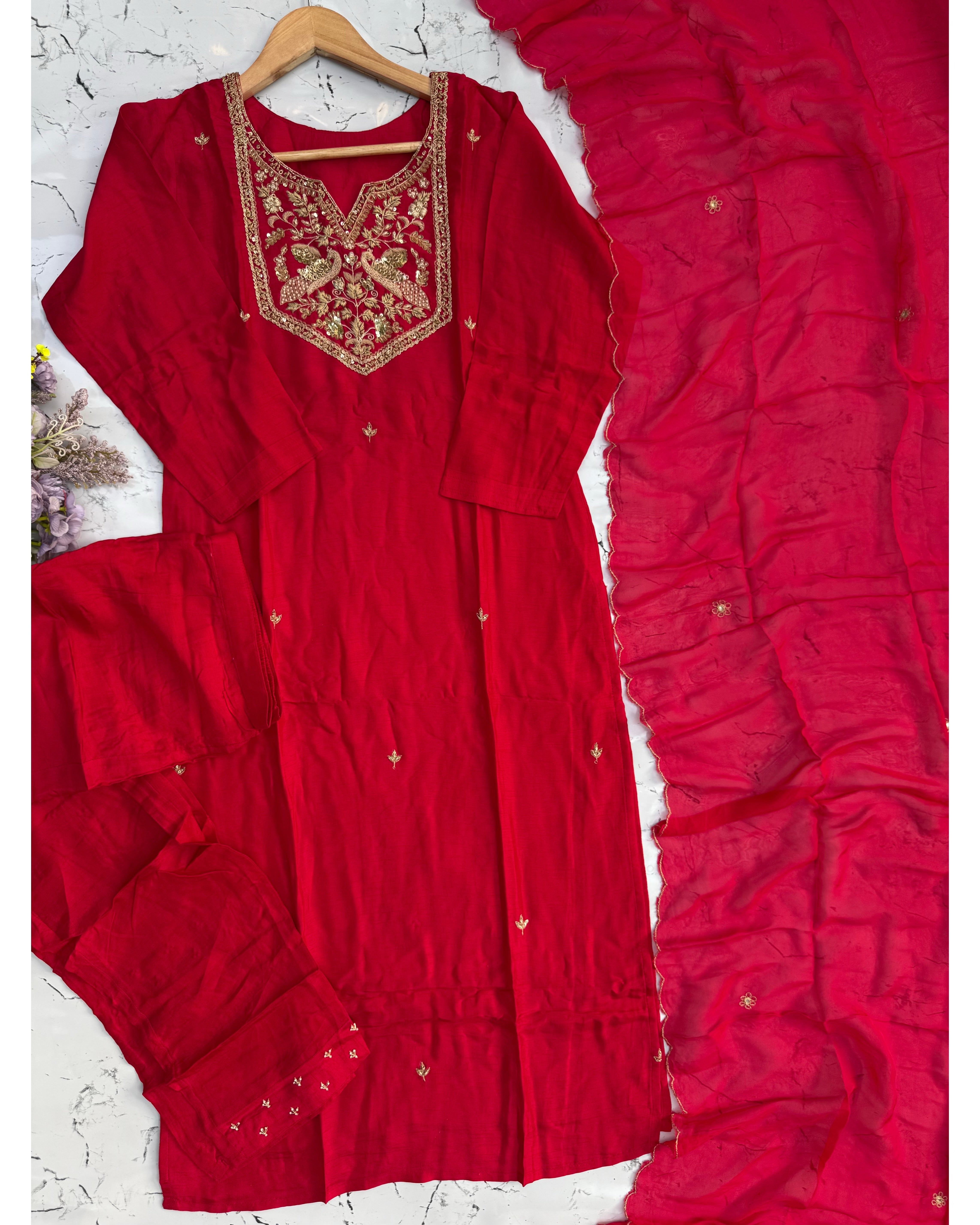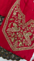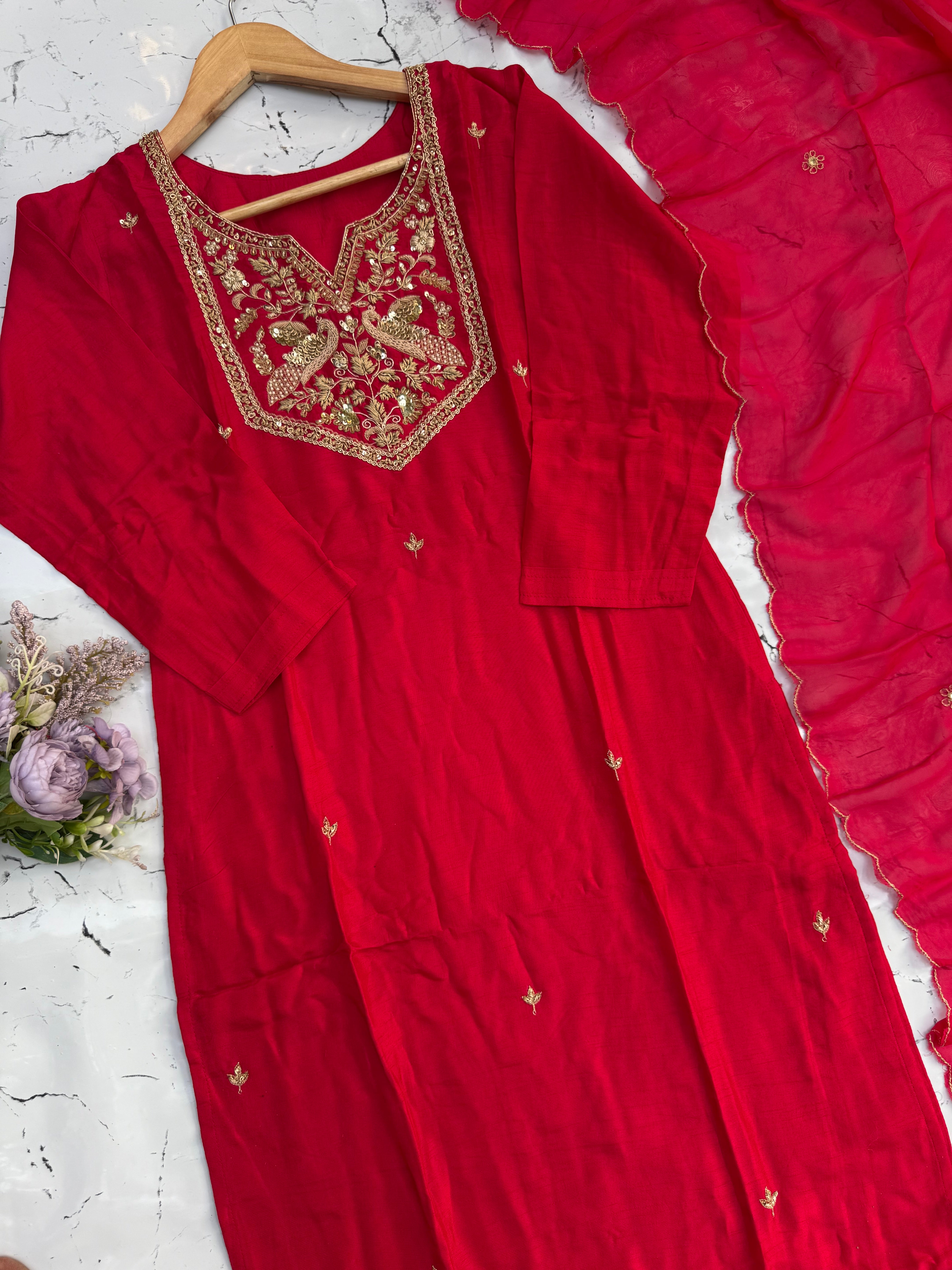 Beautifully handcrafted Tissue silk set with heavy work on the yoke using peacock details with zari, sequence & threadwork and a heavy worked scalloped organza dupatta with a plane silk bottom