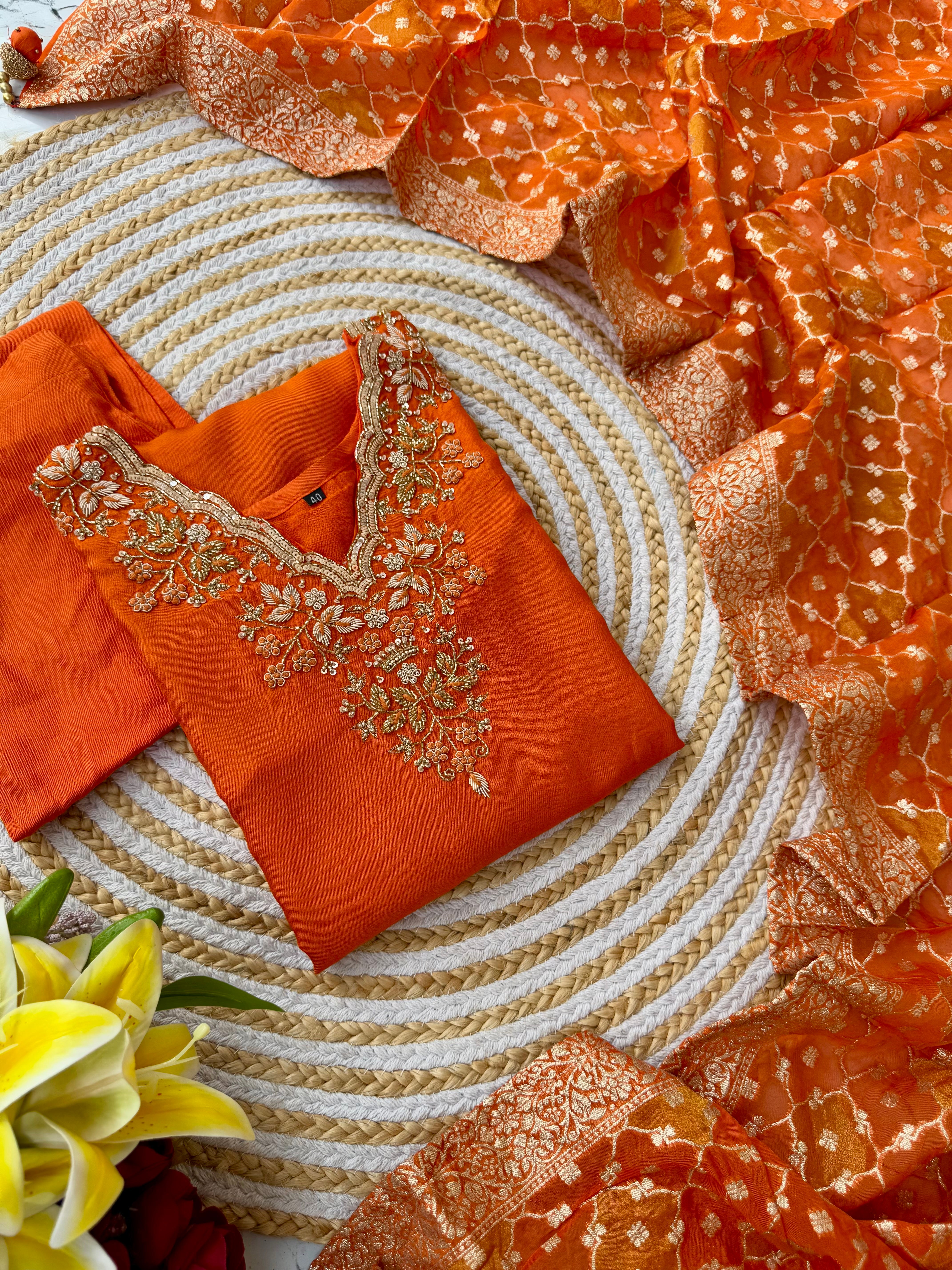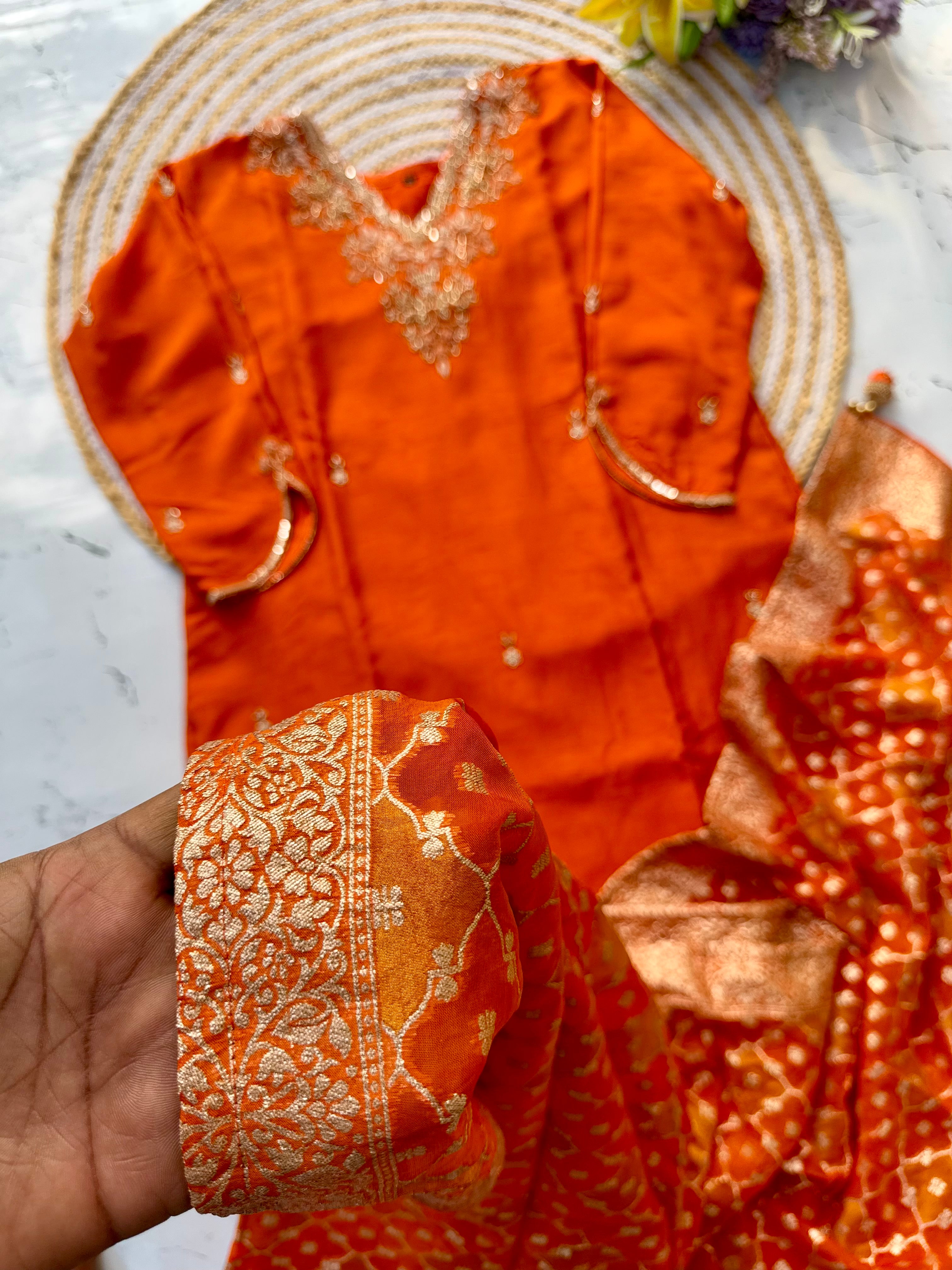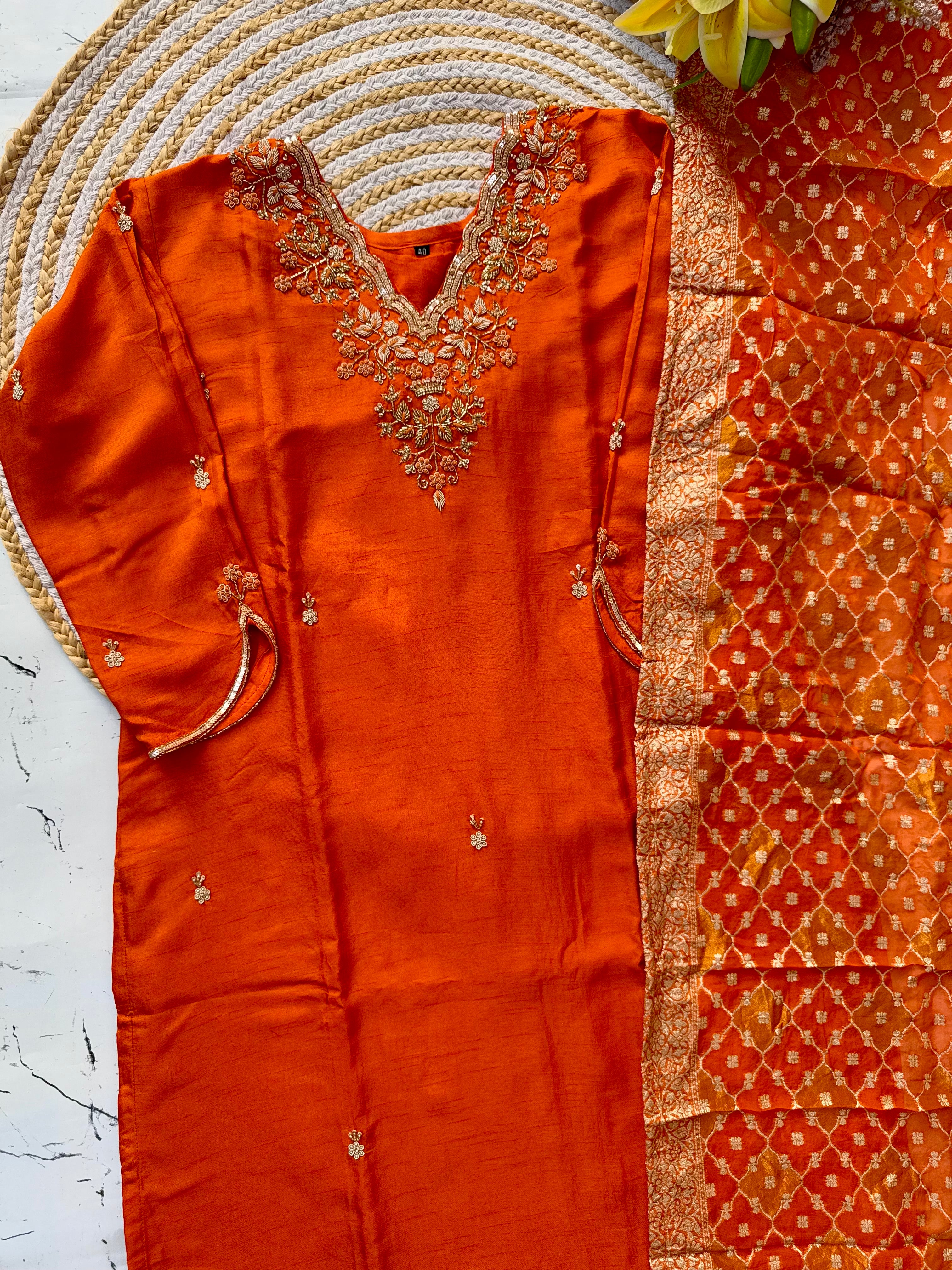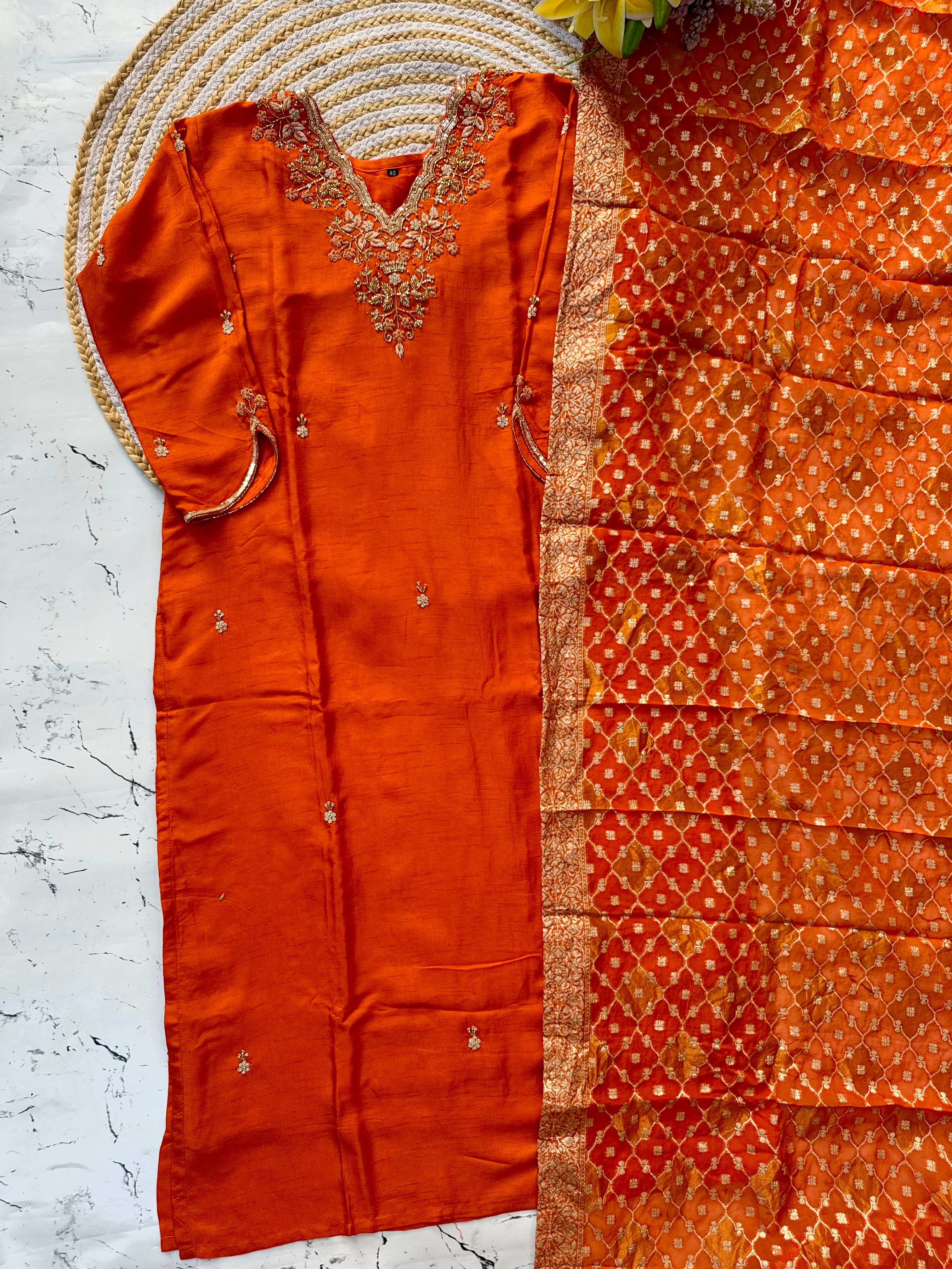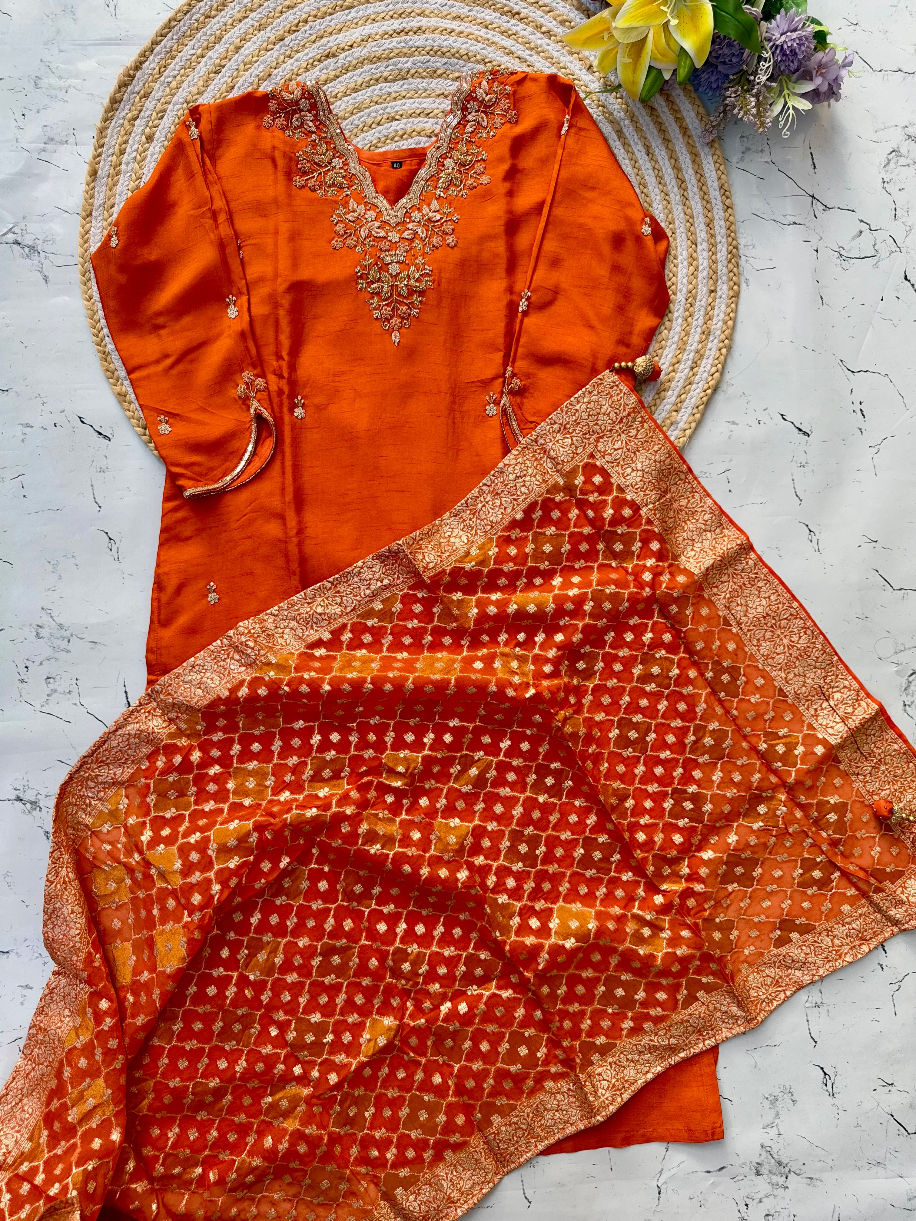 Dola silk kurti dupatta bottom set with handwork on the yoke ,sleeves & back of the kurta with a beautiful contrast Printed Banarsi dupatta with a dola silk bottom with work
