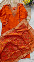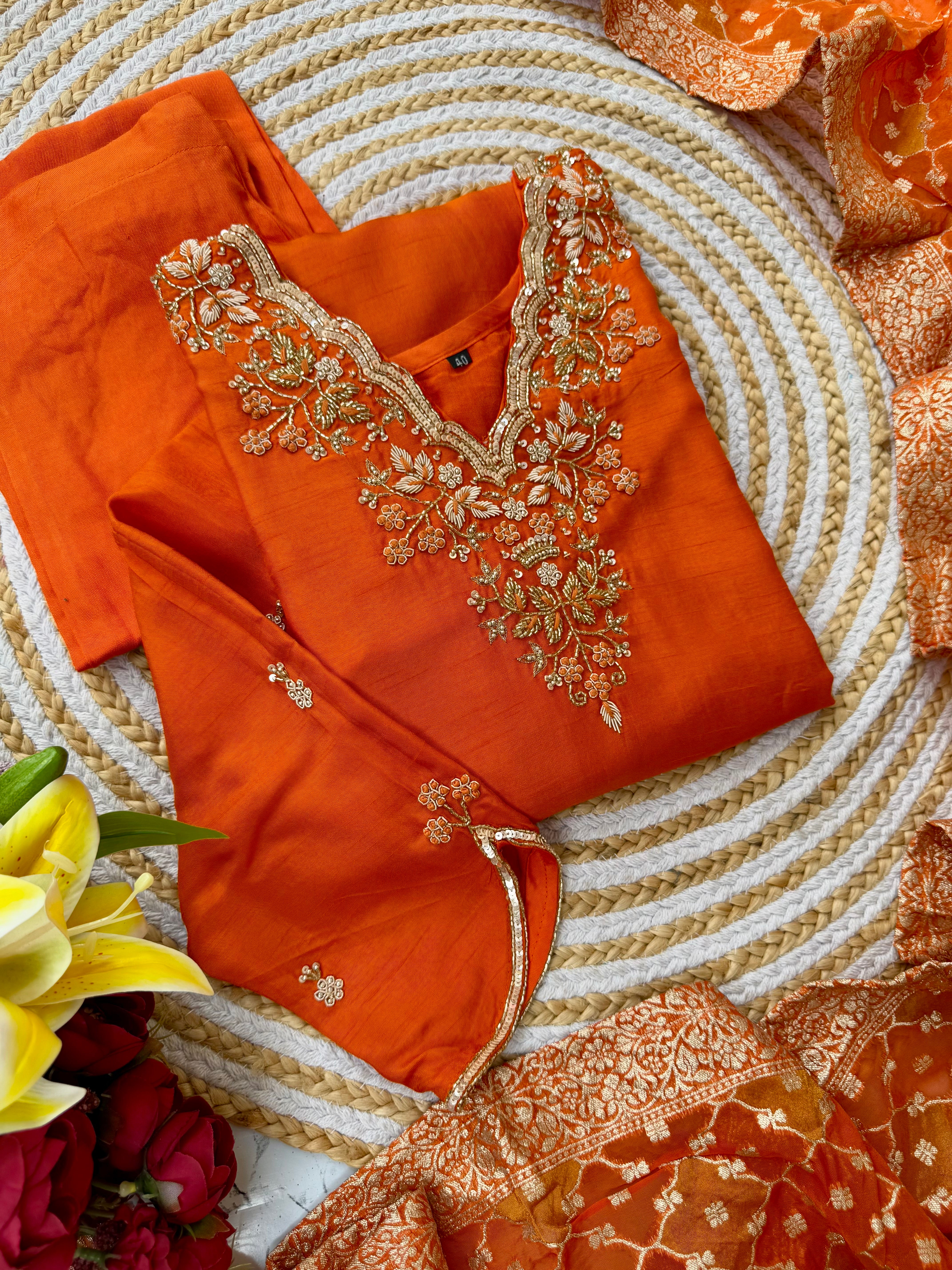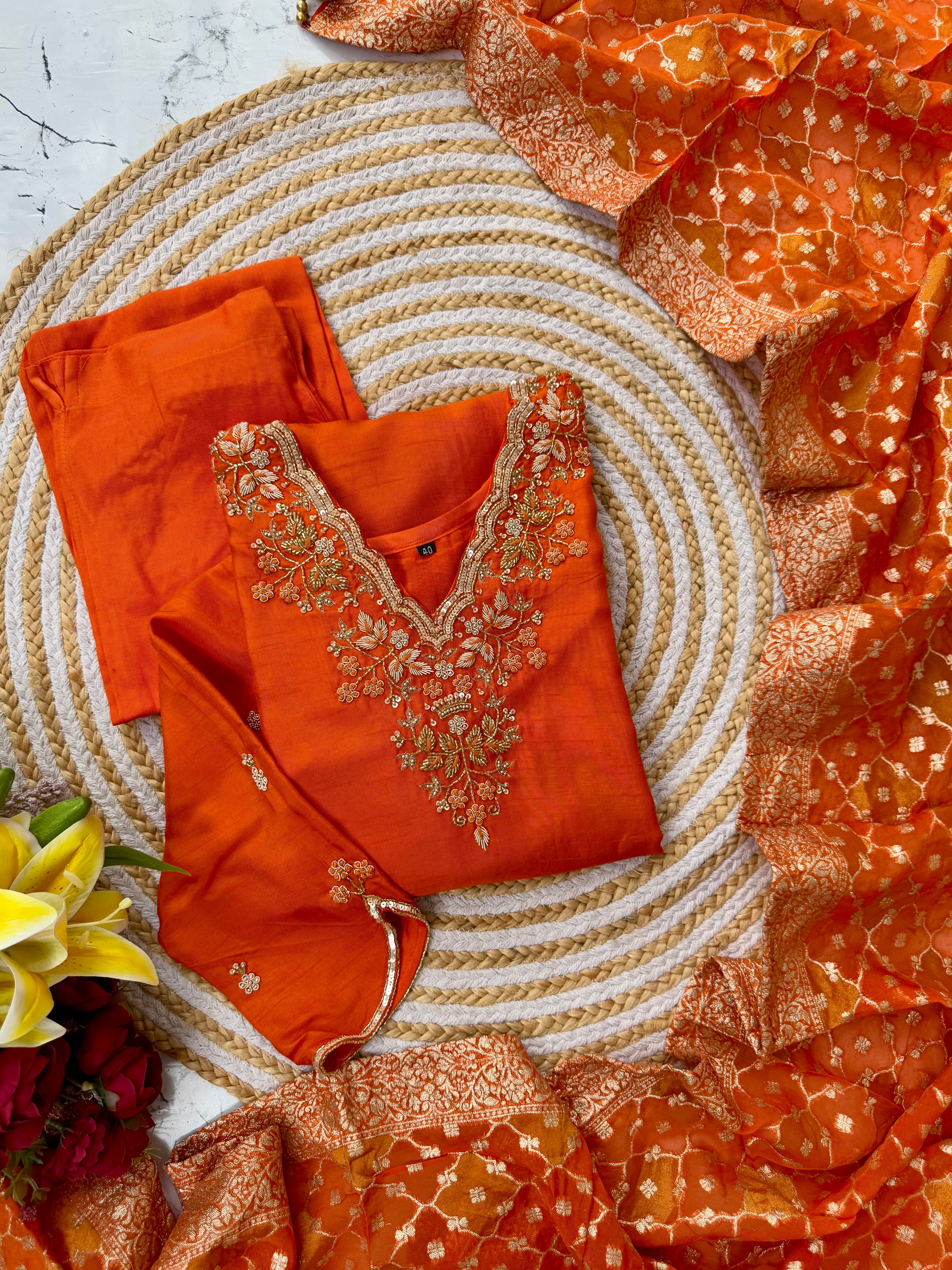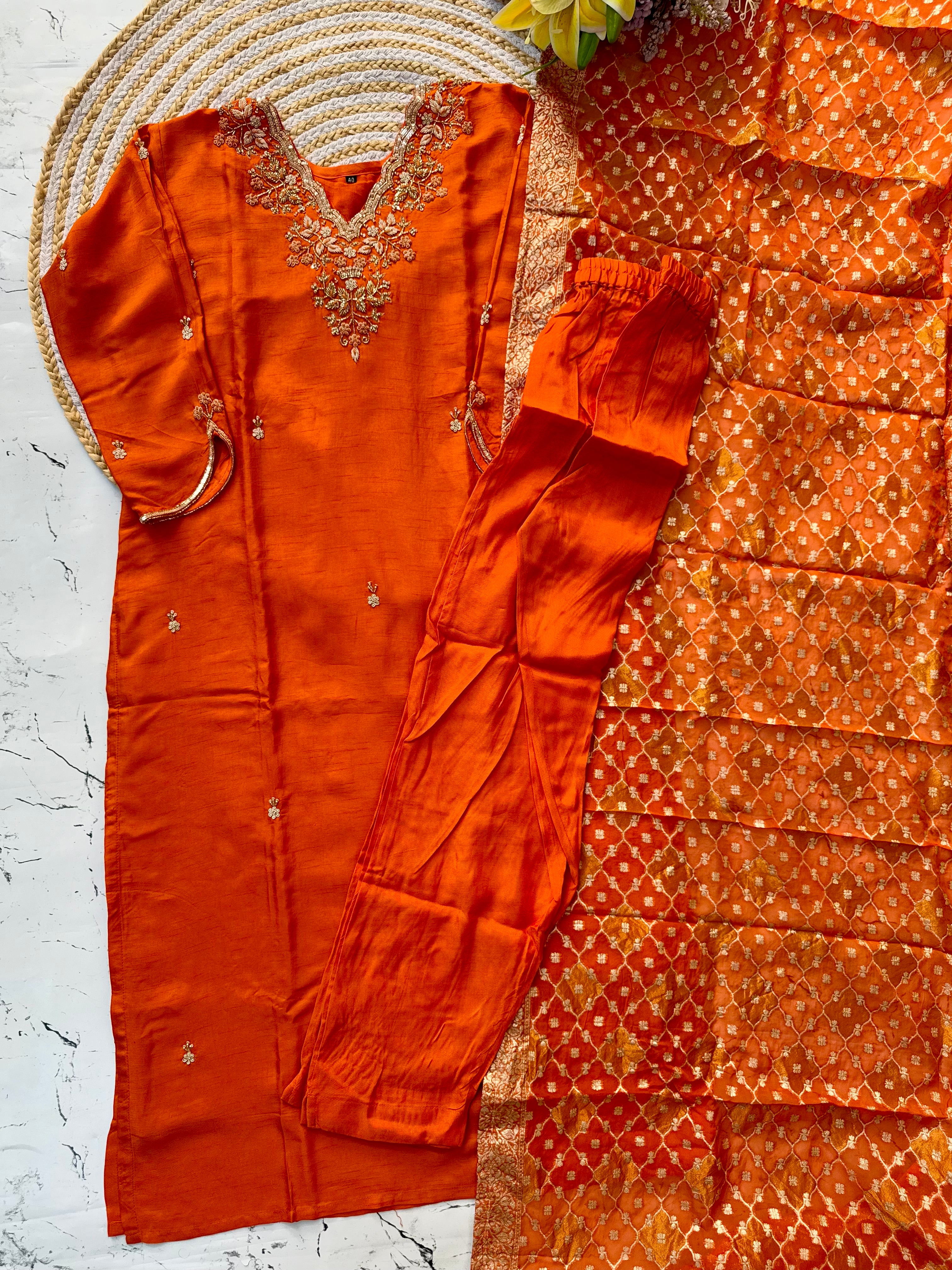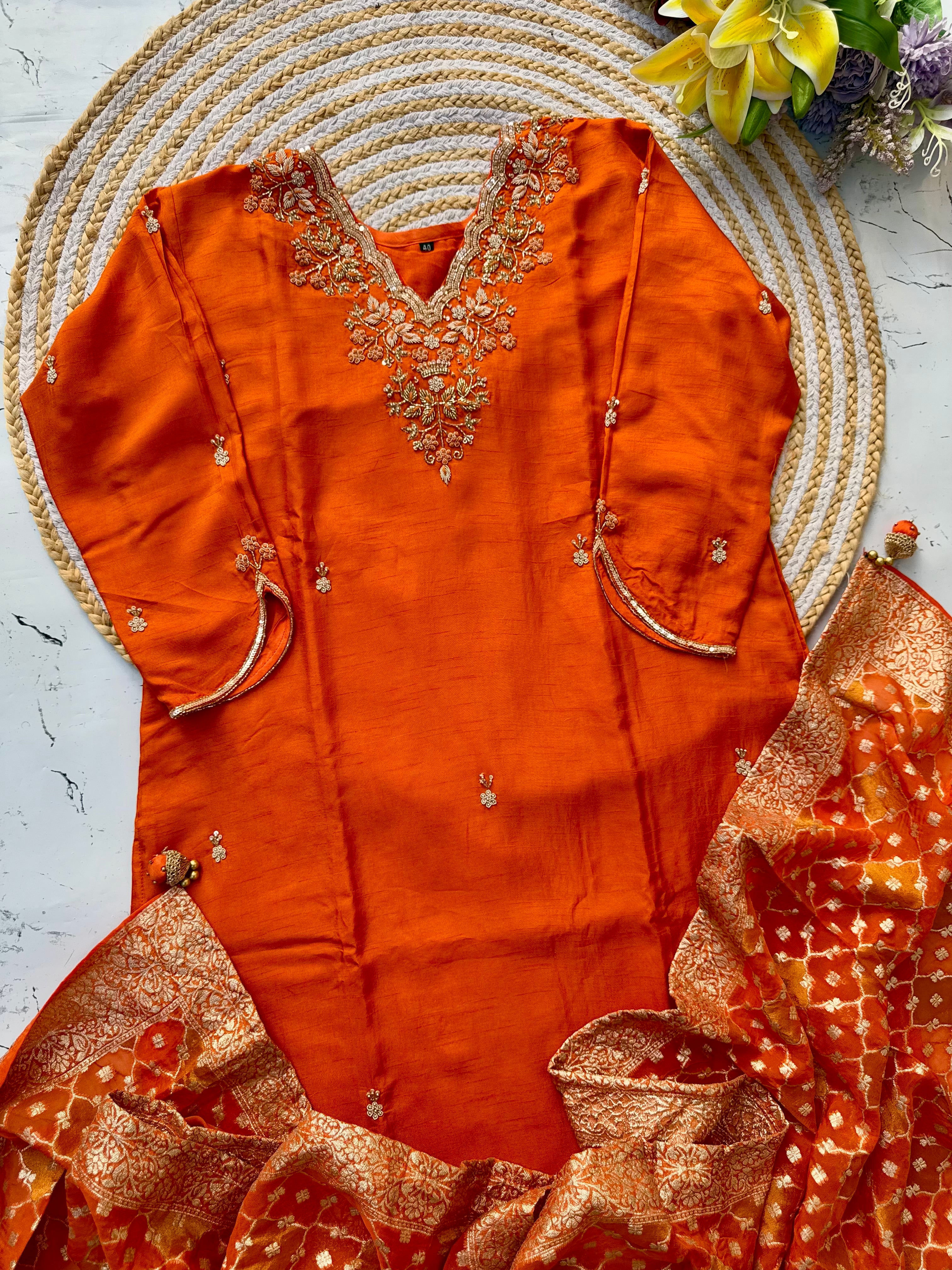 Dola silk kurti dupatta bottom set with handwork on the yoke ,sleeves & back of the kurta with a beautiful contrast Printed Banarsi dupatta with a dola silk bottom with work