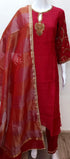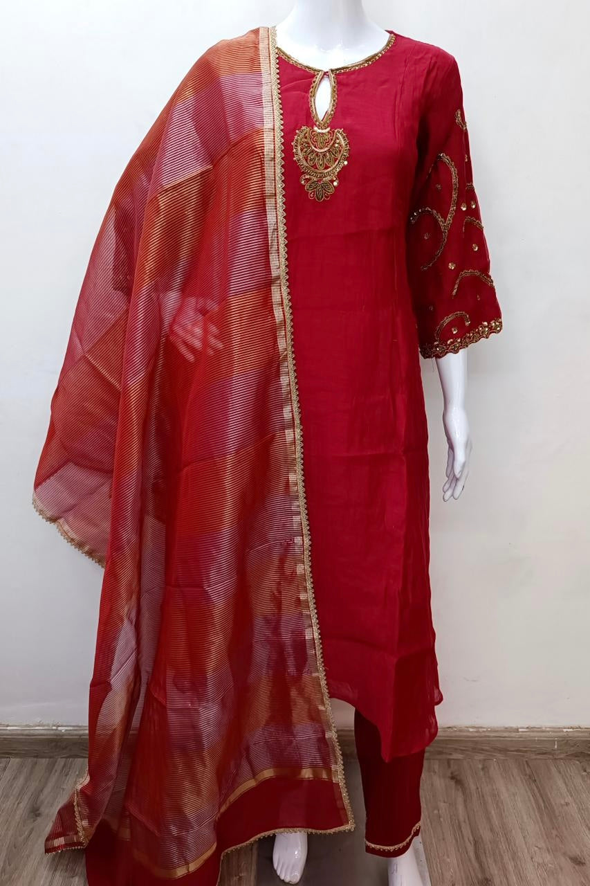 Elevate your ethnic wardrobe with this elegant Mul Chanderi straight kurta set. Designed in a rich deep red color, the kurta features intricate handwork embroidery on the neckline and sleeves, paired with a matching bottom. The set is completed with a contrast organza dupatta adorned with golden woven stripes and a delicate lace border, making it perfect for festive occasions, weddings, and parties