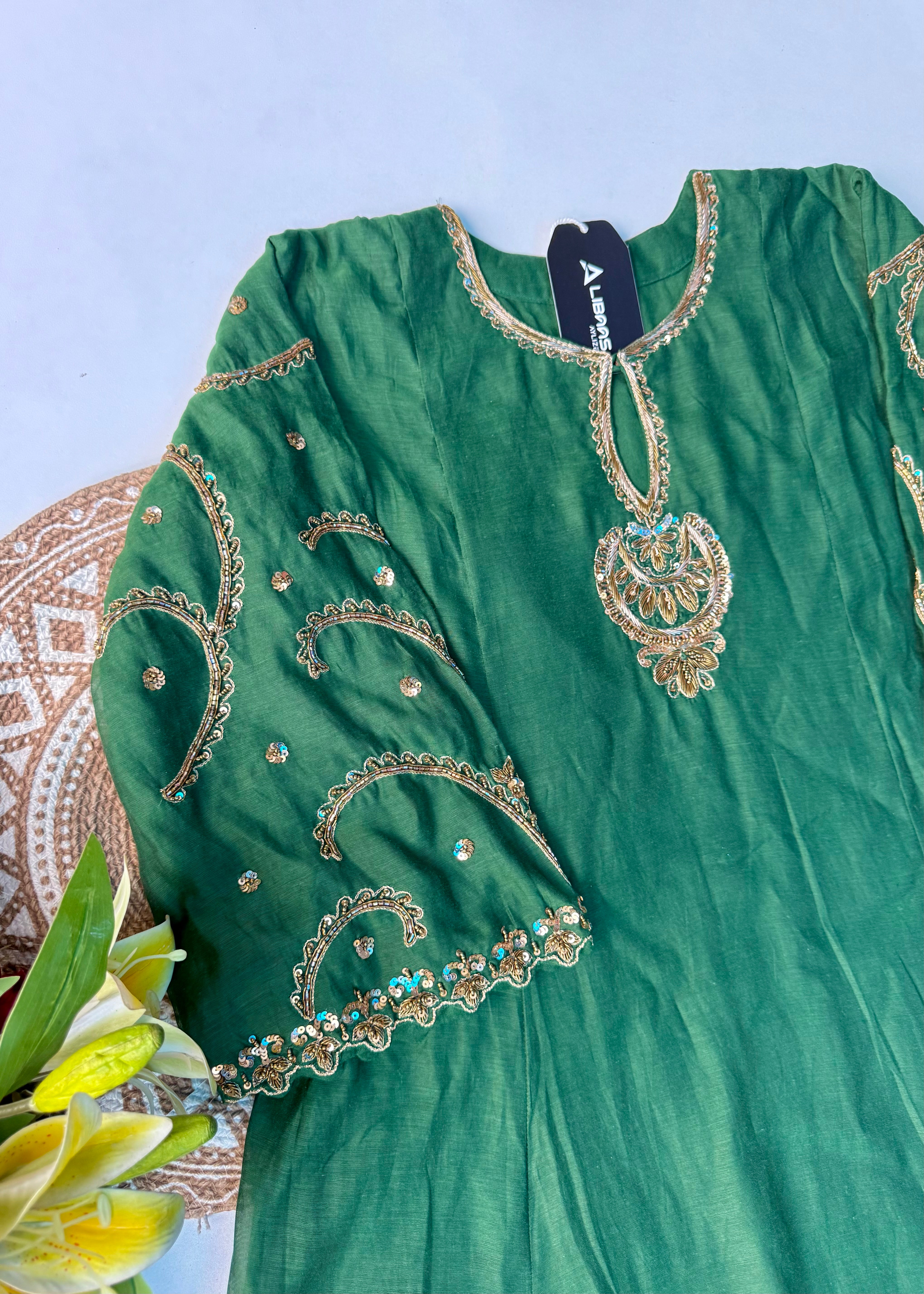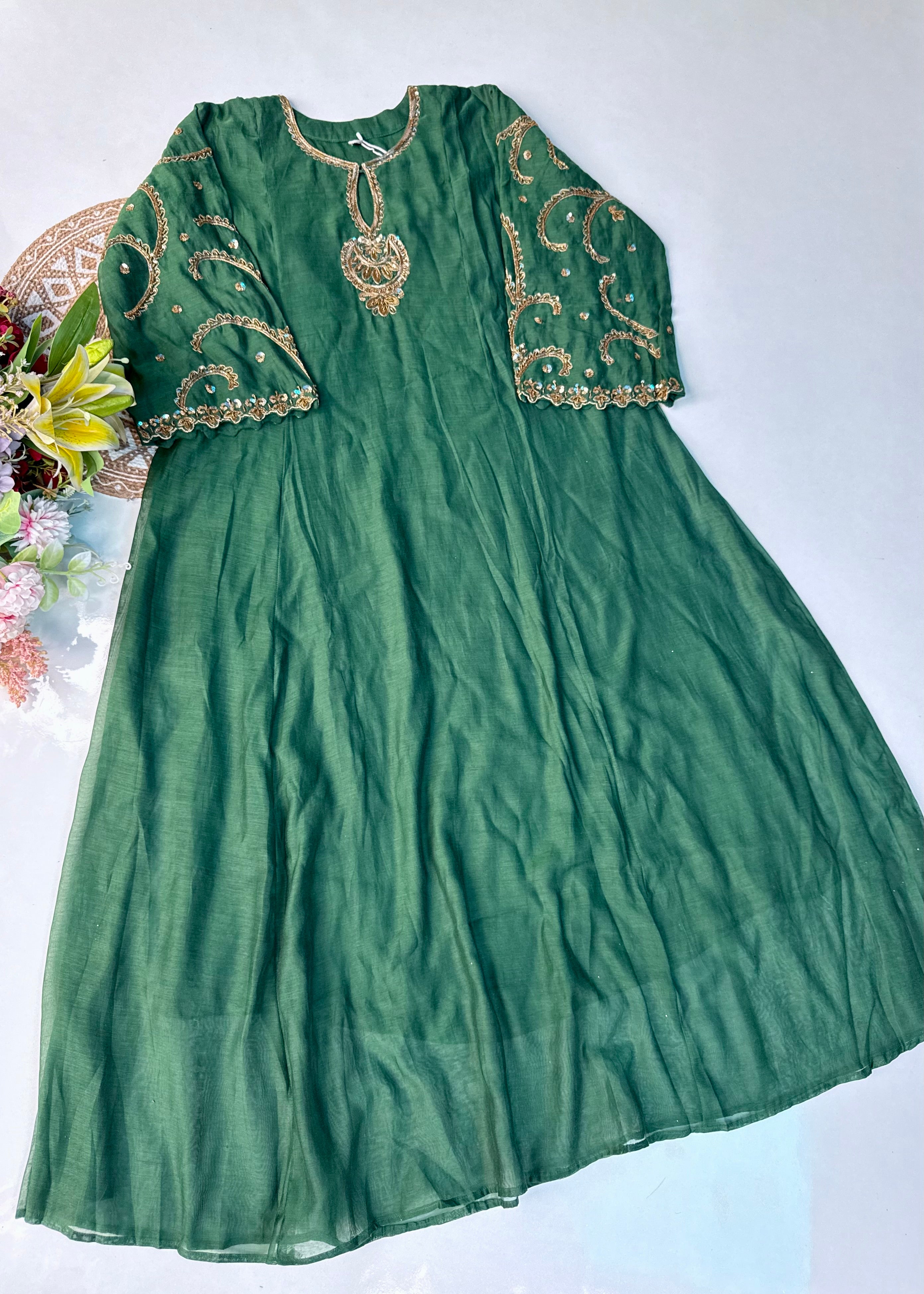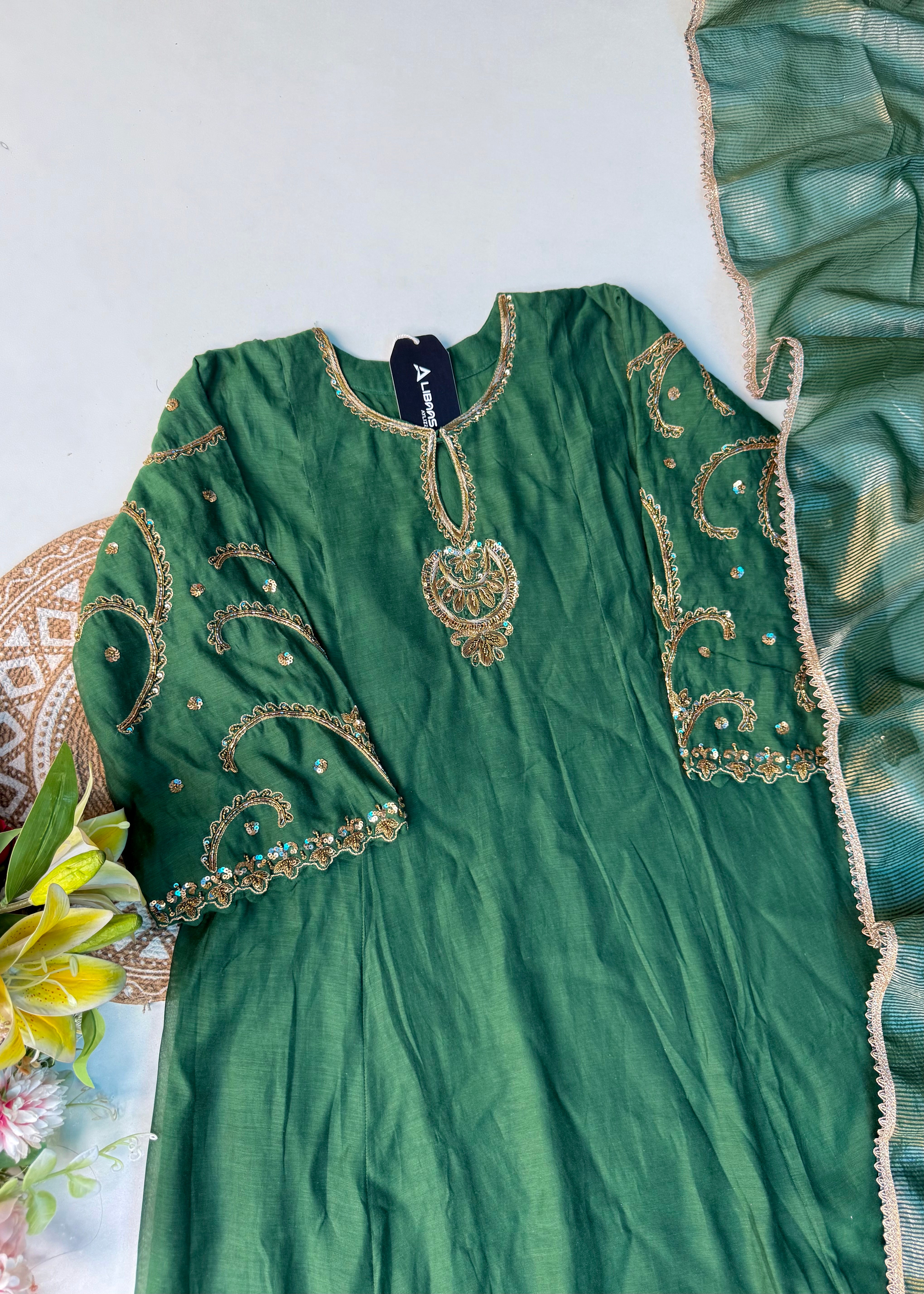 - Top: Mul Chanderi with intricate handwork on the front panel & sleeves