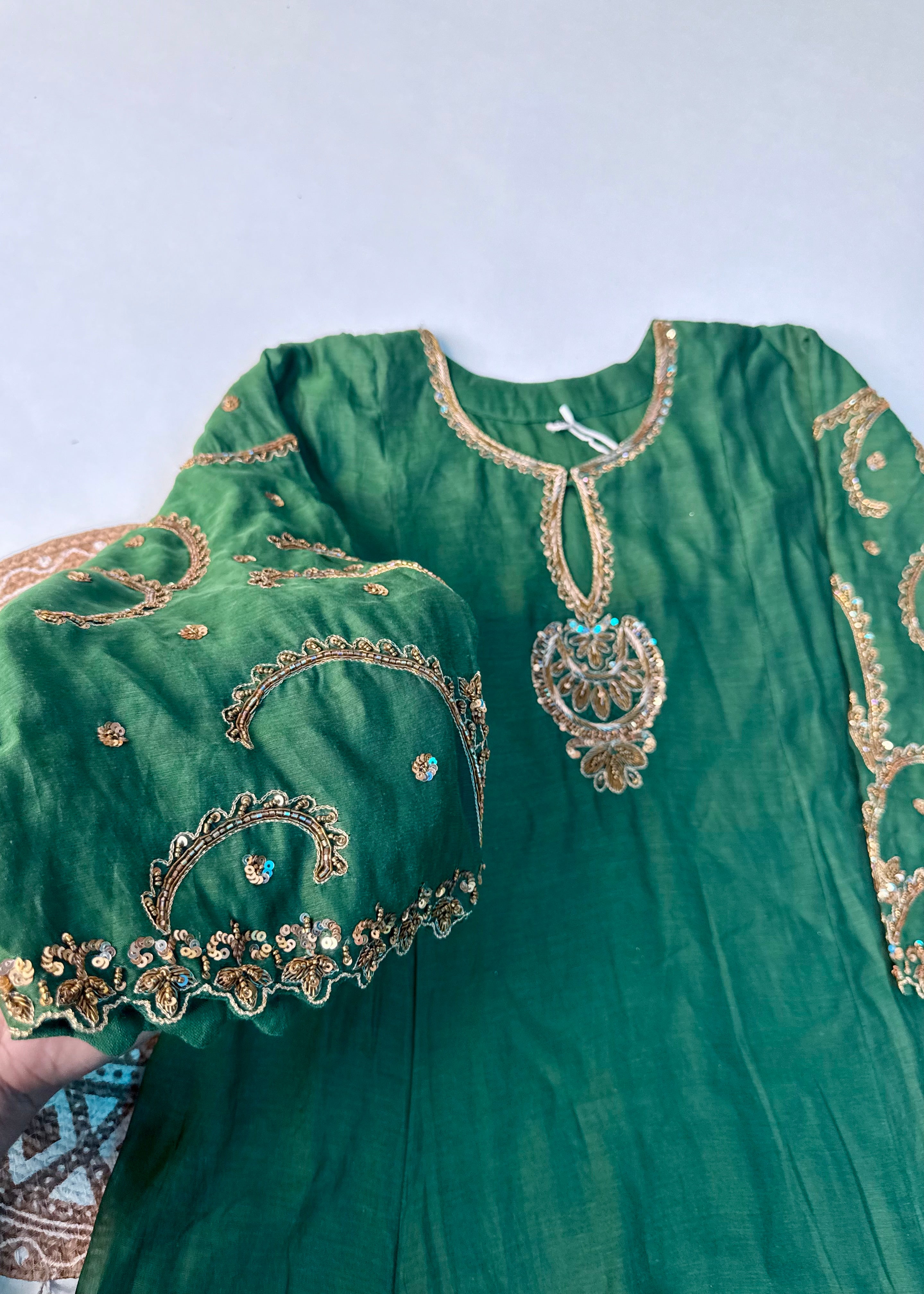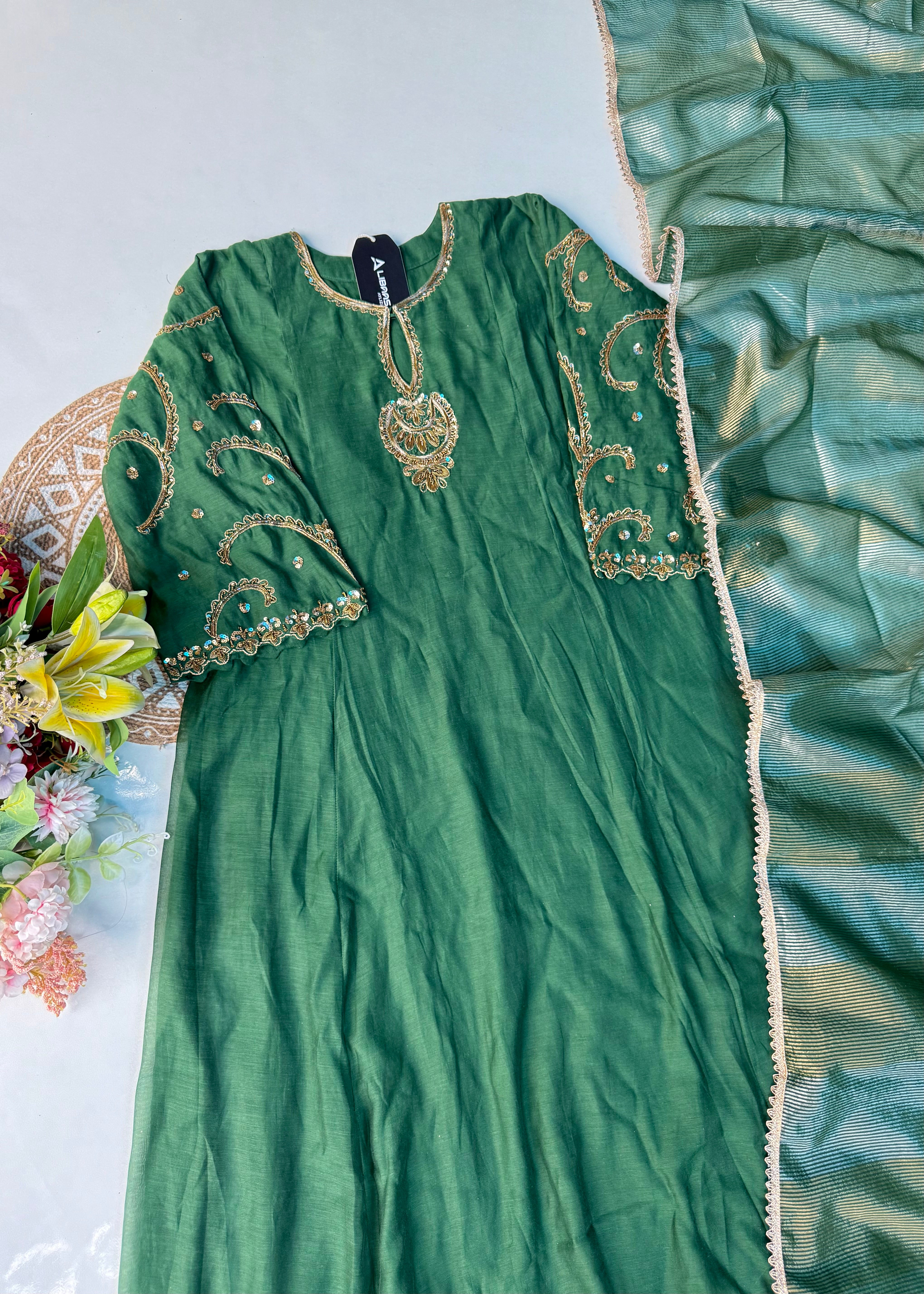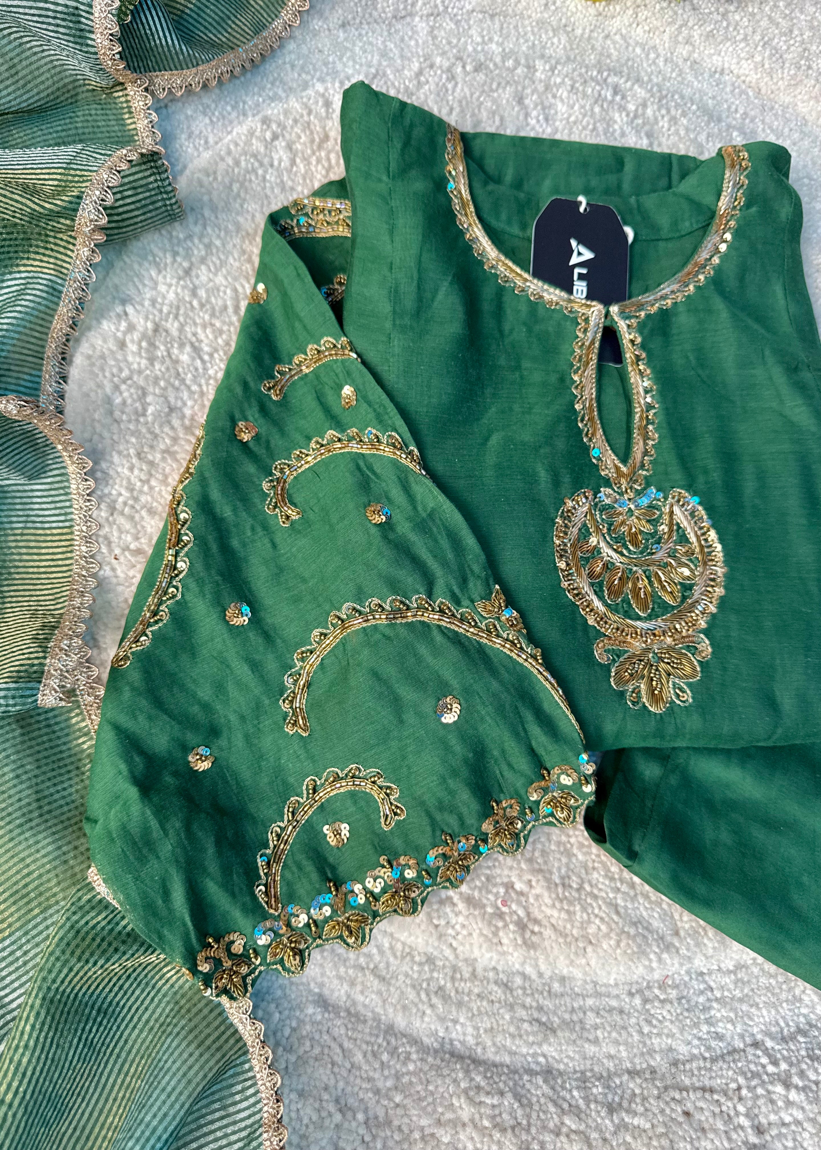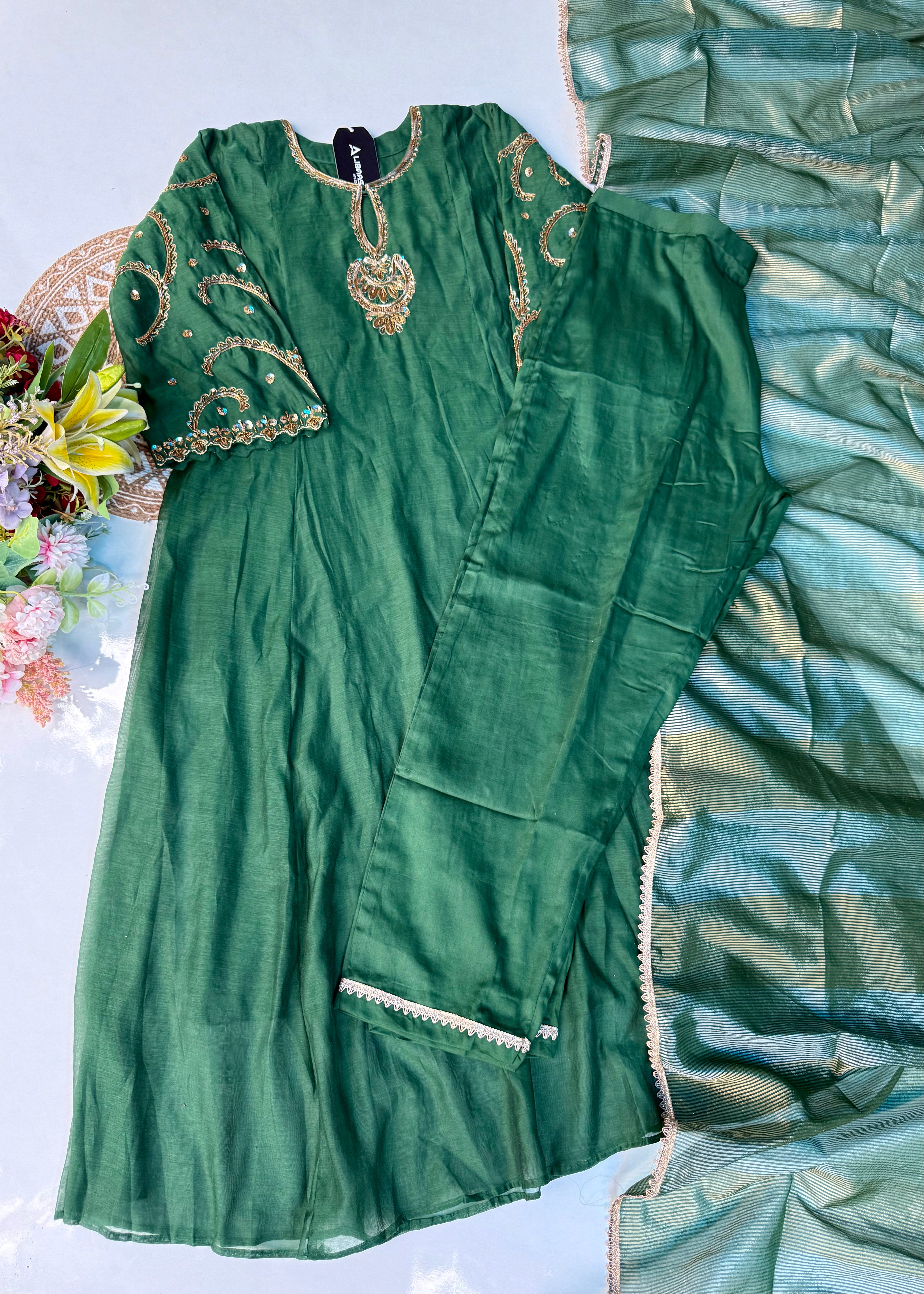 - Top: Mul Chanderi with intricate handwork on the front panel & sleeves