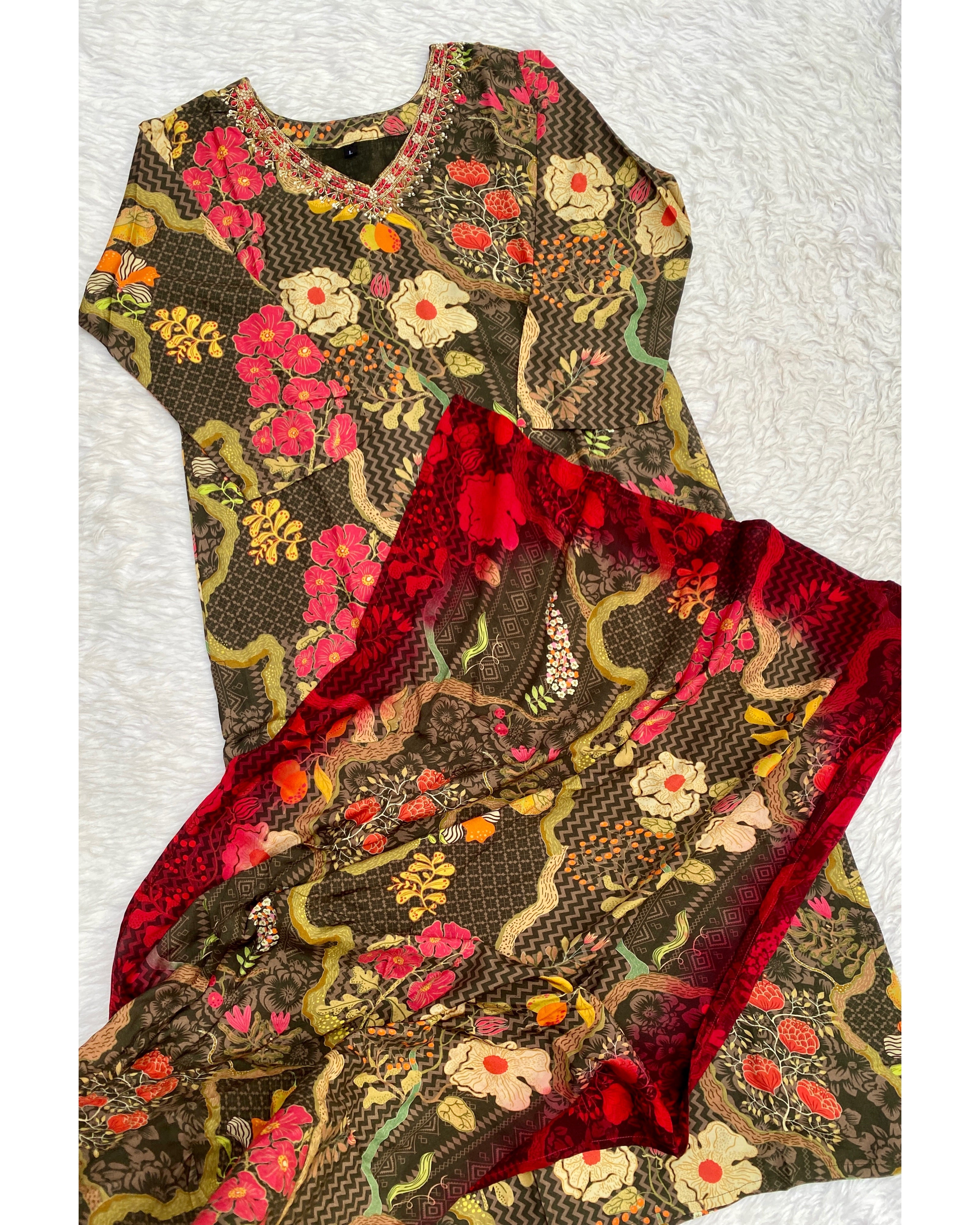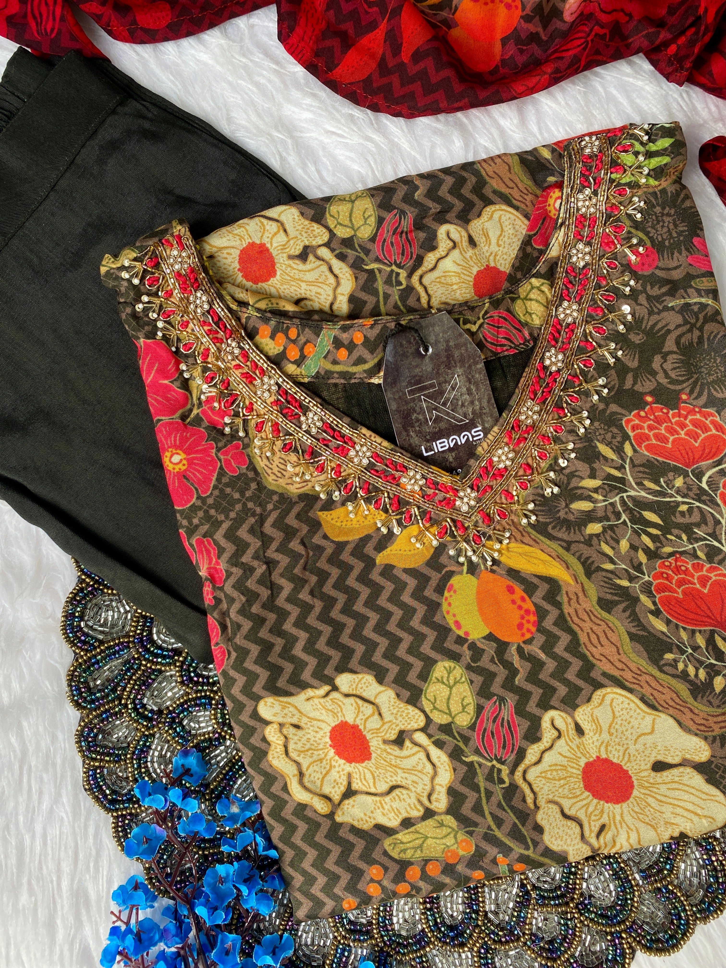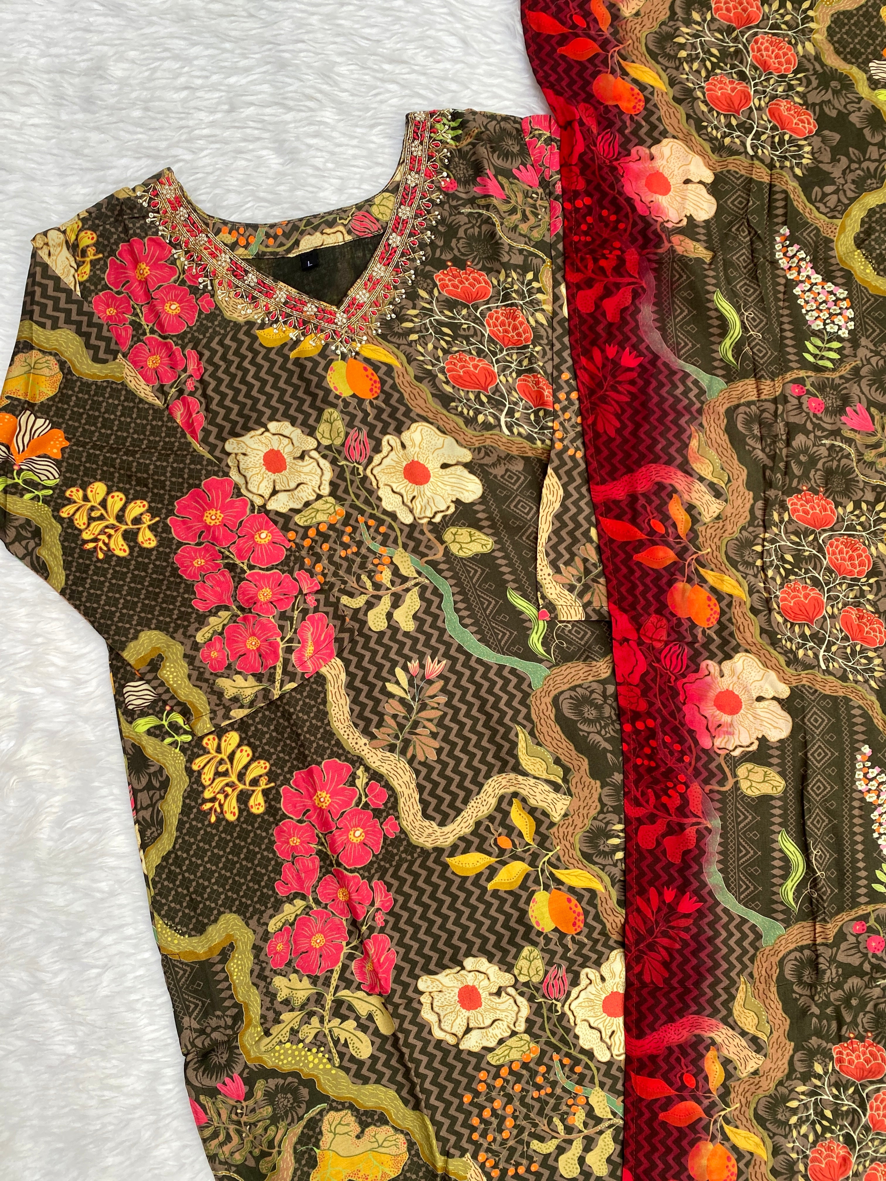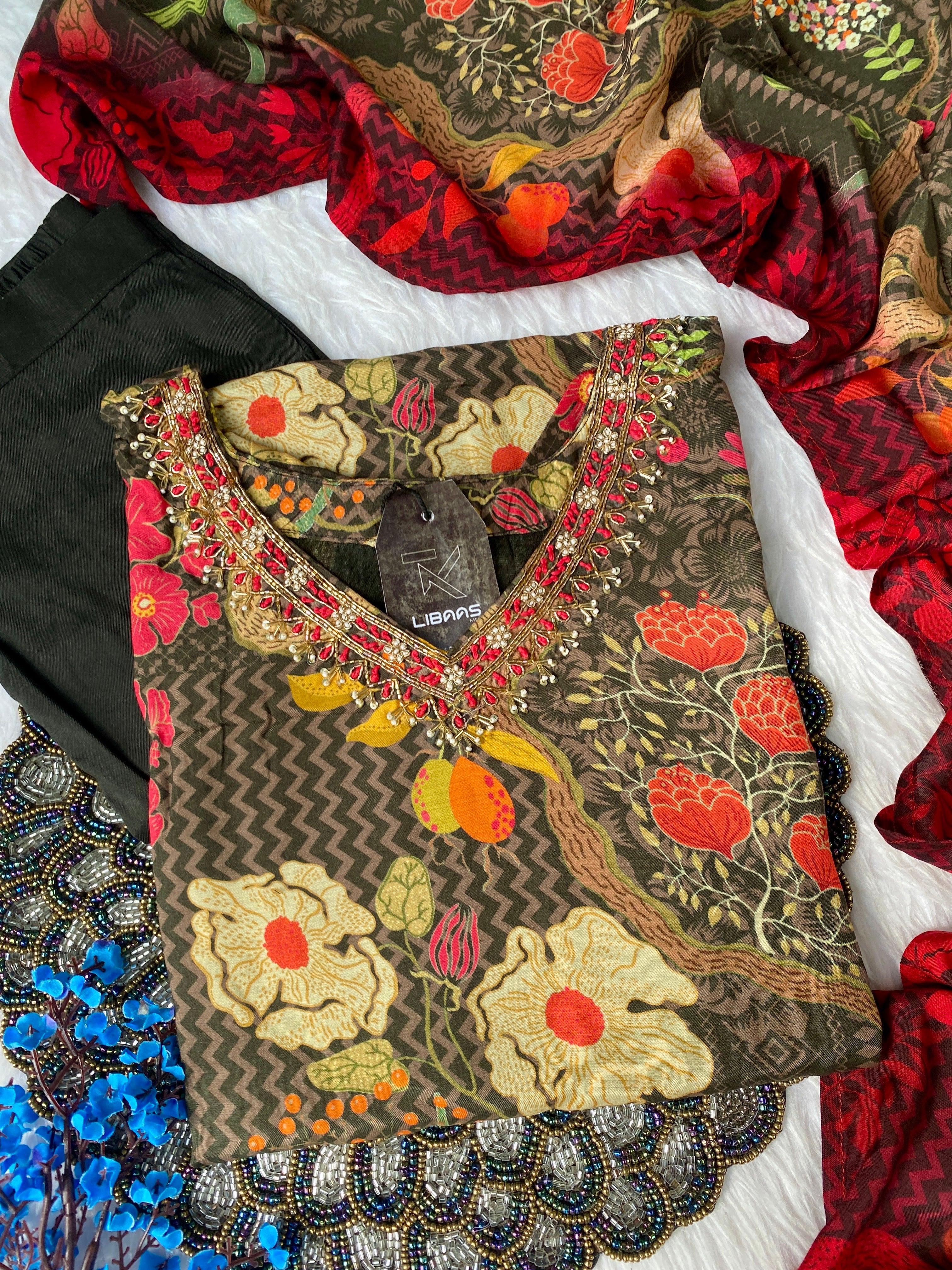 Beautiful soft muslin printed straight kurti set with handwork detailing on the yoke of the kurta with printed shiffon dupatta with silk bottom