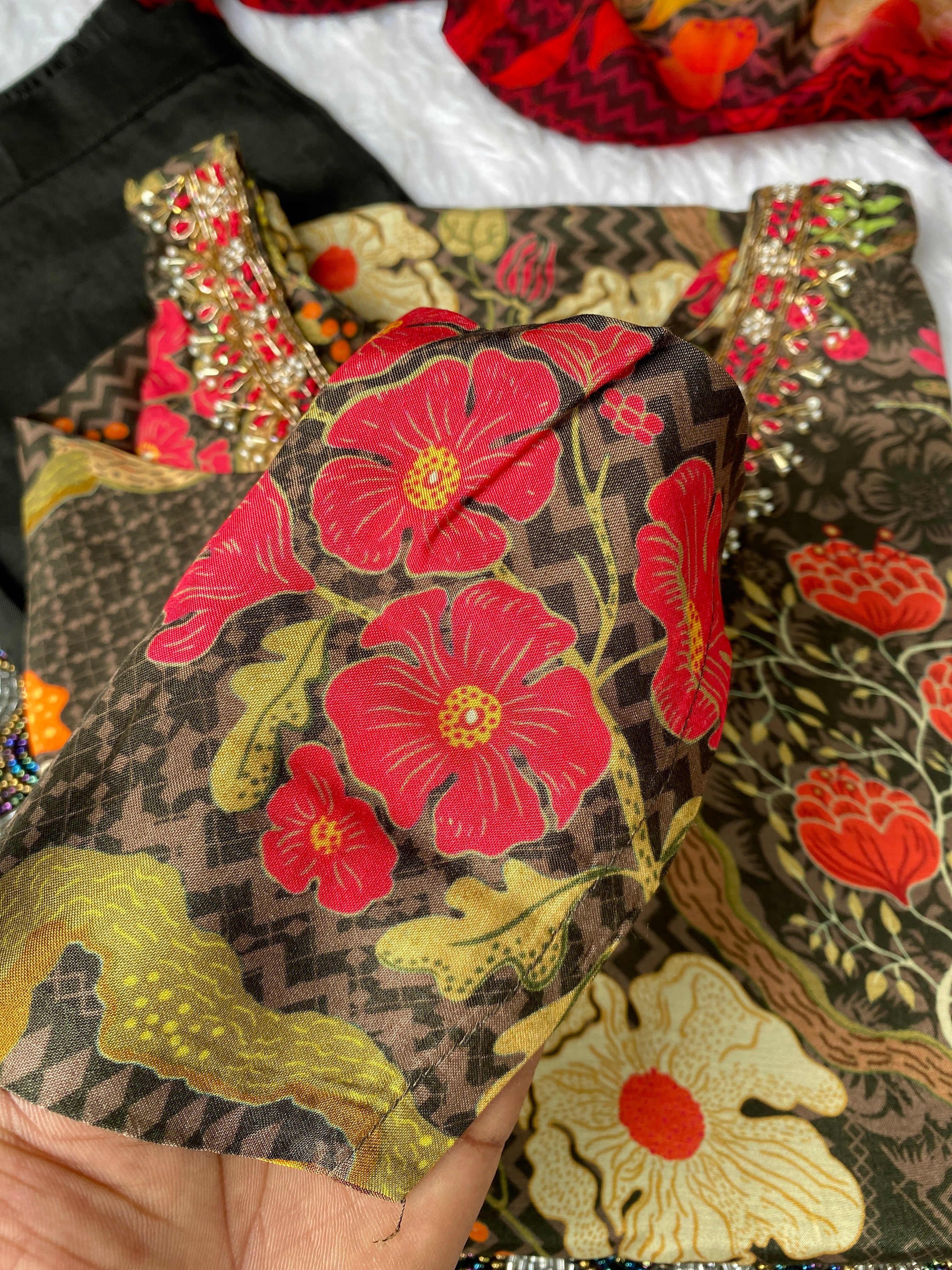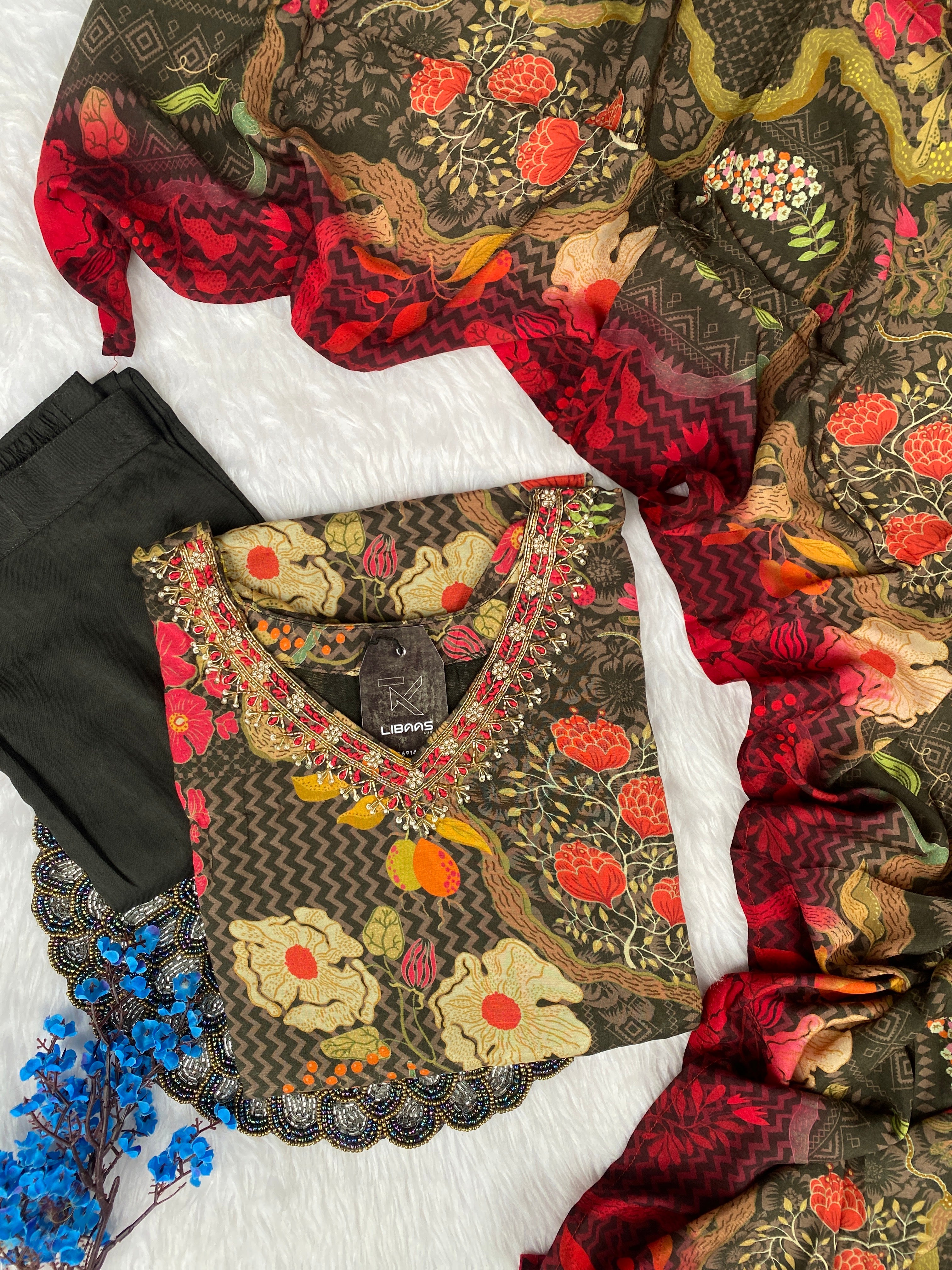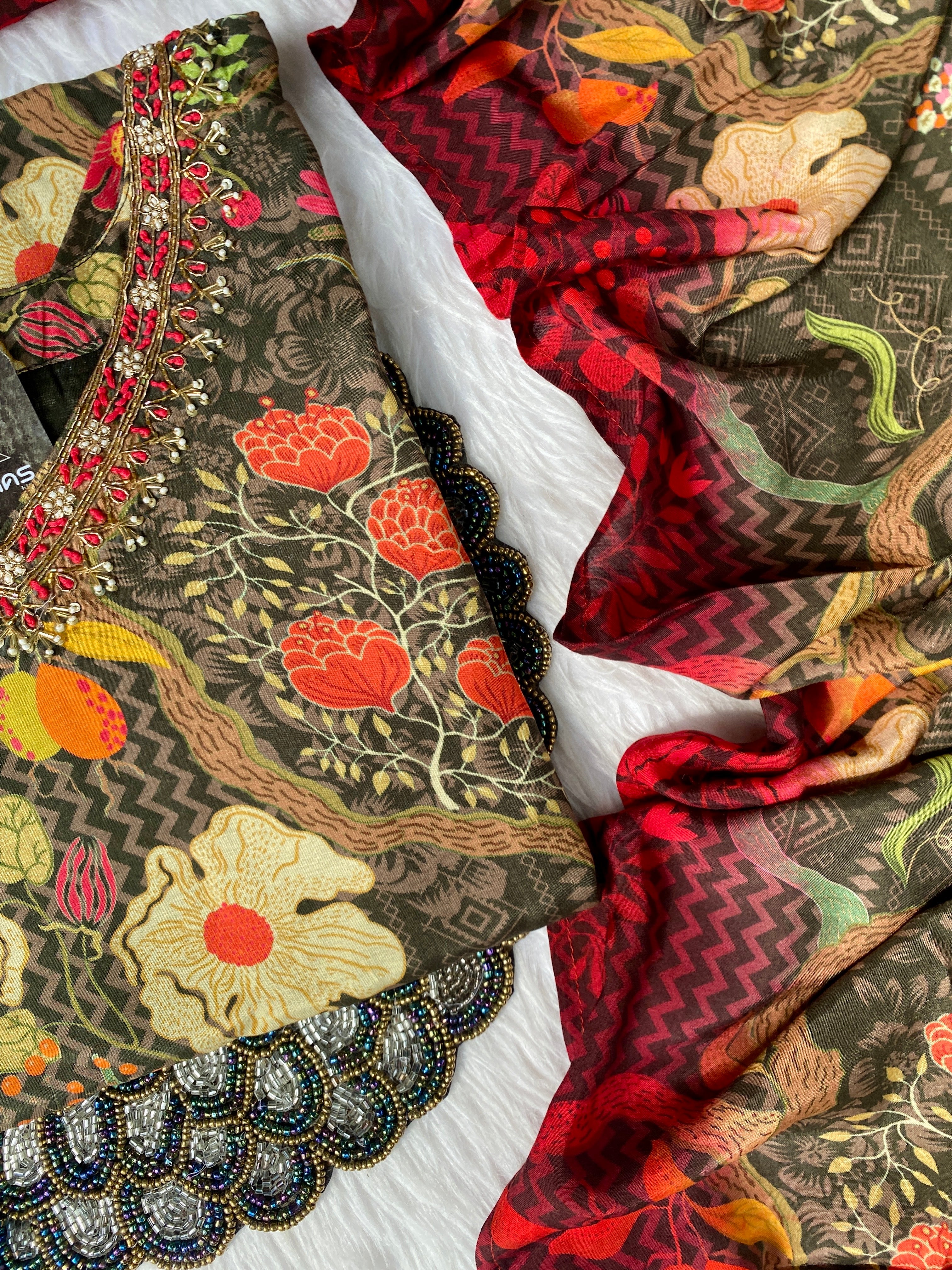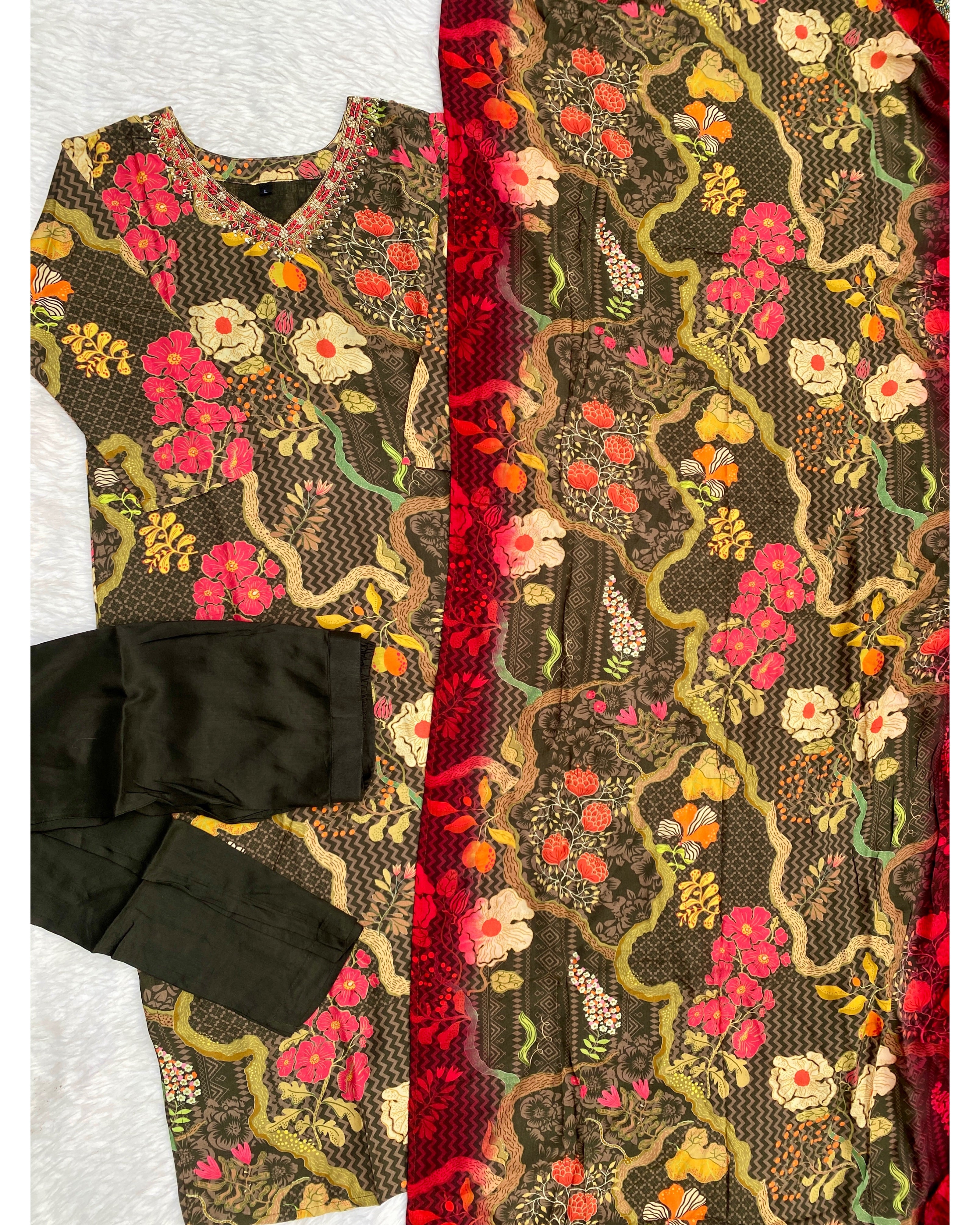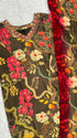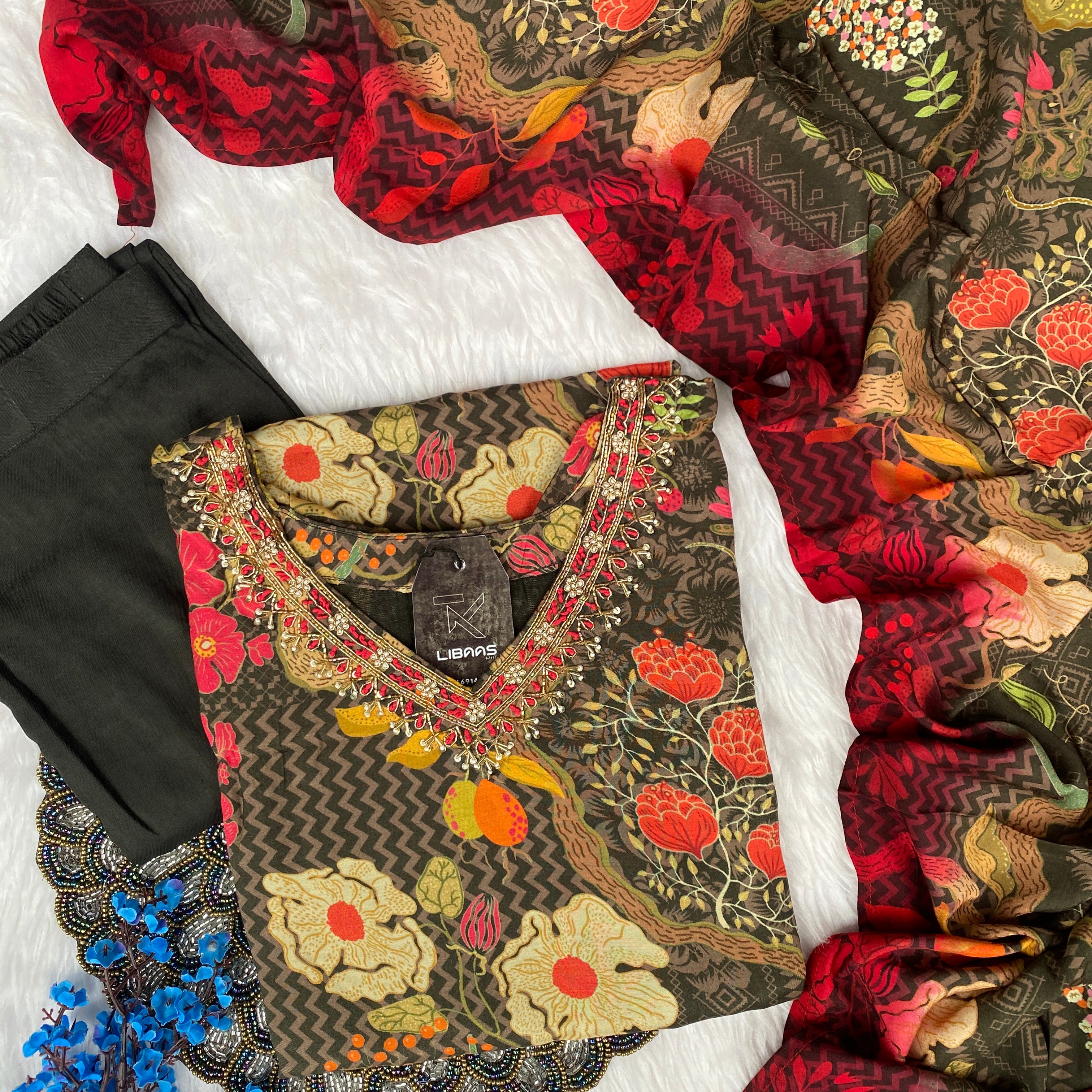 Beautiful soft muslin printed straight kurti set with handwork detailing on the yoke of the kurta with printed shiffon dupatta with silk bottom