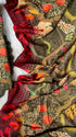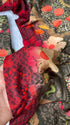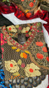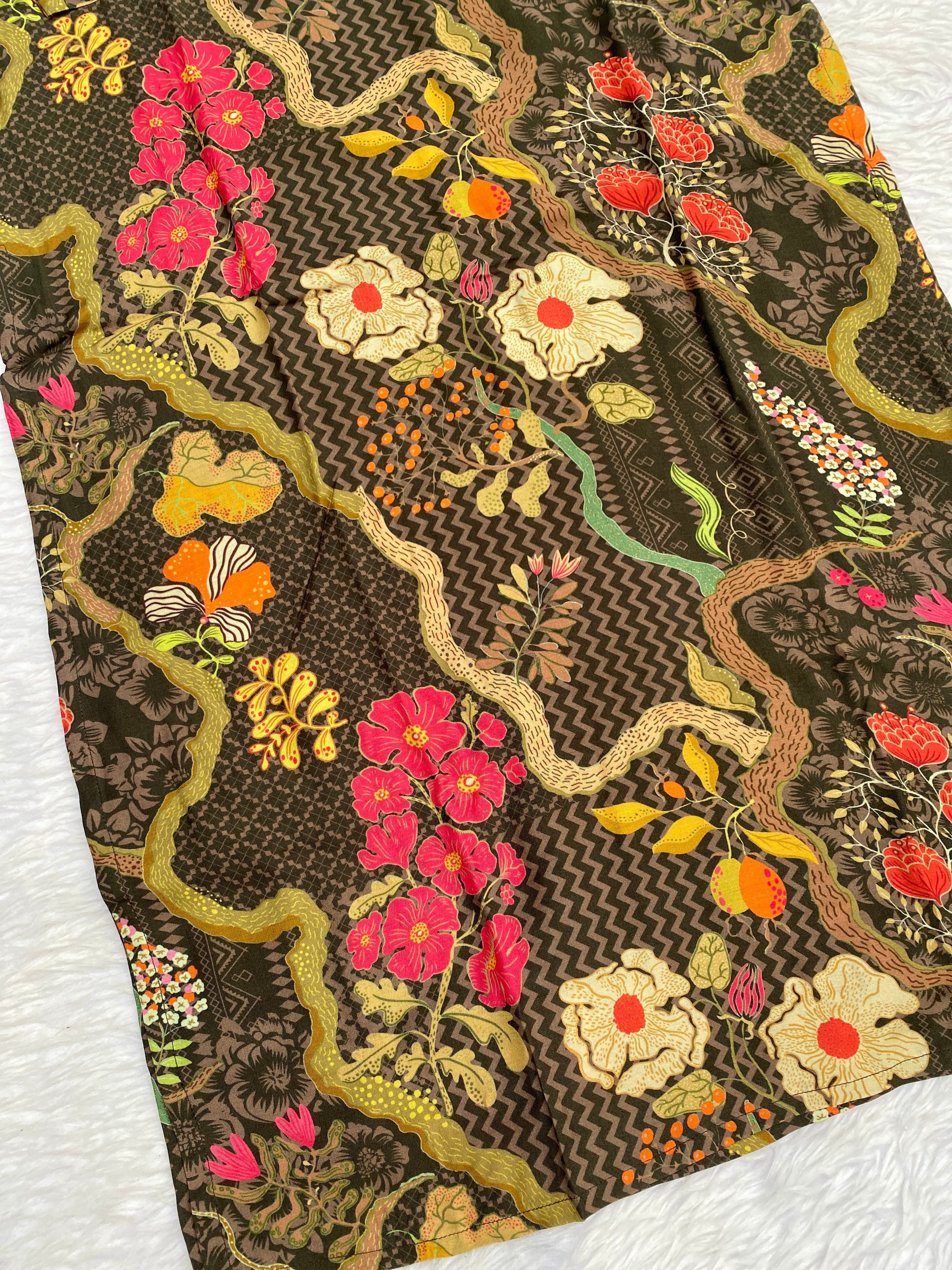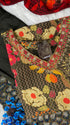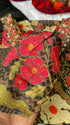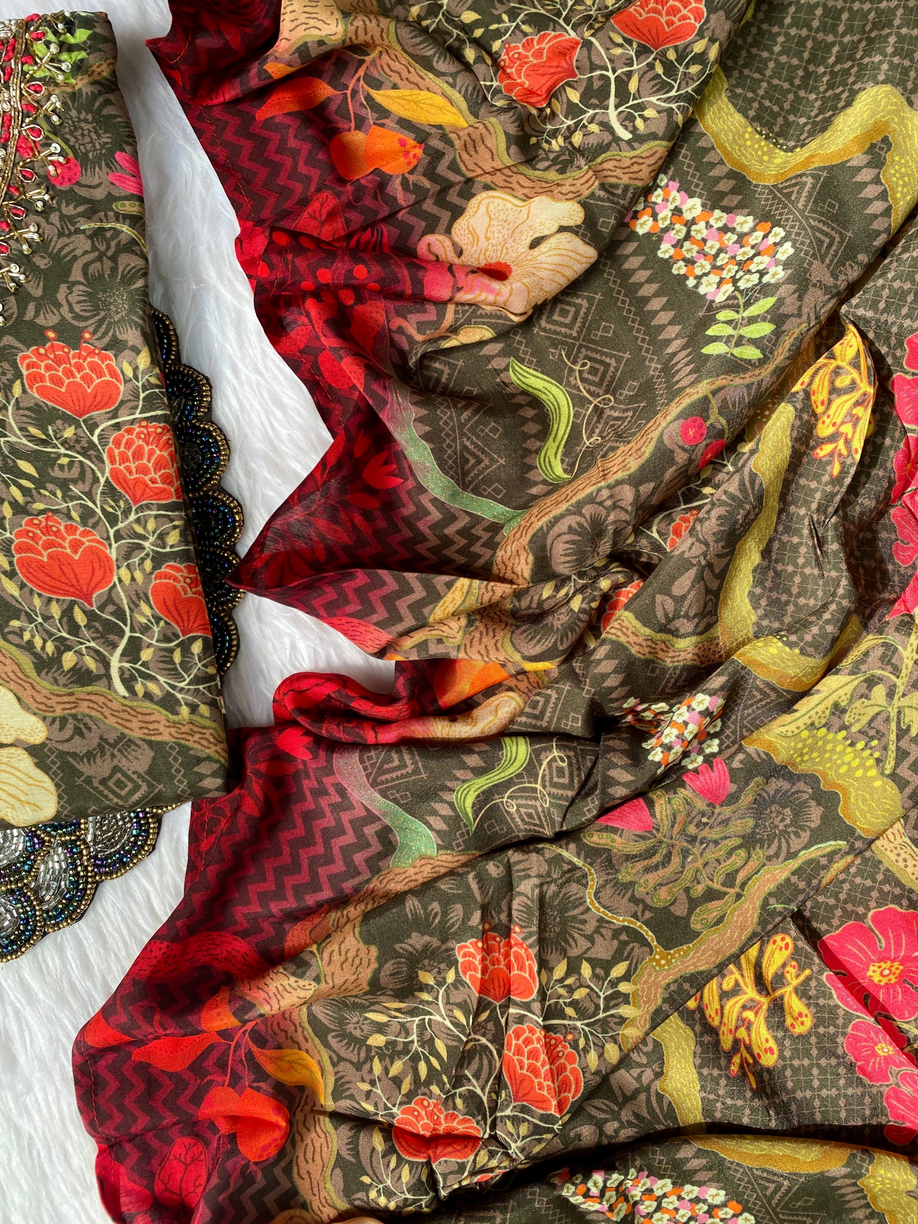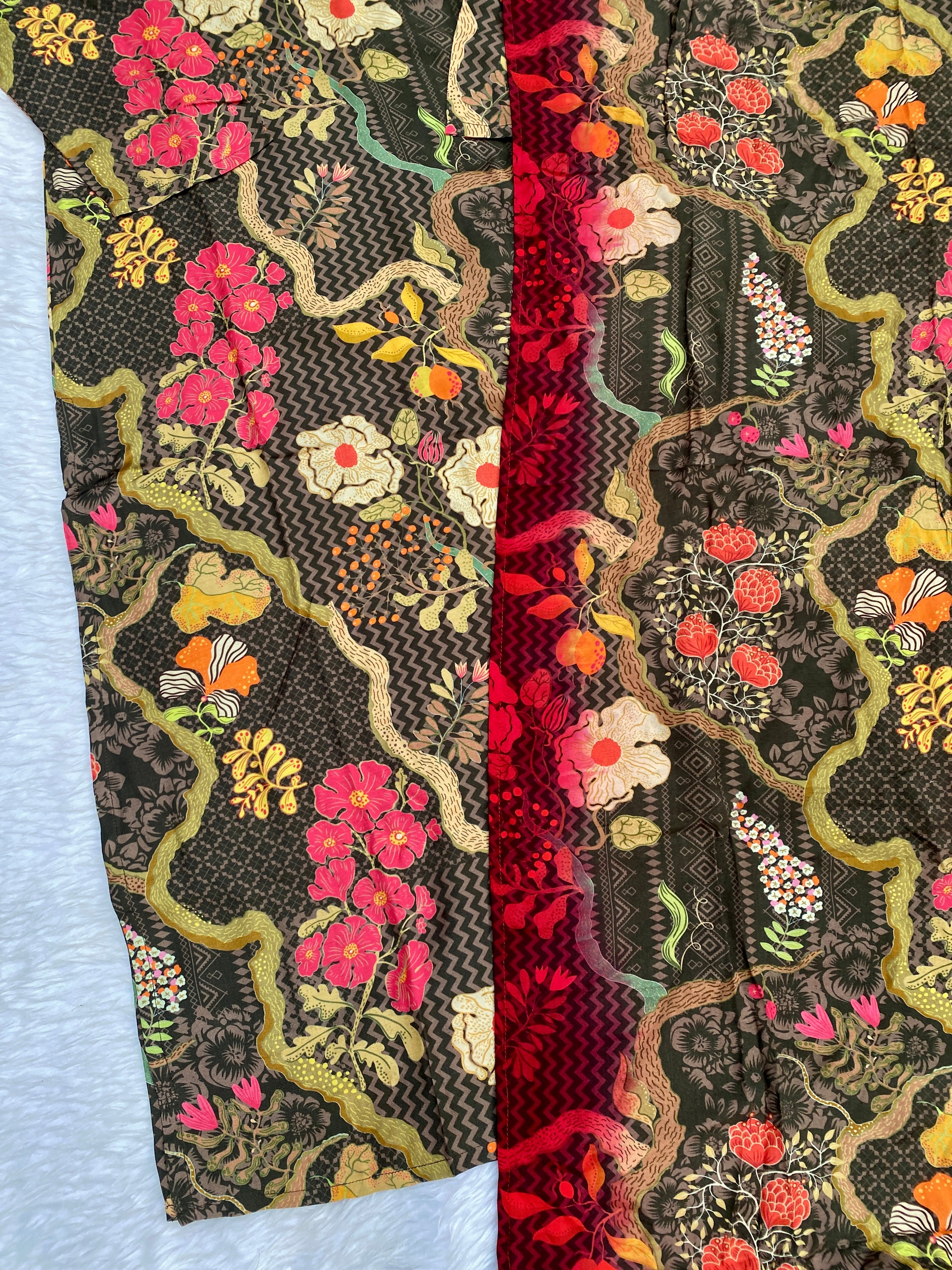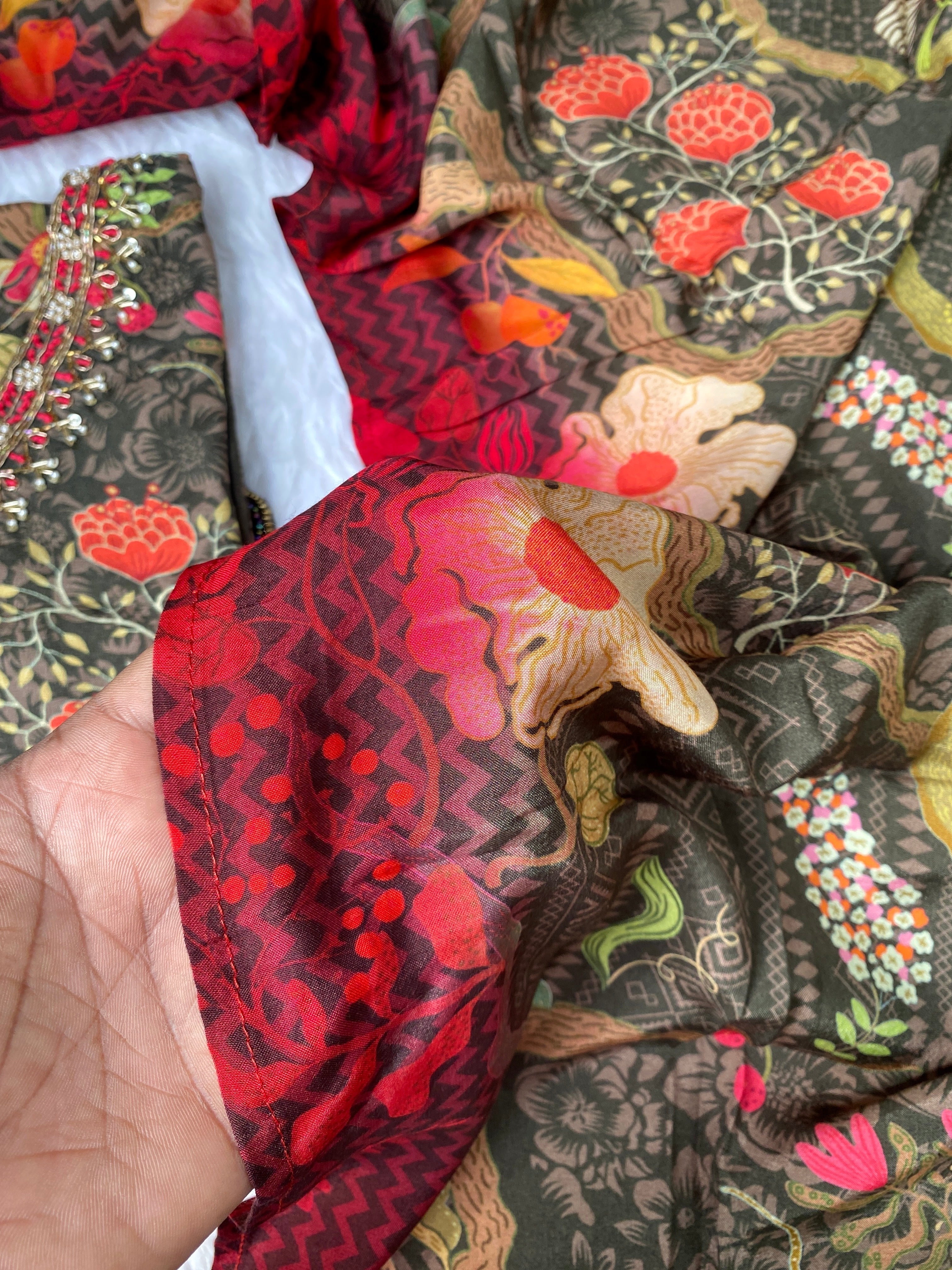 Beautiful soft muslin printed straight kurti set with handwork detailing on the yoke of the kurta with printed shiffon dupatta with silk bottom