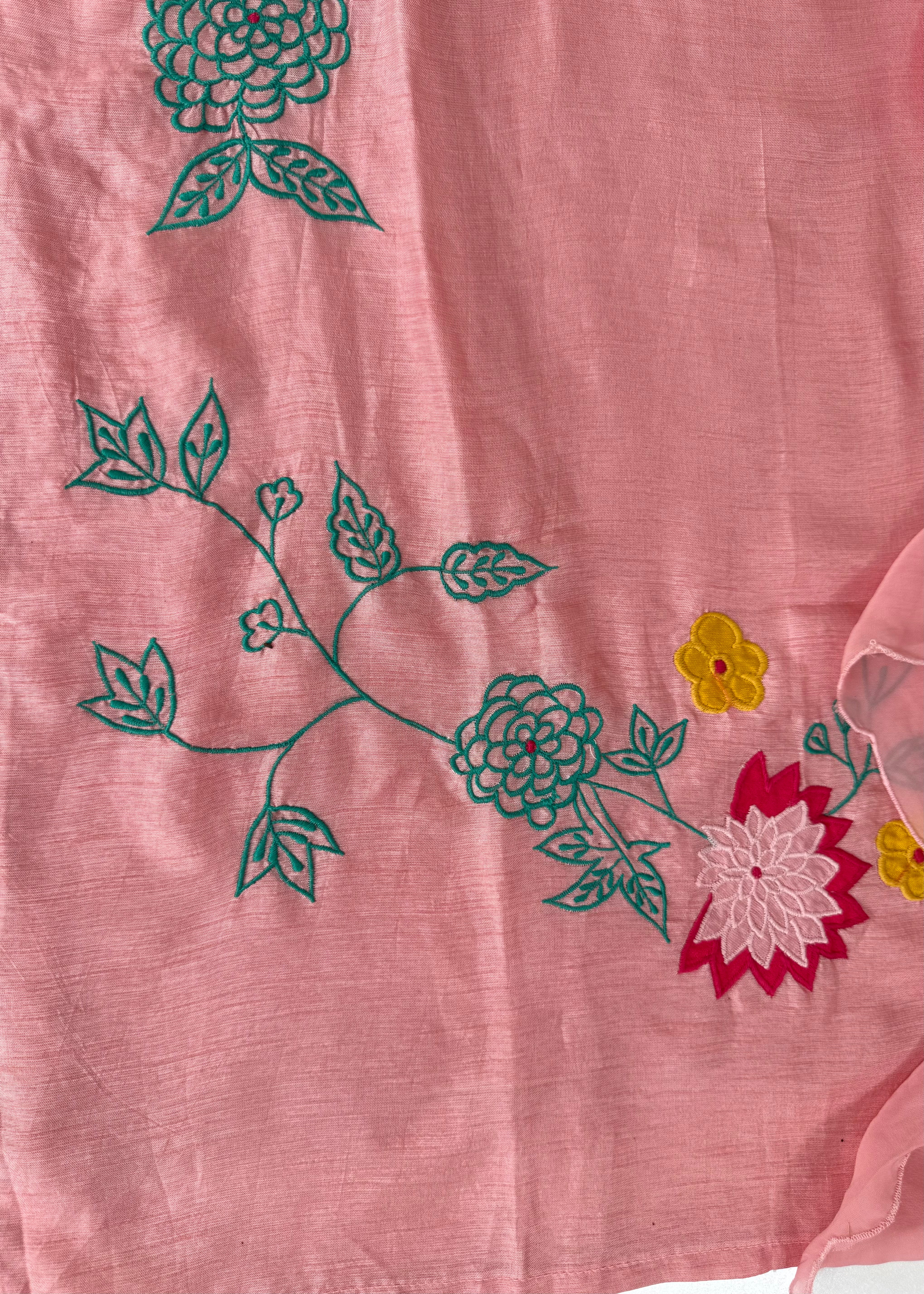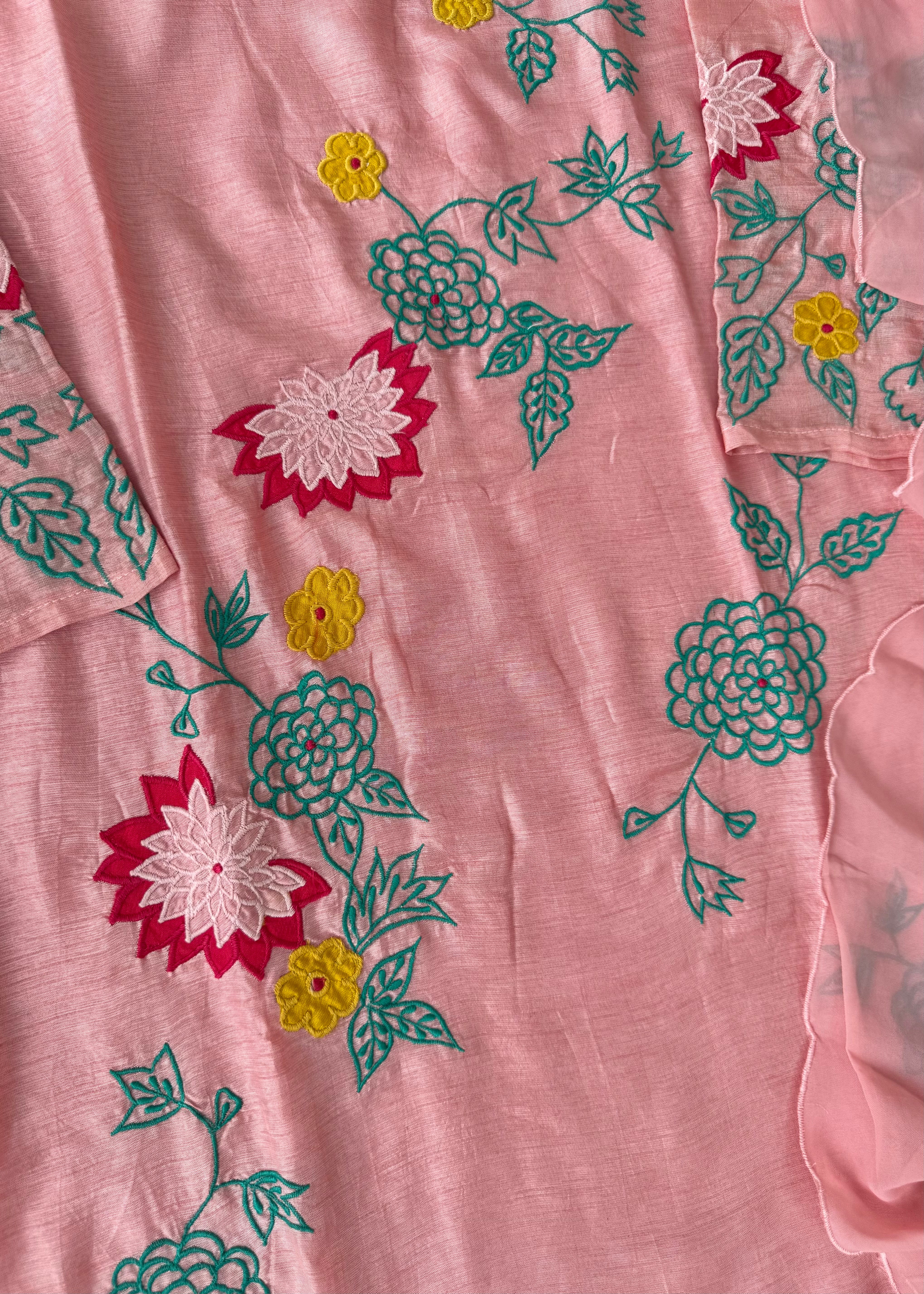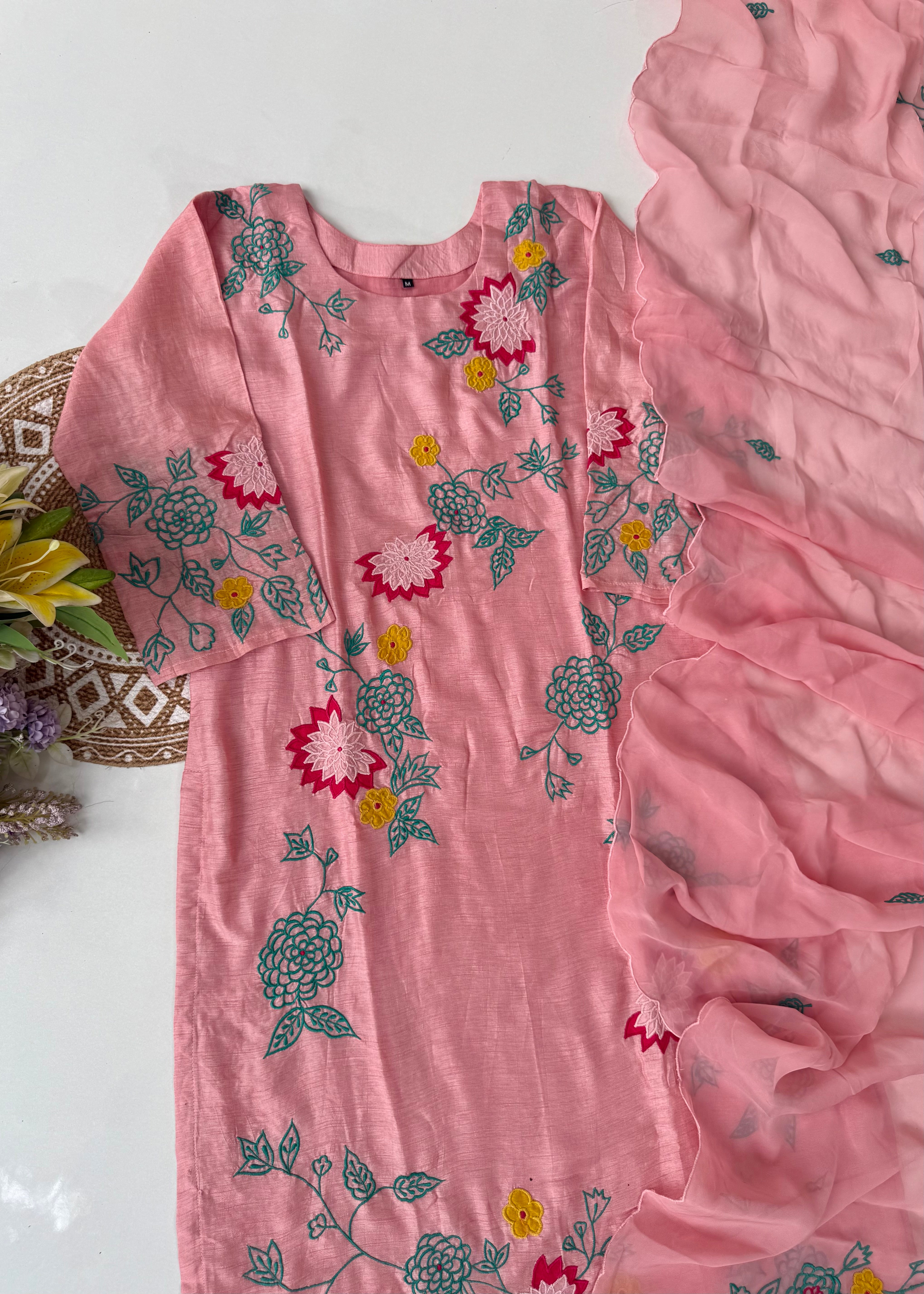 Premium Dola silk kurti with beautiful Appliqué work all over the top with a long viscose dupatta with applique work and a Dola silk bottom
