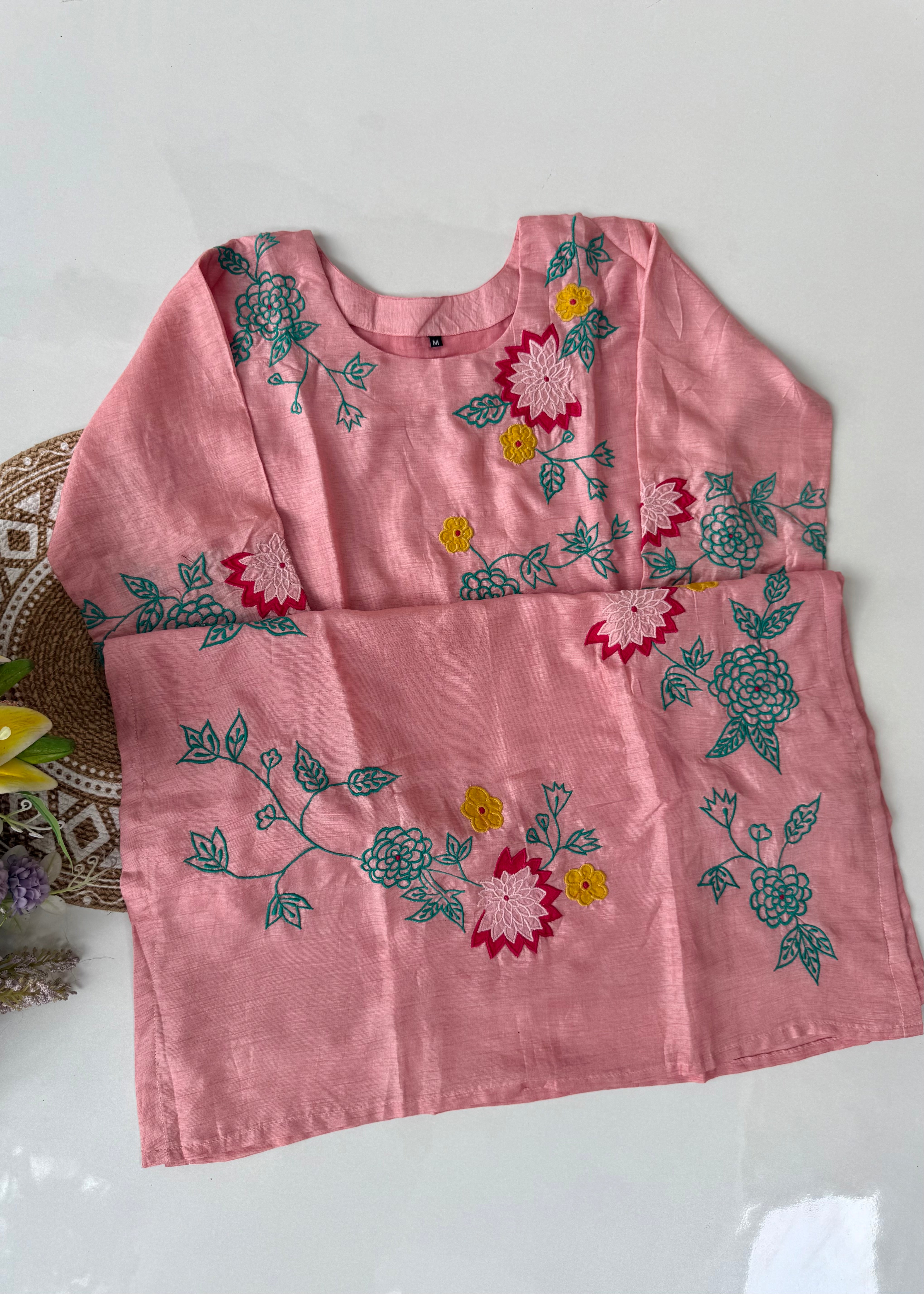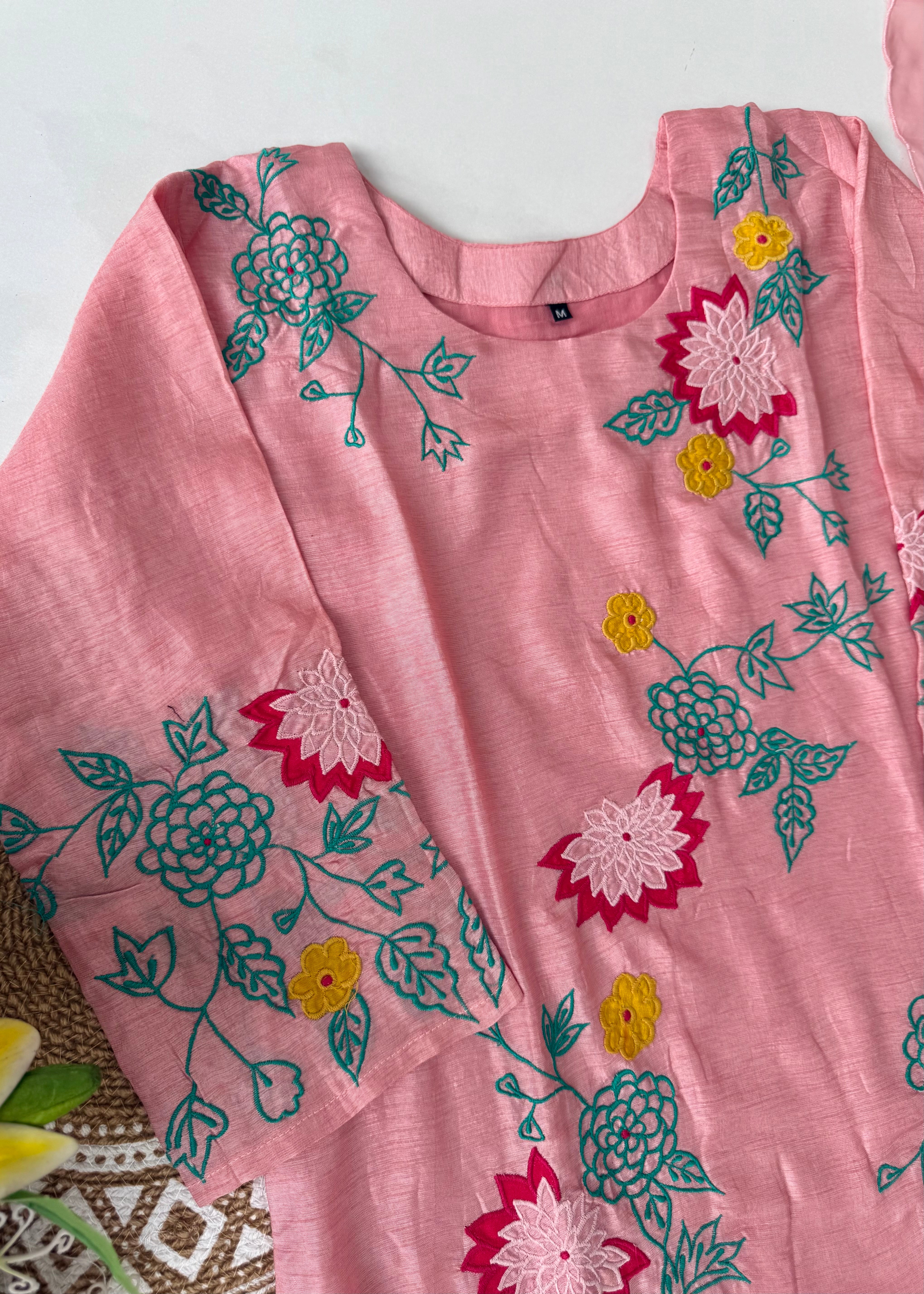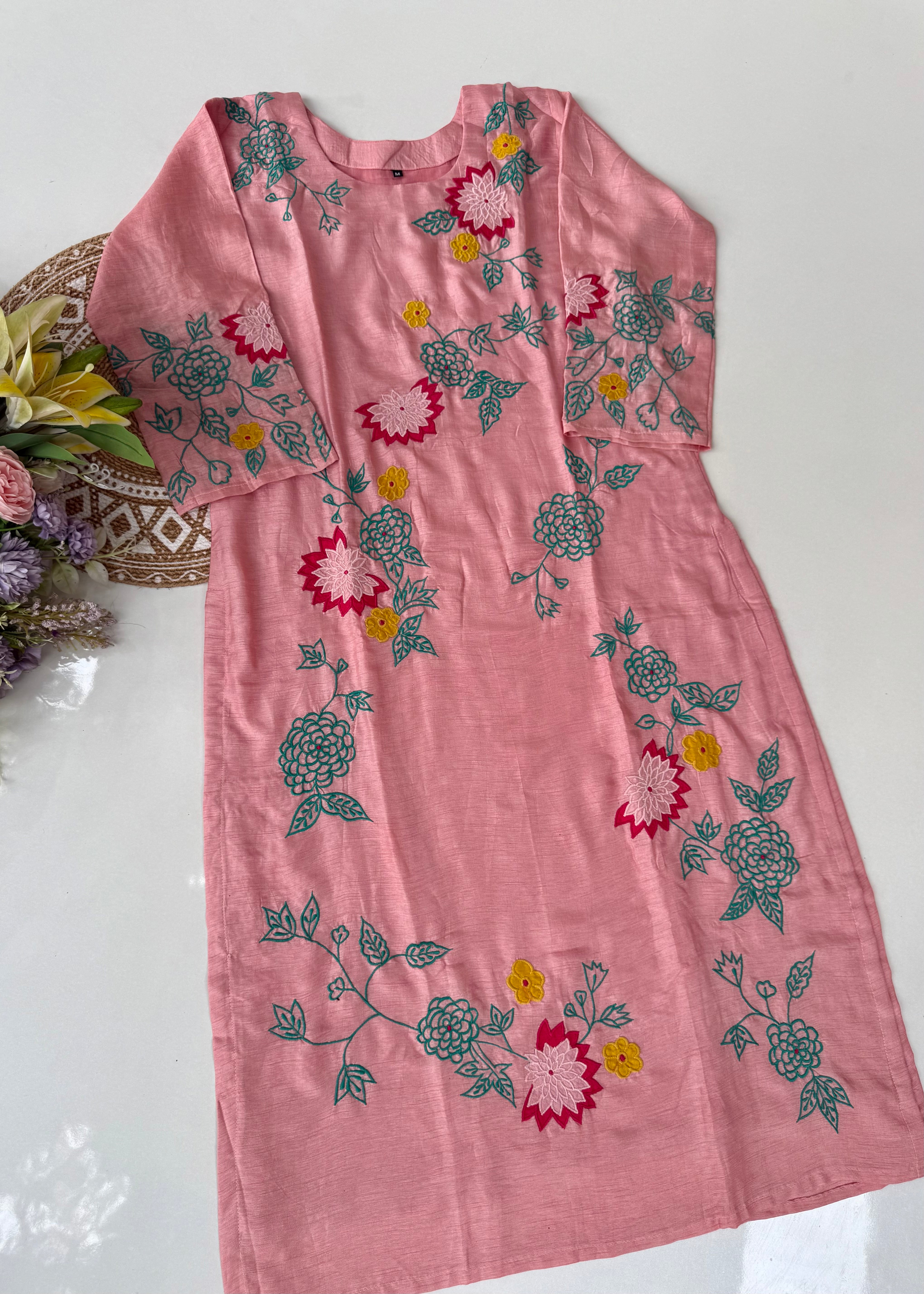 Premium Dola silk kurti with beautiful Appliqué work all over the top with a long viscose dupatta with applique work and a Dola silk bottom