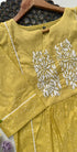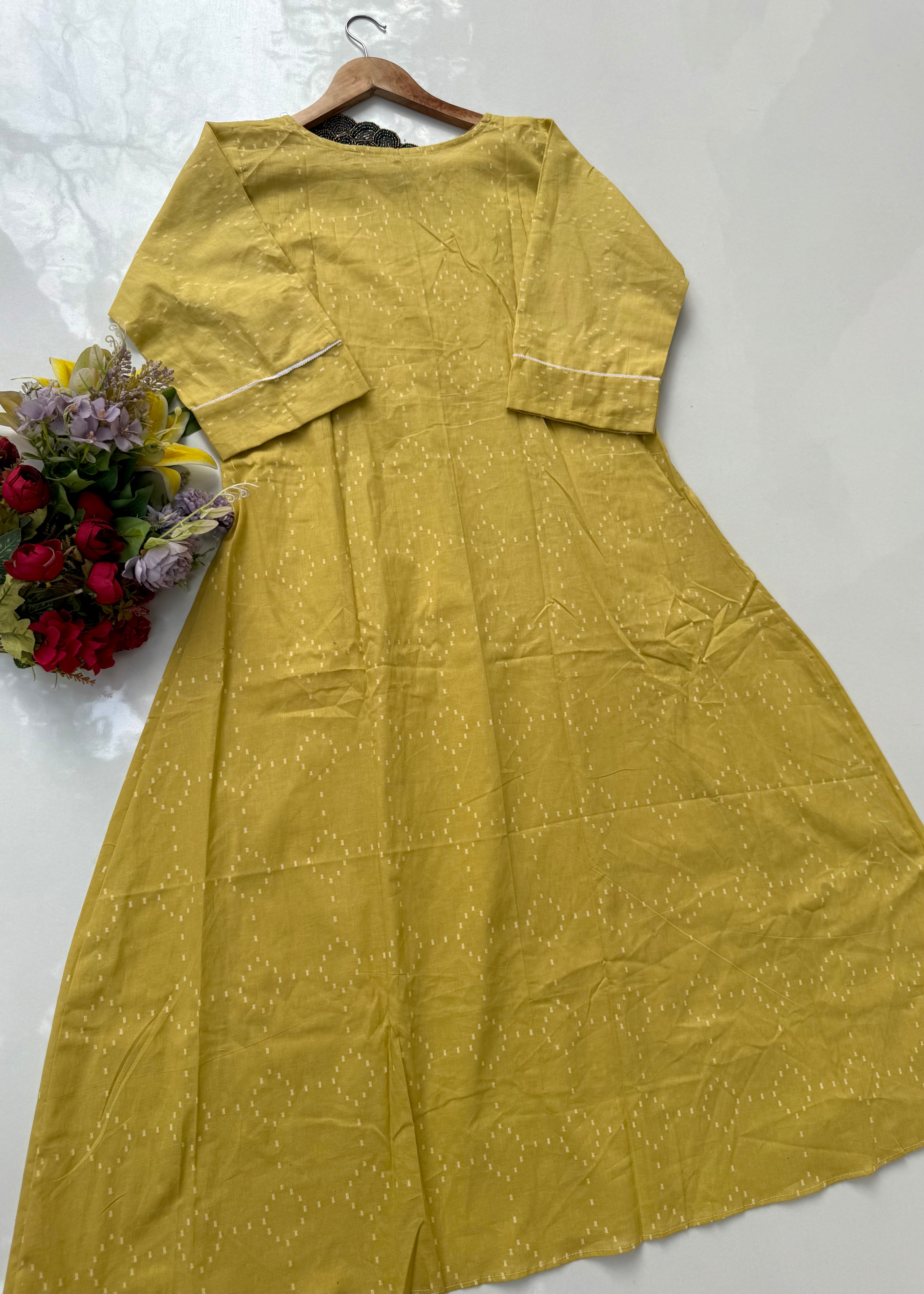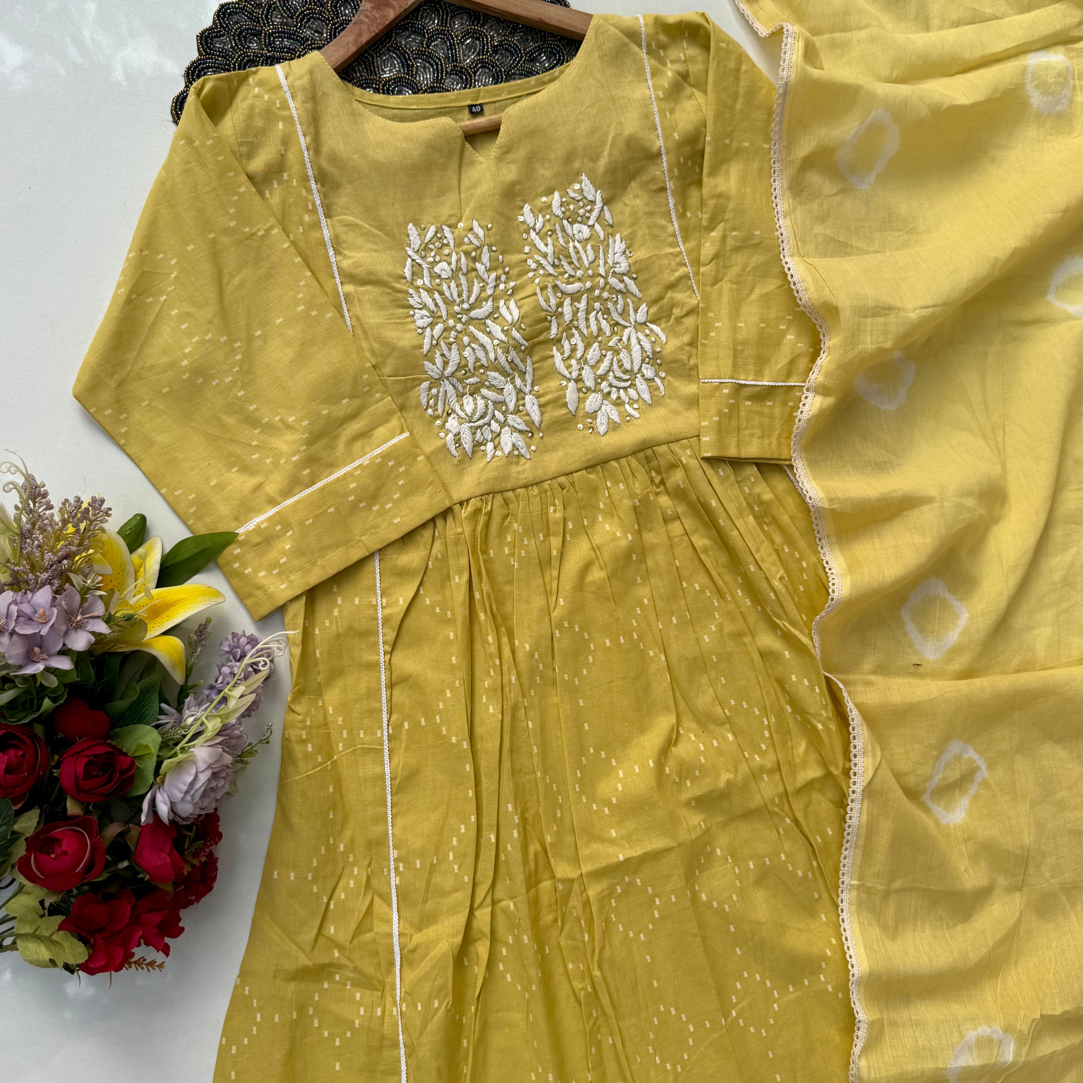 Premium Mul Cotton anarkali kurta set with handwork on the neck line with printed work all over the top with a long printed mul cotton paired with mul cotton bottom