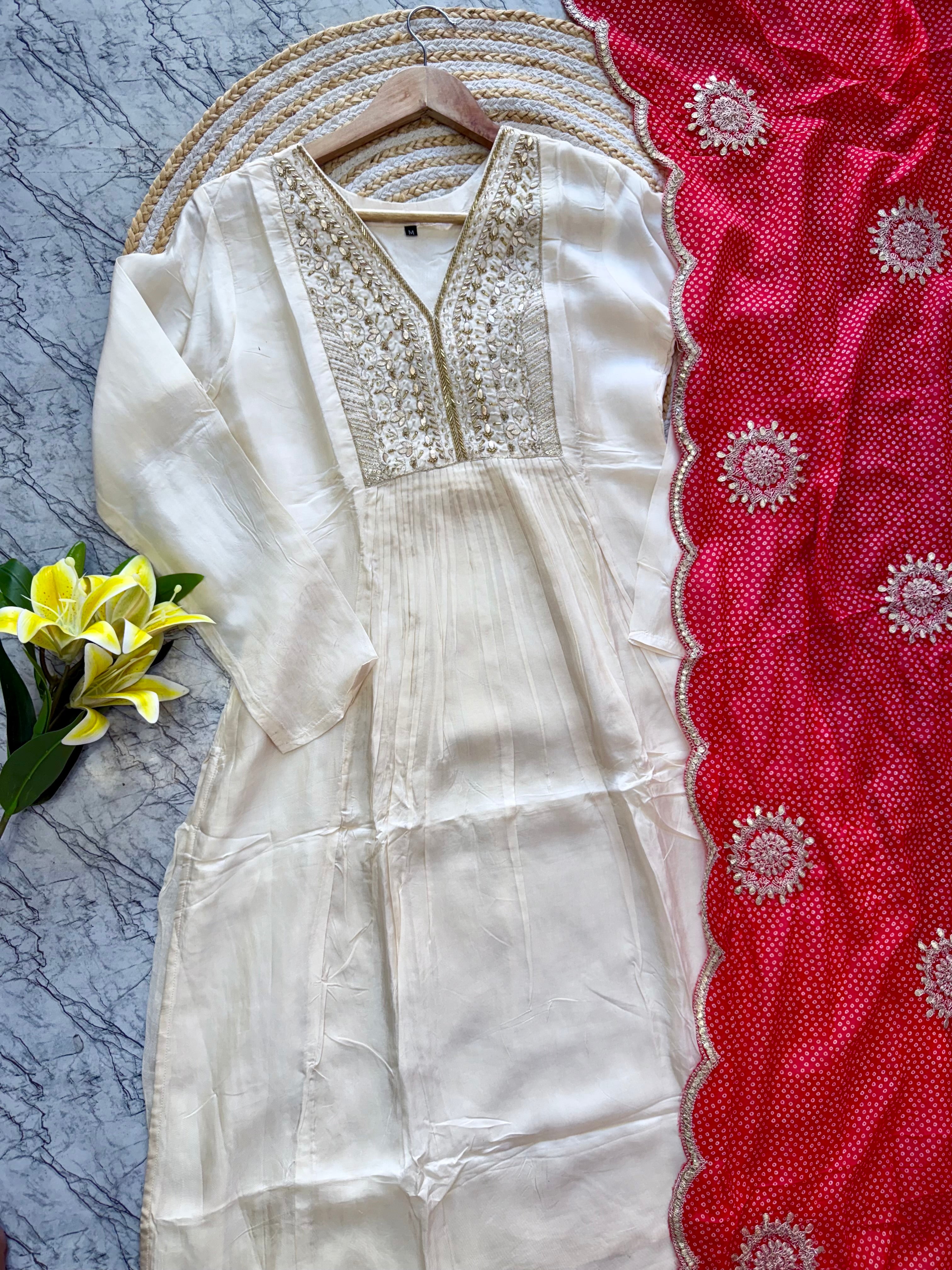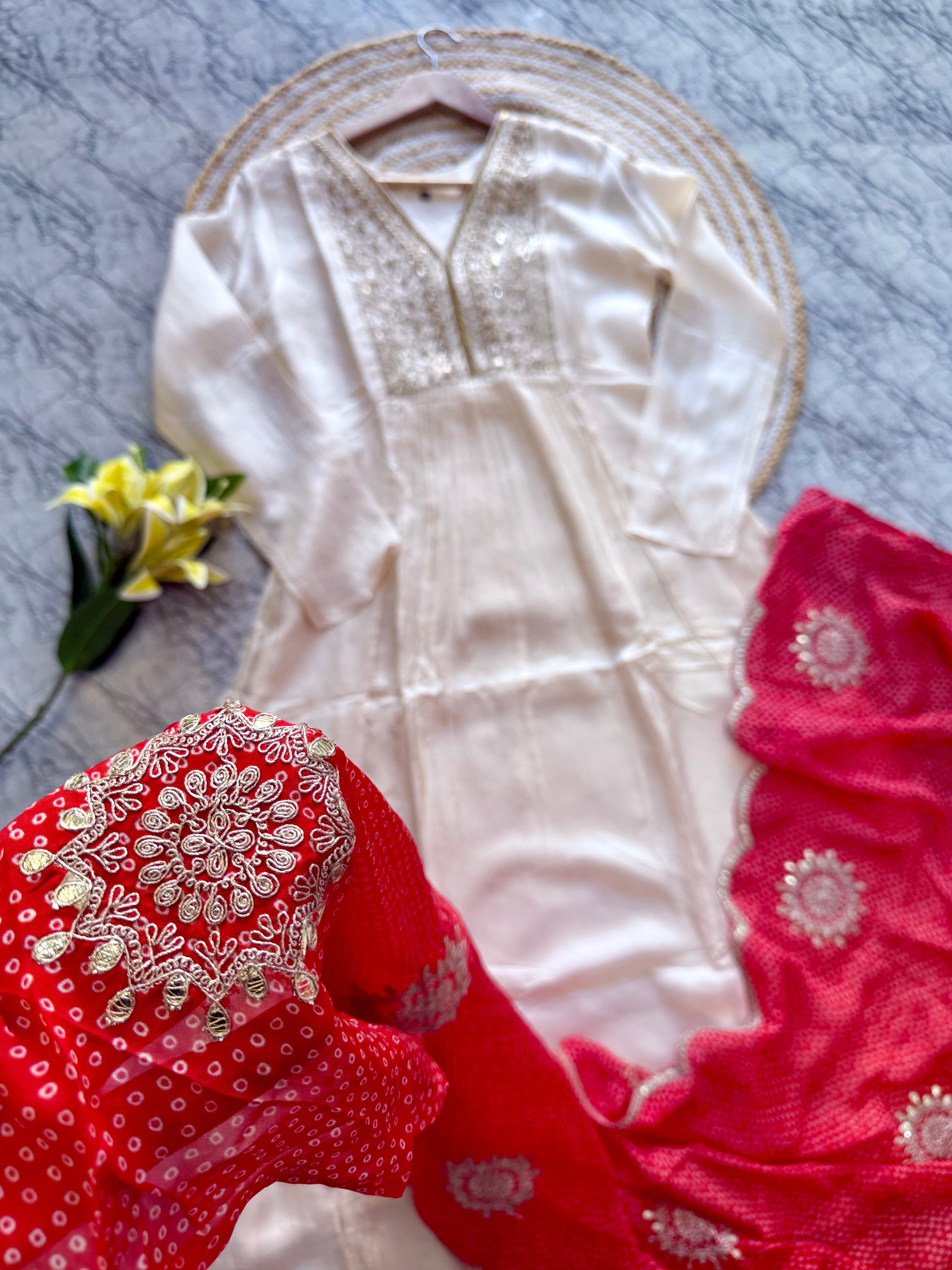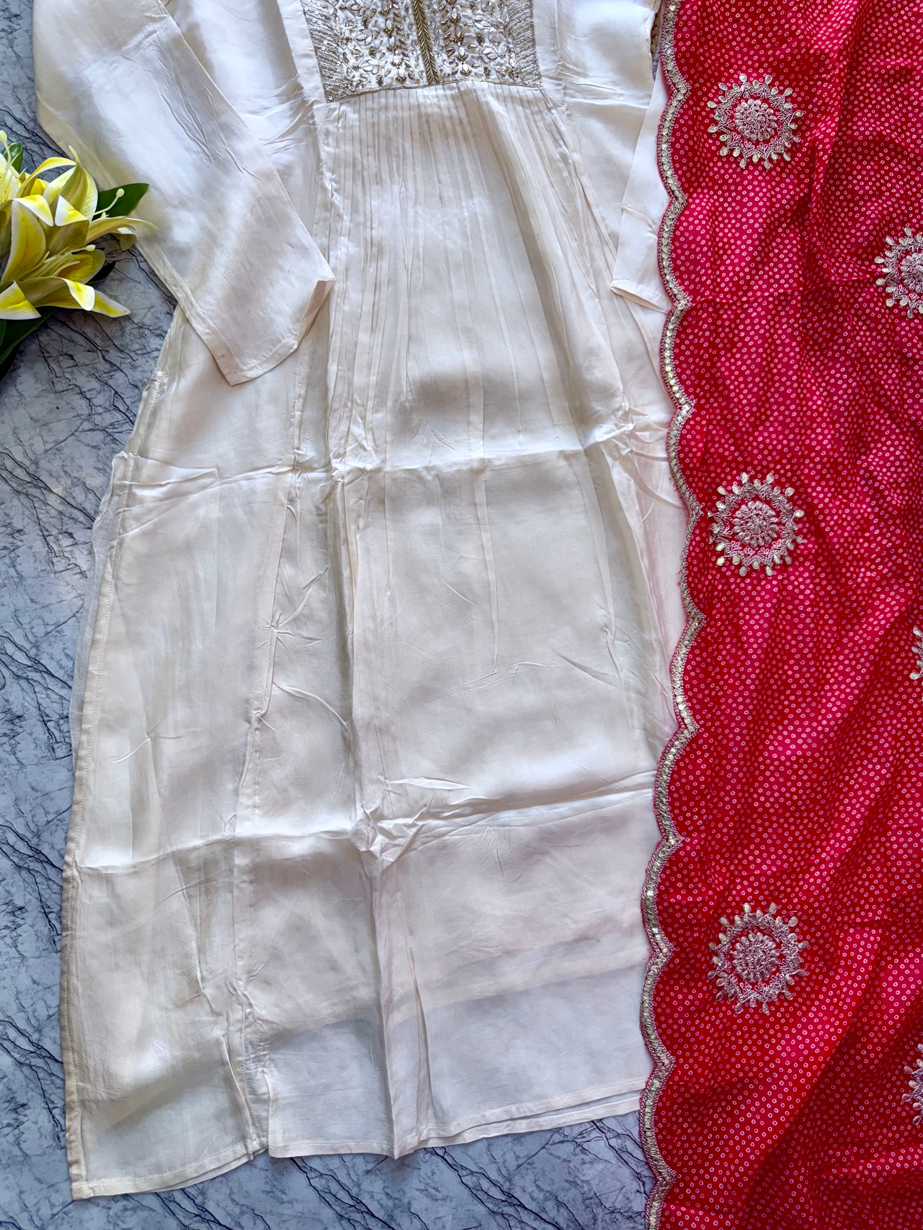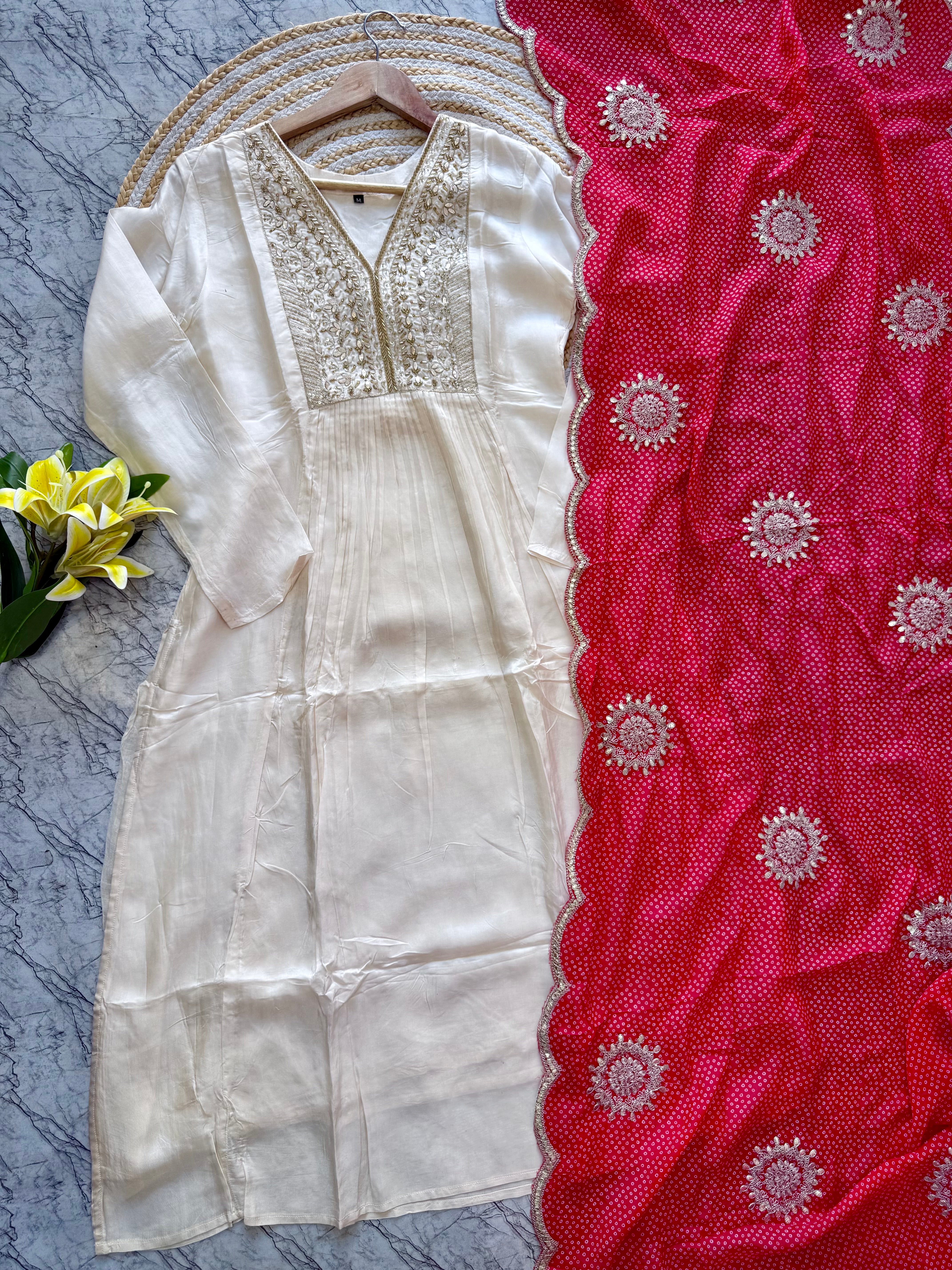 Tissue silk set with handwork of the yoke of the kurta with beautiful chinnon contrast handwork bandhni dupatta with a plane silk bottom