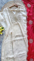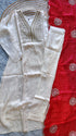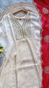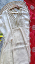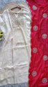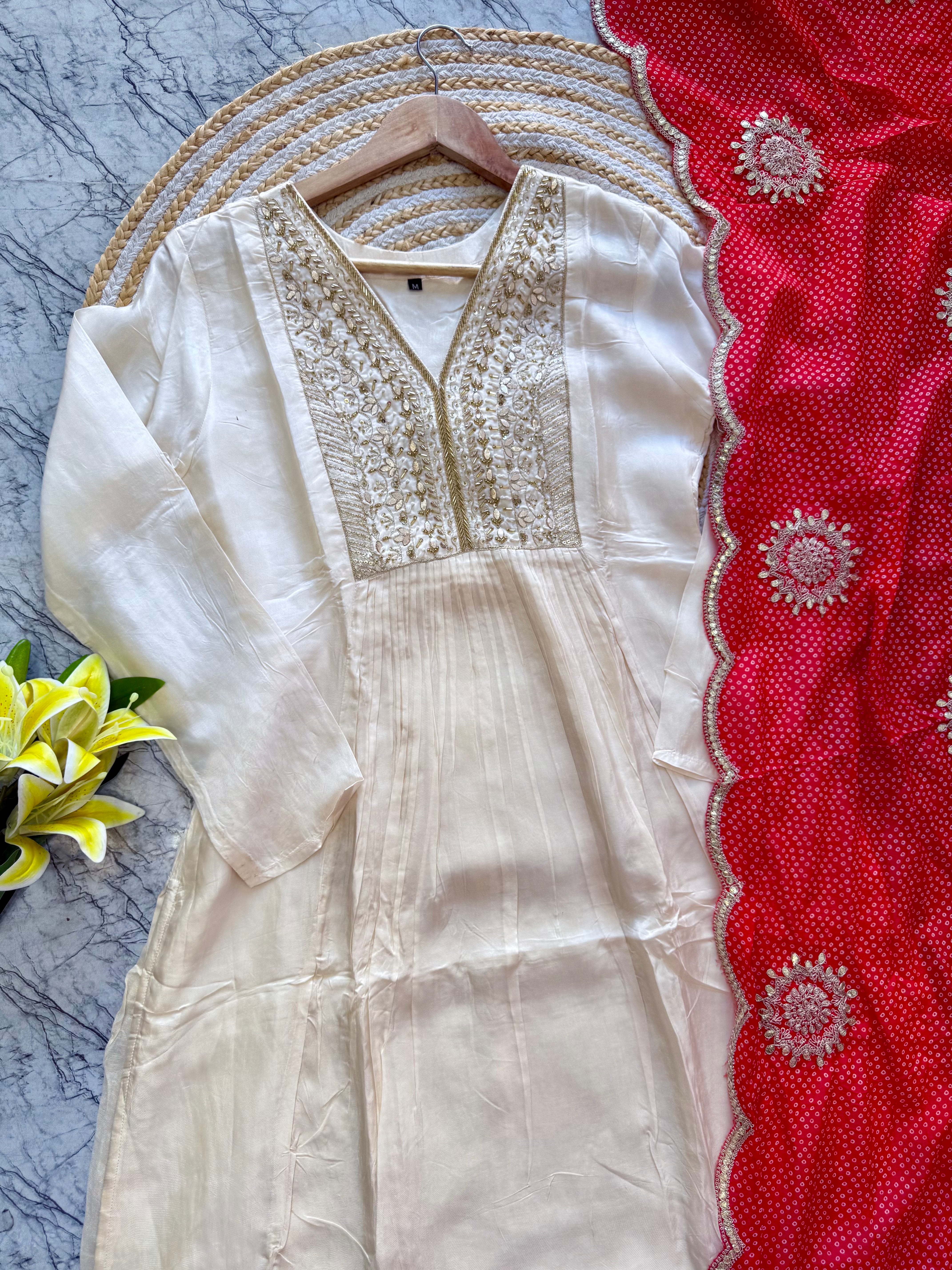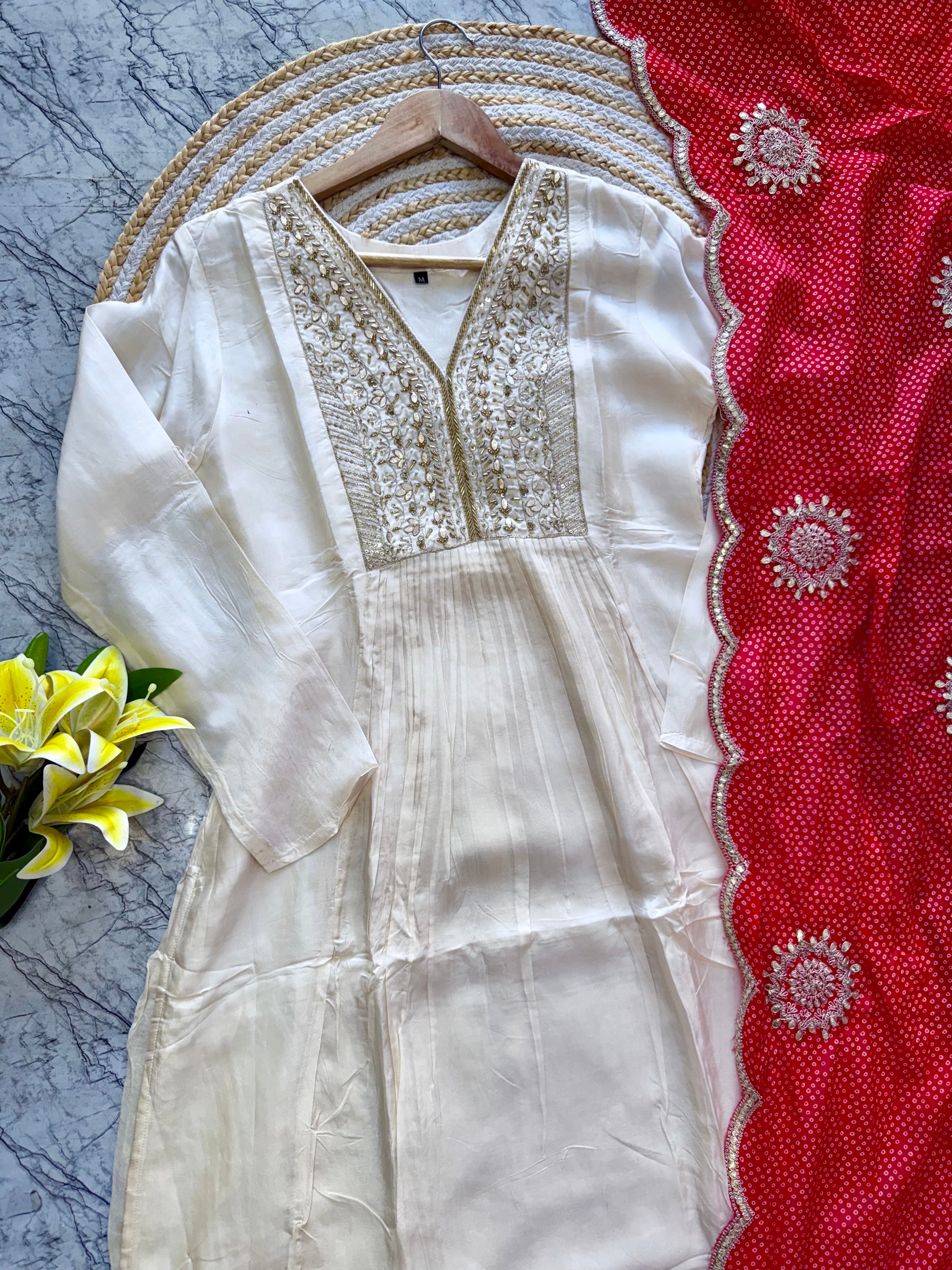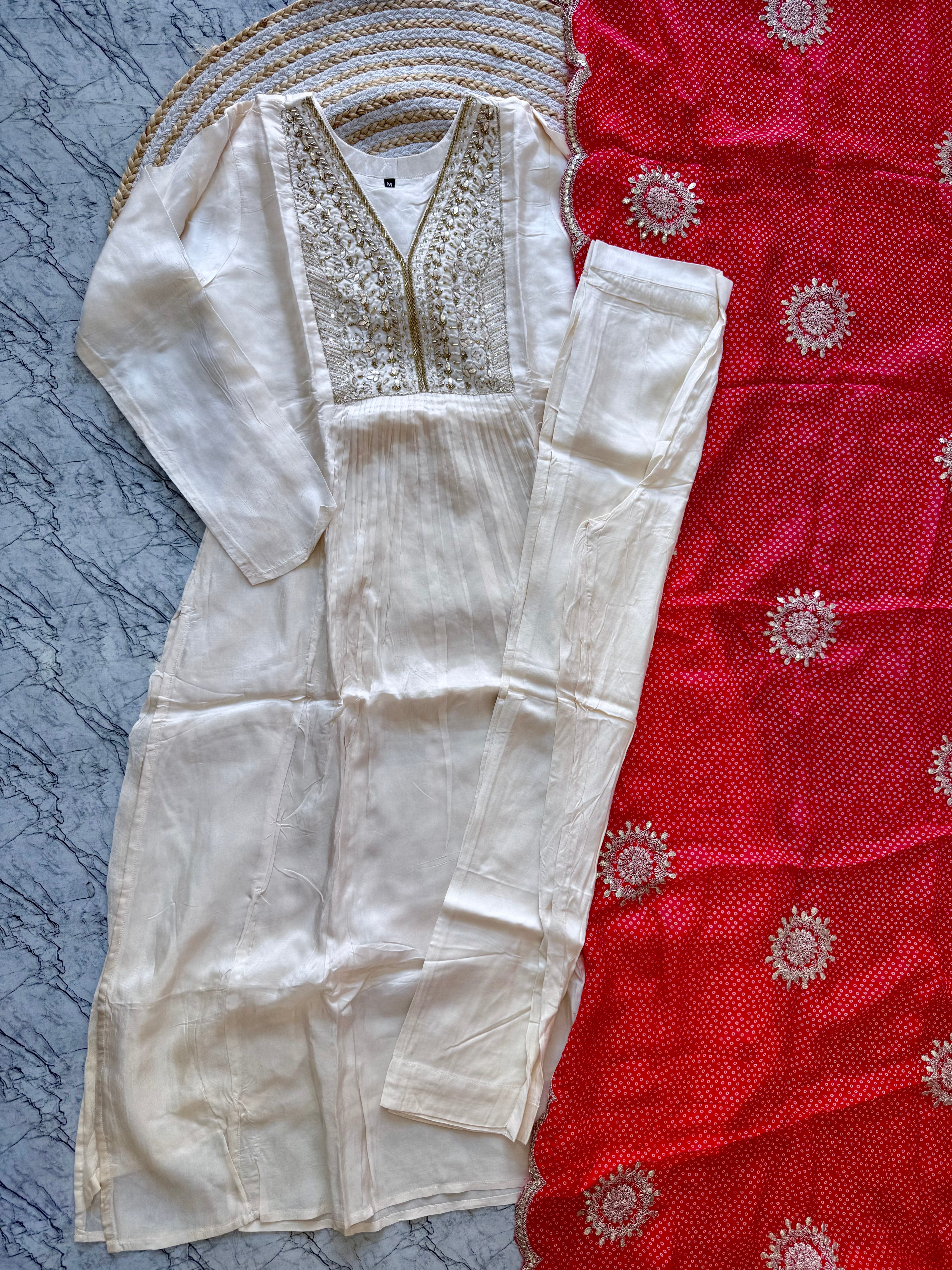 Tissue silk set with handwork of the yoke of the kurta with beautiful chinnon contrast handwork bandhni dupatta with a plane silk bottom