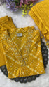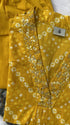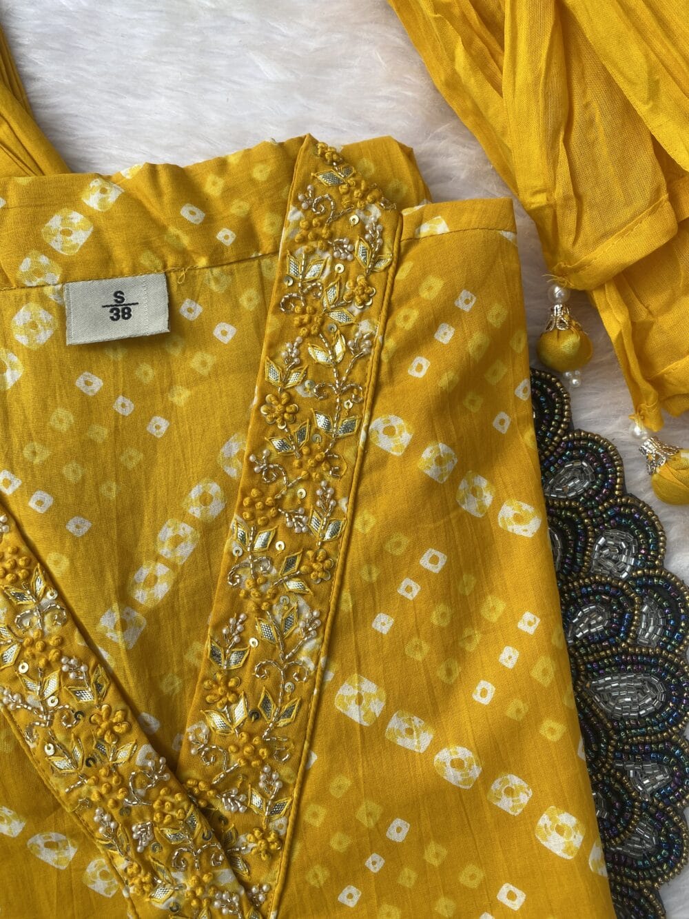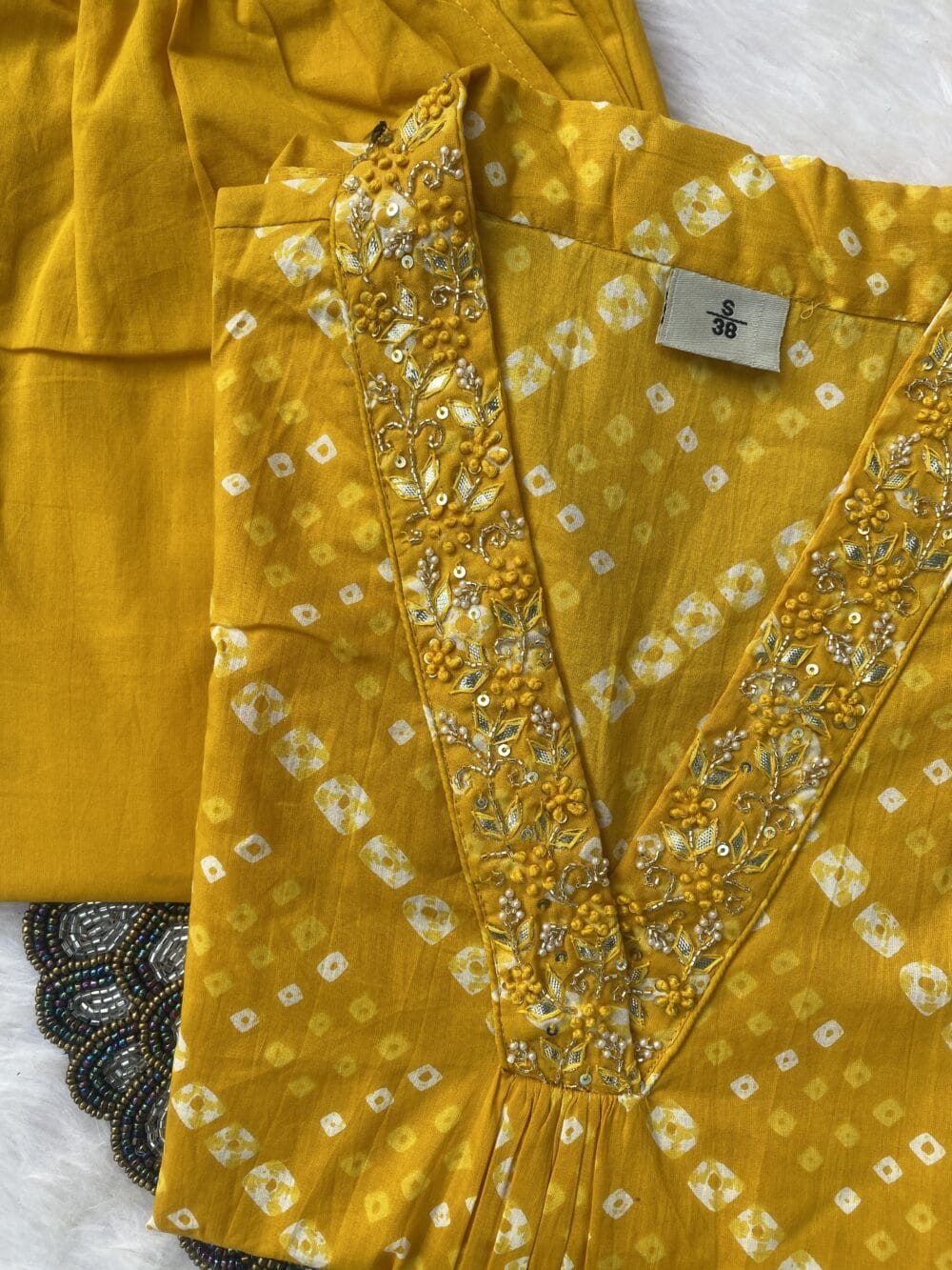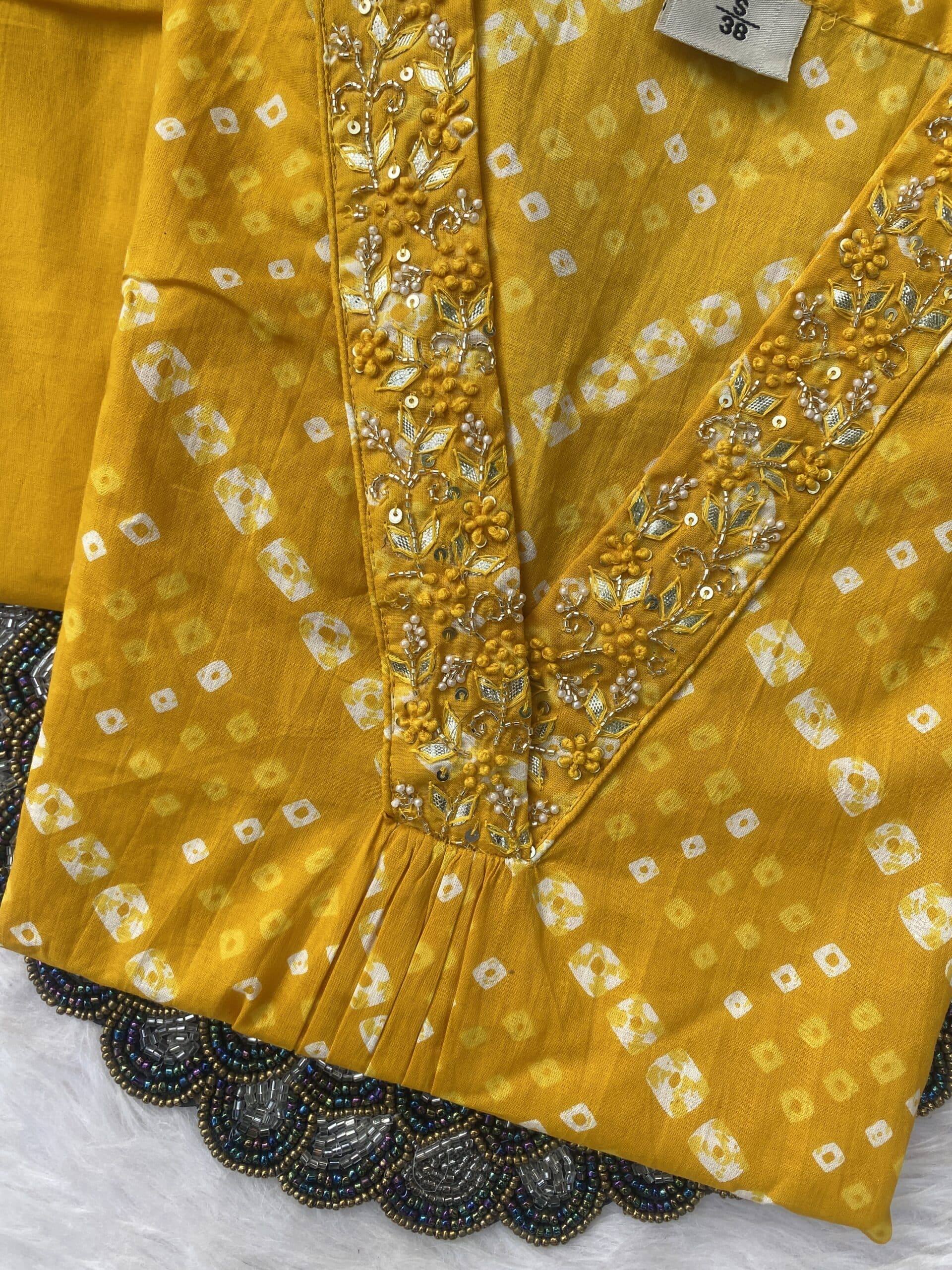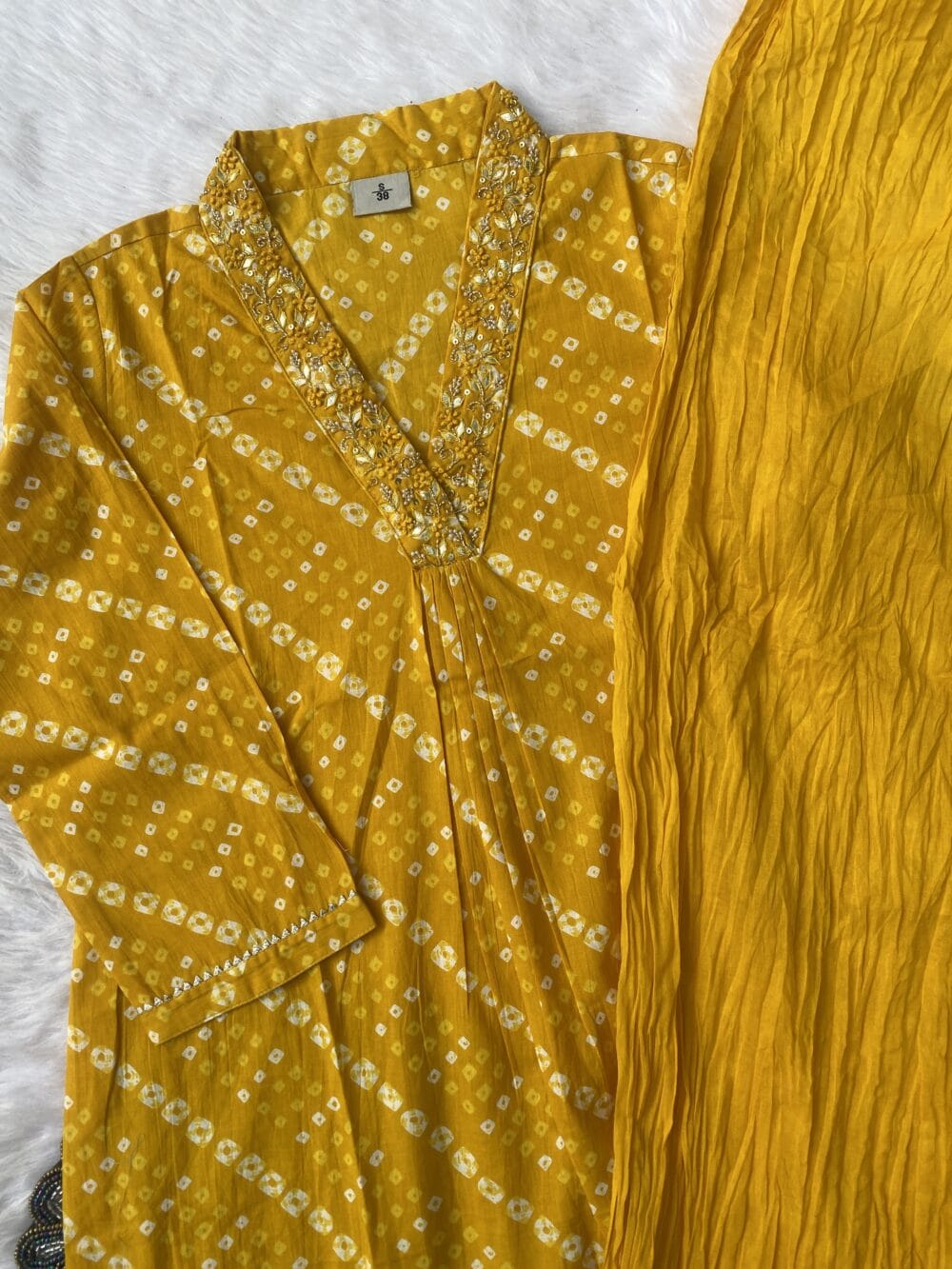 Handcrafted bandani printed cotton kurti dupatta bottom with handwork on the yoke of the kurta with a long kota doriya dupatta and a plane cotton bottom