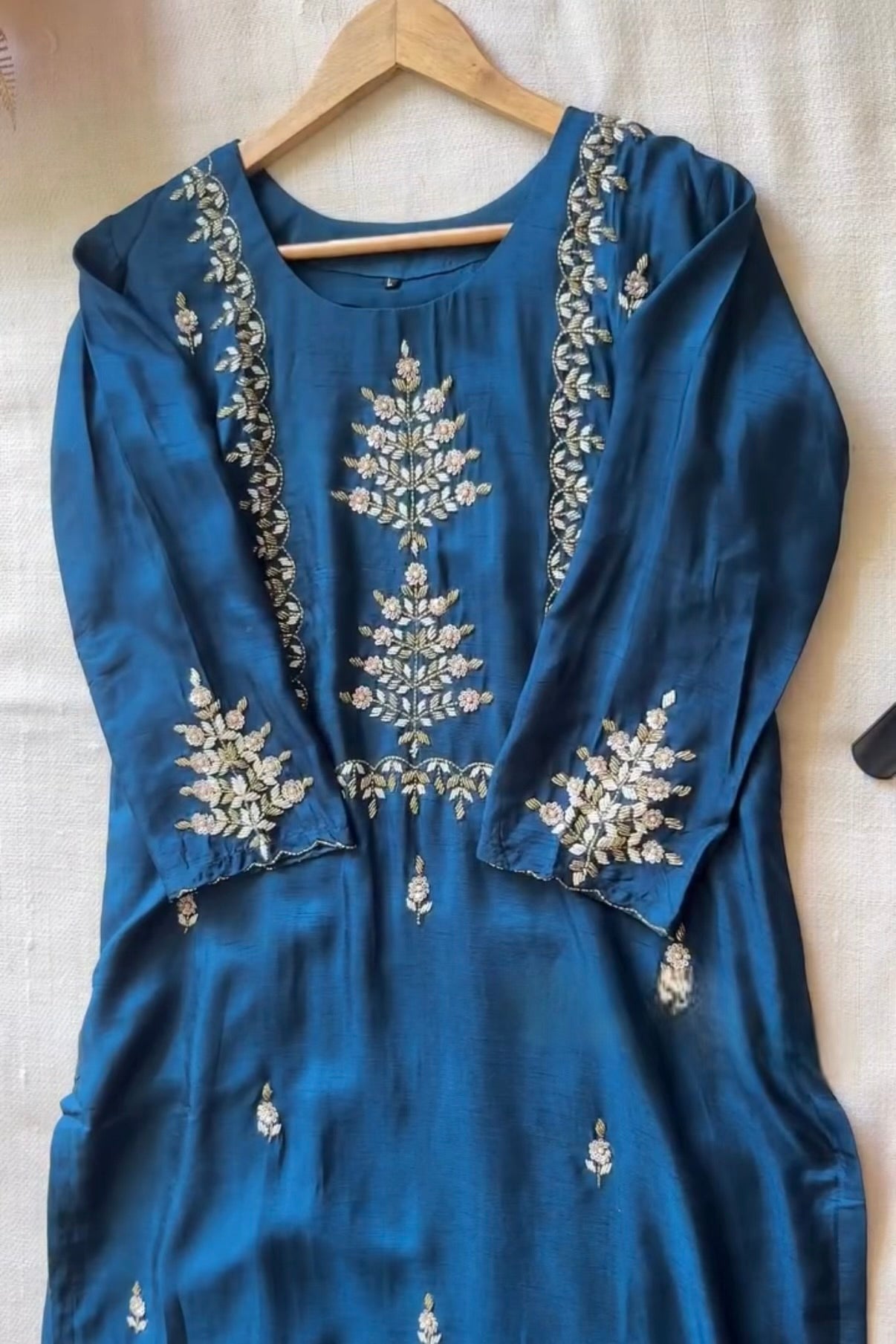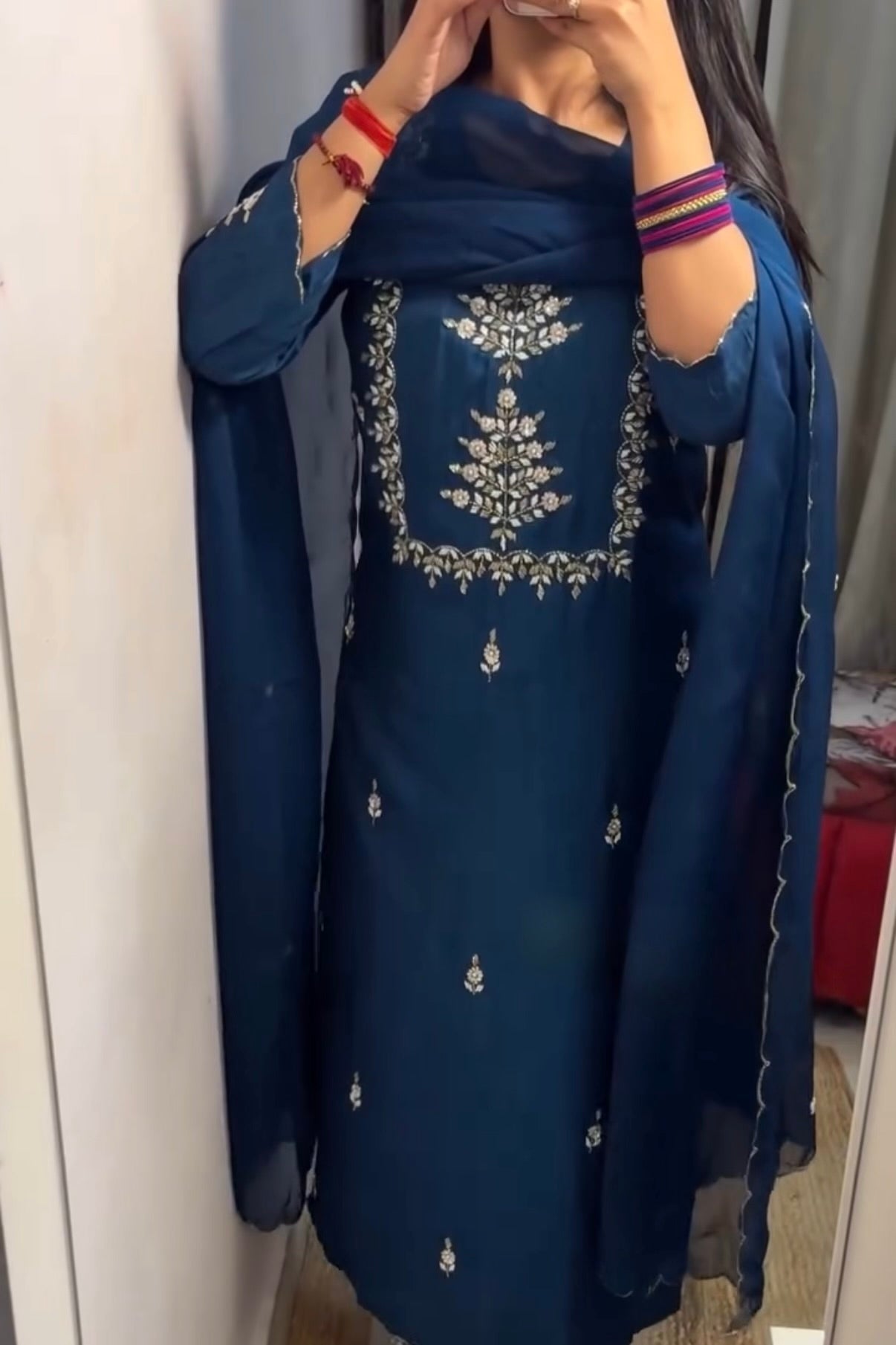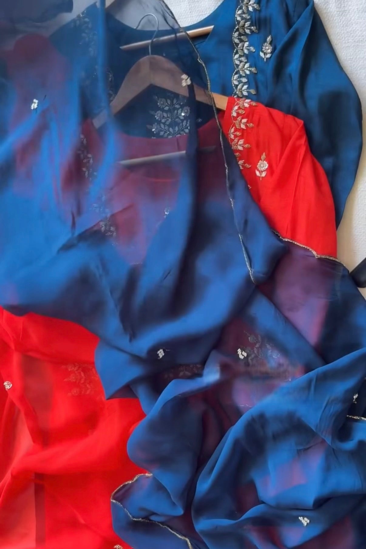 “Orange” Partywear Orange heavy handwork Dola Silk Kurta Set - XS / Blue