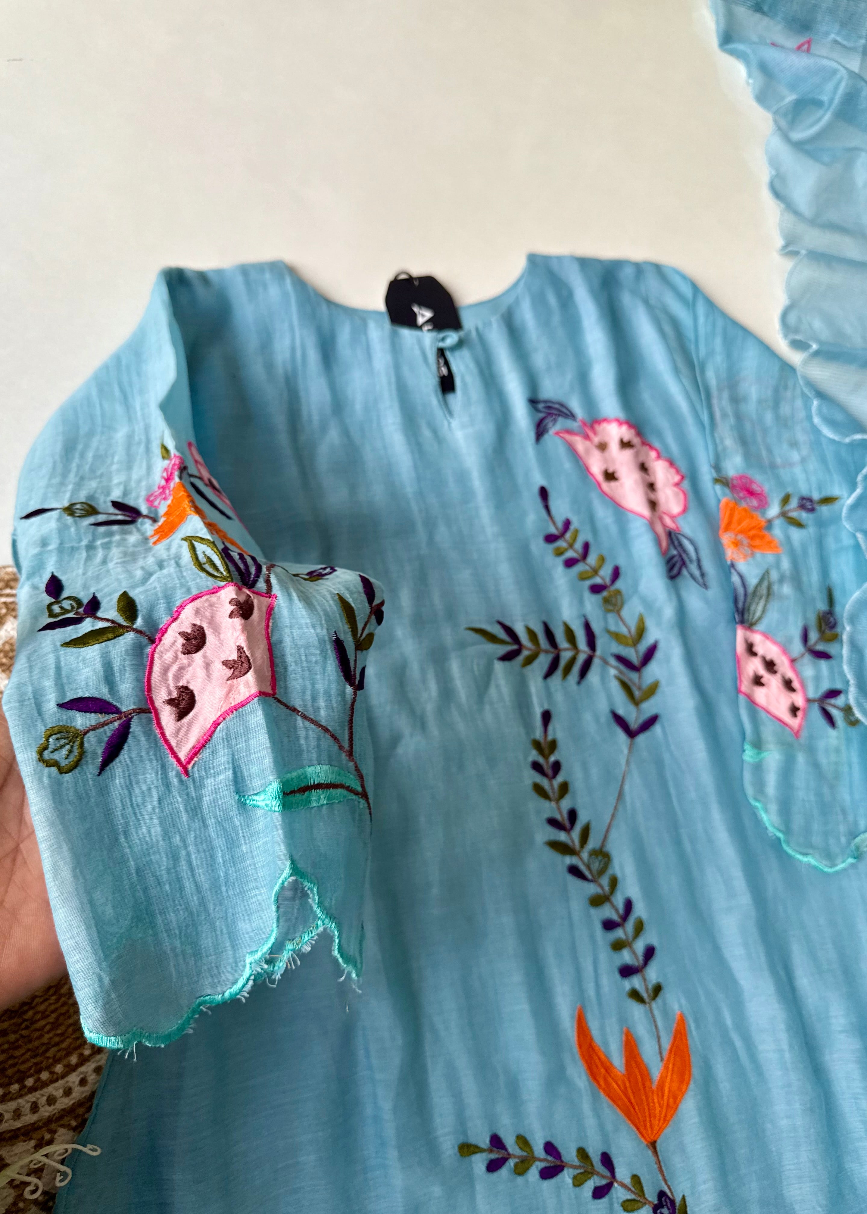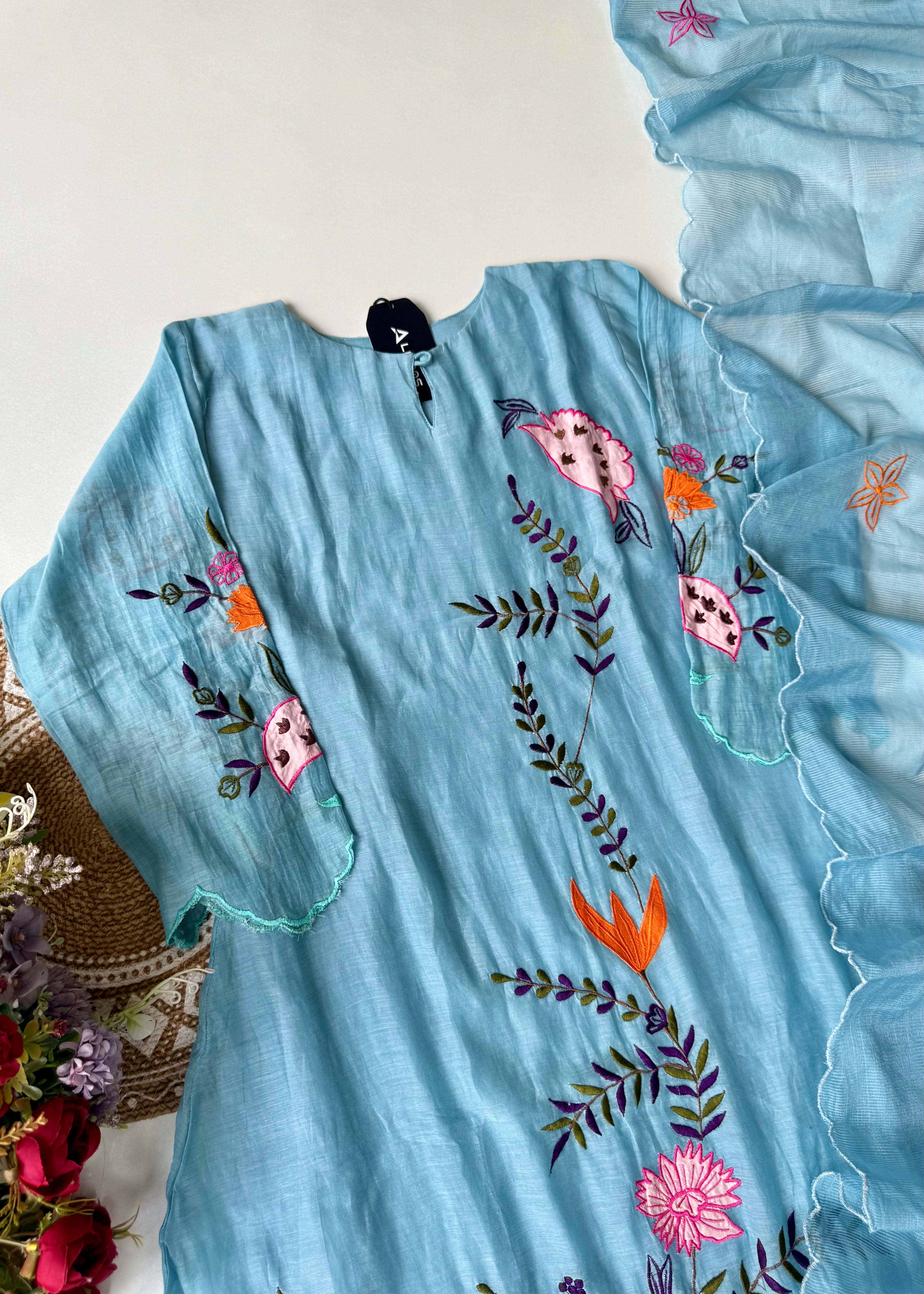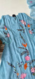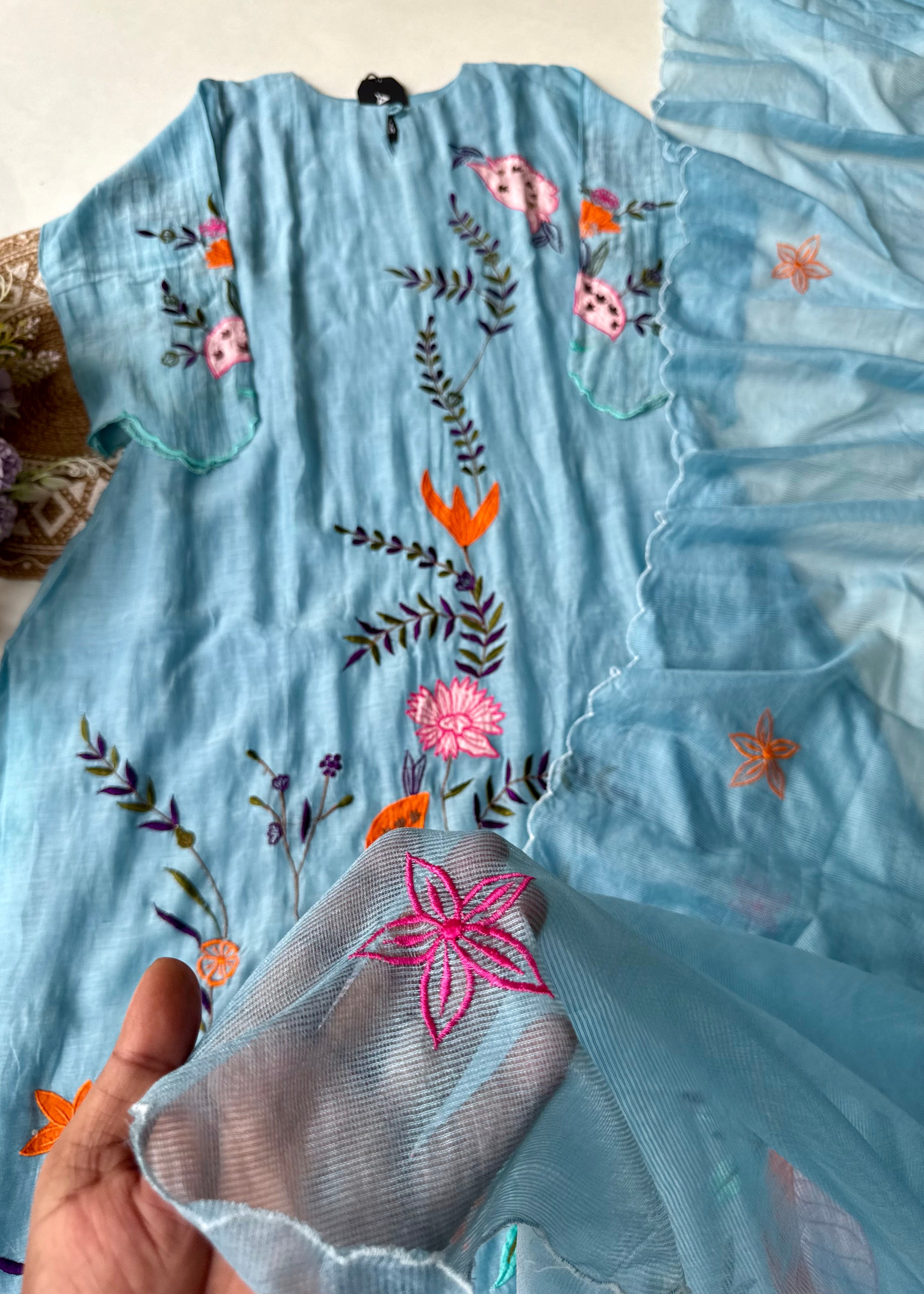 - Color: Pastel Sky Blue with multicolor embroidery