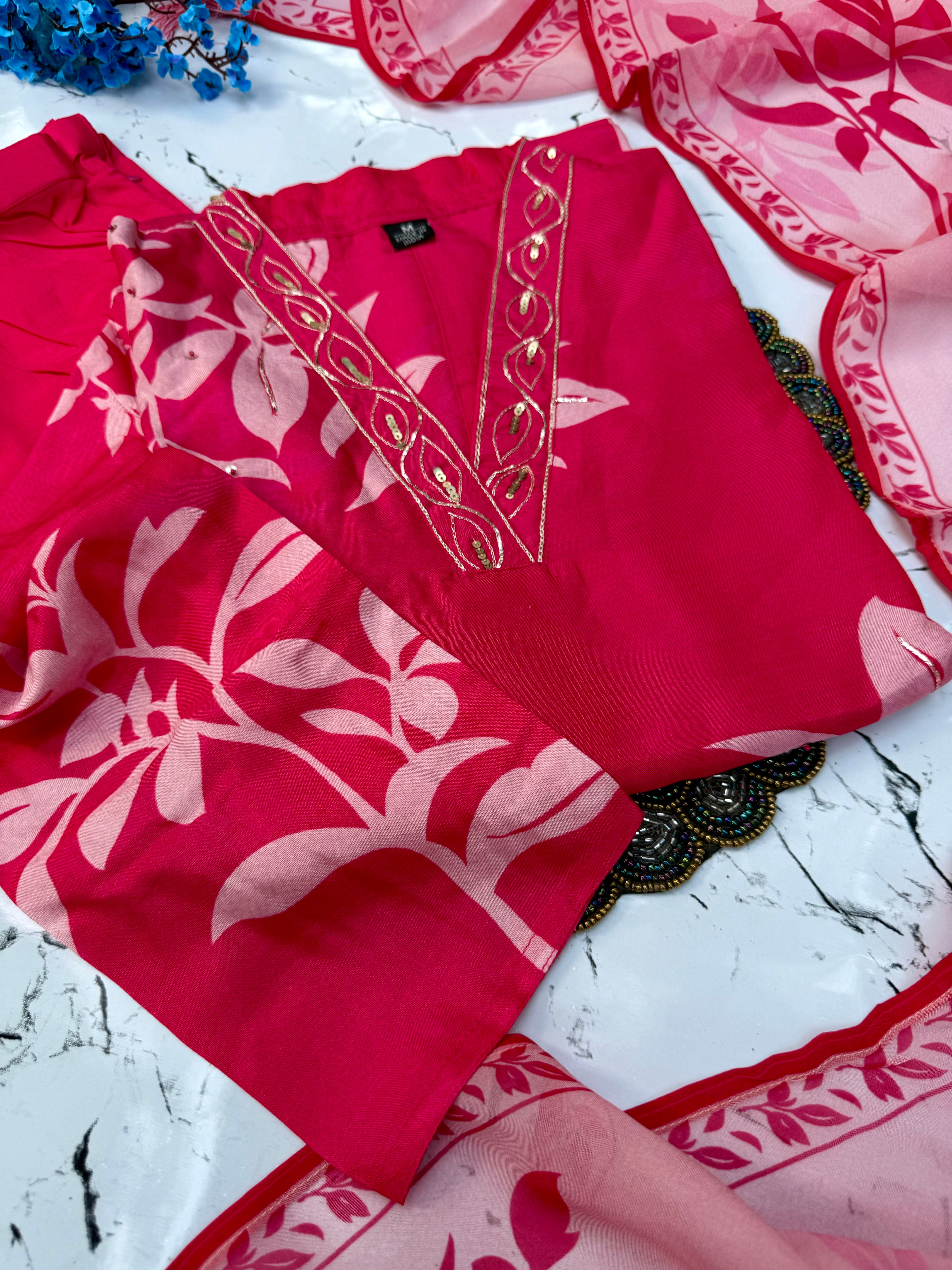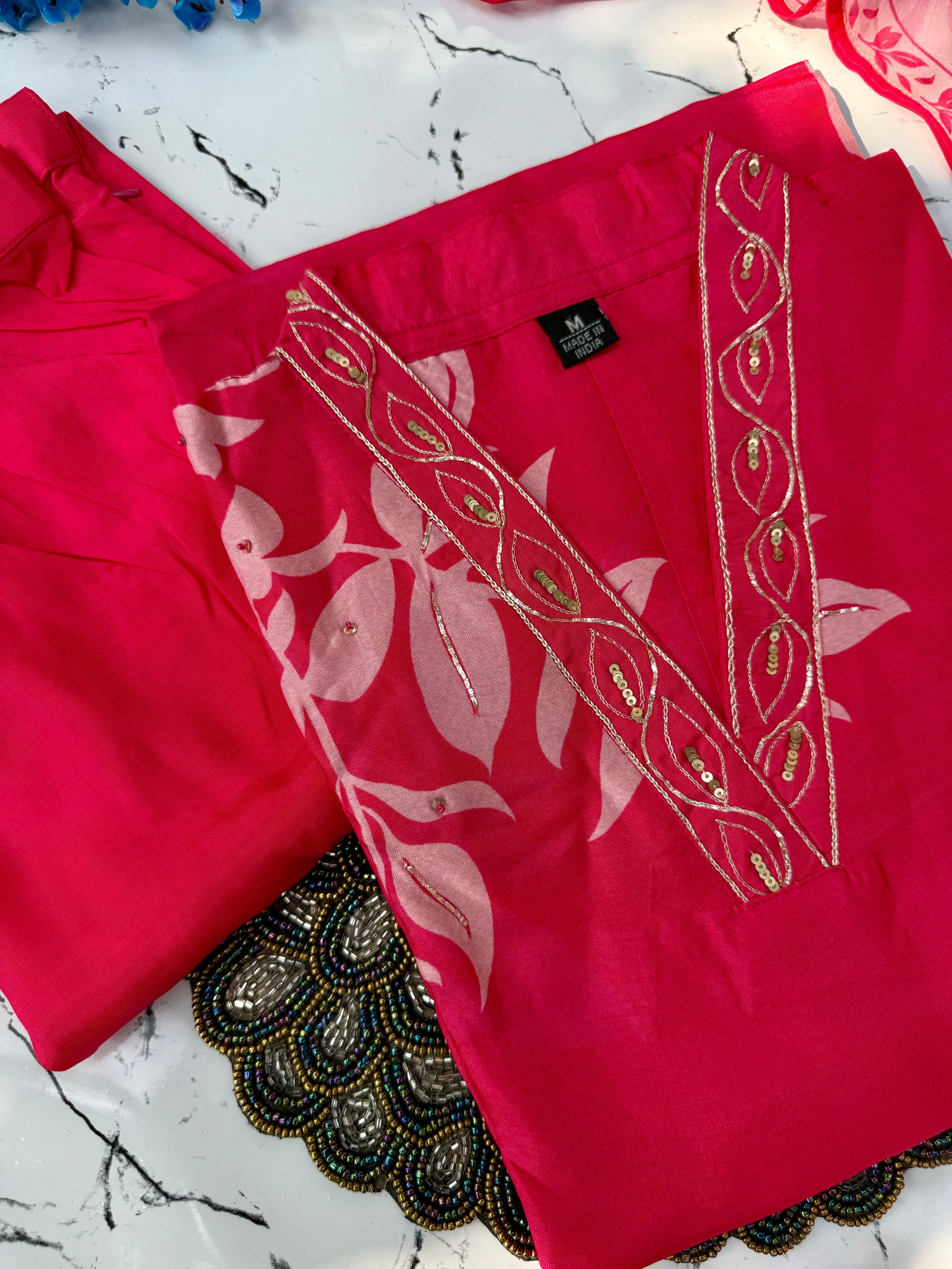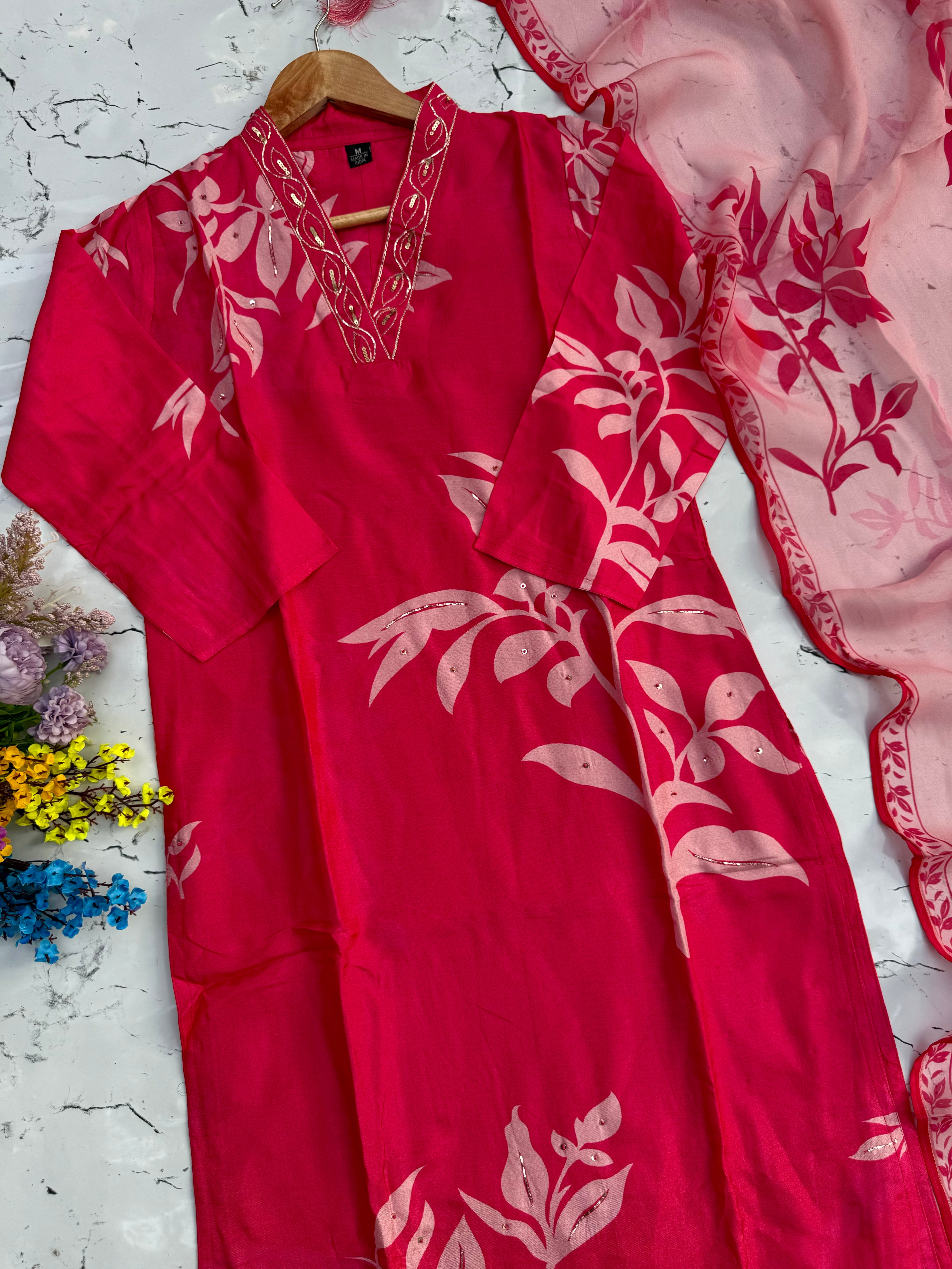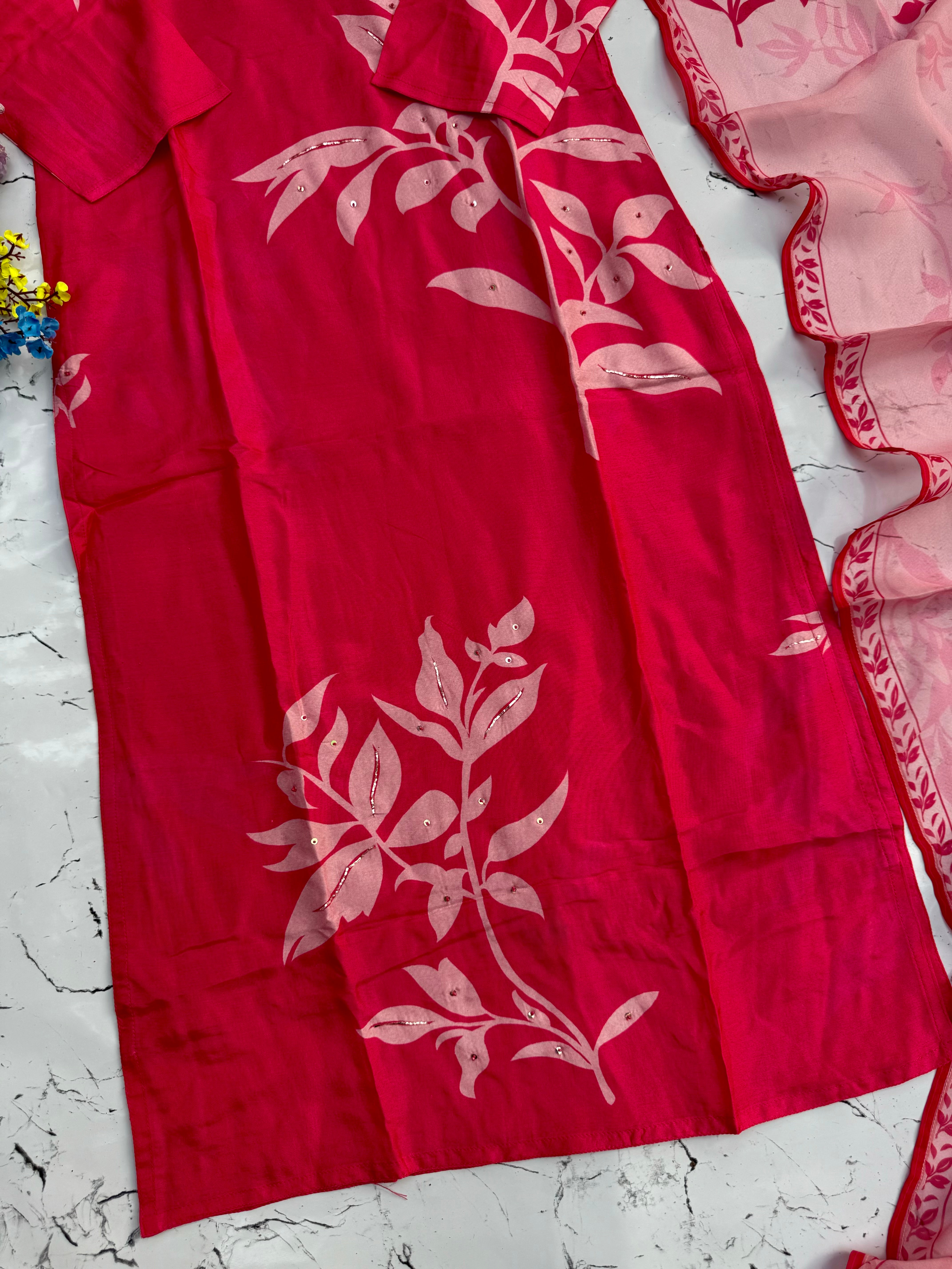 premium Russian silk printed straight kurti with handwork detailing all over the kurta with a organza dupatta and silk bottom