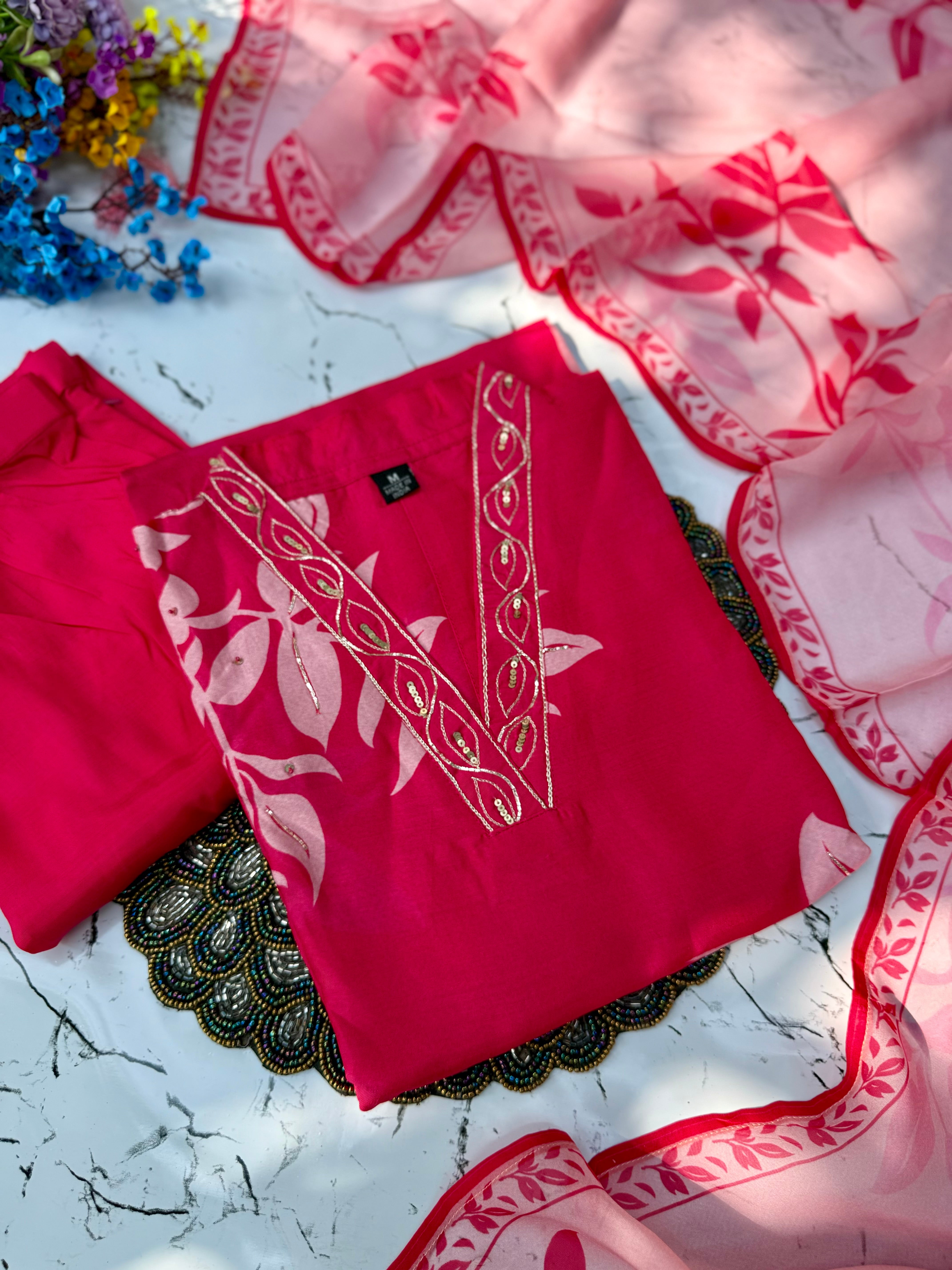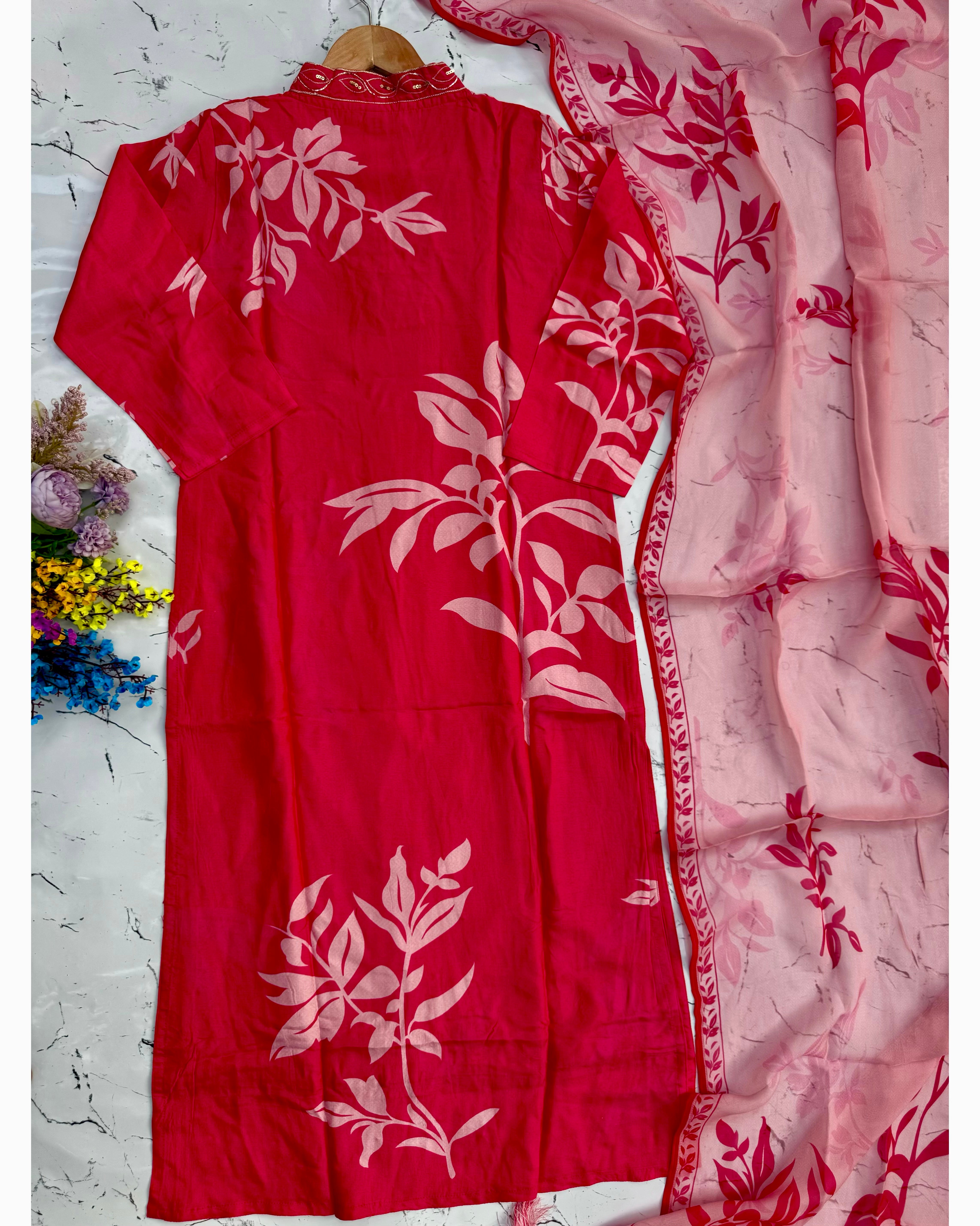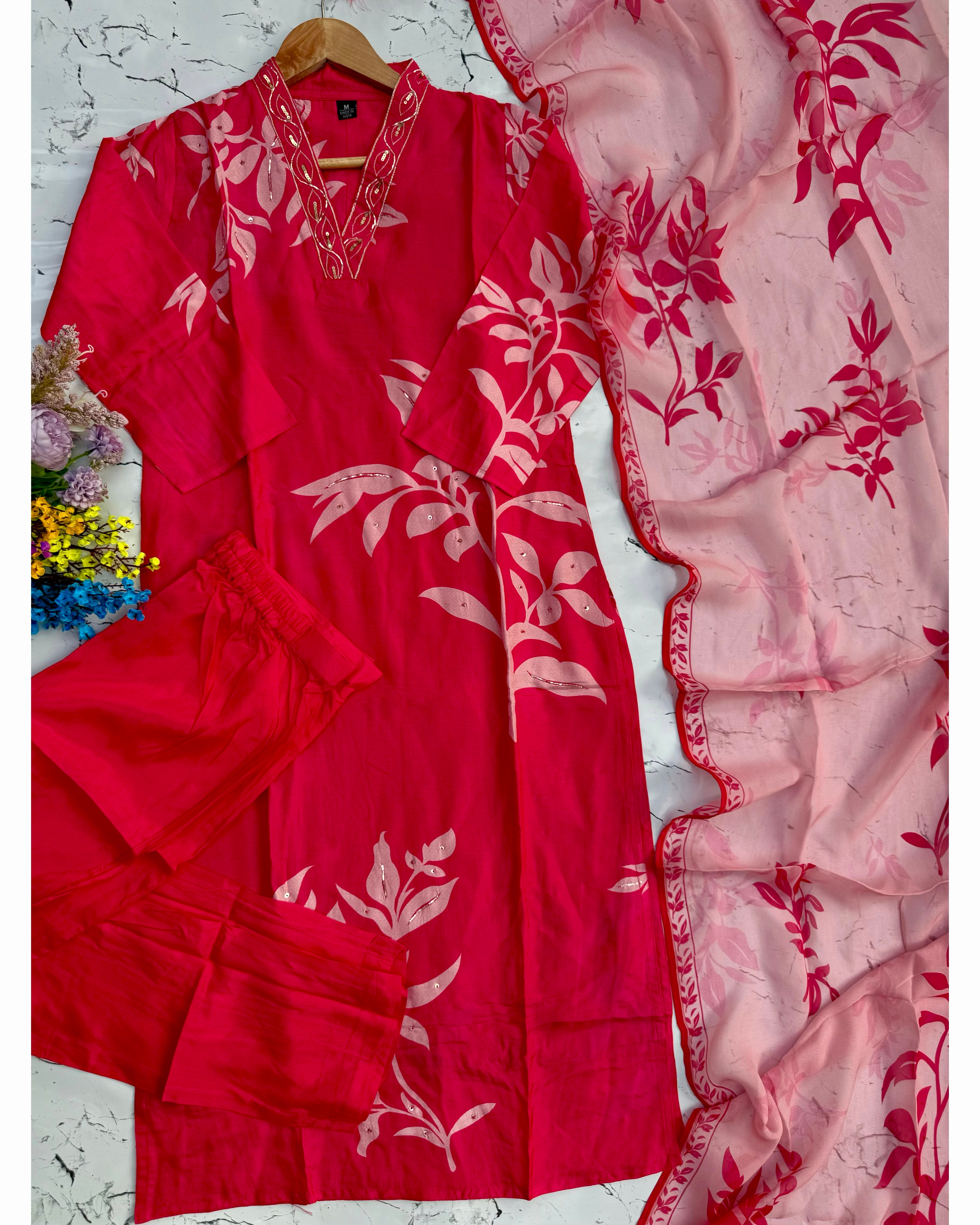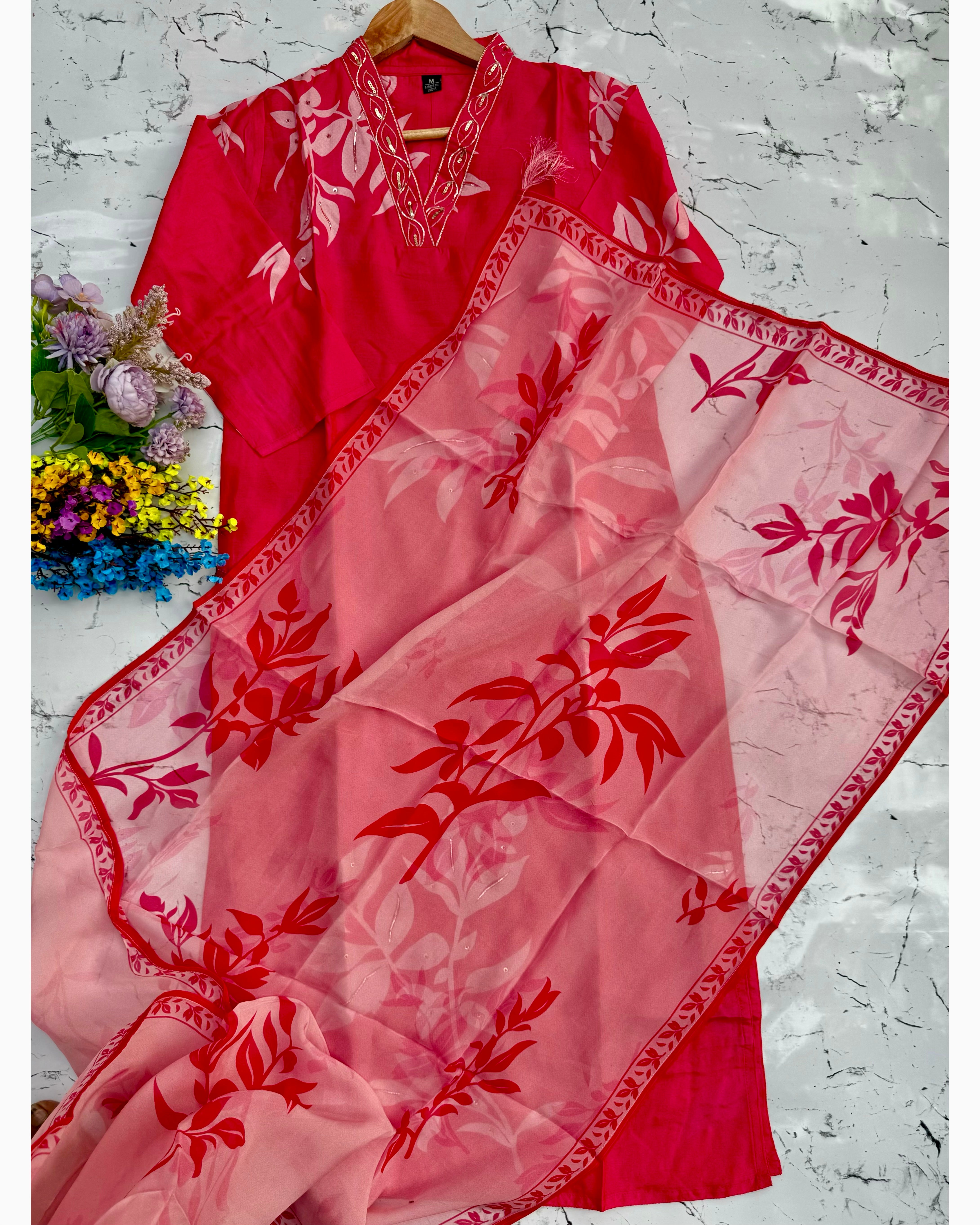 premium Russian silk printed straight kurti with handwork detailing all over the kurta with a organza dupatta and silk bottom