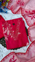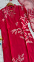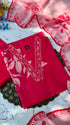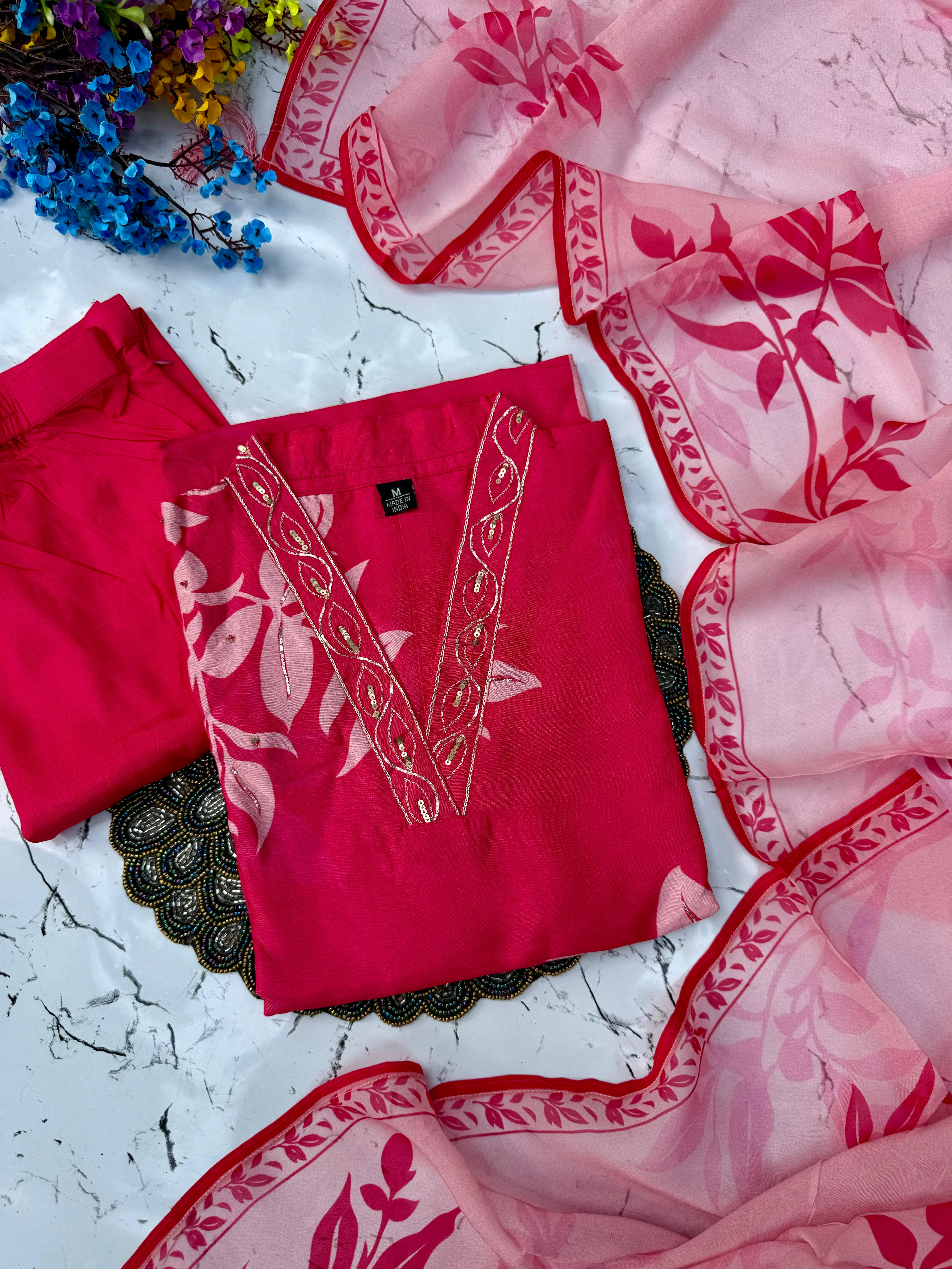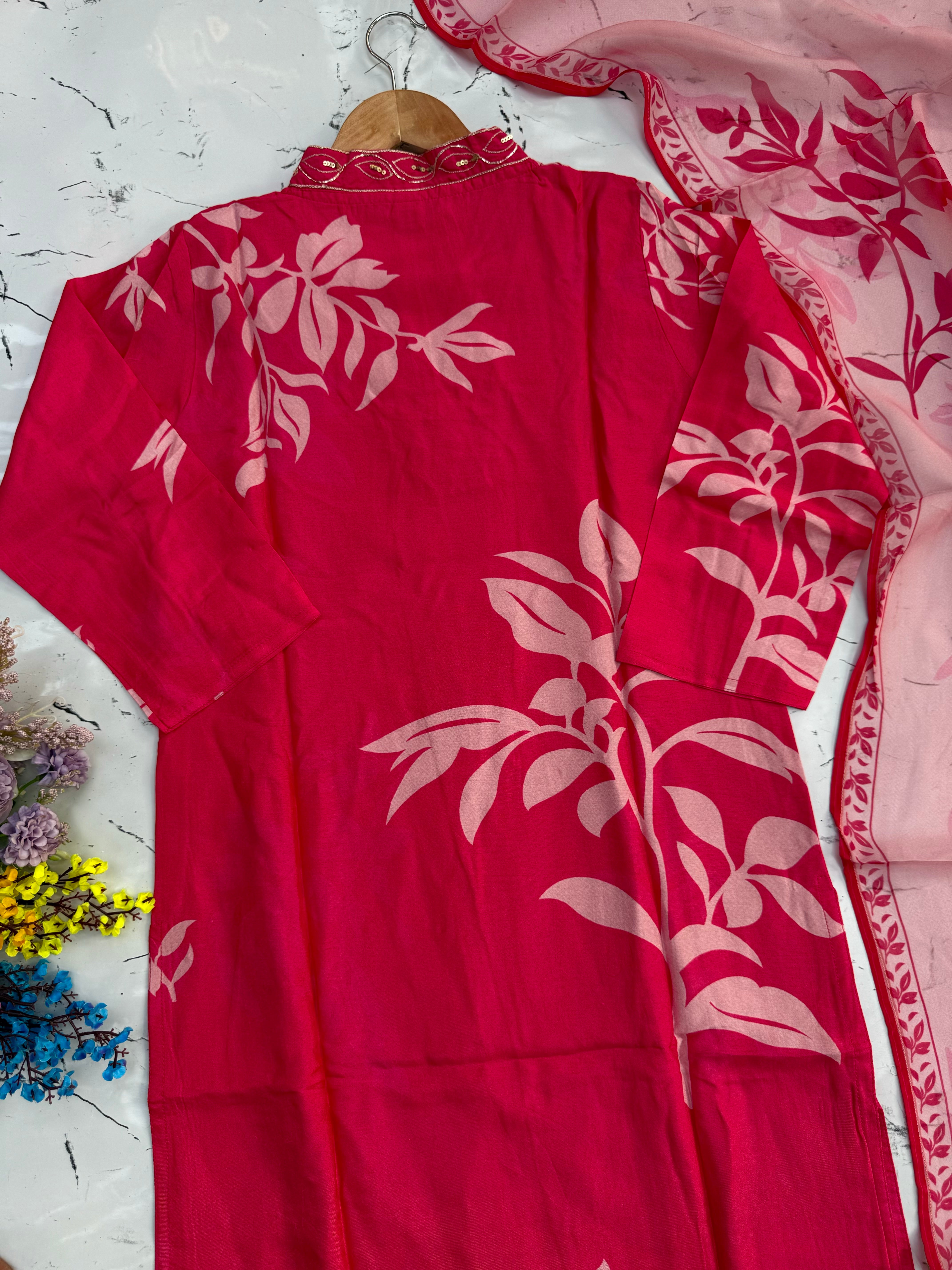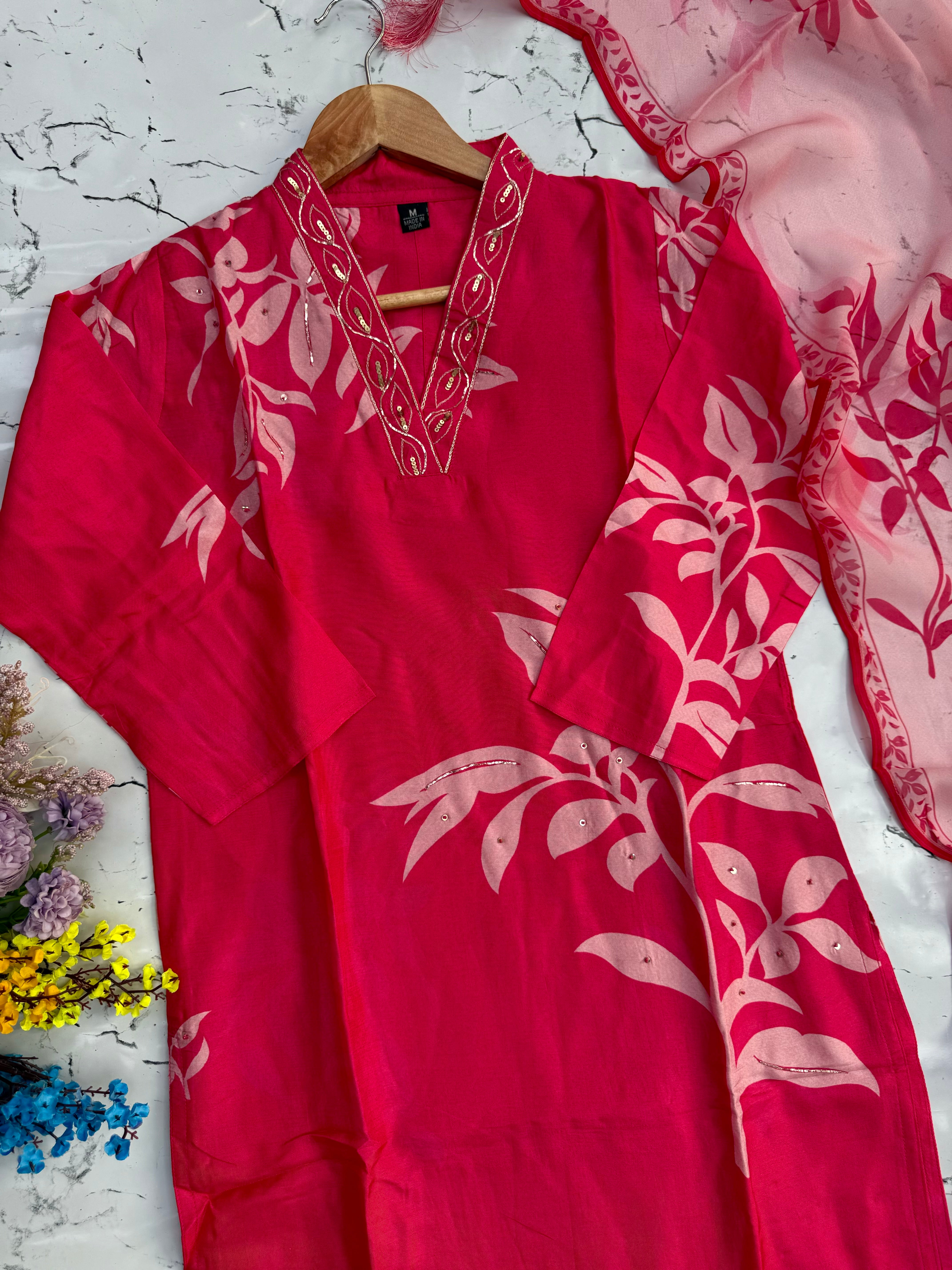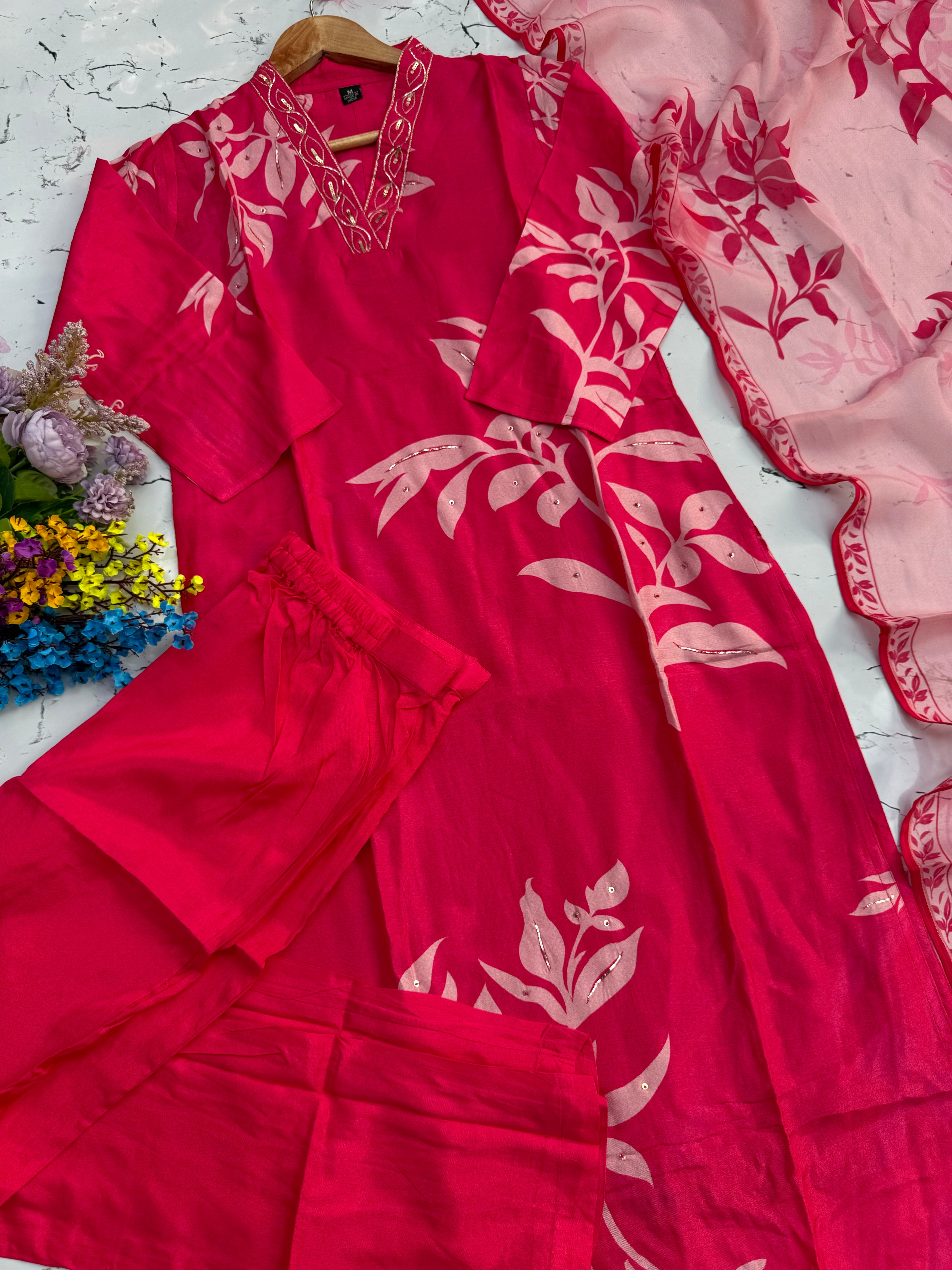 premium Russian silk printed straight kurti with handwork detailing all over the kurta with a organza dupatta and silk bottom