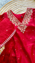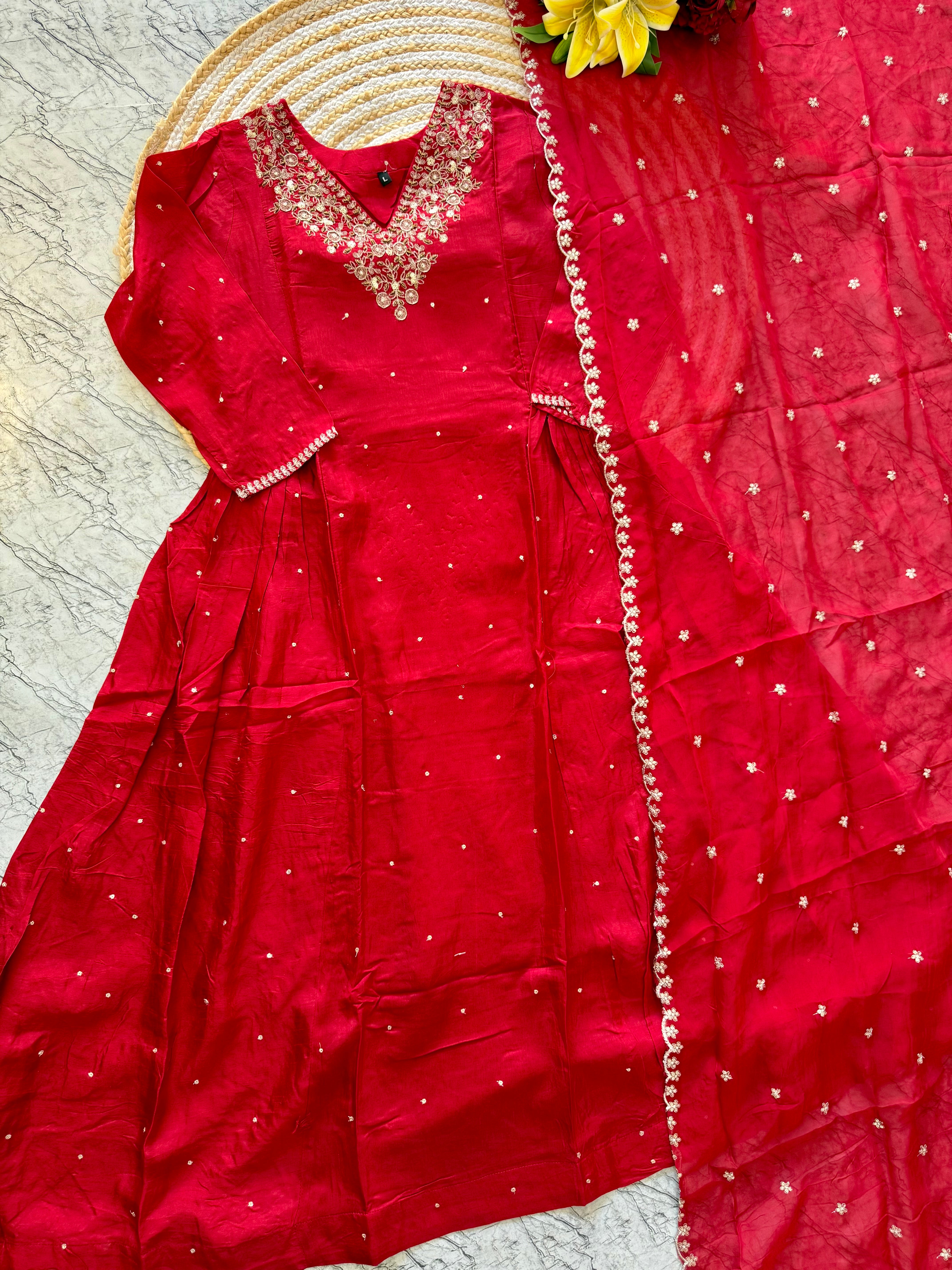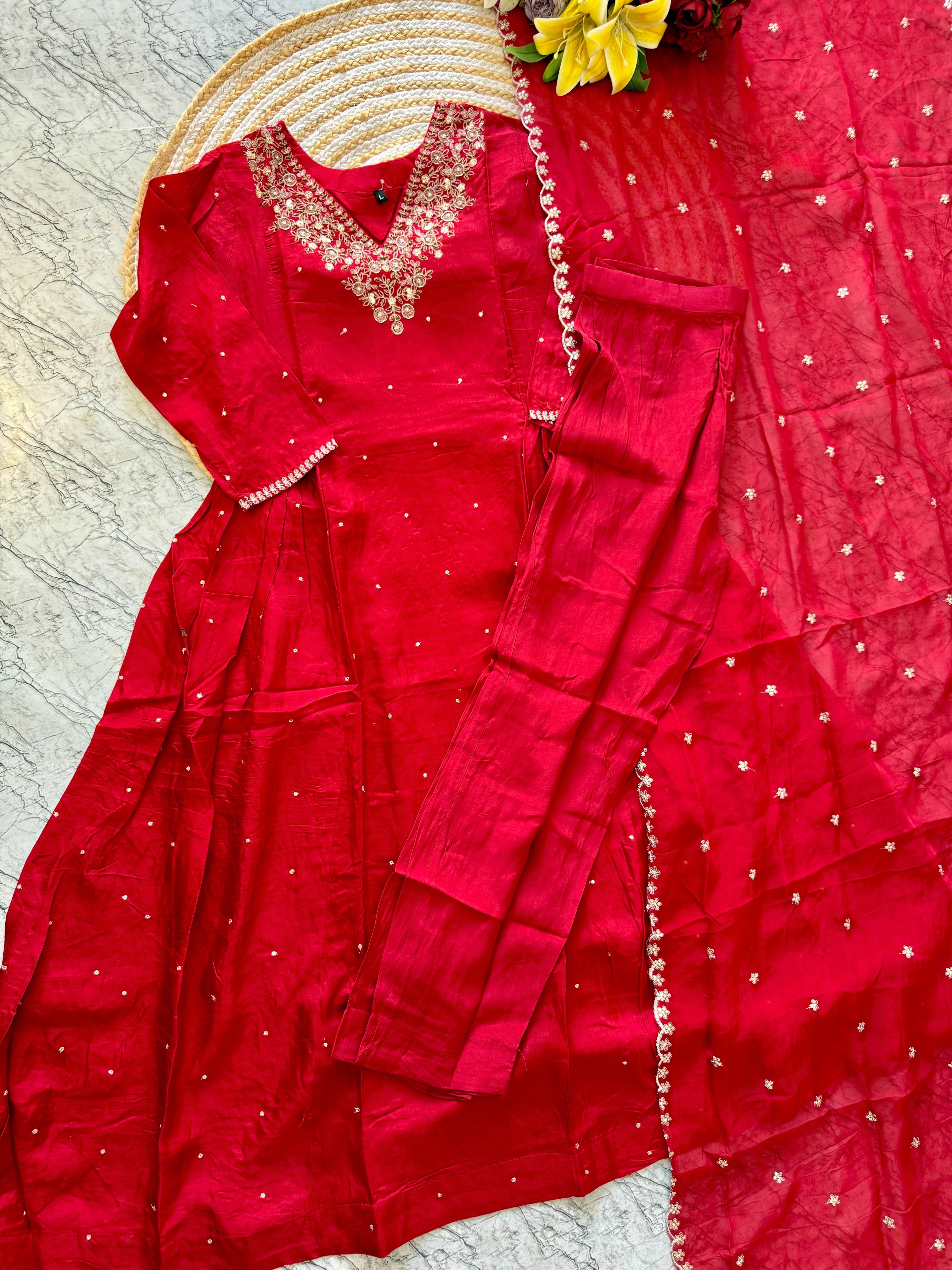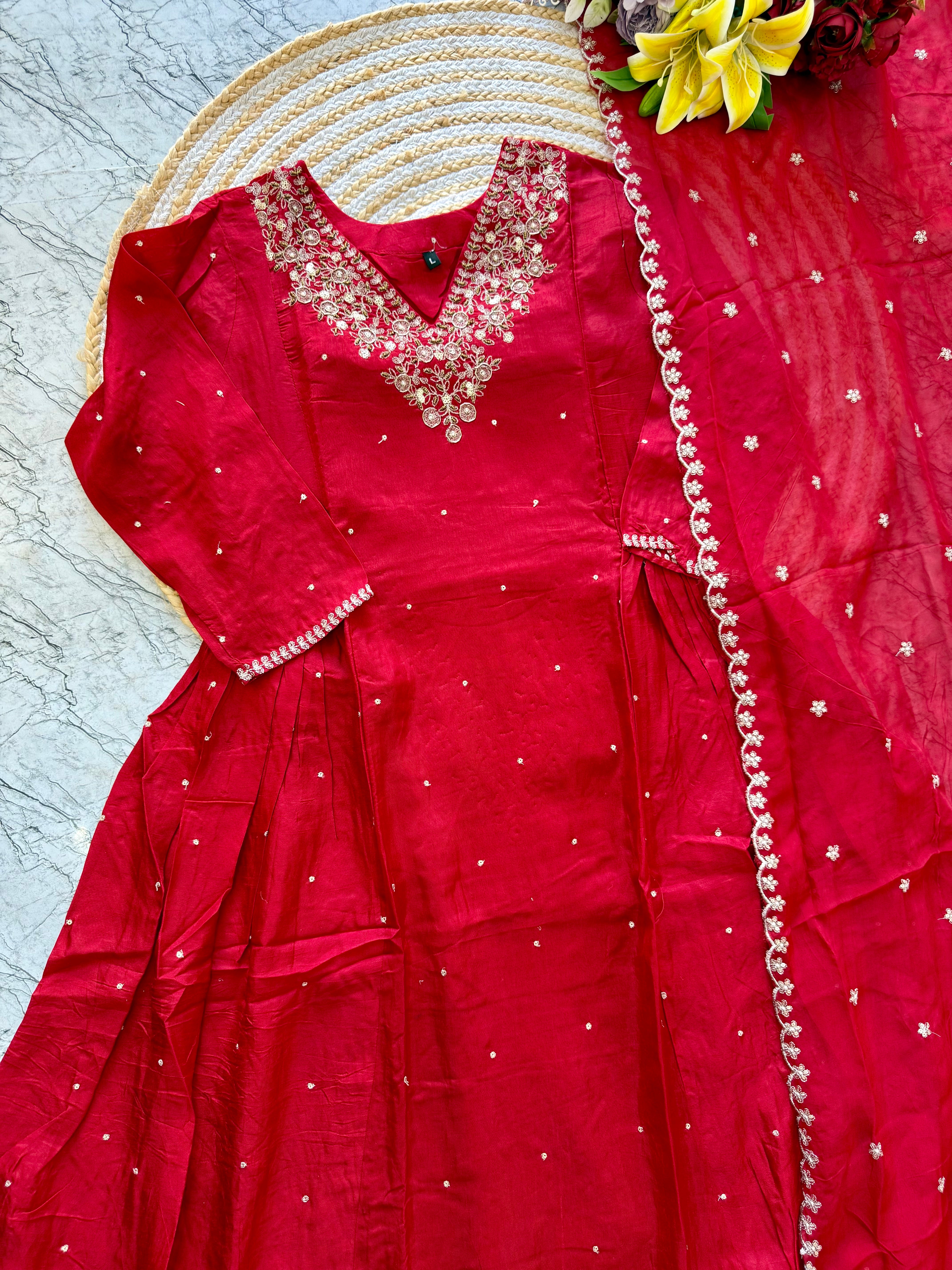 This Tissue silk Anarkali boasts handcrafted details and comes with matching pants and an organza dupatta. Luxurious and elegant, this ensemble is perfect for special occasions. The intricate handiwork adds a unique touch, making this outfit a true standout.